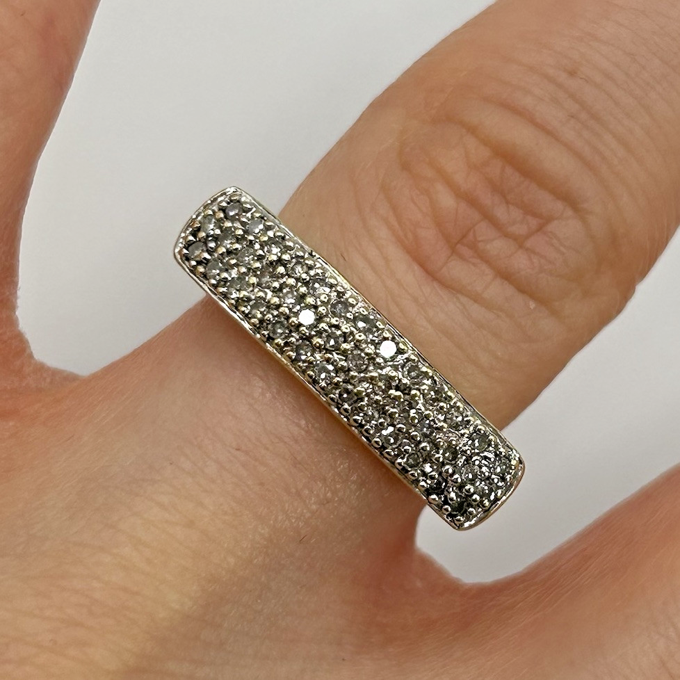 A unique square shank gold band ring featuring a wide set collection of petite pave set diamonds.