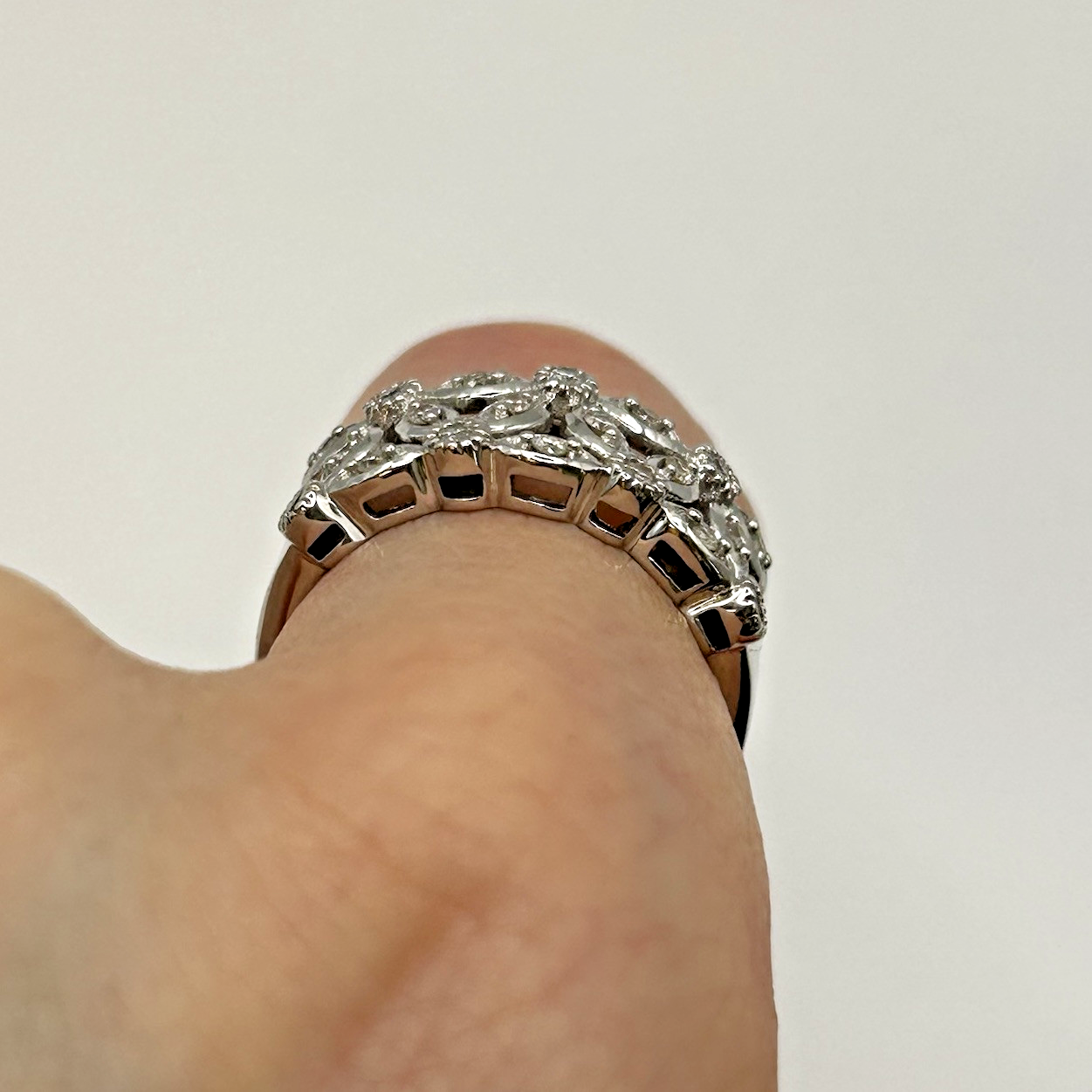 A gorgeous white gold ring with a floral cut-out design adorned with sparkling natural diamonds.