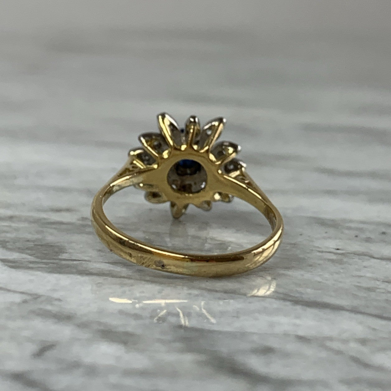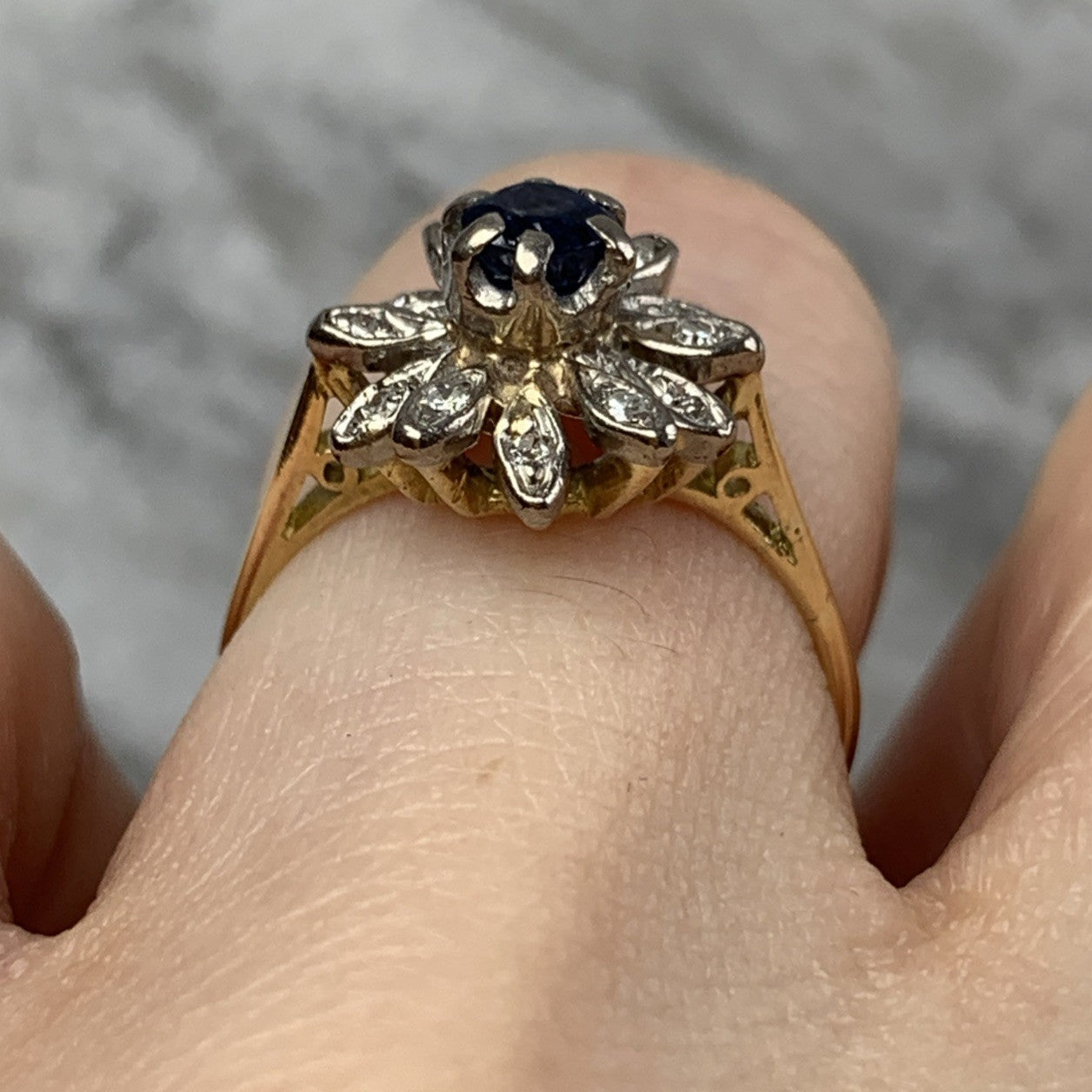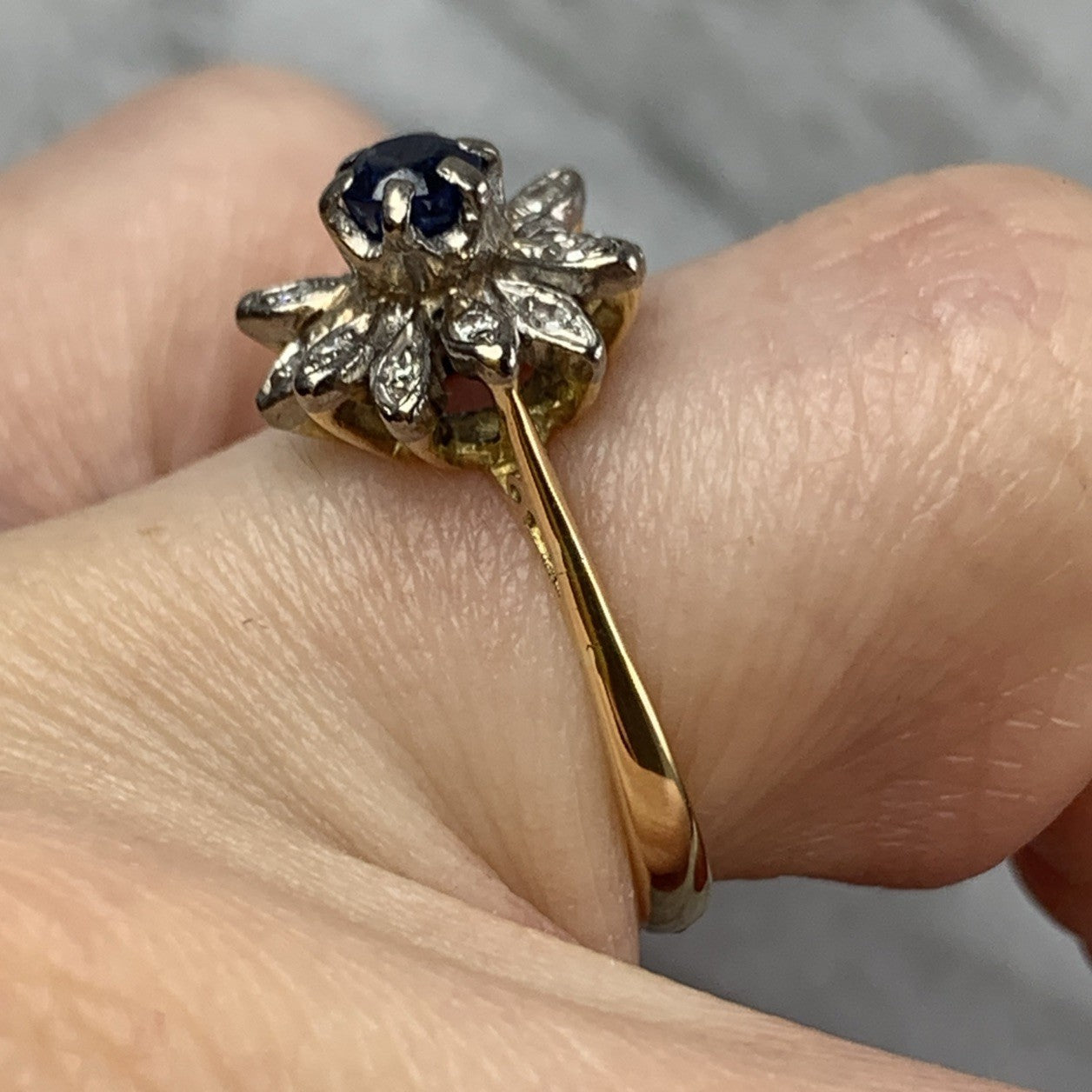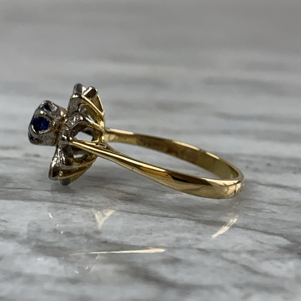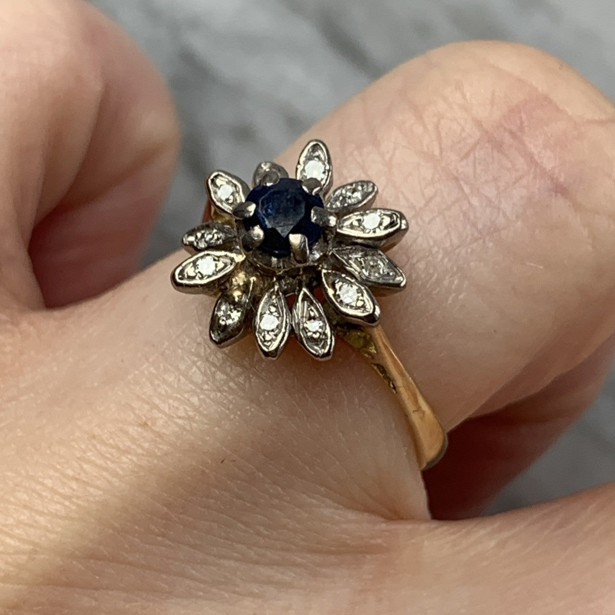 Diamond & Sapphire Flower Cluster Ring 18ct 750 Yellow Gold - Size J