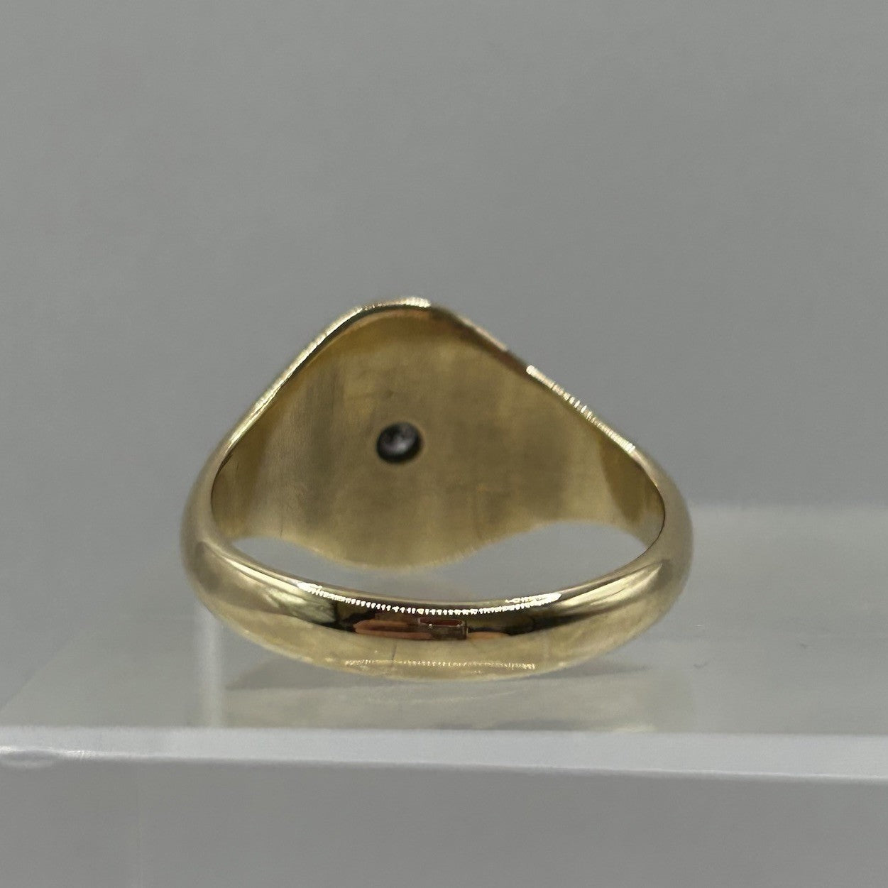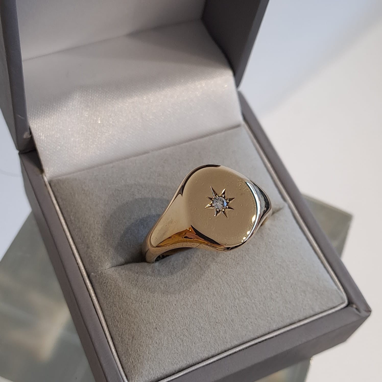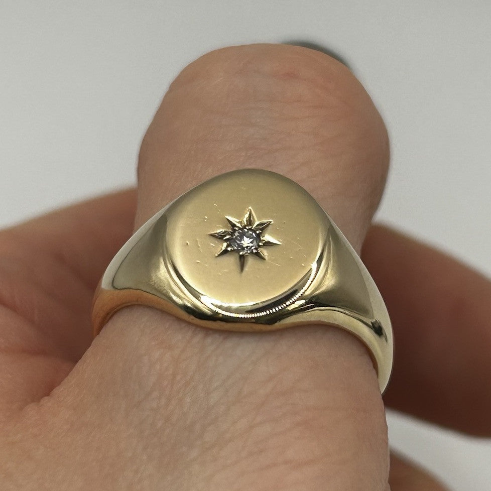 A timeless chunky yellow gold signet ring featuring a round cut diamond in a starburst setting.