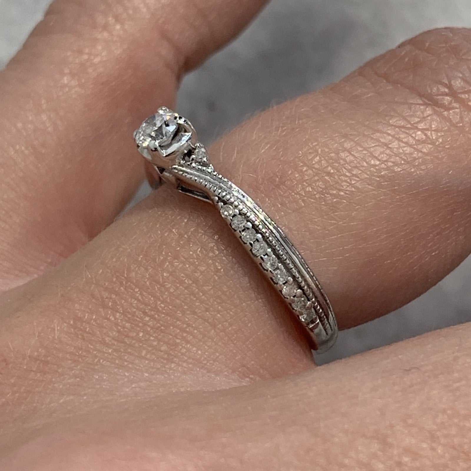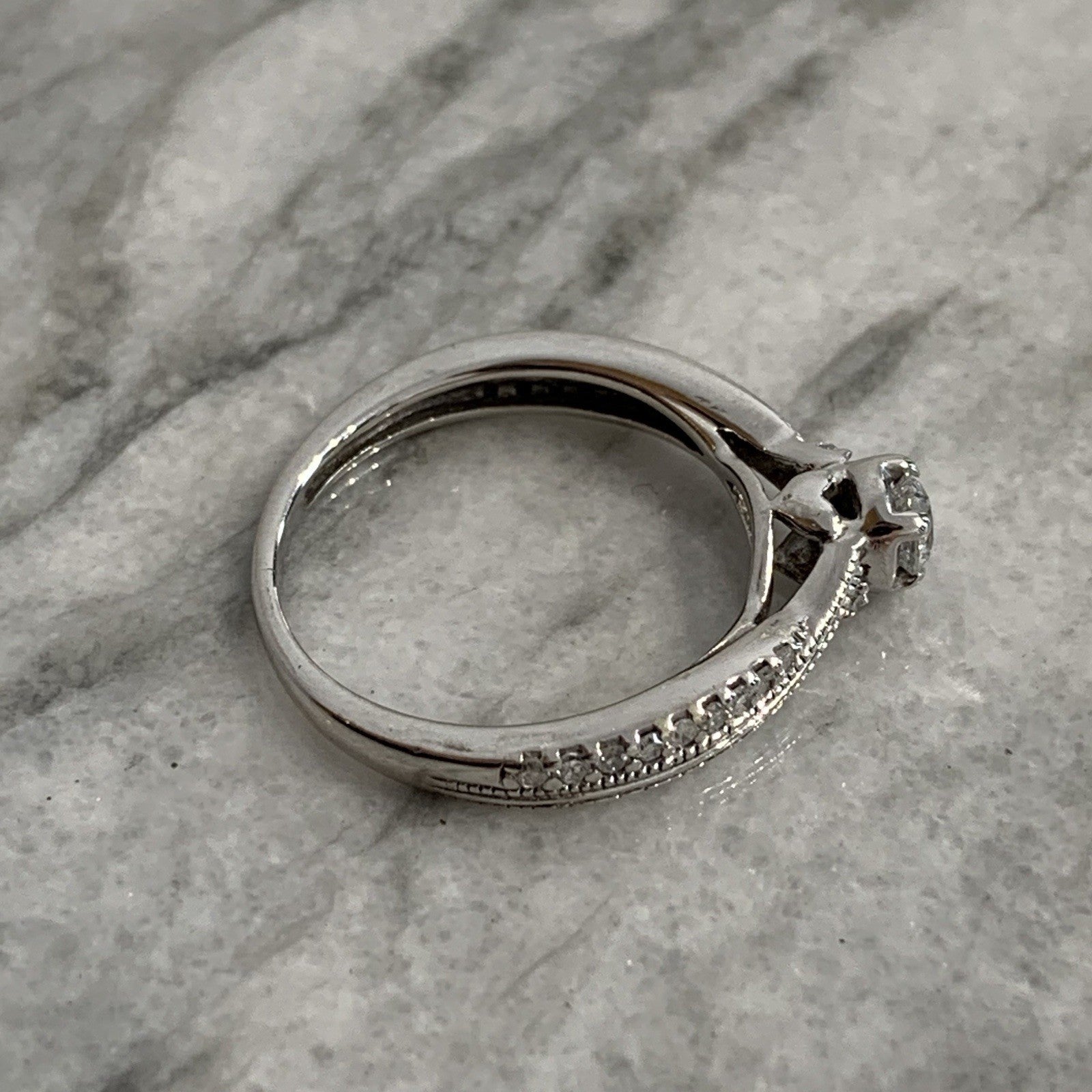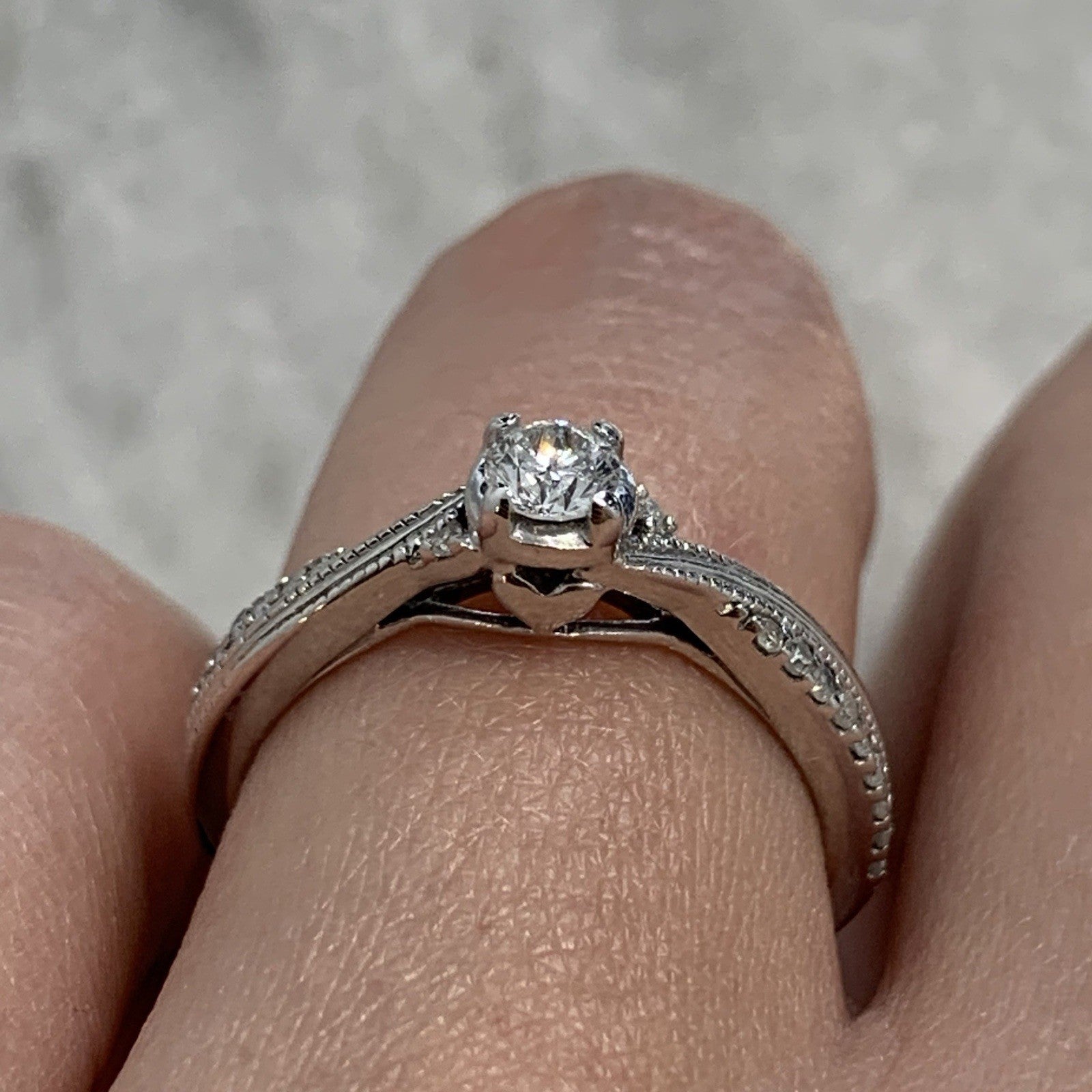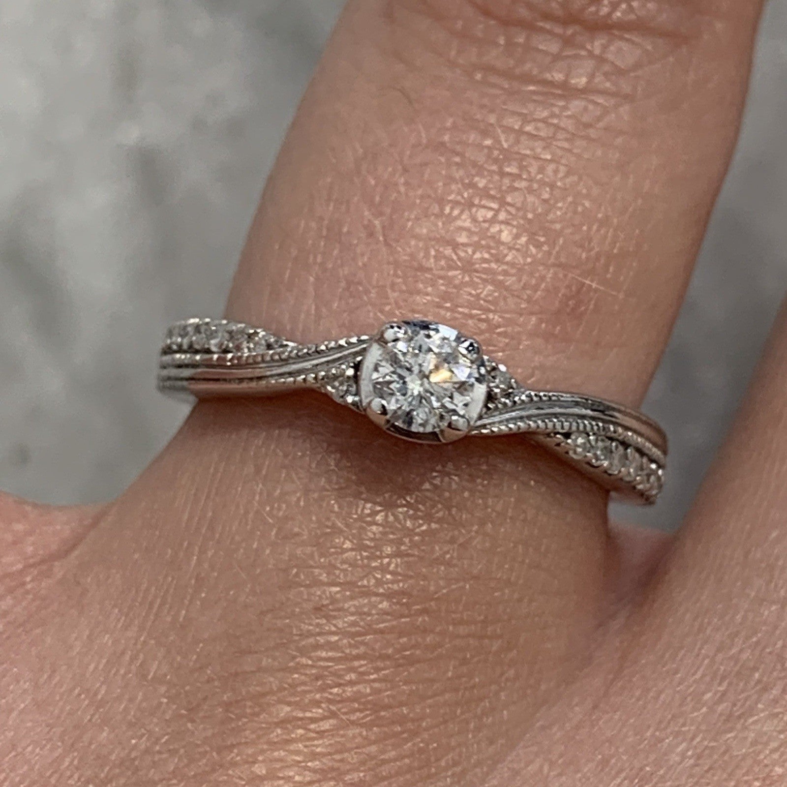 A beautiful diamond solitaire milgrain engagement style ring in white gold.