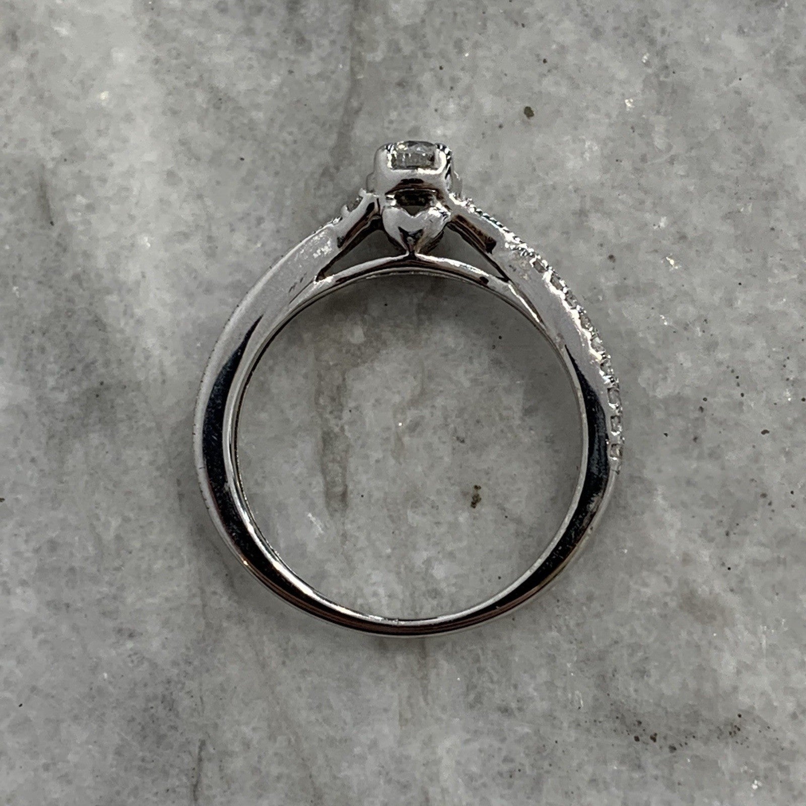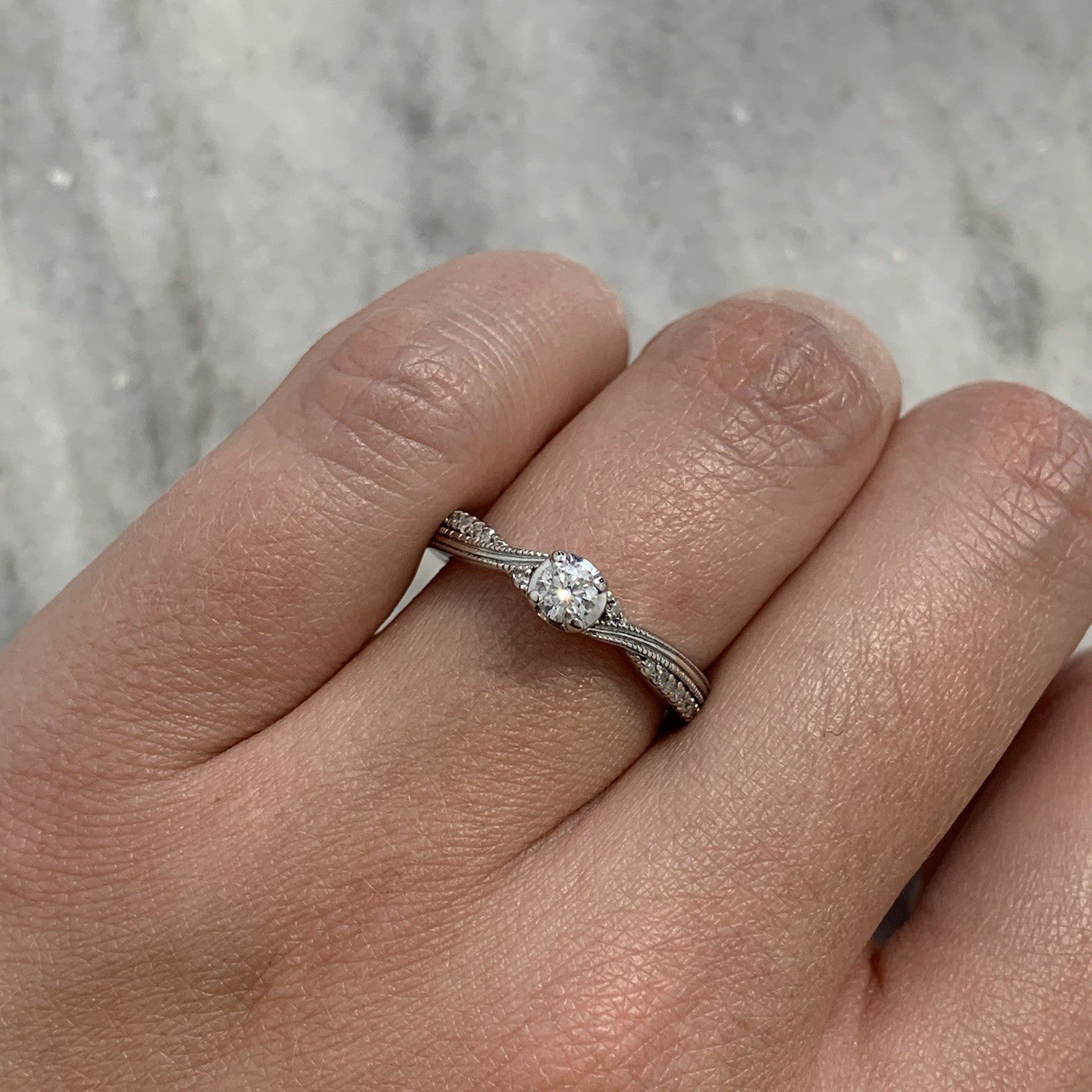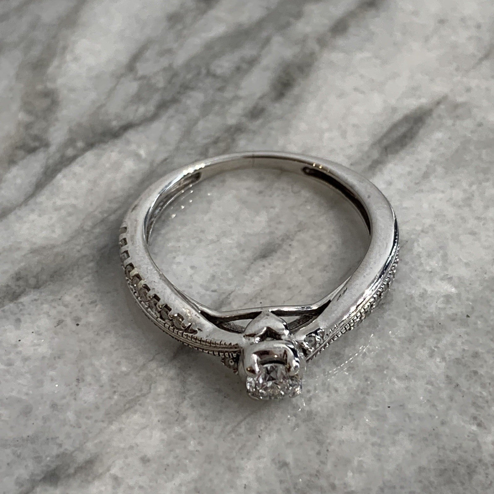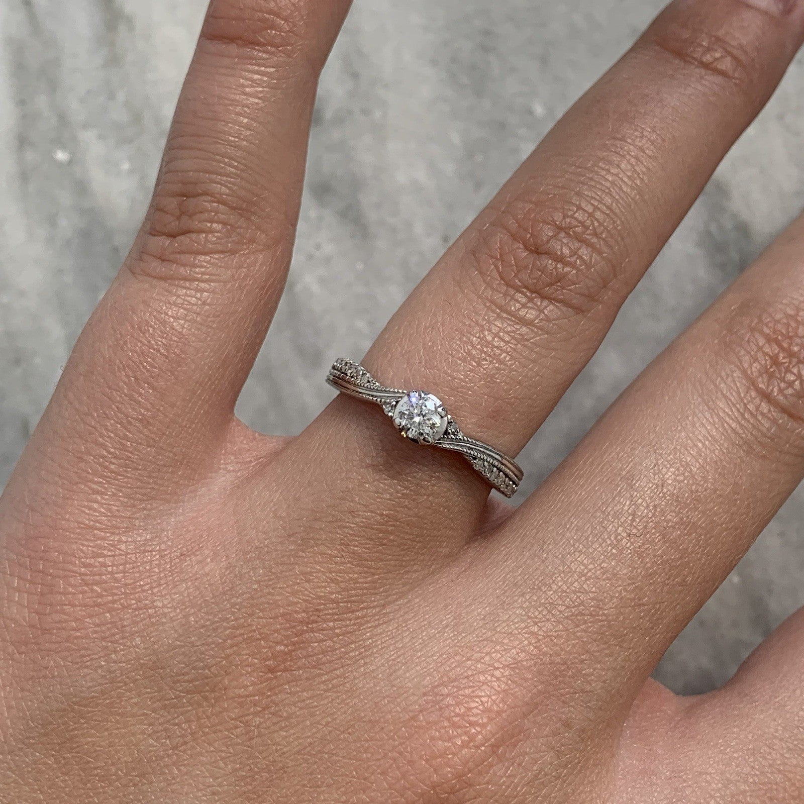 A beautiful diamond solitaire milgrain engagement style ring in white gold.