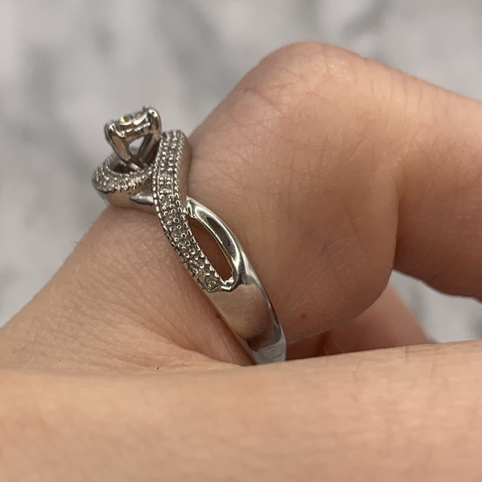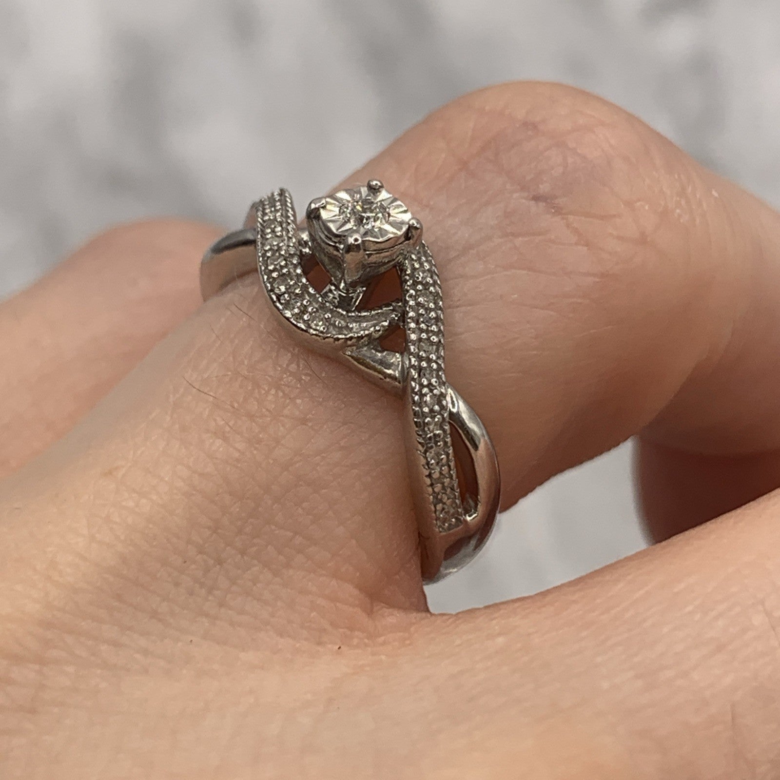 A stunning white gold crossover twist ring adorned with petite diamonds, showcasing an illusion cut diamond to centre.