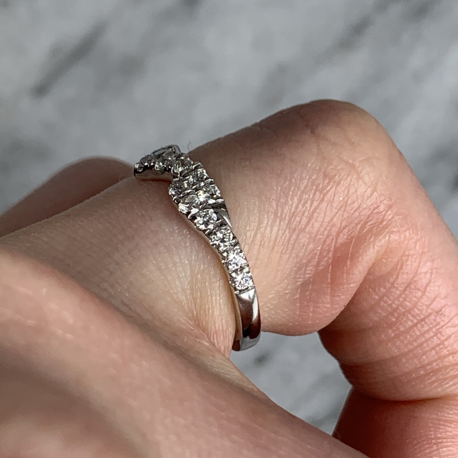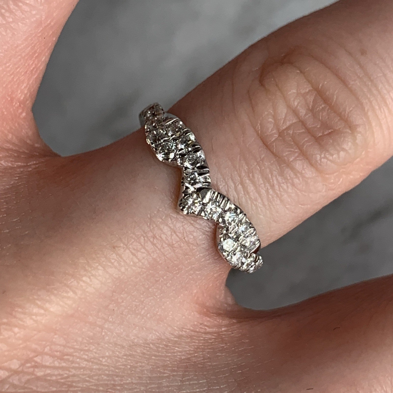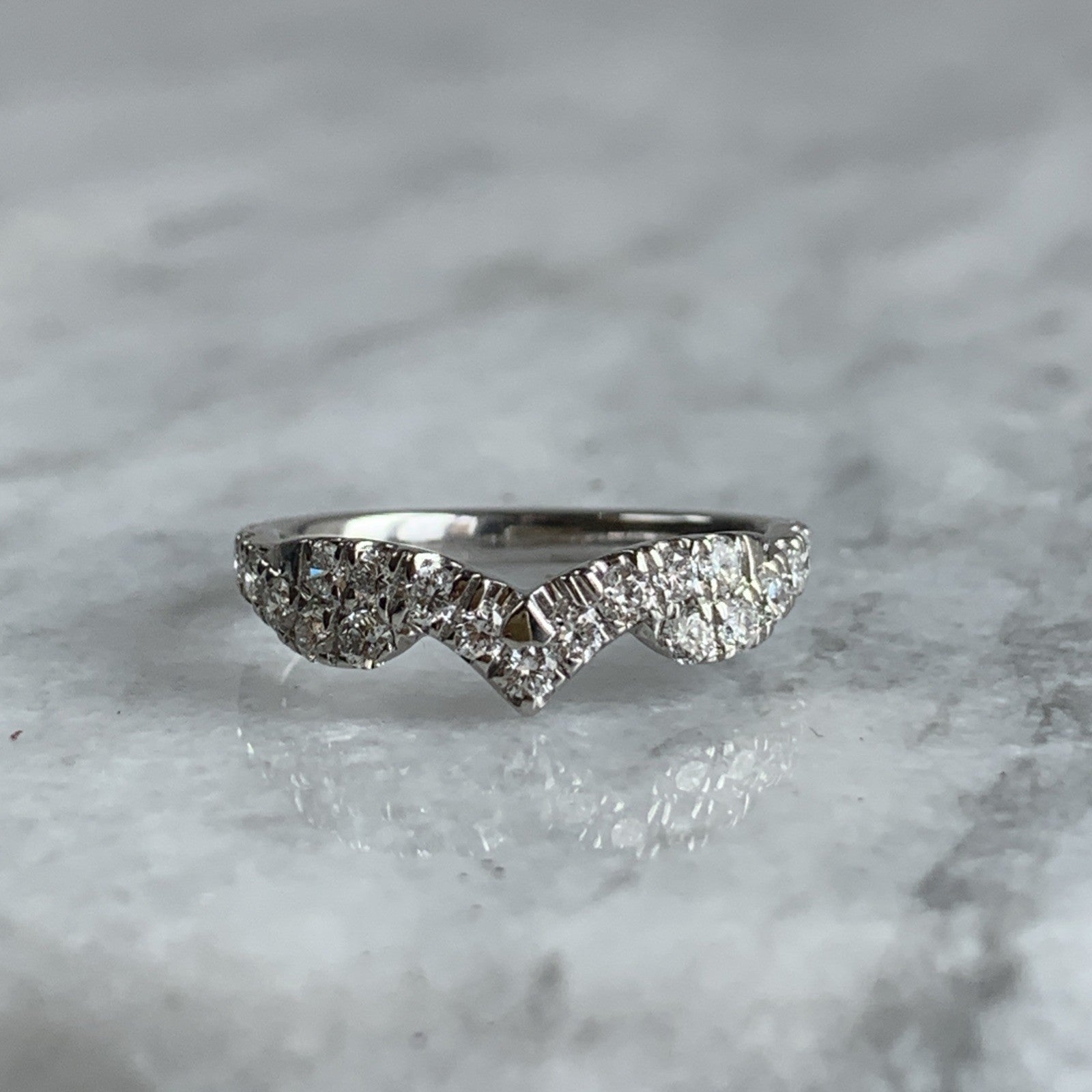 A gorgeous white gold wishbone style ring adorned with pave set diamonds.