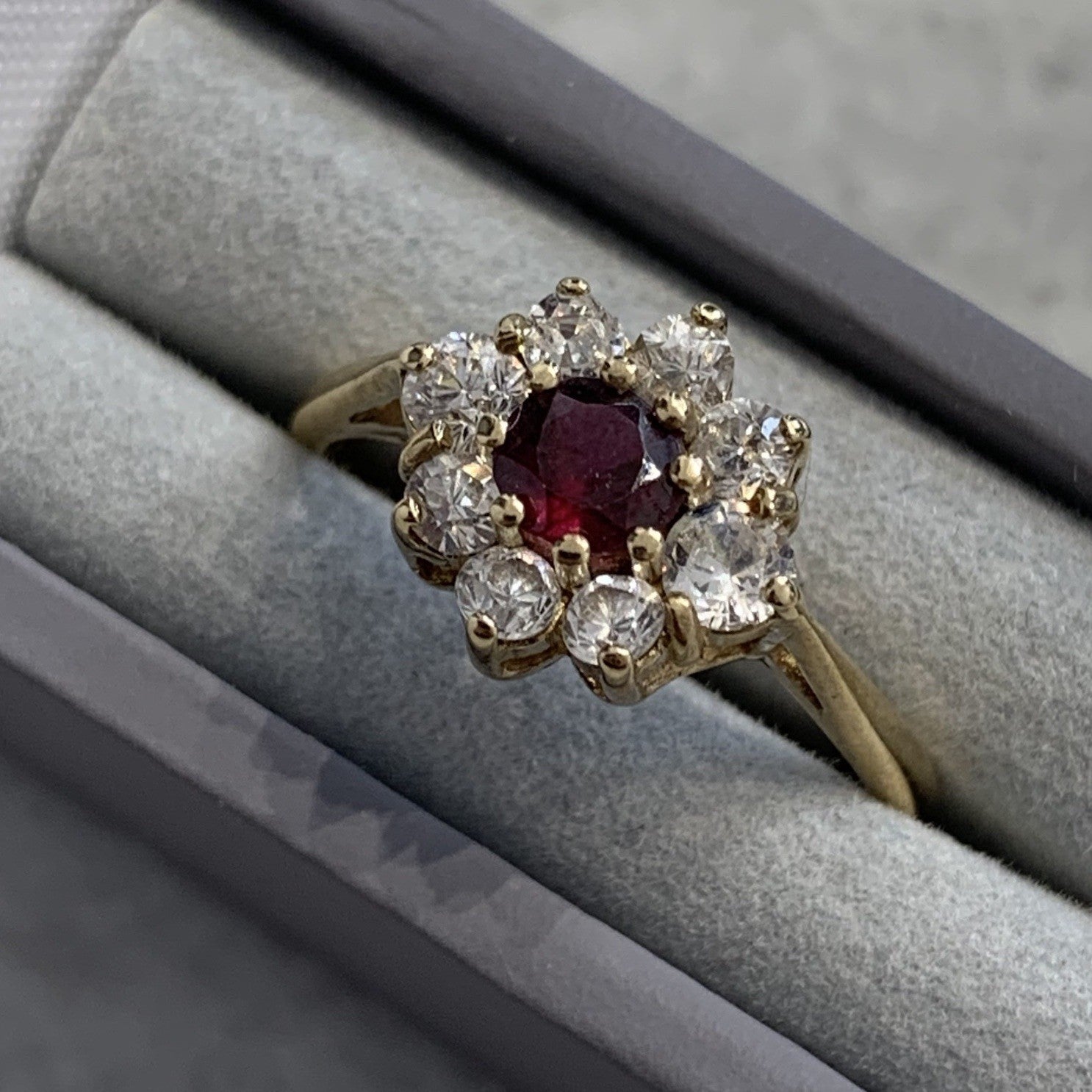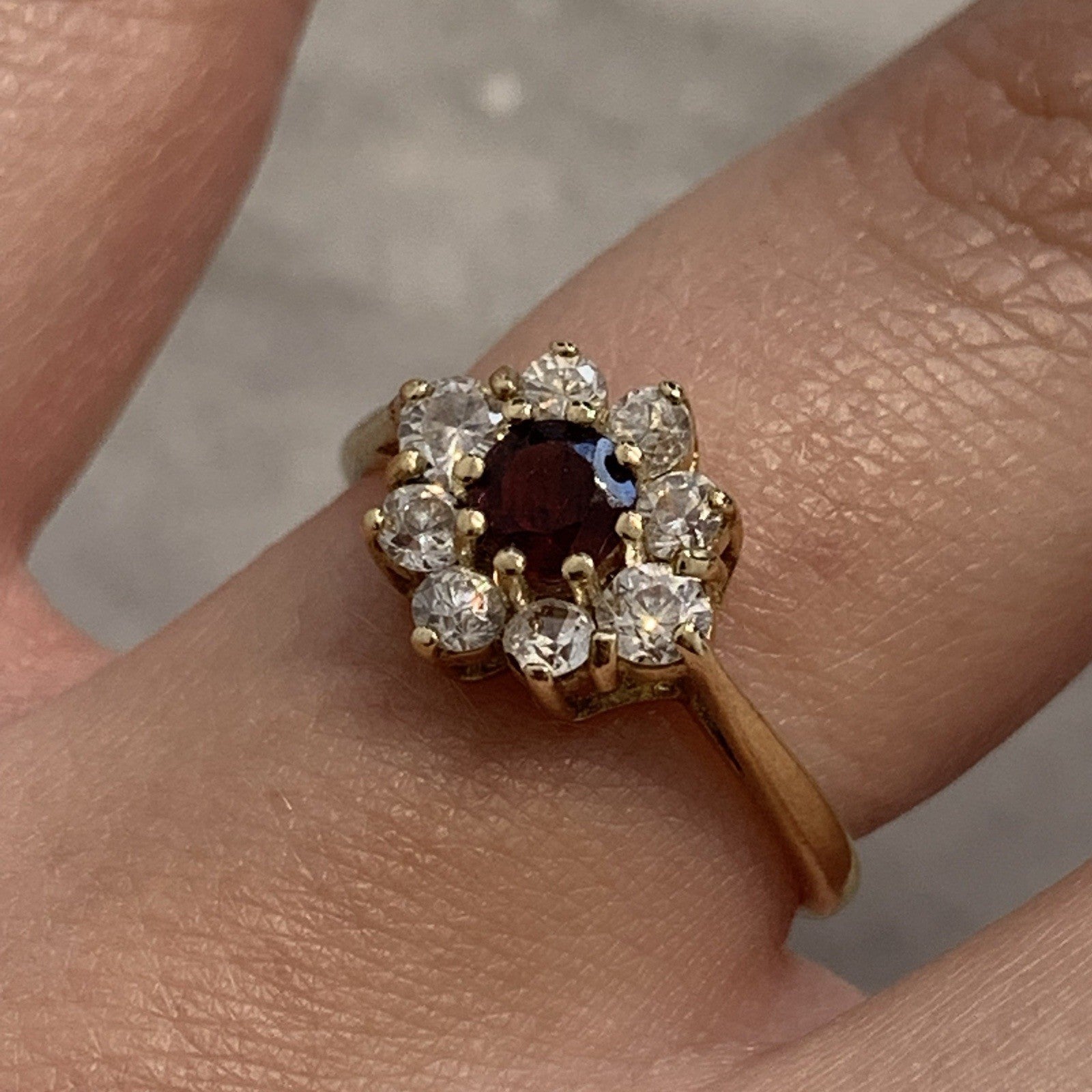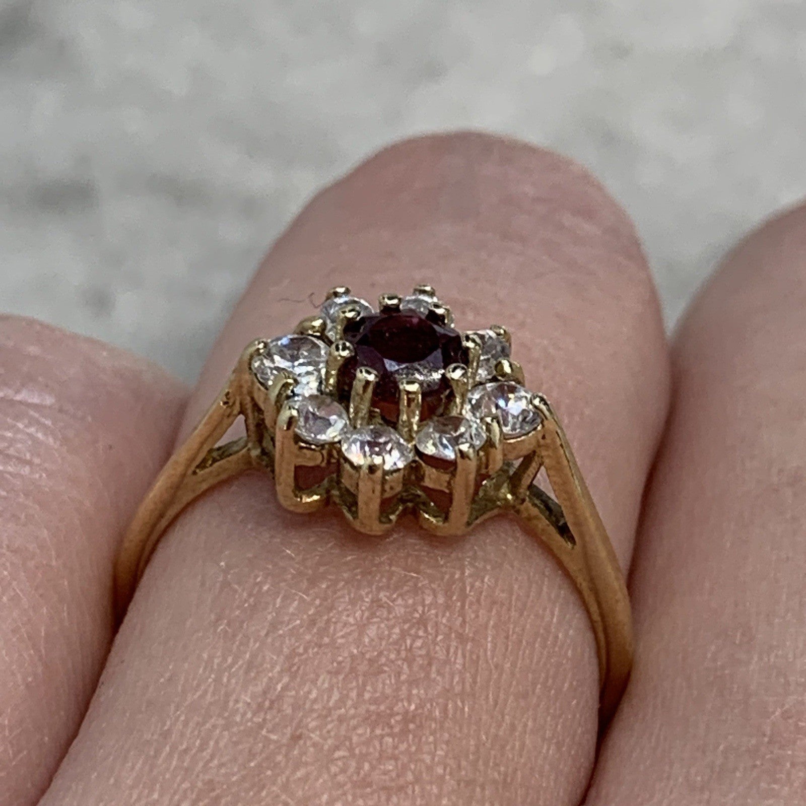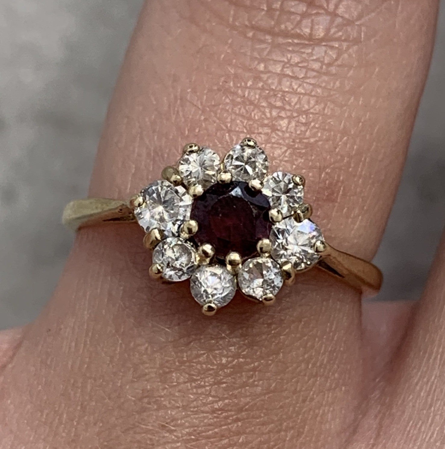 Garnet & CZ Ring 9 ct 375 Yellow Gold - Size K 1/2 - Daisy Flower