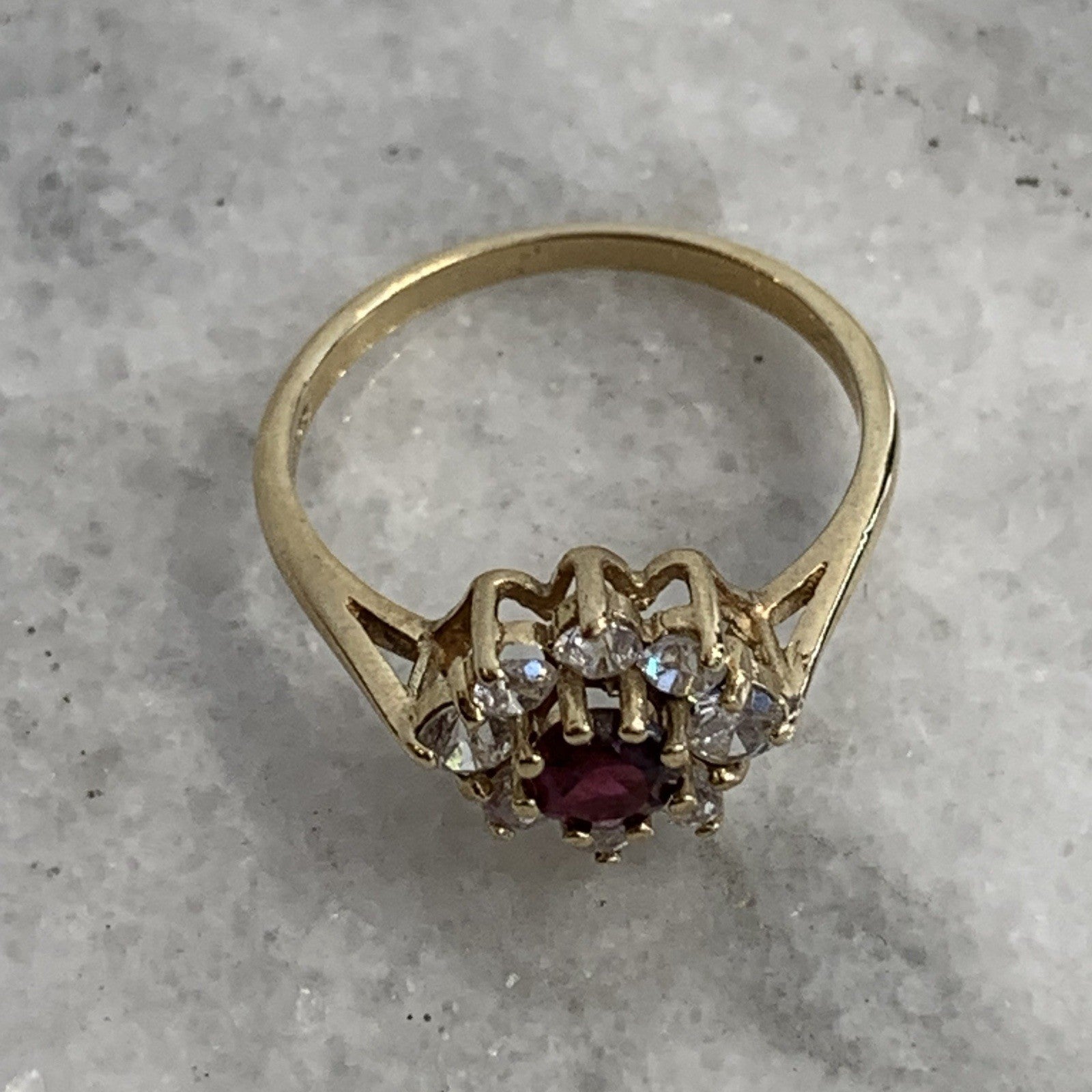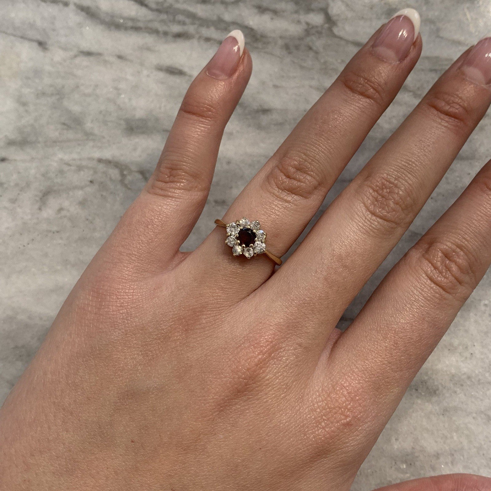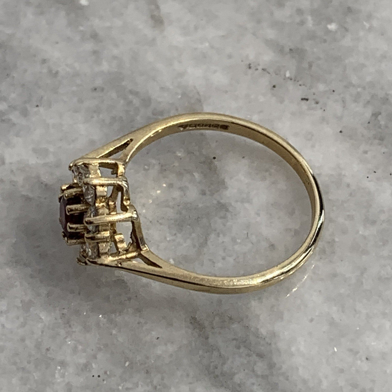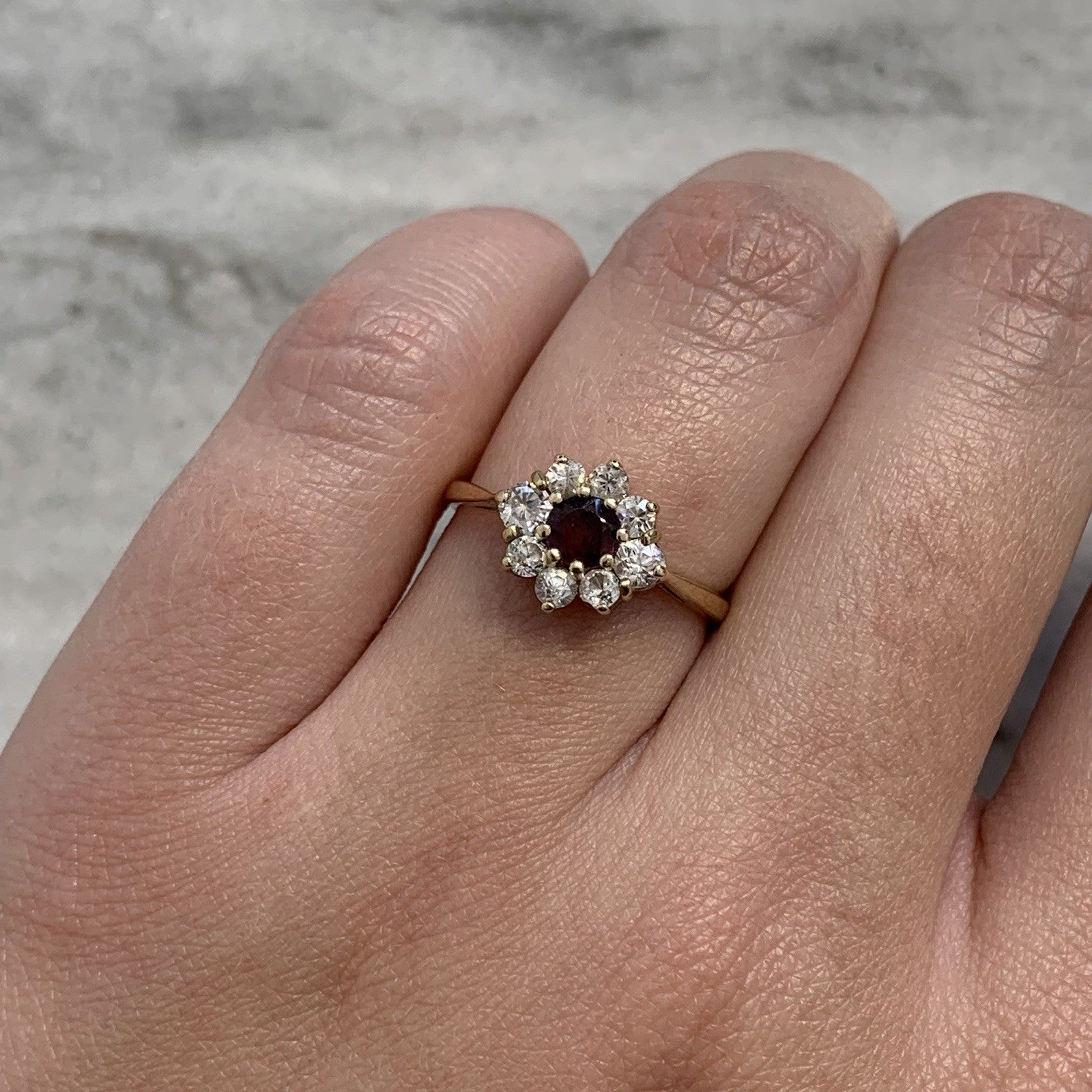 Garnet & CZ Ring 9 ct 375 Yellow Gold - Size K 1/2 - Daisy Flower