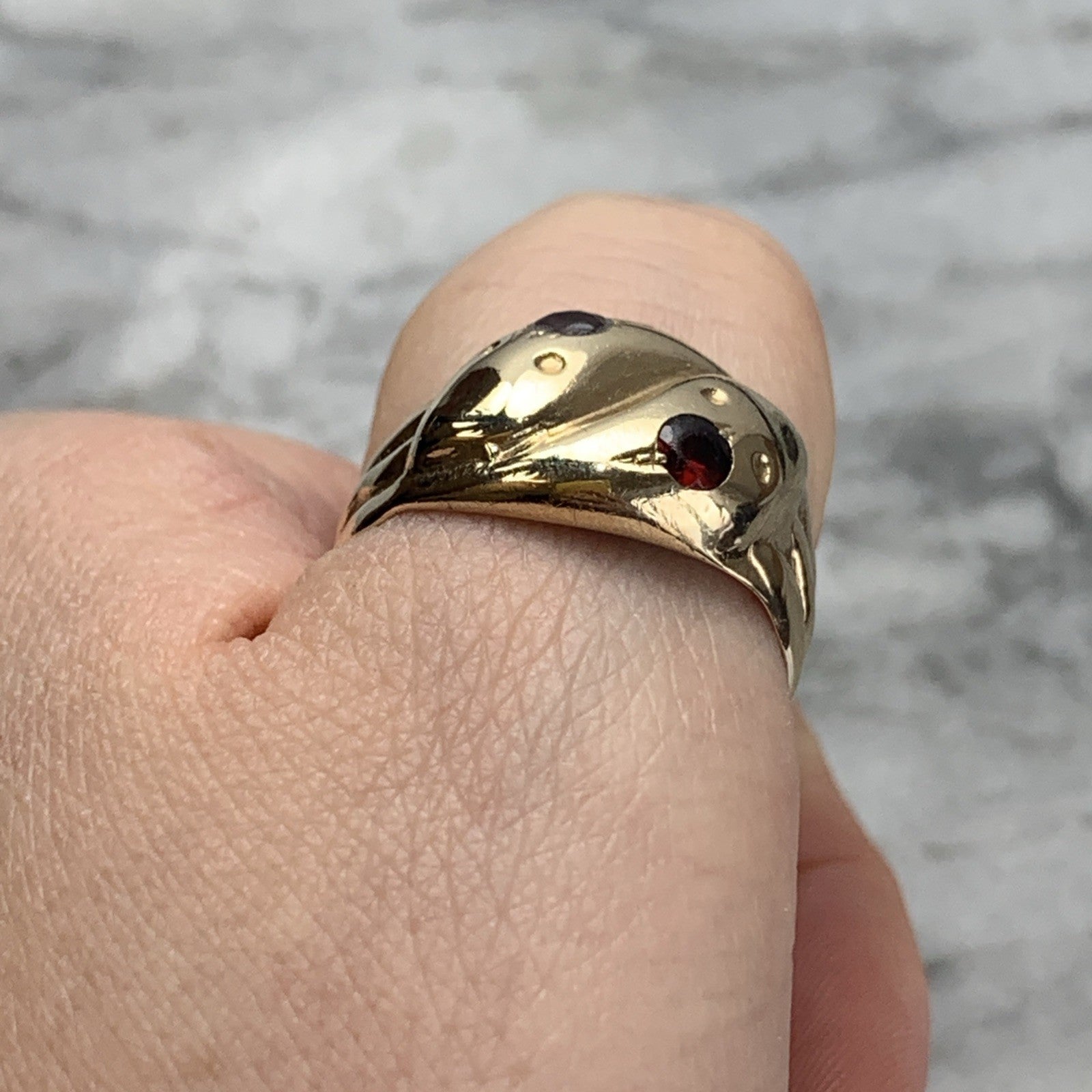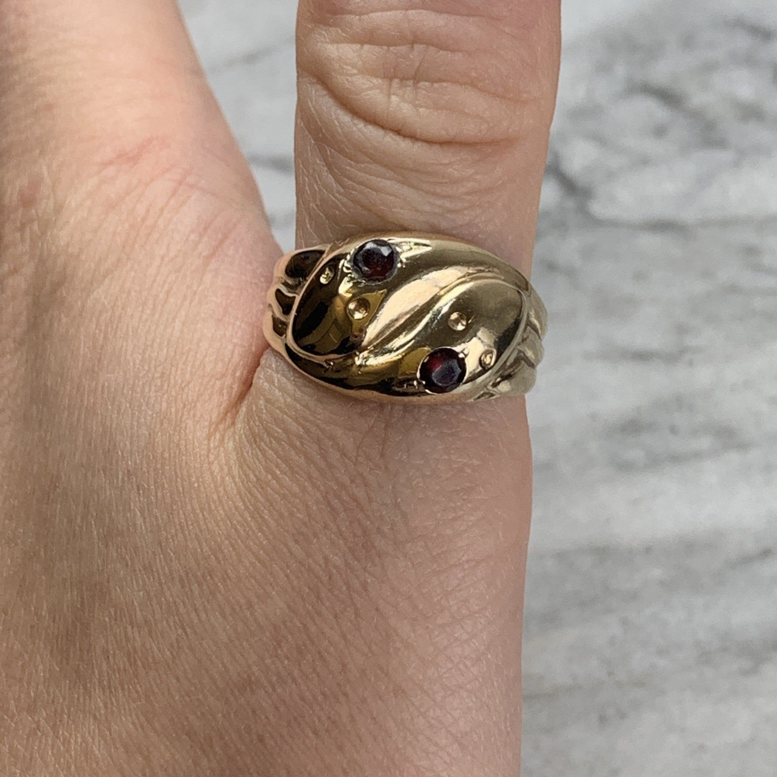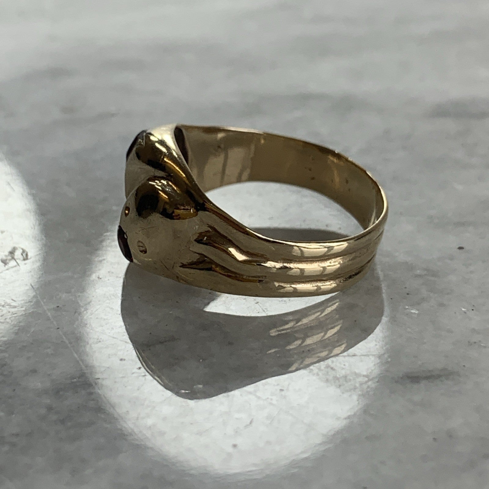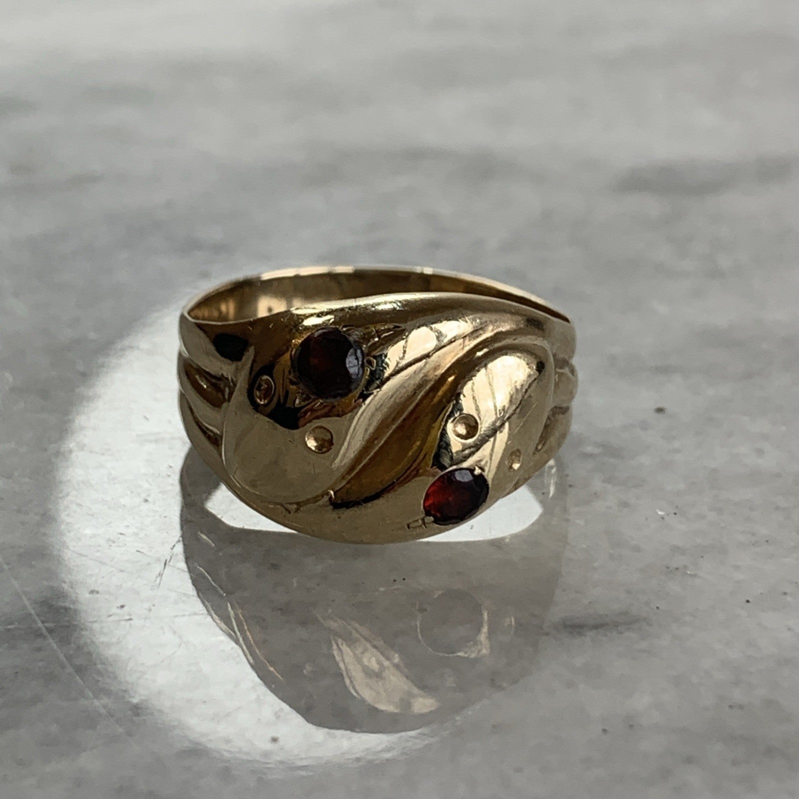 A gorgeous gold chunky band ring crafted in the shape of two snakes with a duo of garnets flush set in their heads to accent.
