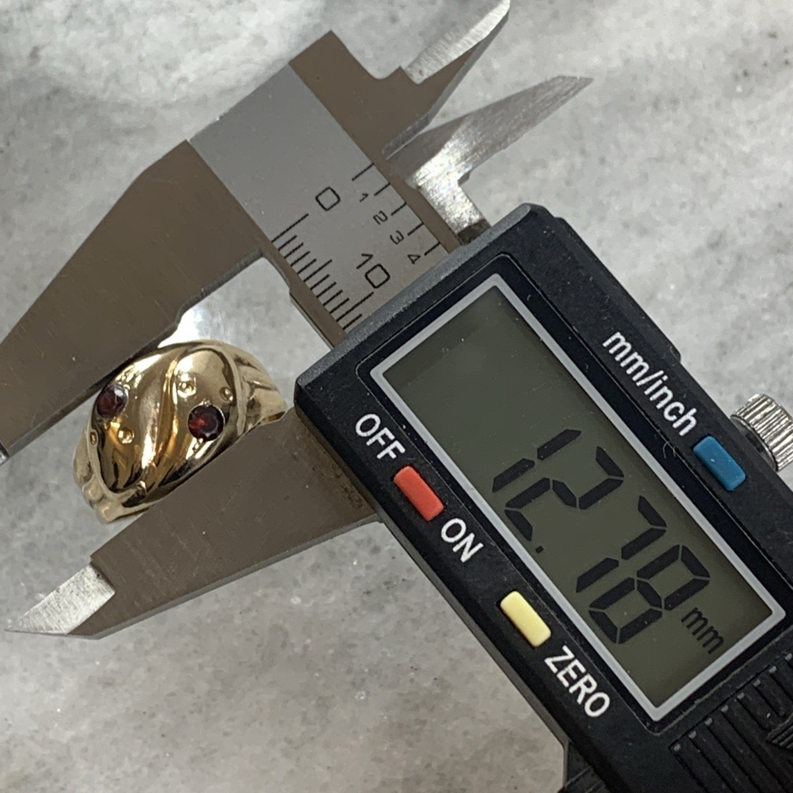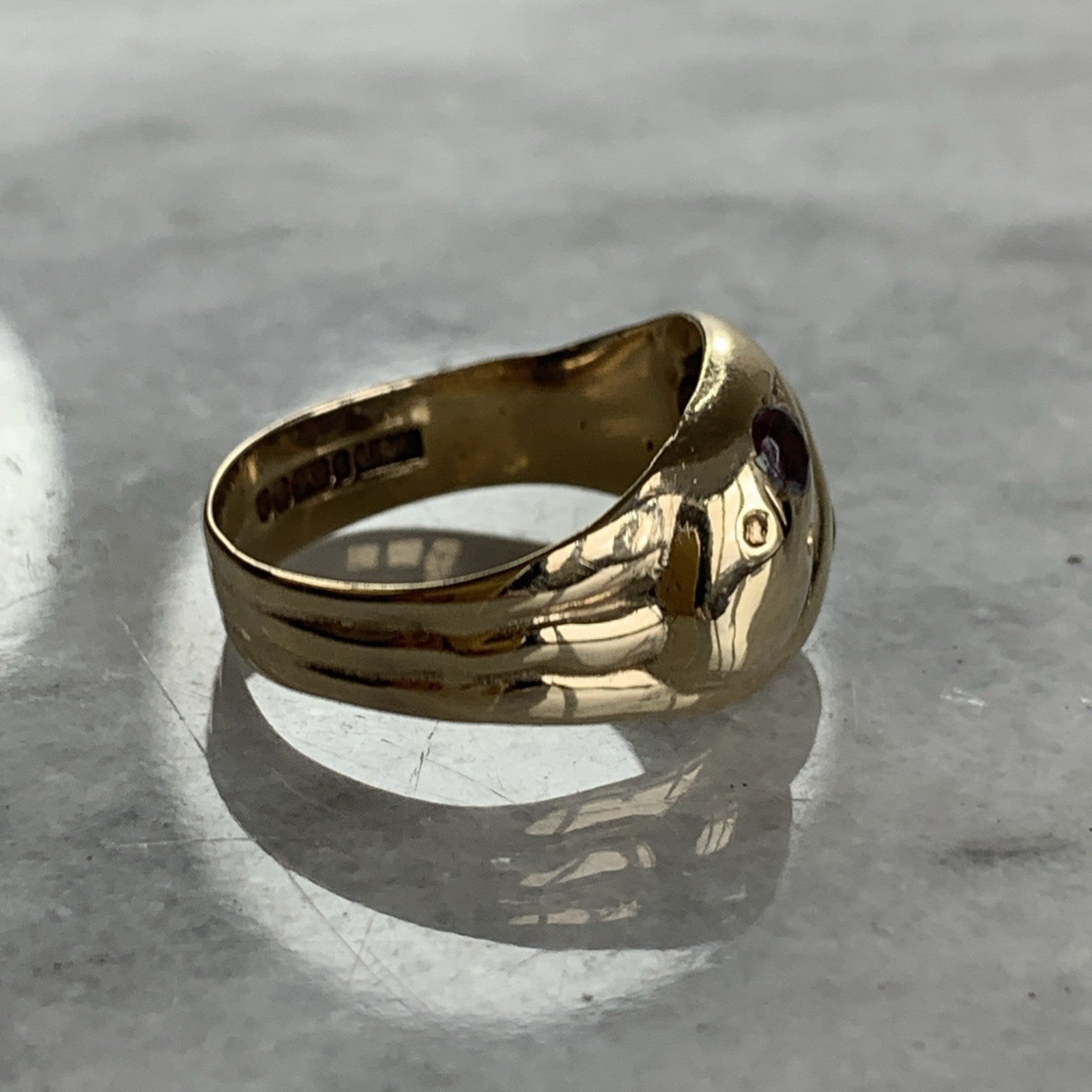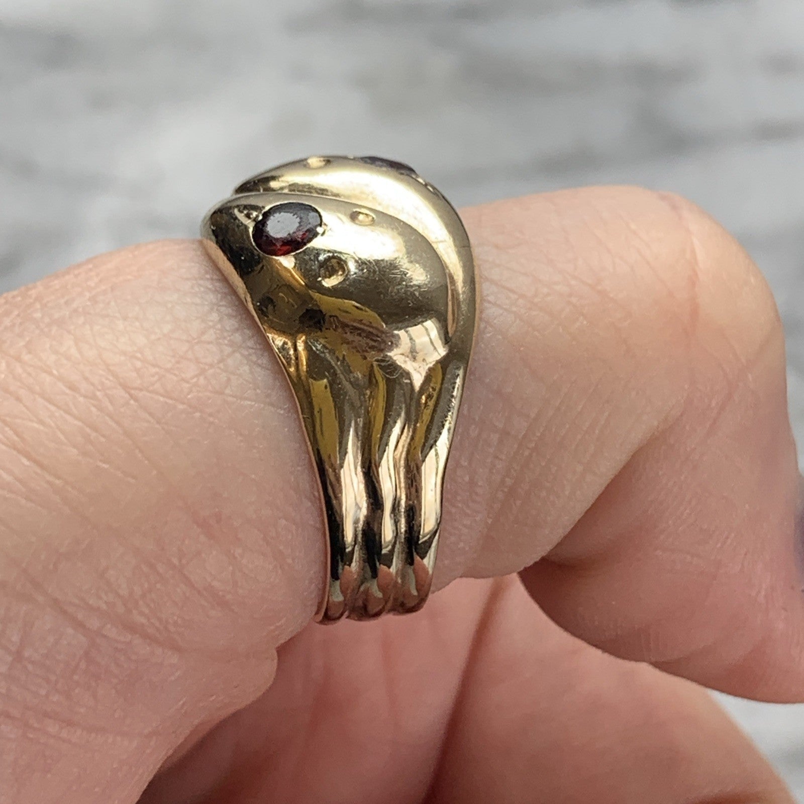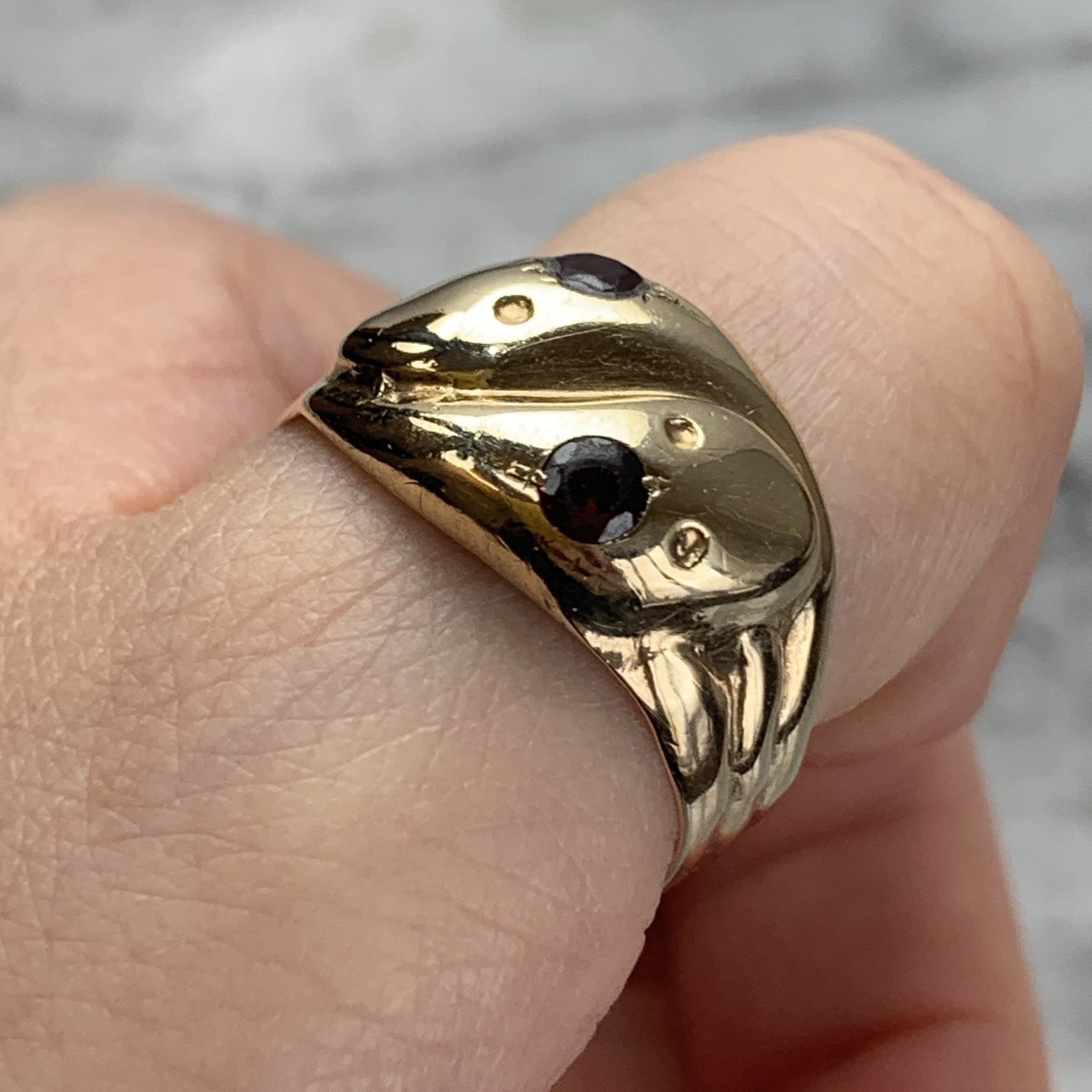 A gorgeous gold chunky band ring crafted in the shape of two snakes with a duo of garnets flush set in their heads to accent.