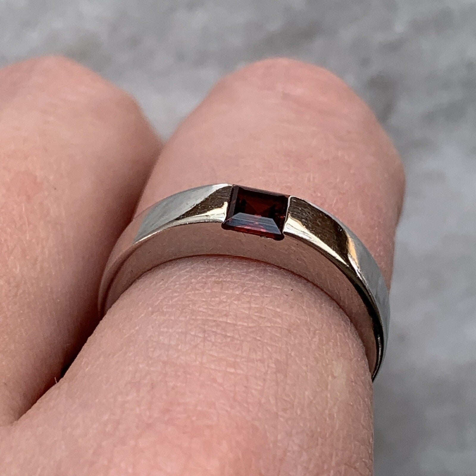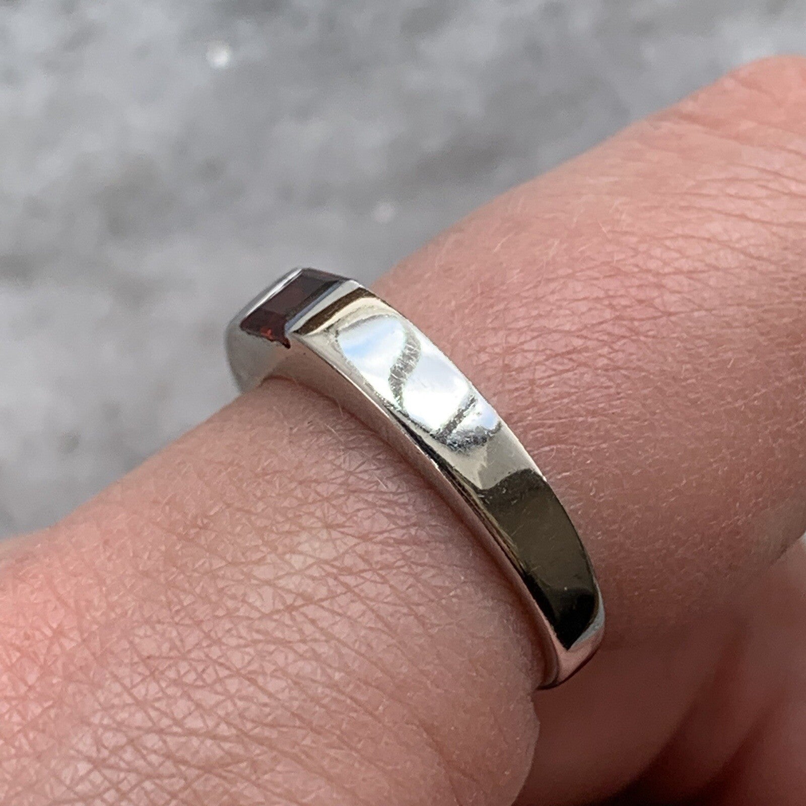 A beautiful solitaire ring featuring a square cut garnet gemstone in a channel tension setting.