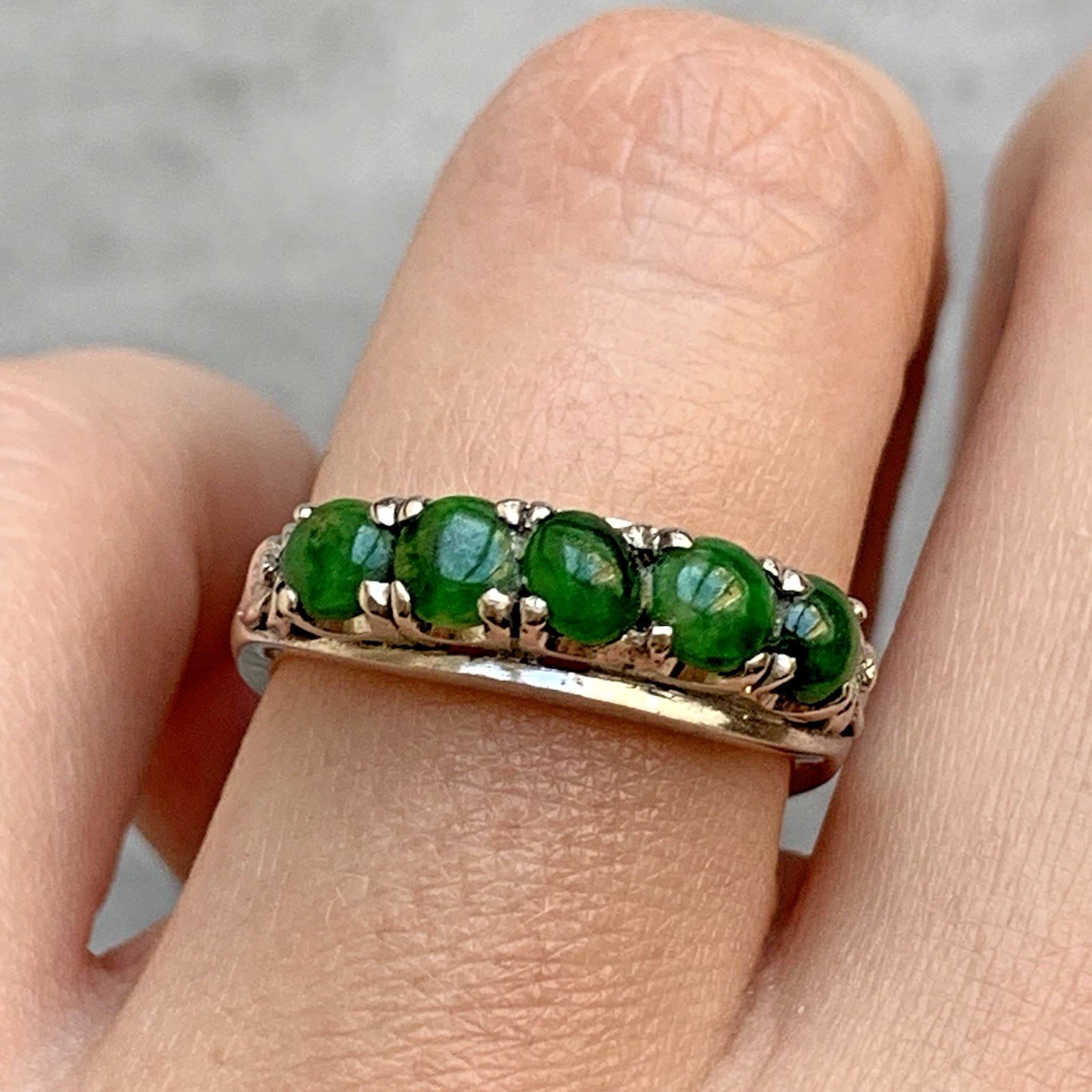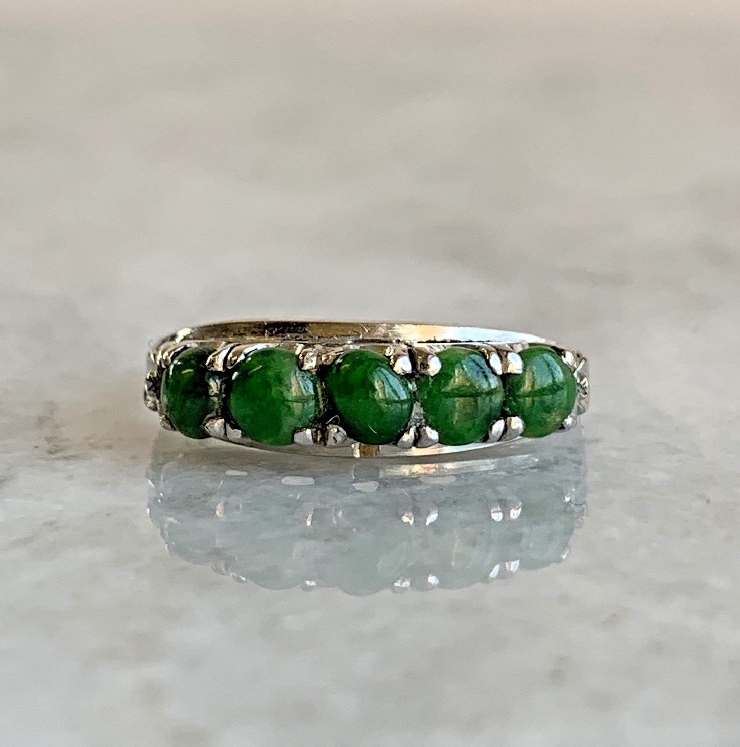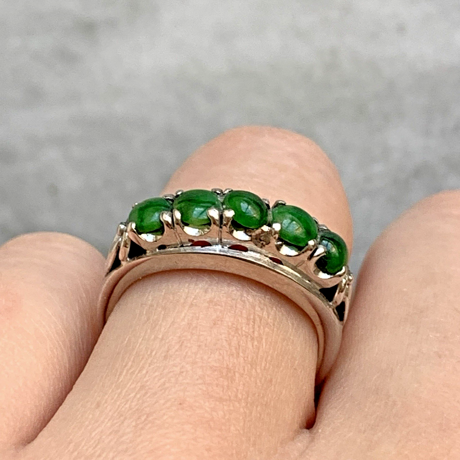 A stunning bespoke ring crafted with quality 14ct white gold. Upon this ring there are five green Jadeite gemstones, cut to a cabochon style.