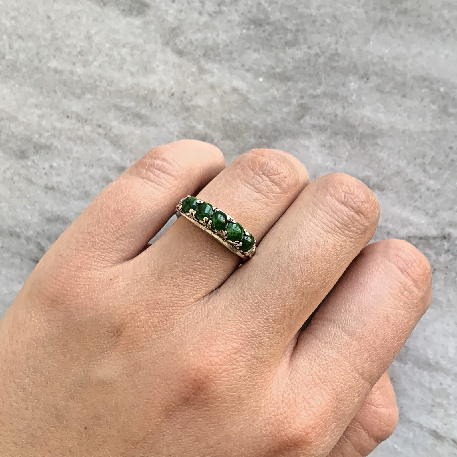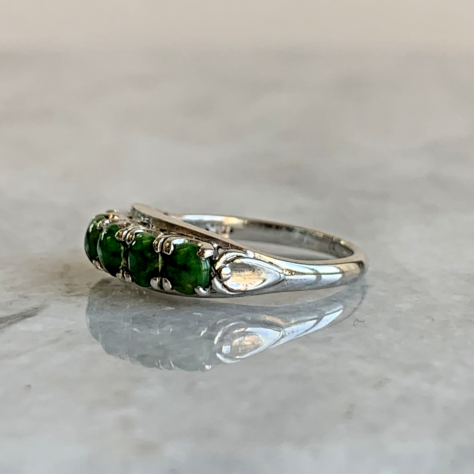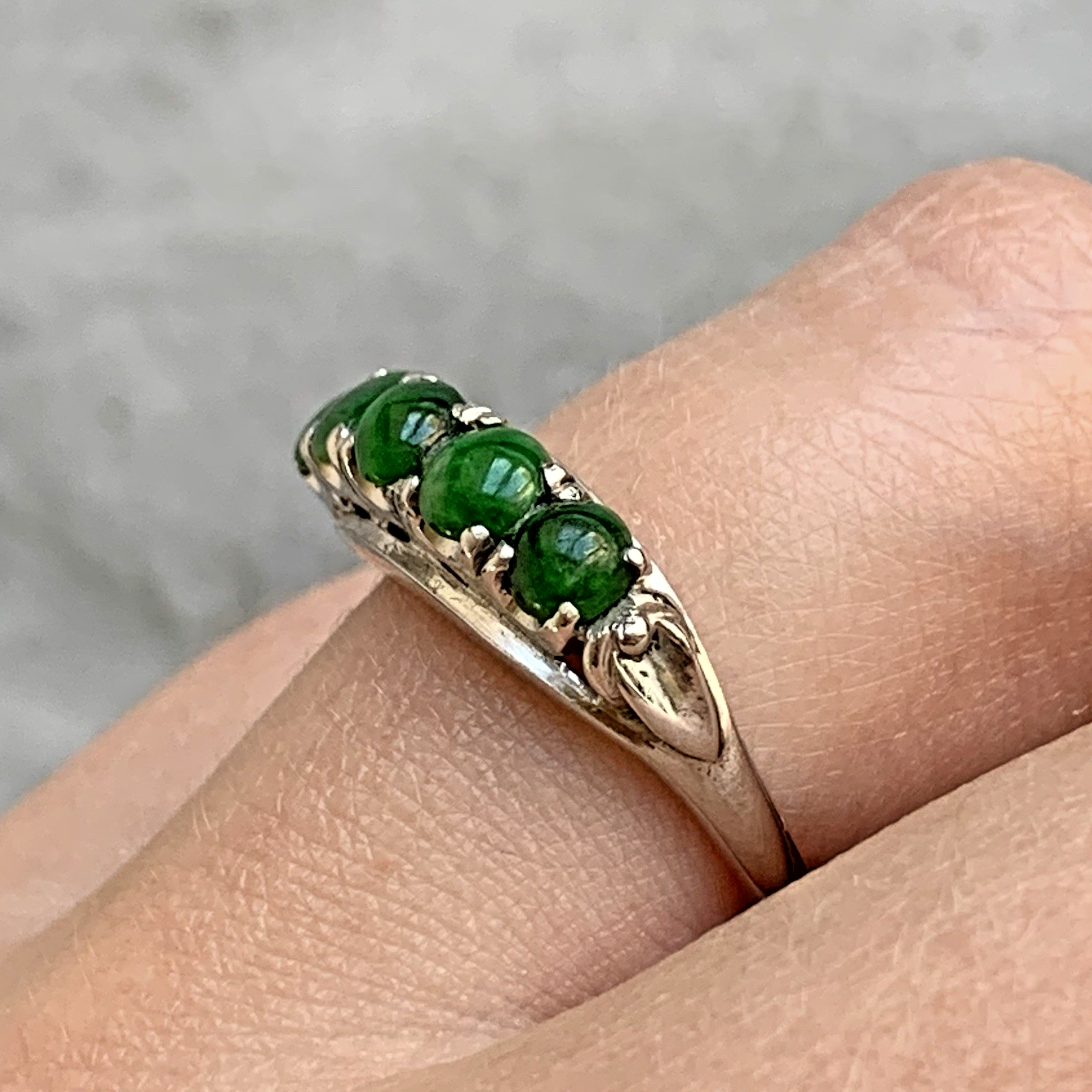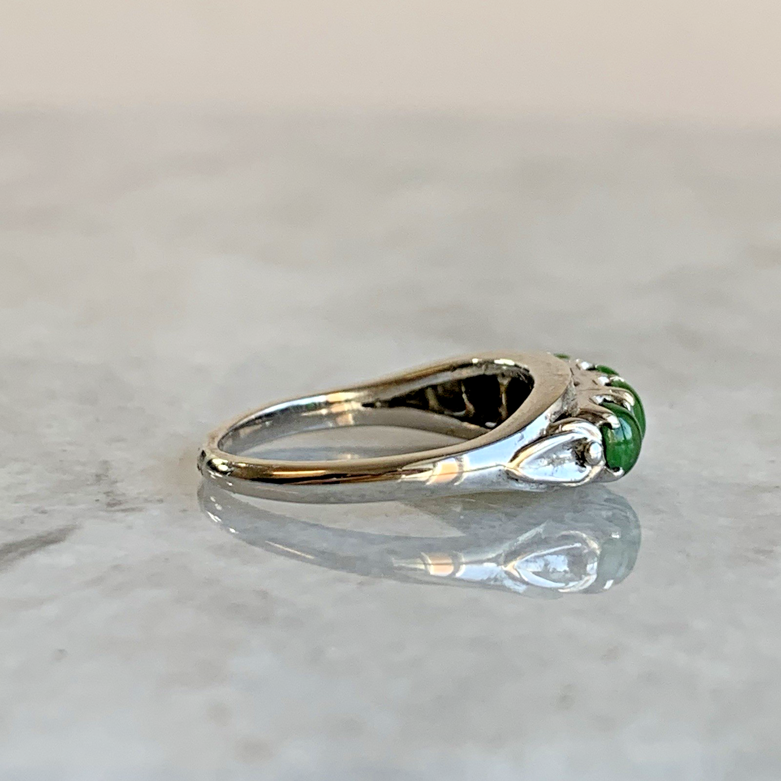 A stunning bespoke ring crafted with quality 14ct white gold. Upon this ring there are five green Jadeite gemstones, cut to a cabochon style.