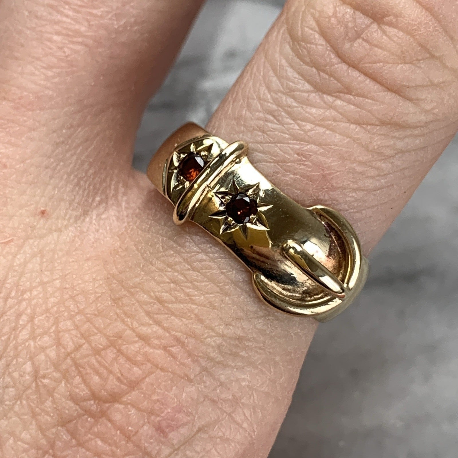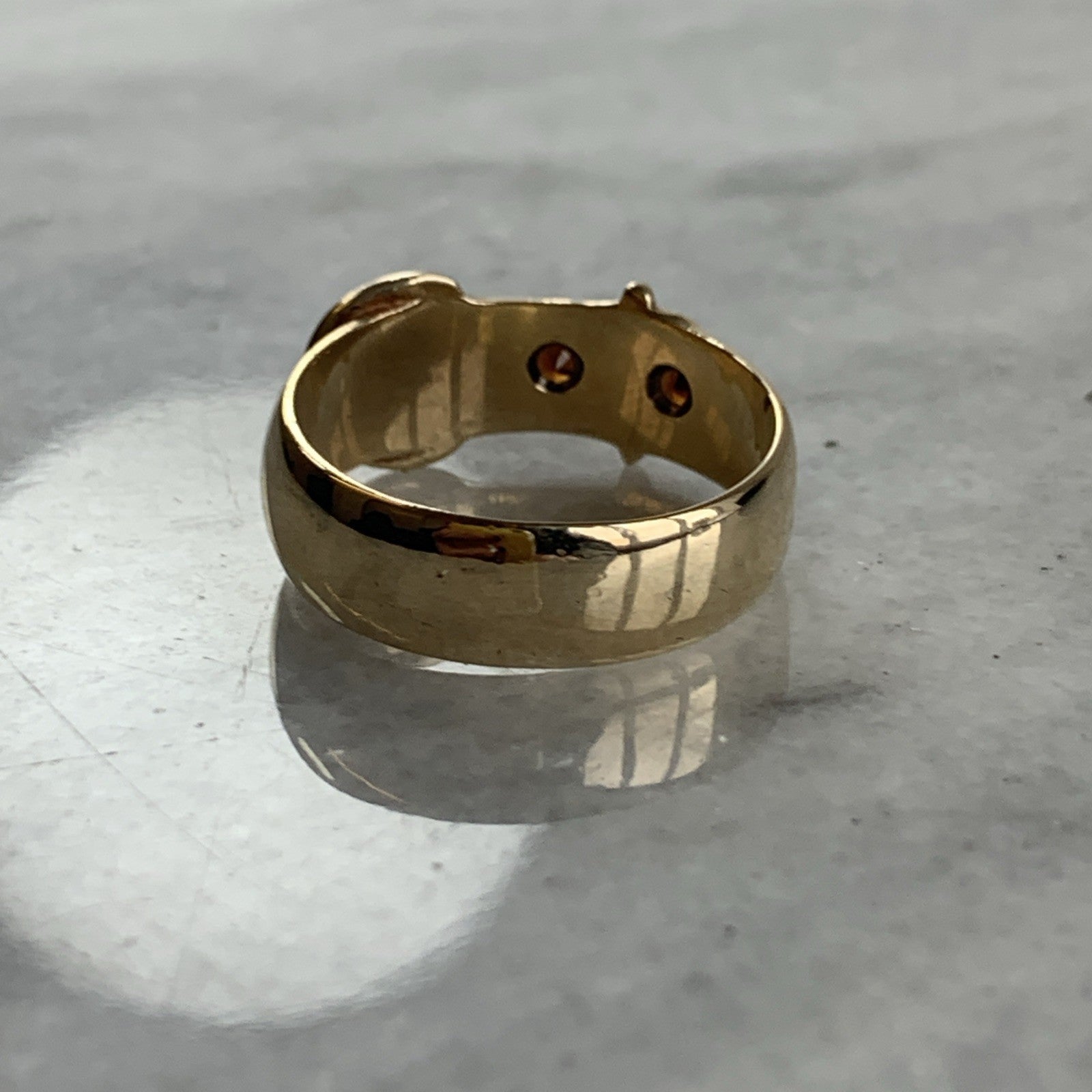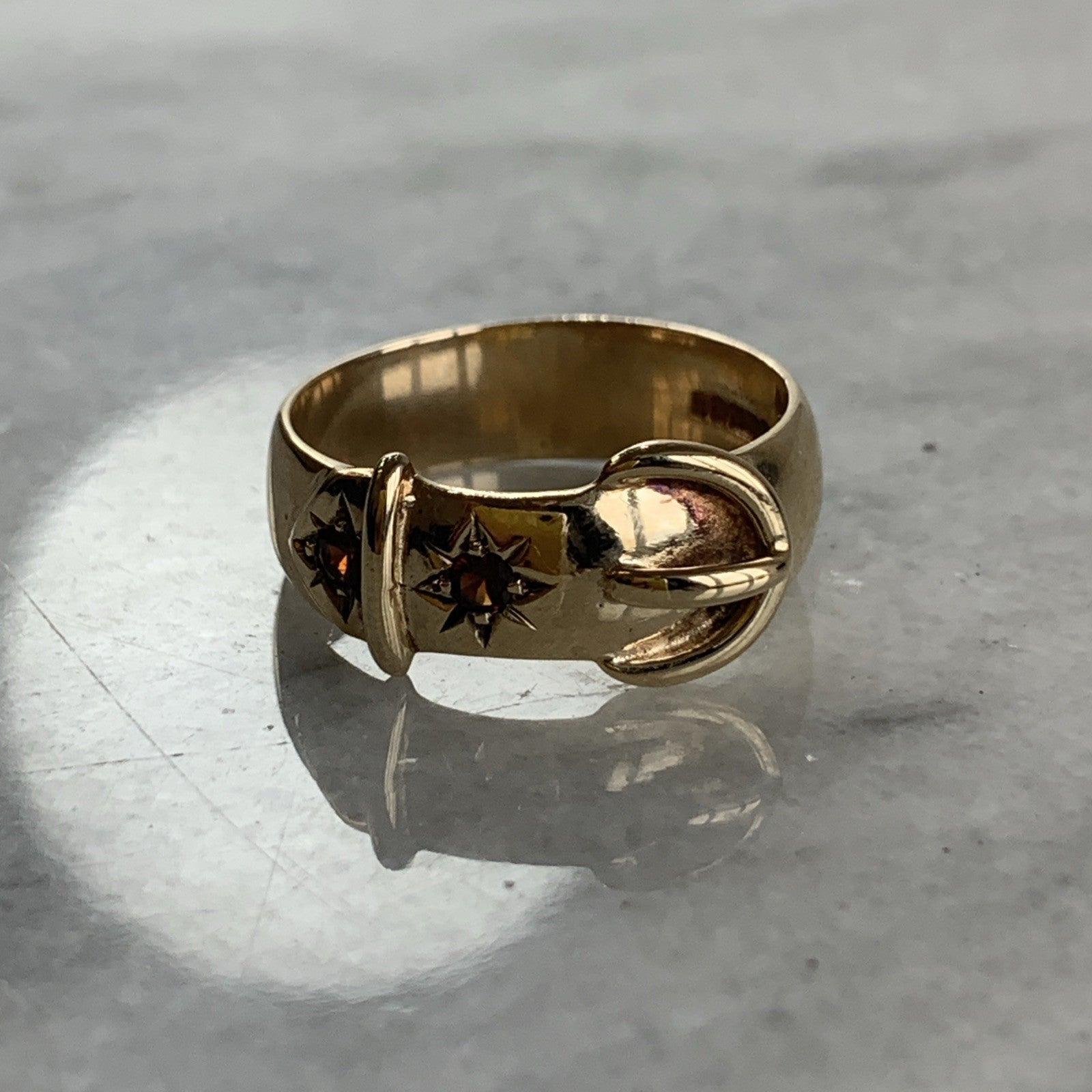 A stunning chunky gold belt buckle style band ring featuring a duo of star set Madeira citrines.