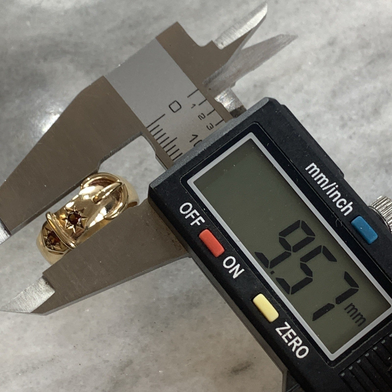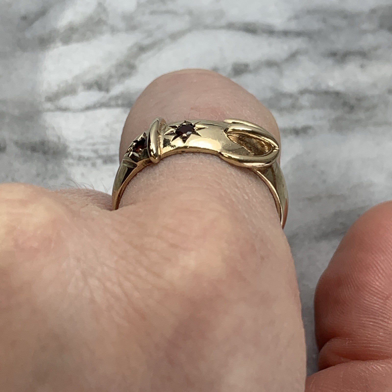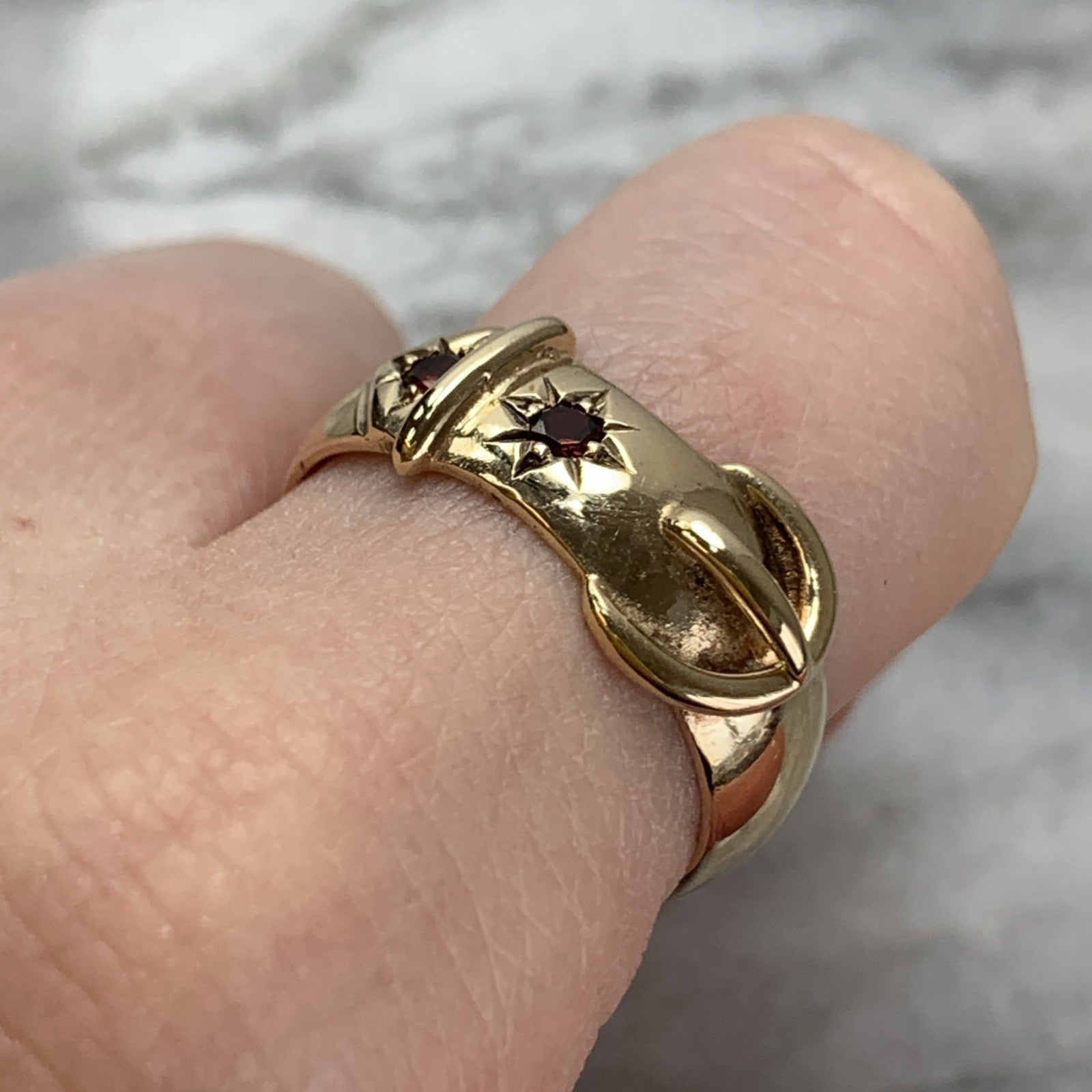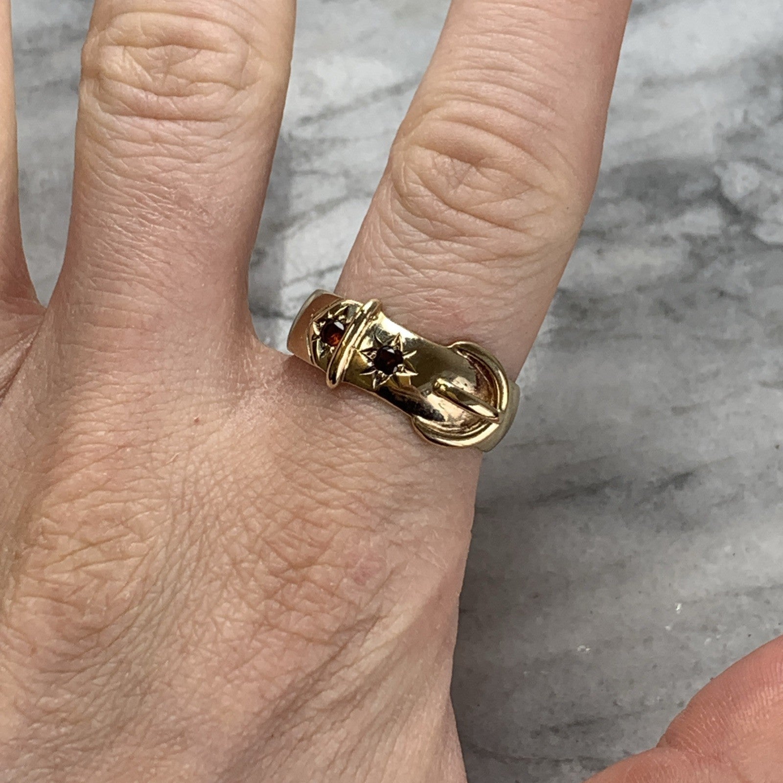 A stunning chunky gold belt buckle style band ring featuring a duo of star set Madeira citrines.