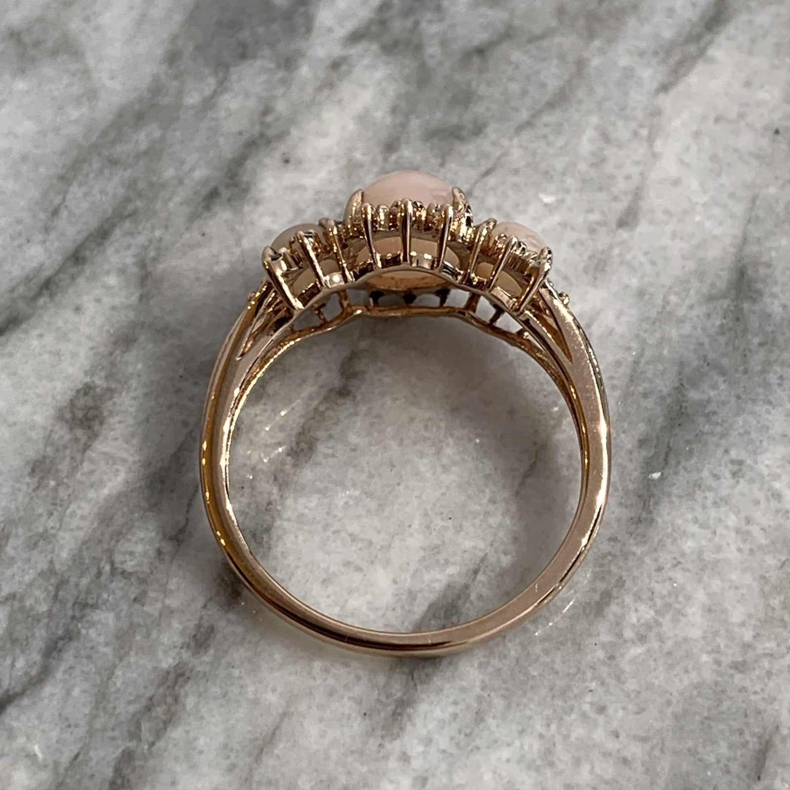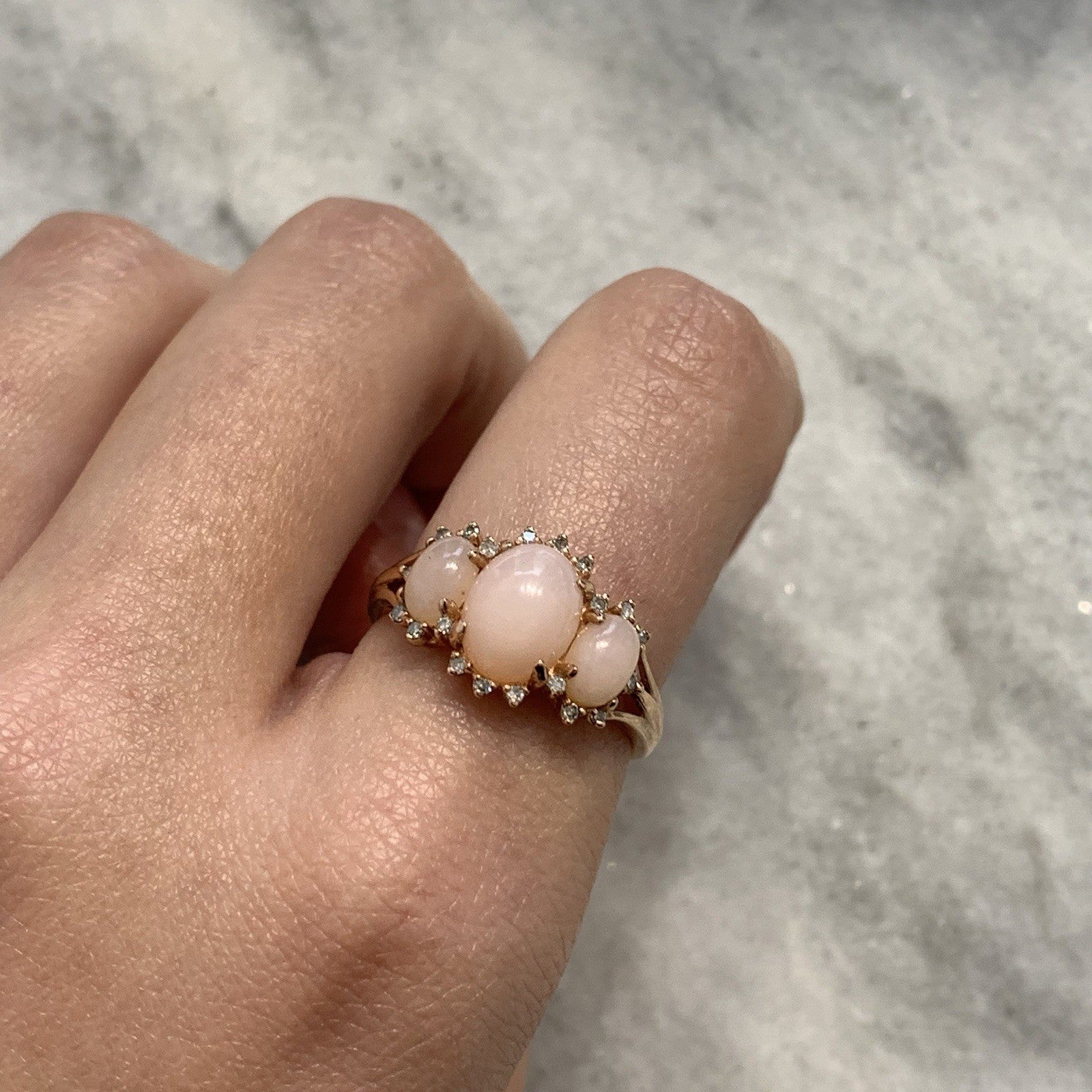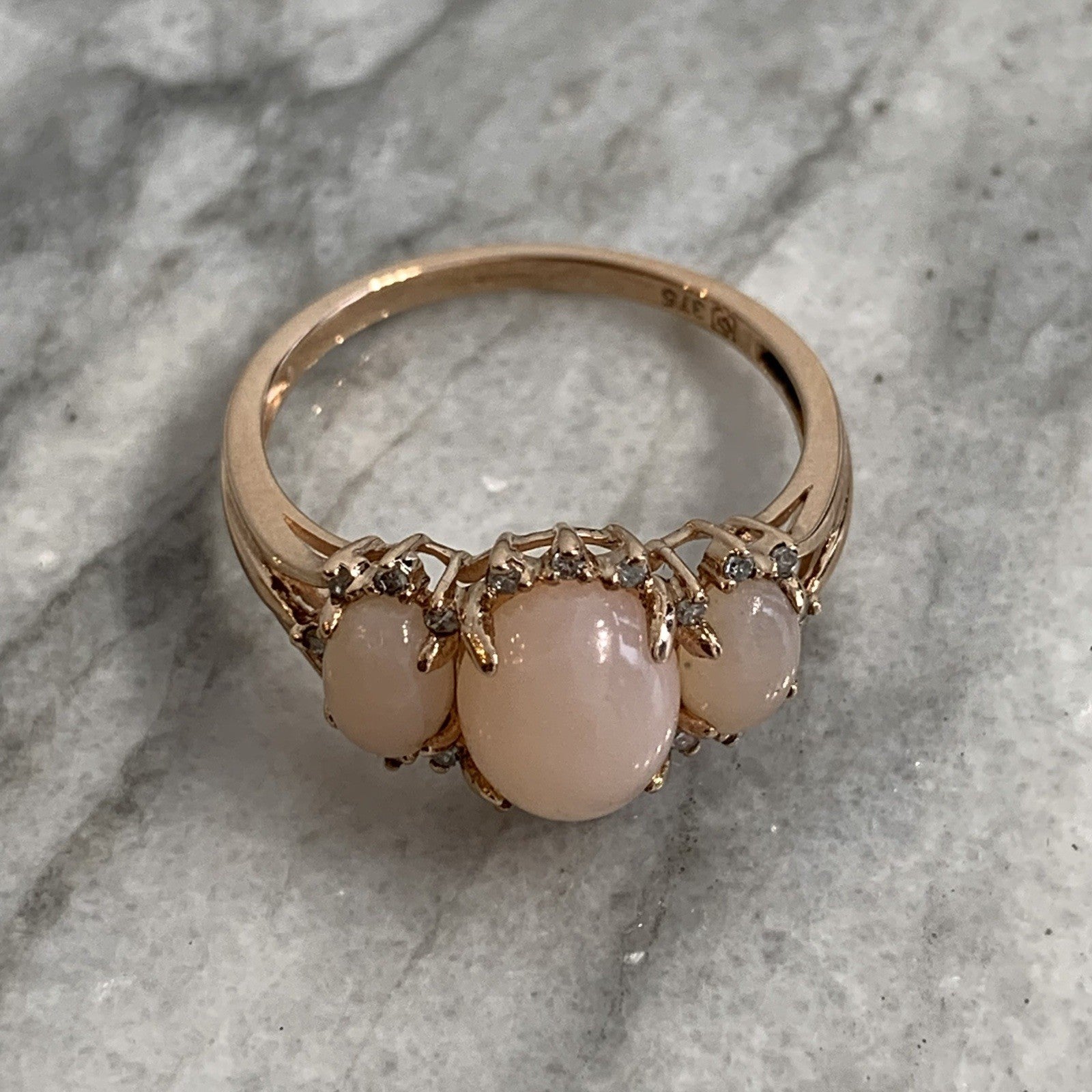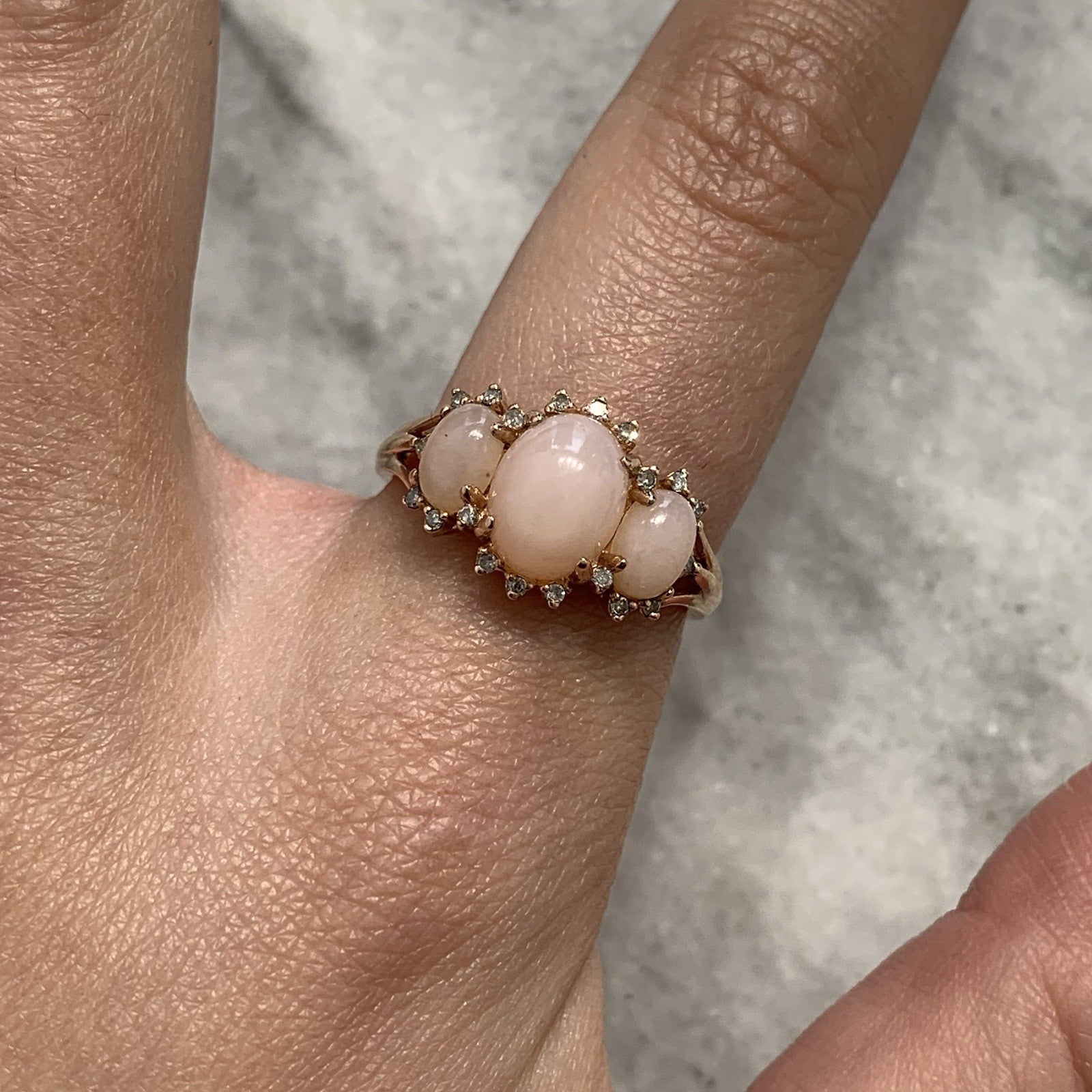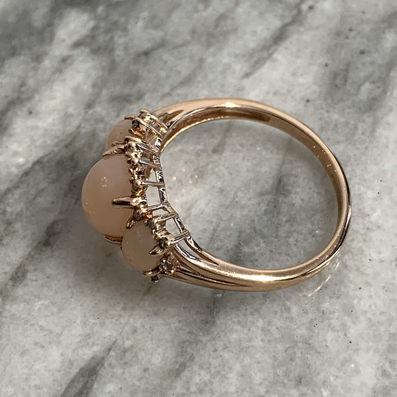 An elegant pink opal cabochon trilogy ring in rose gold, surrounded by delicate diamonds.