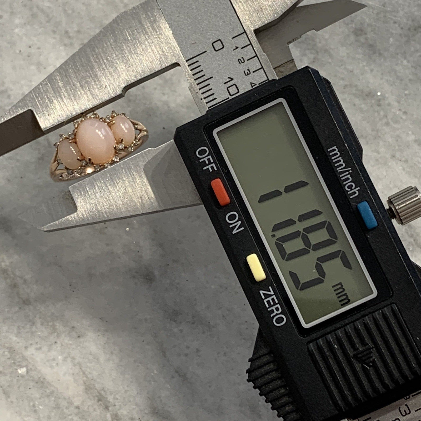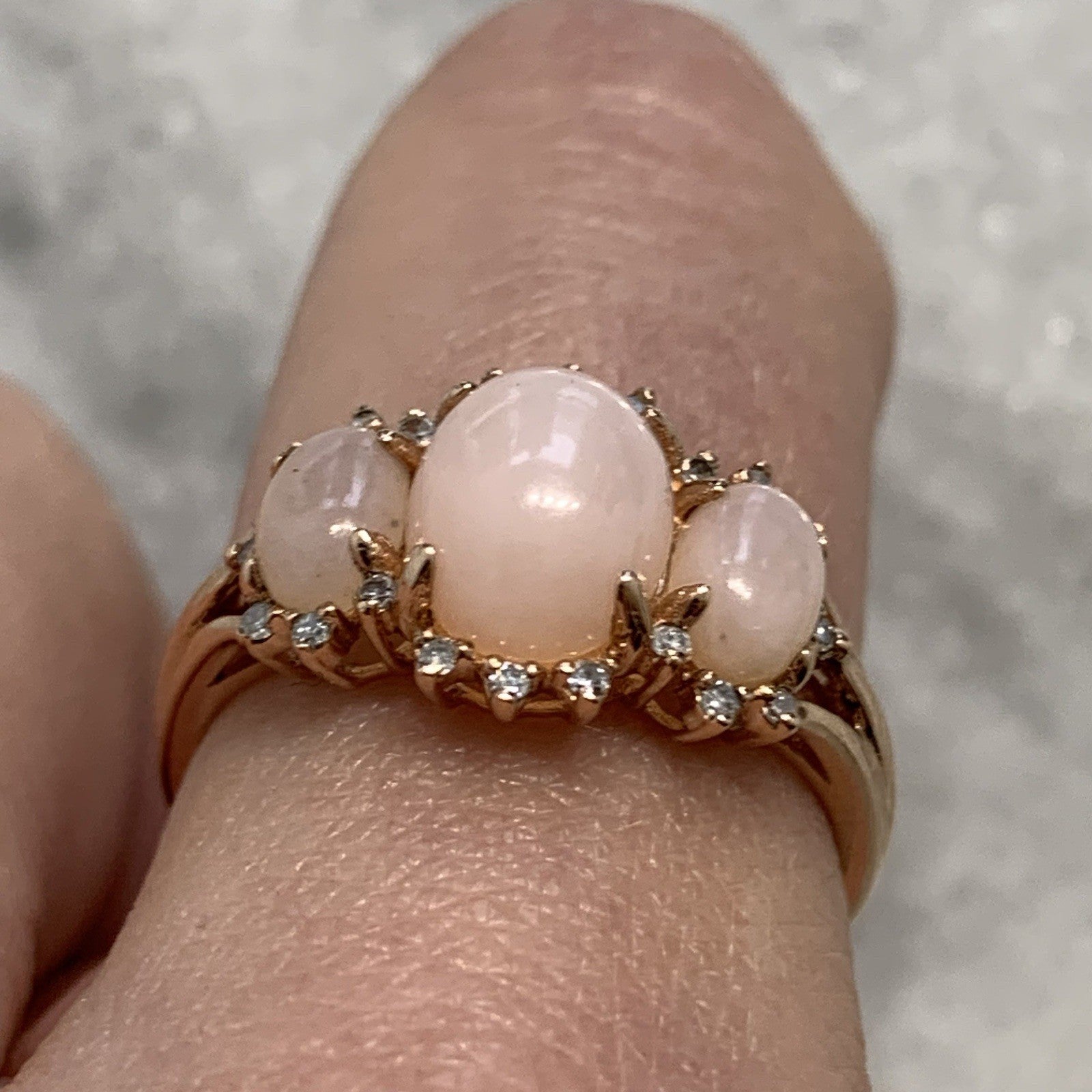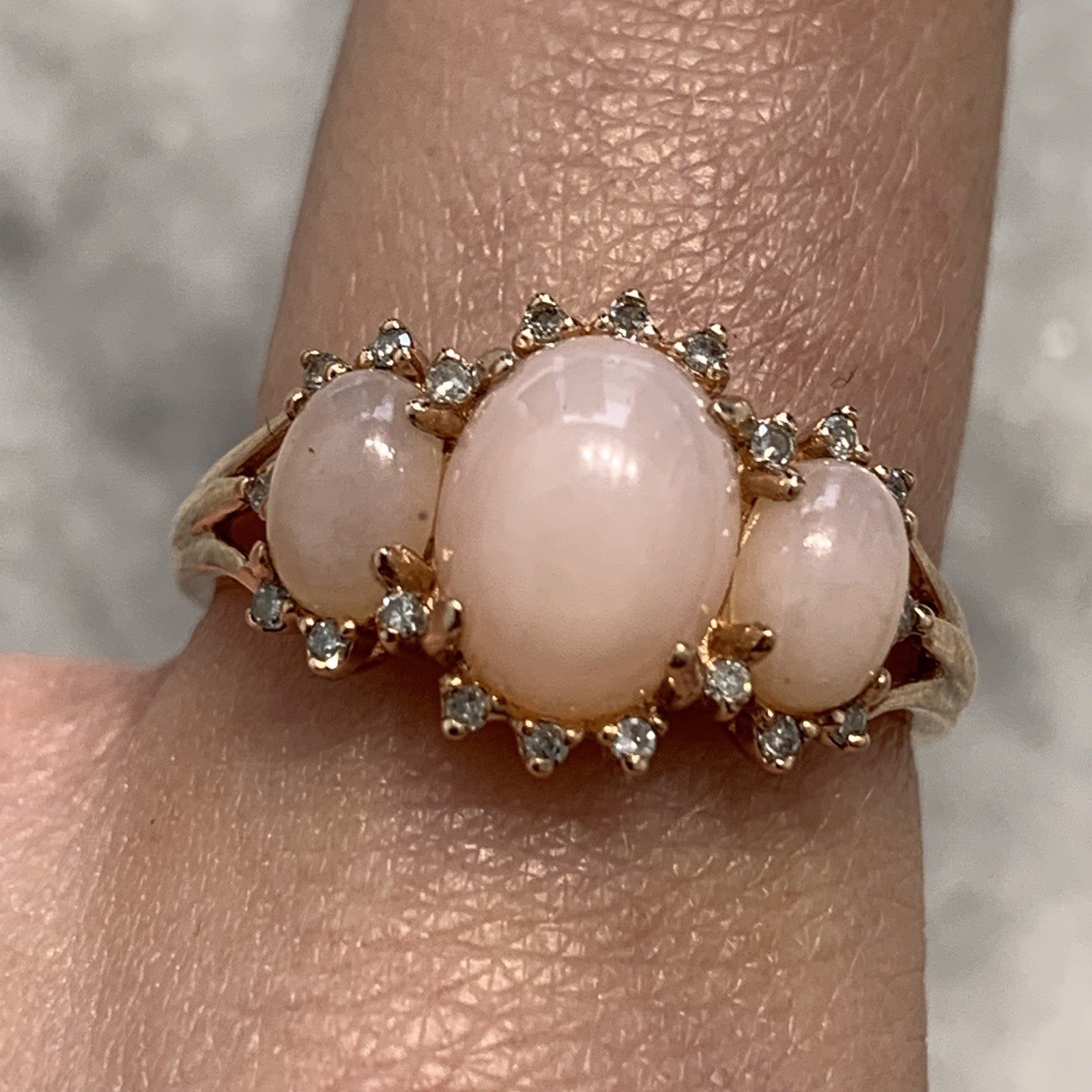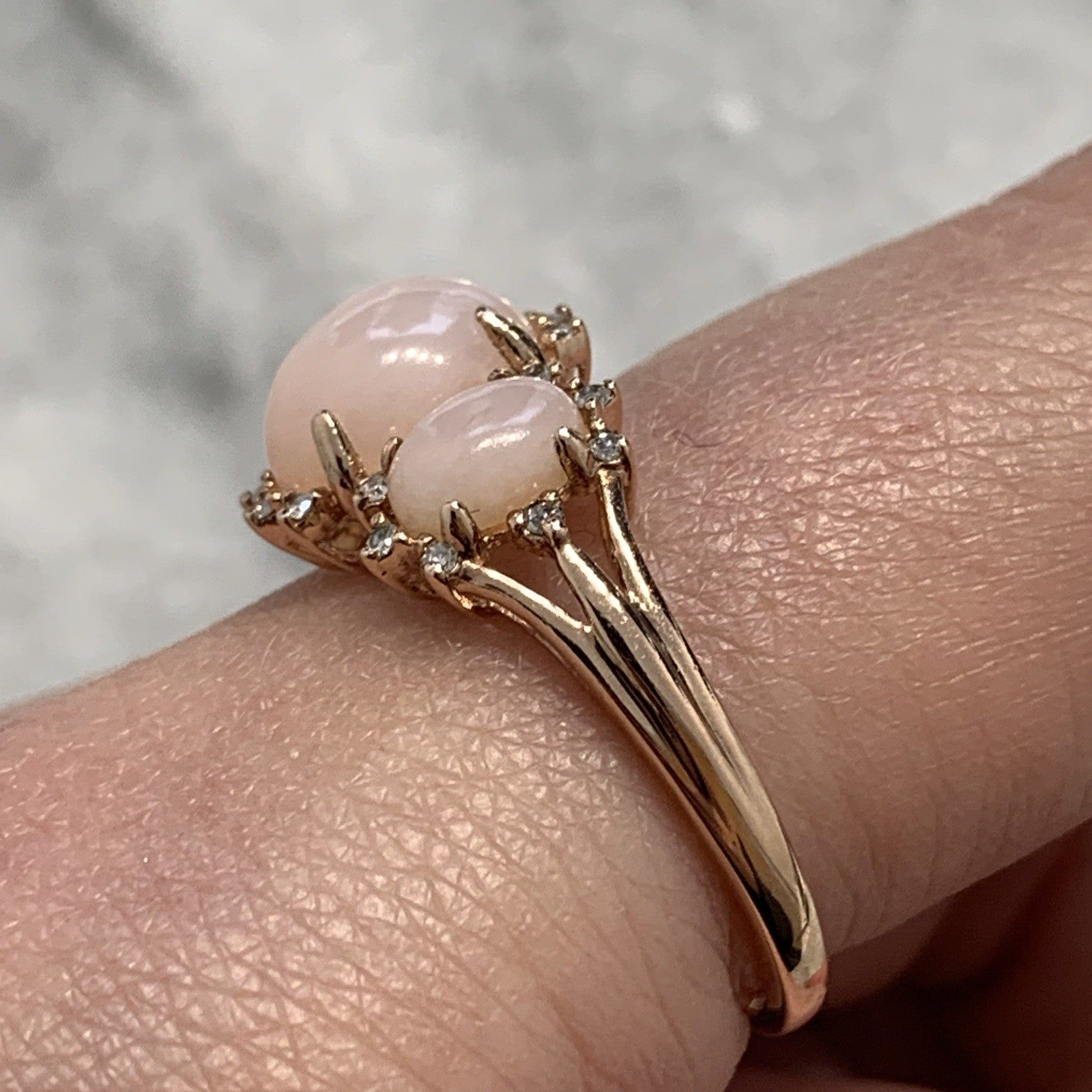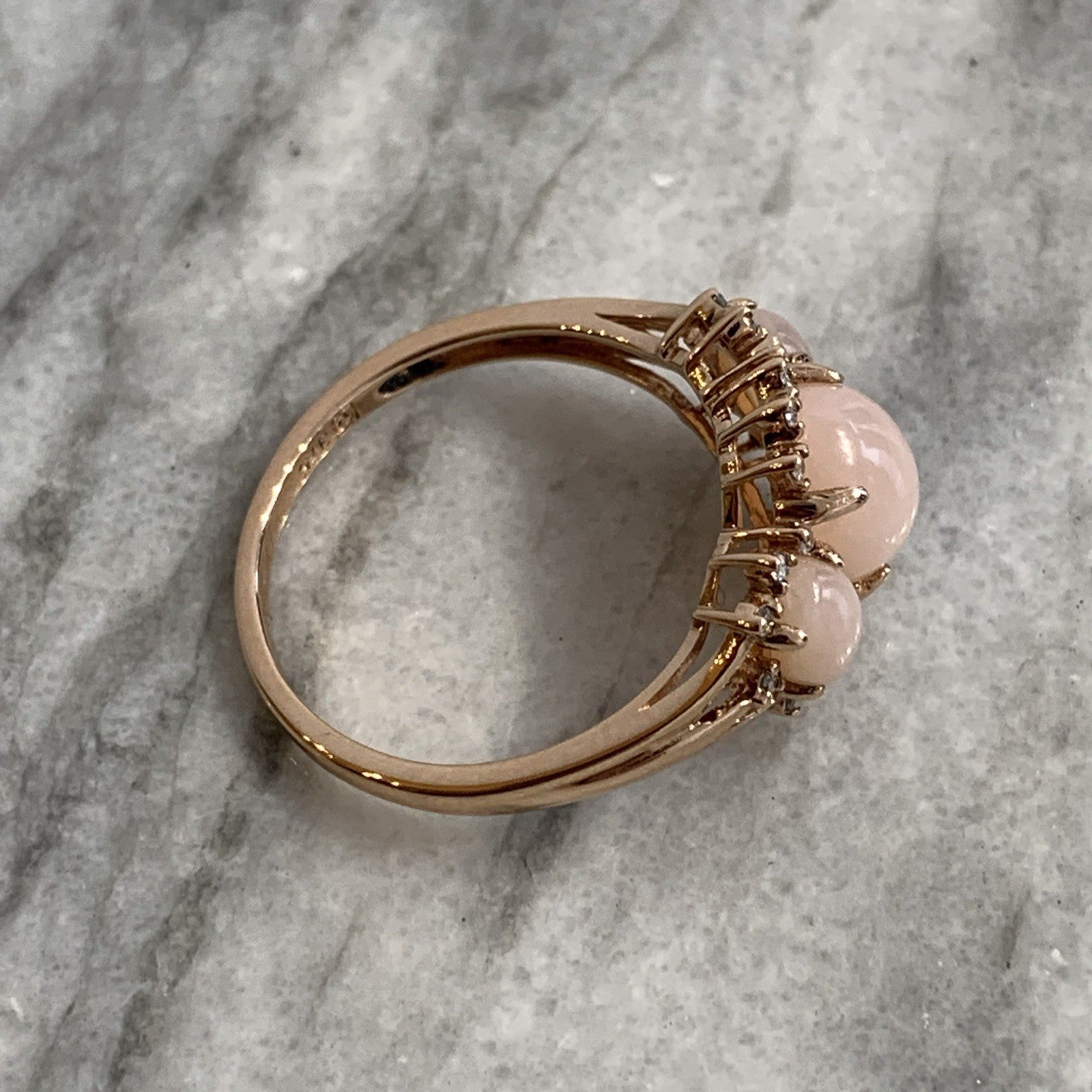 An elegant pink opal cabochon trilogy ring in rose gold, surrounded by delicate diamonds.
