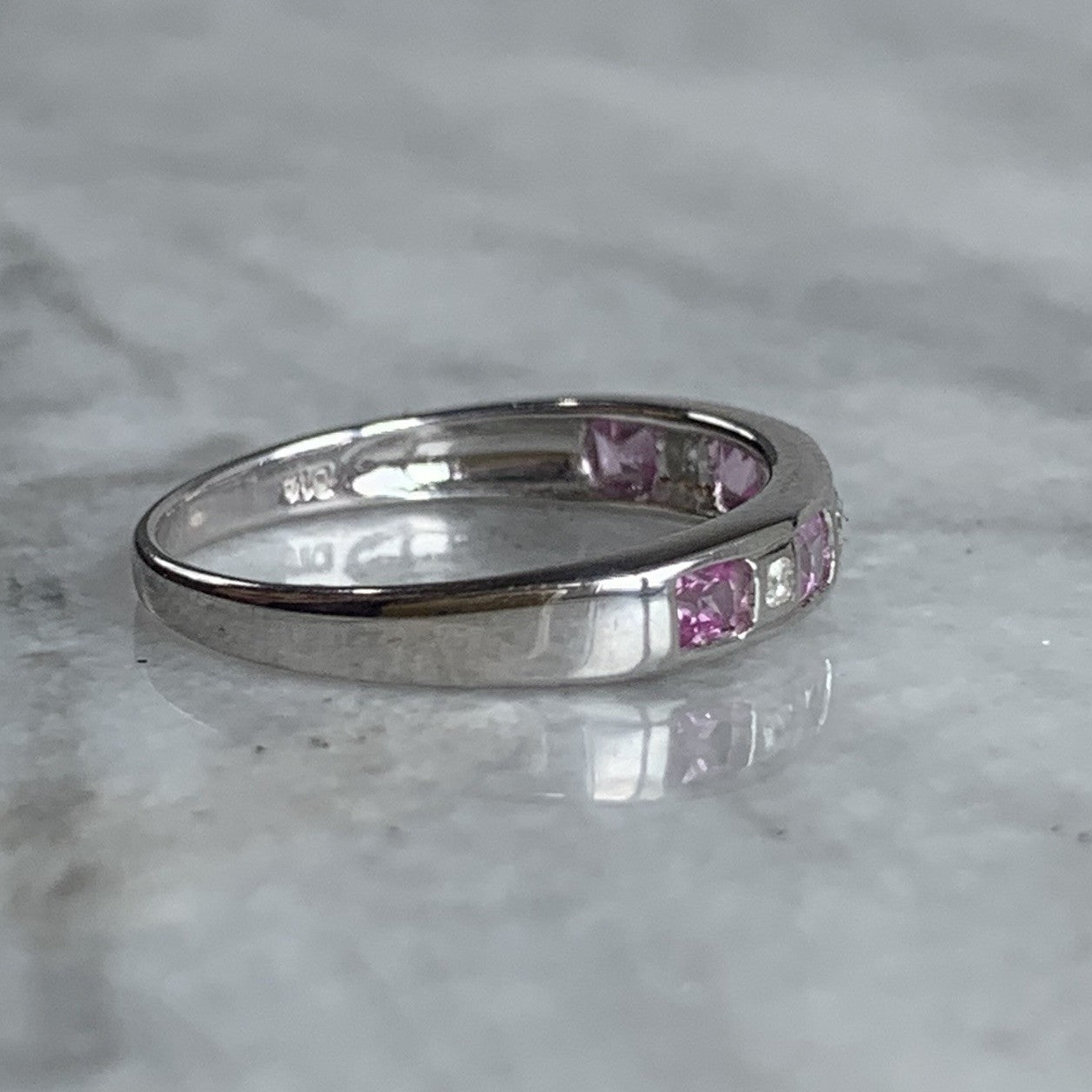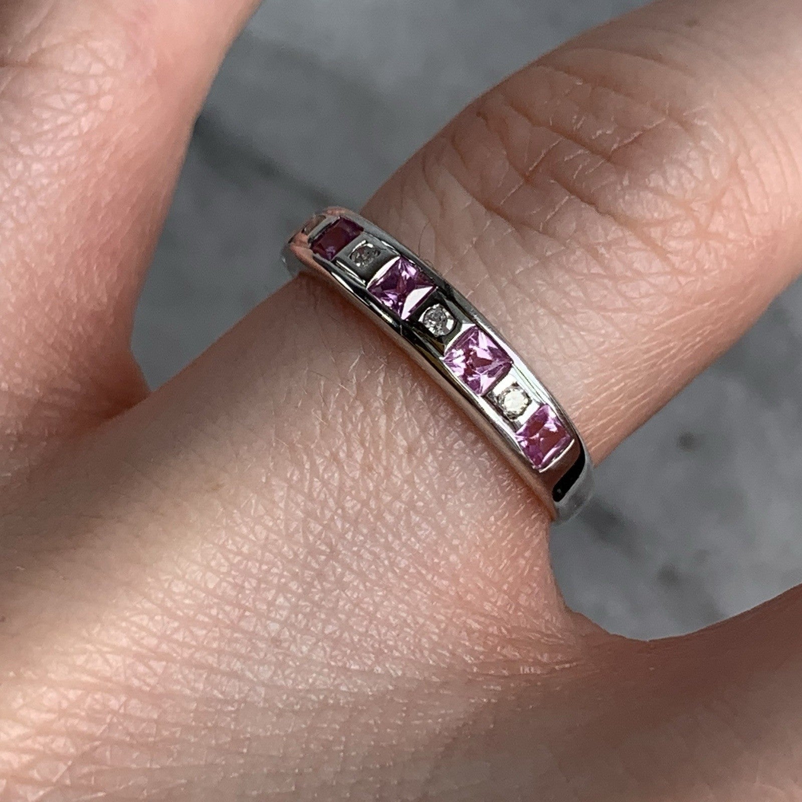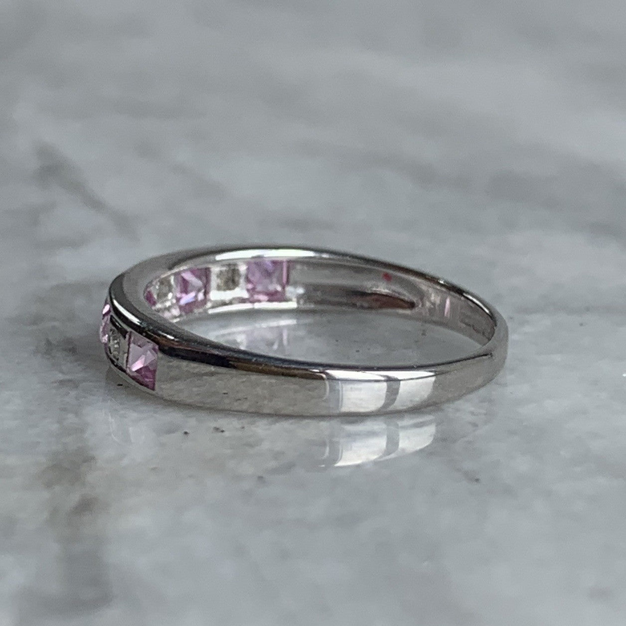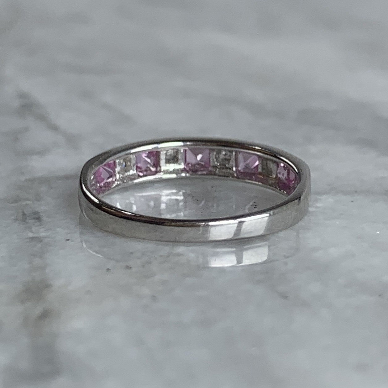 A gorgeous white gold band ring featuring a channel of alternating princess cut pink topaz and diamonds.