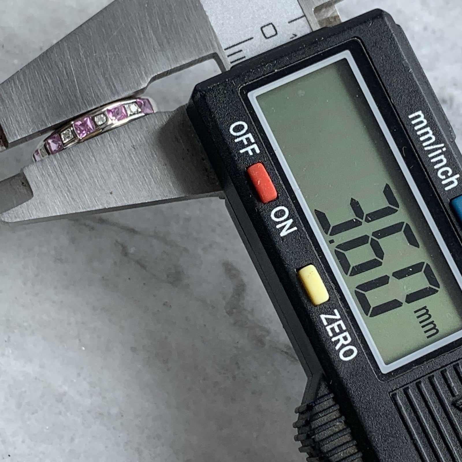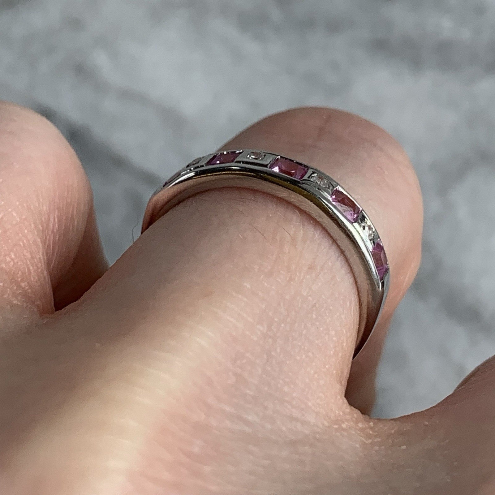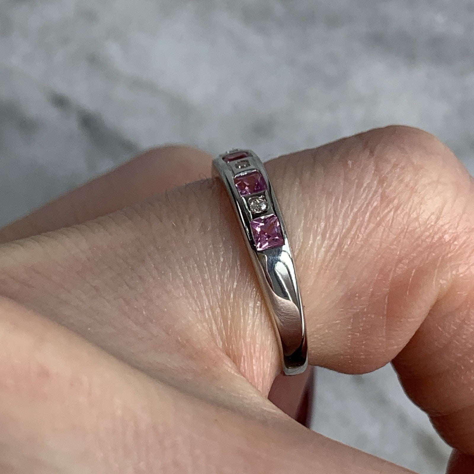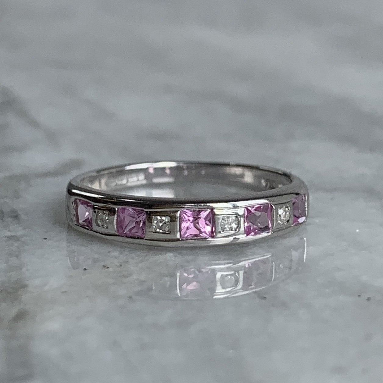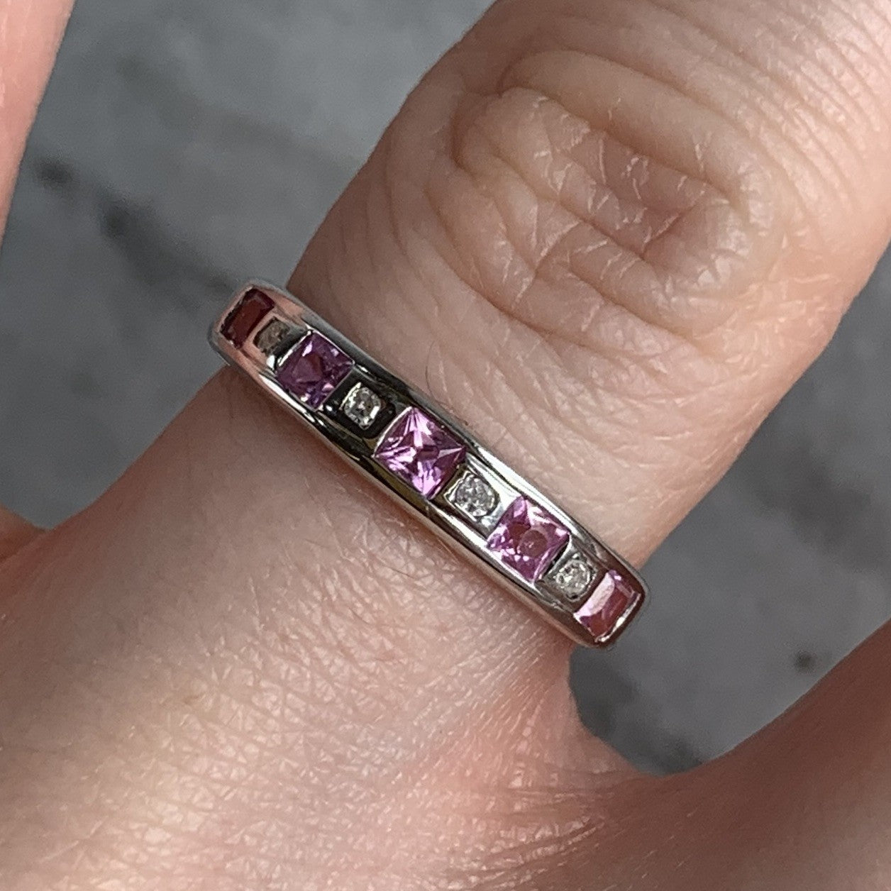 A gorgeous white gold band ring featuring a channel of alternating princess cut pink topaz and diamonds.
