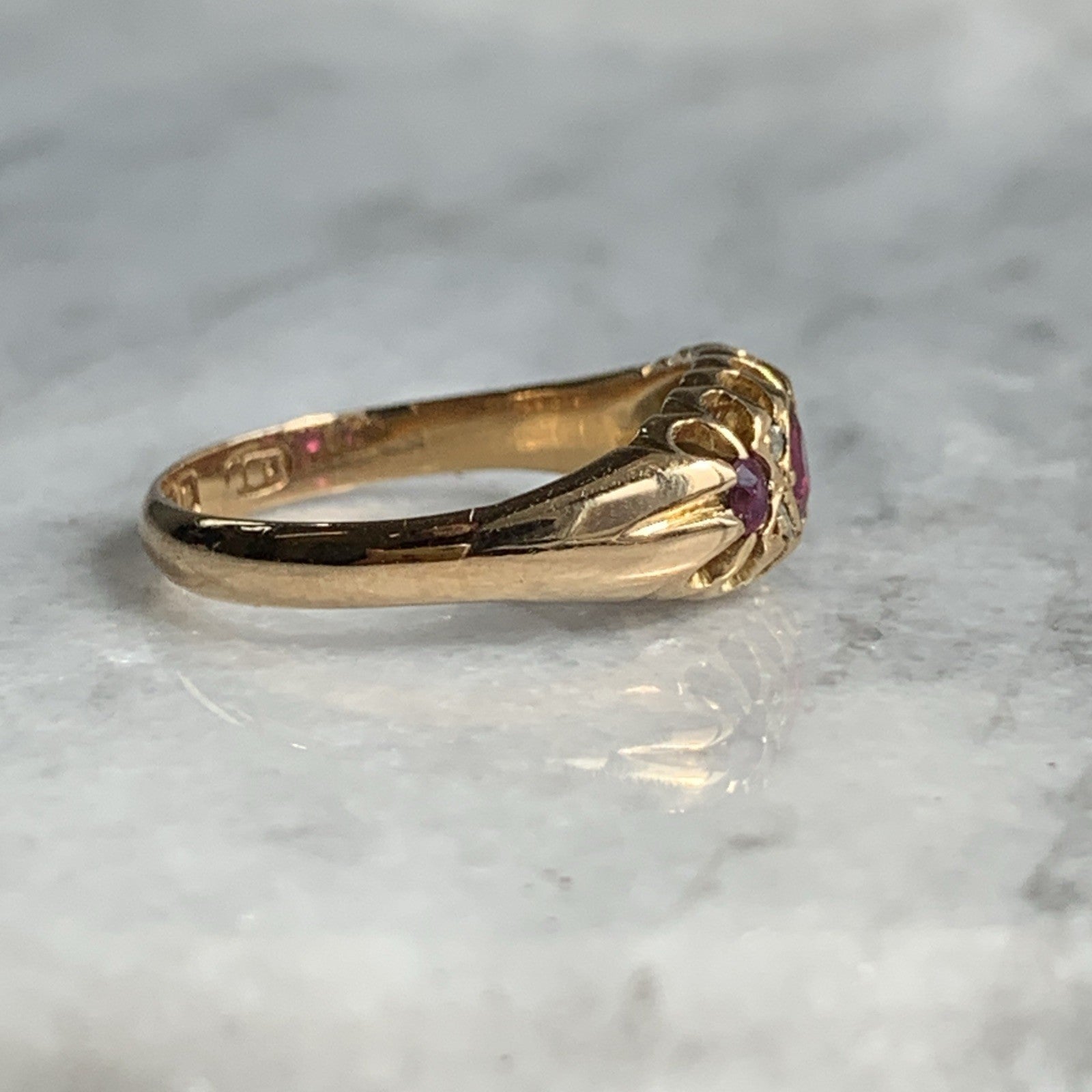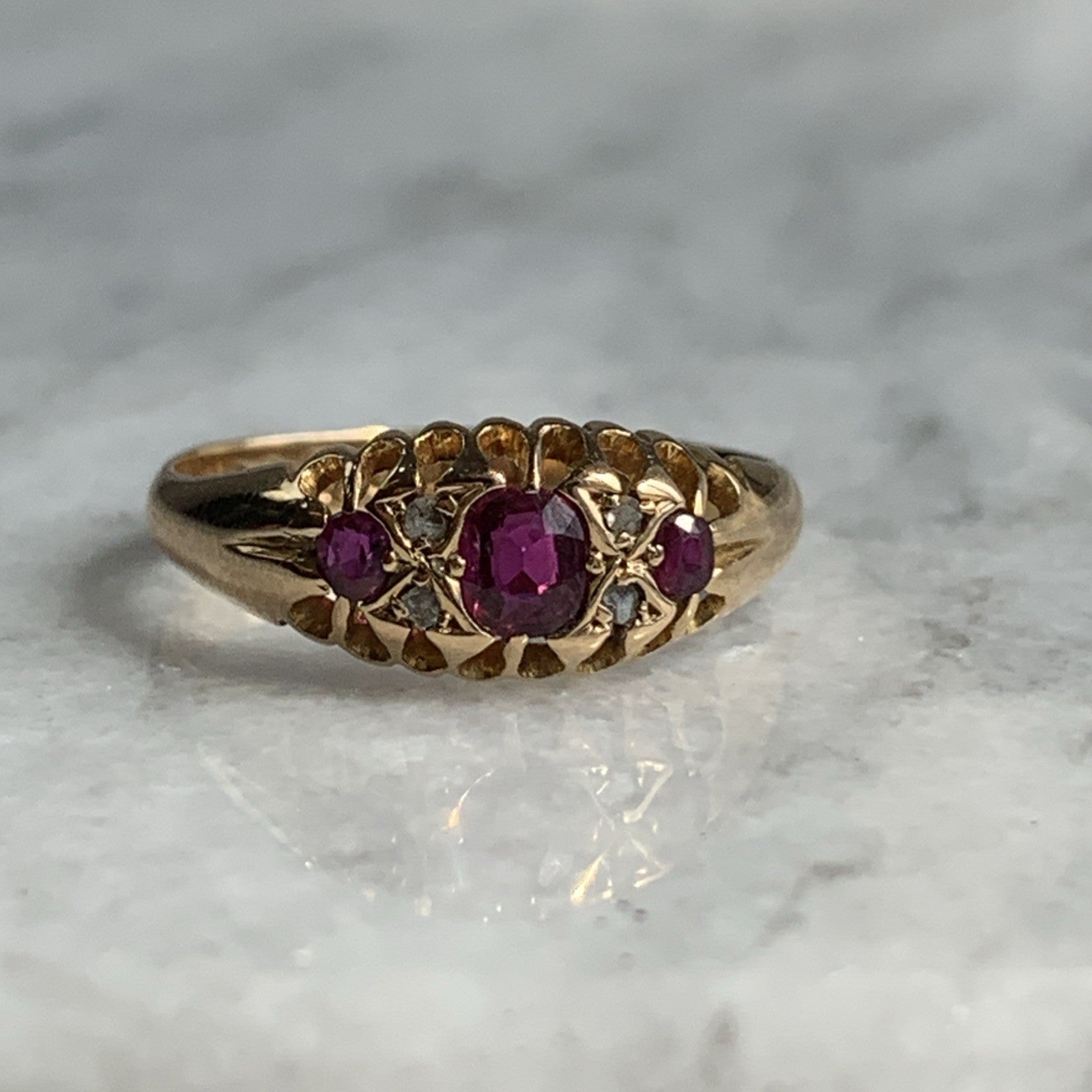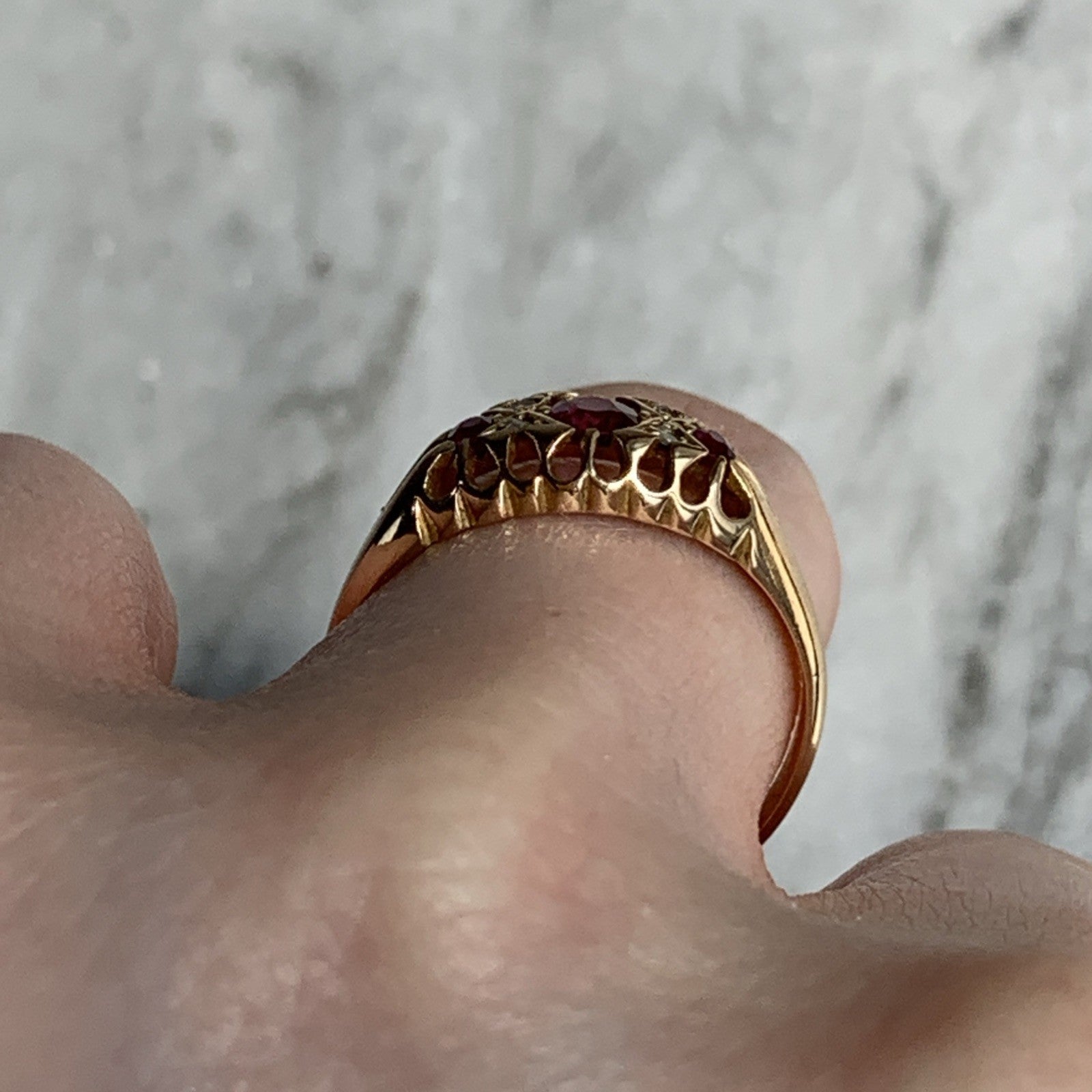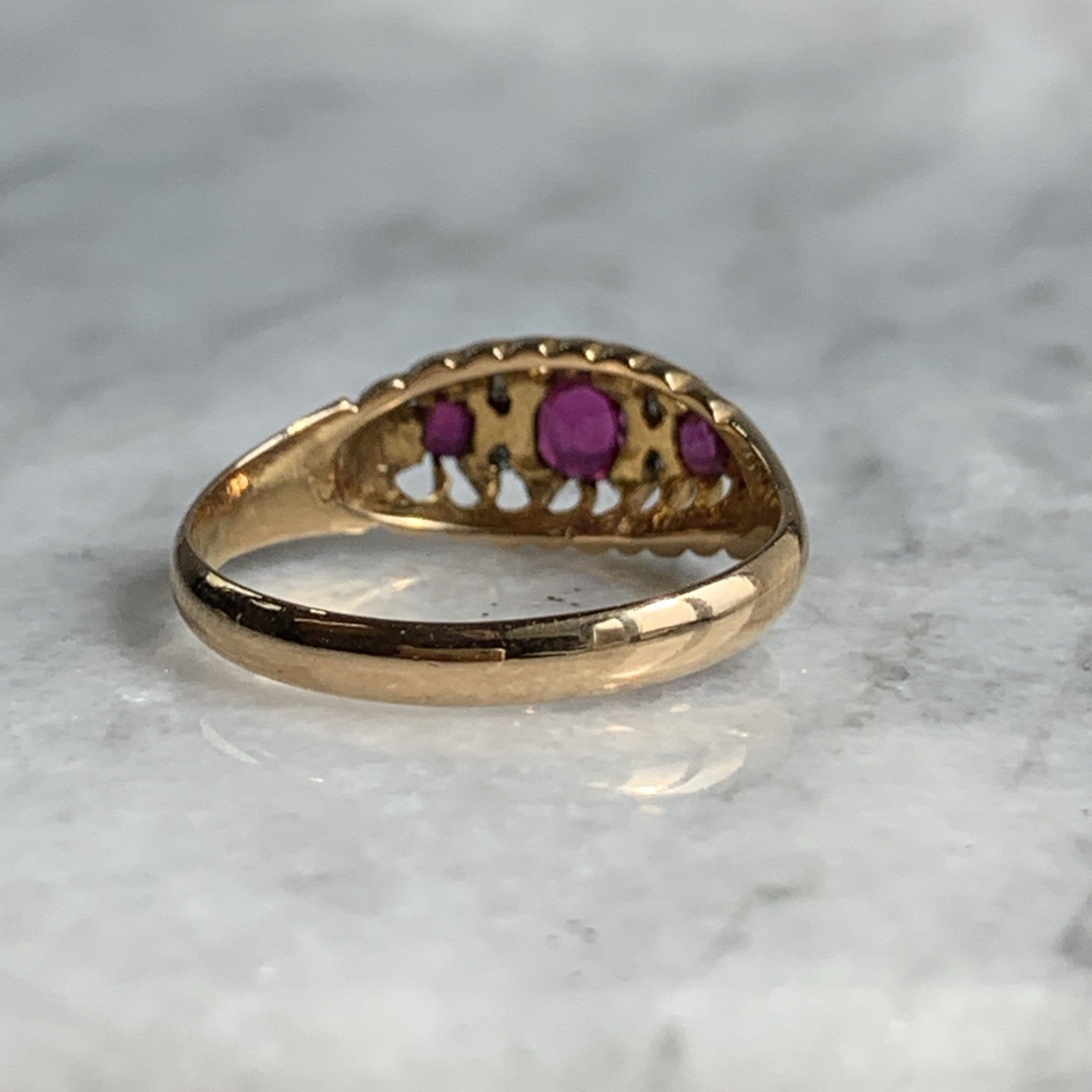 A stunning gold carved ring showcasing a trilogy of round cut rubies, accented by petite diamonds.