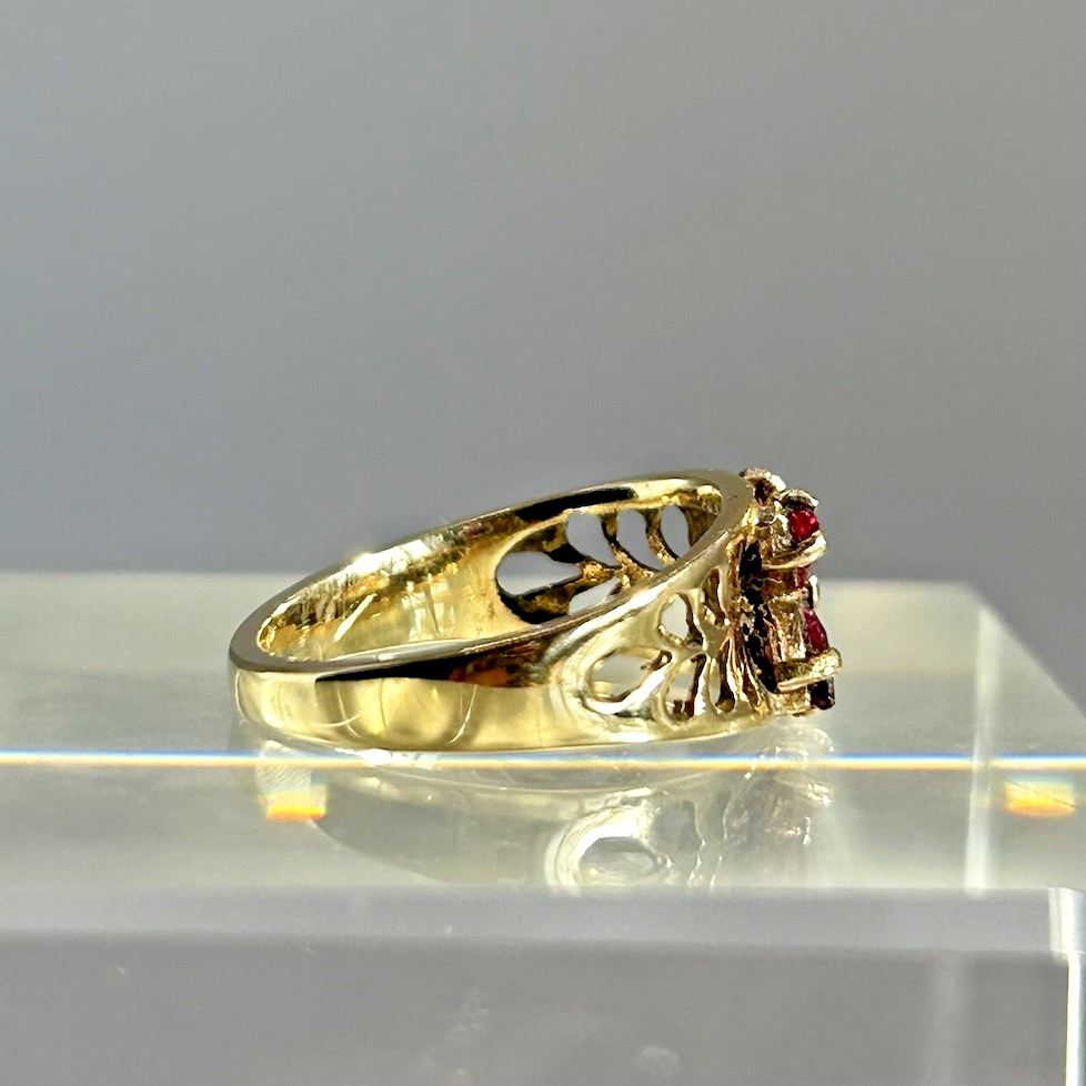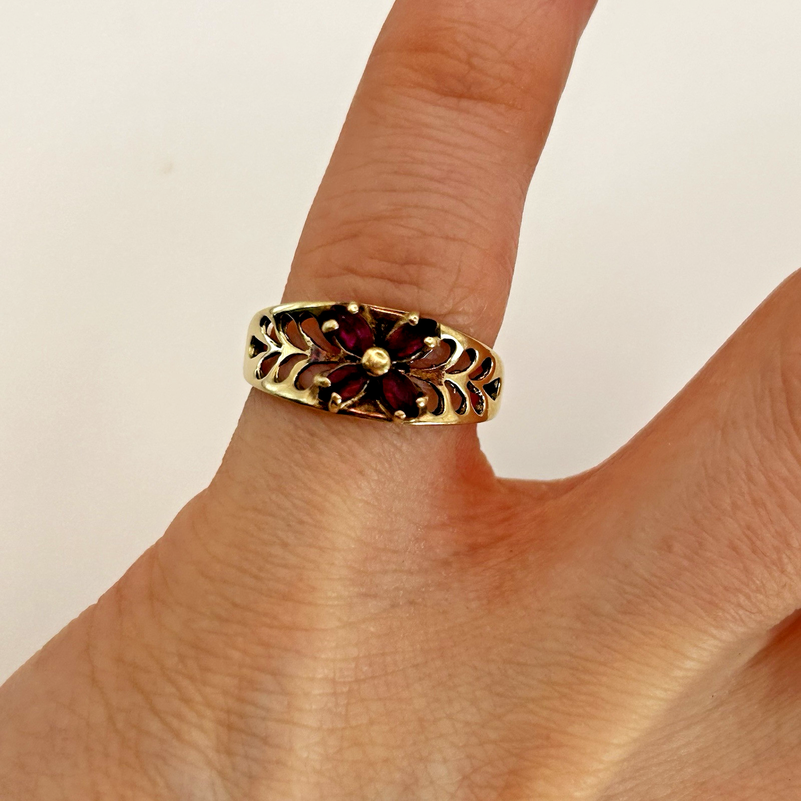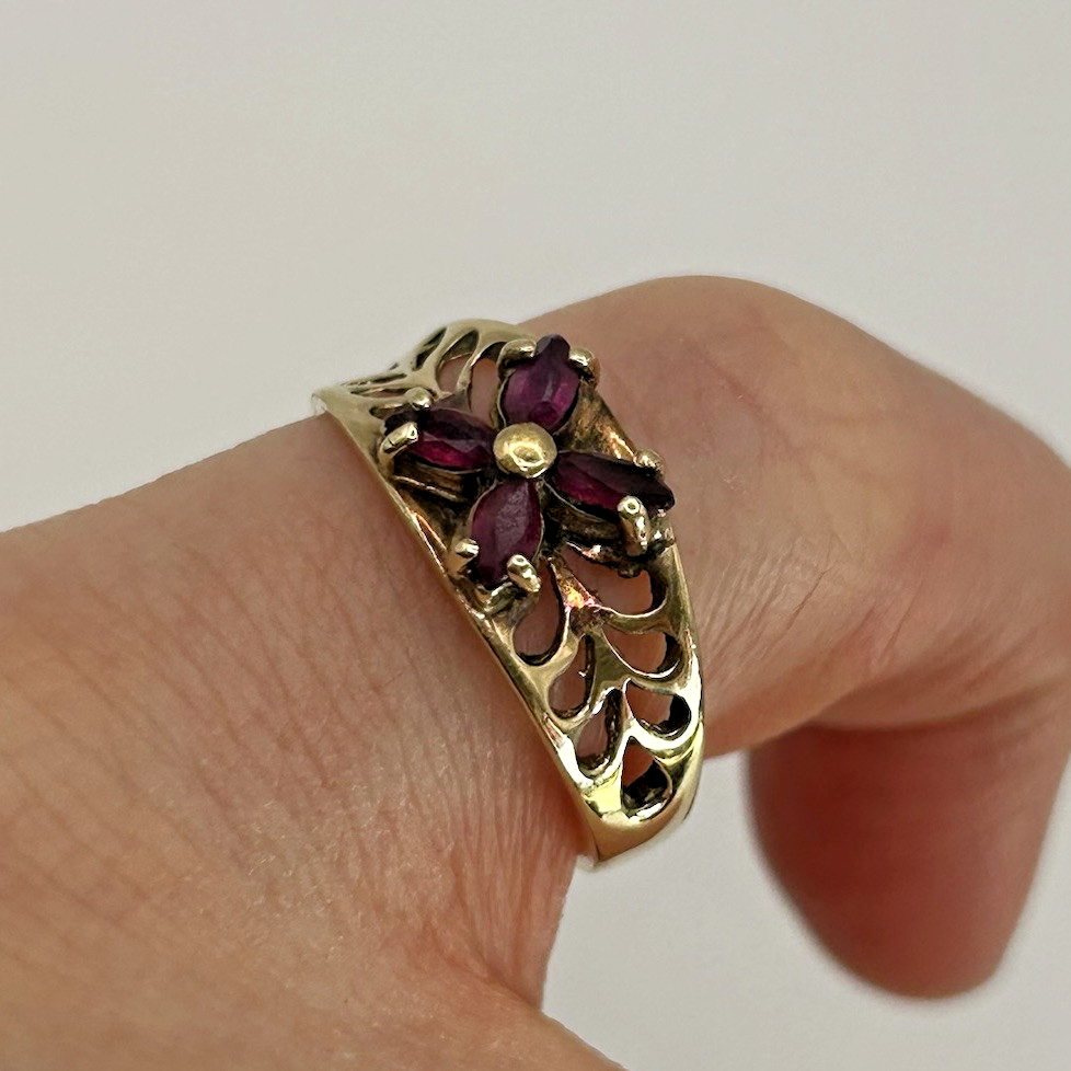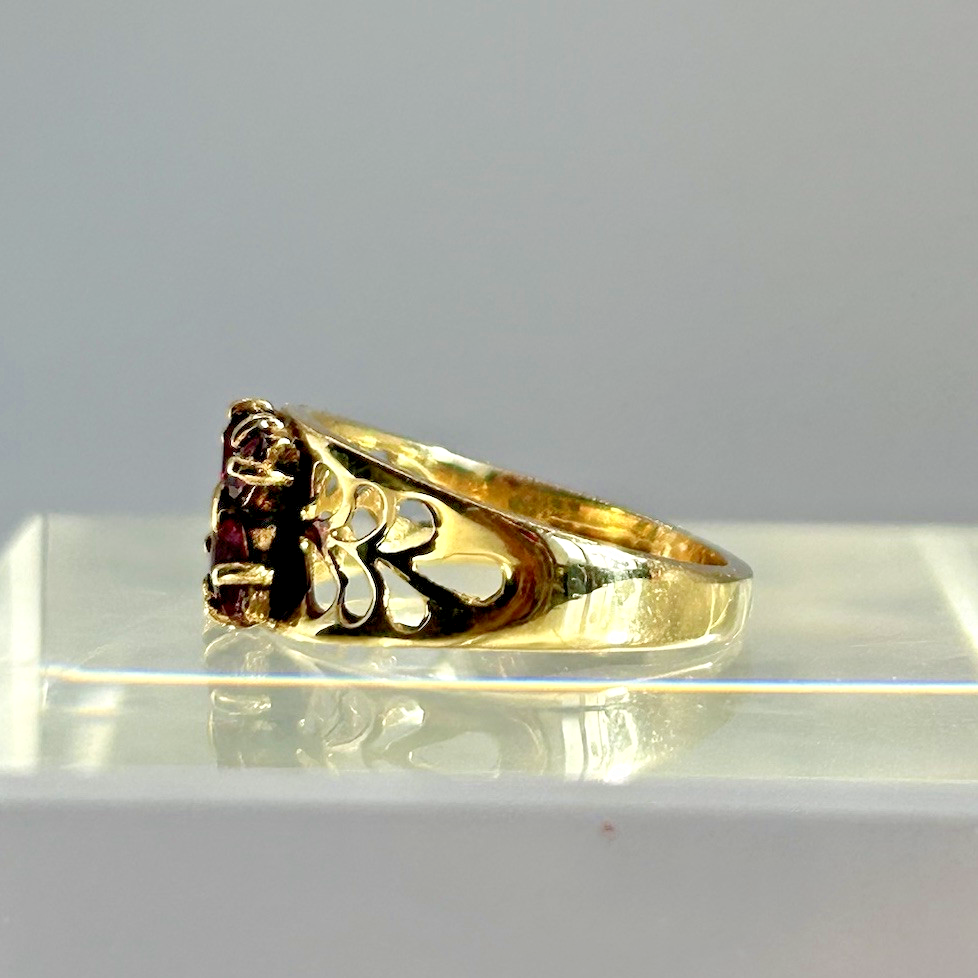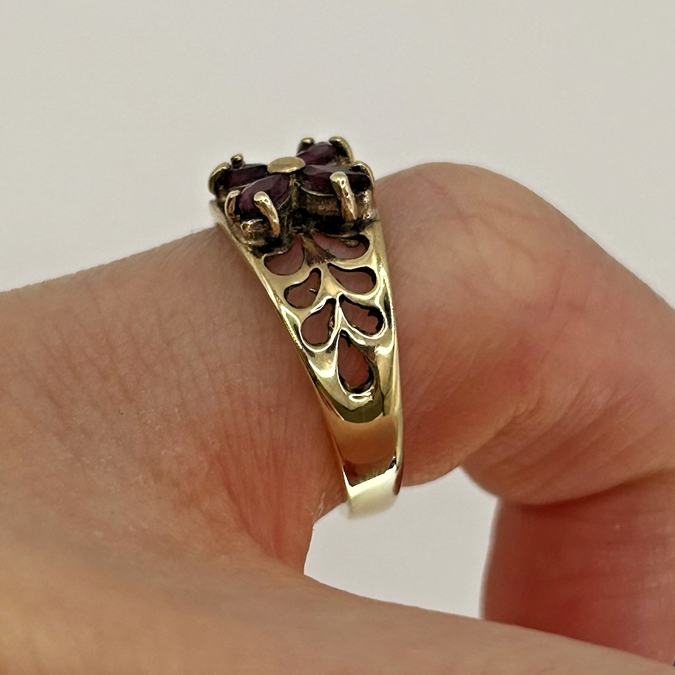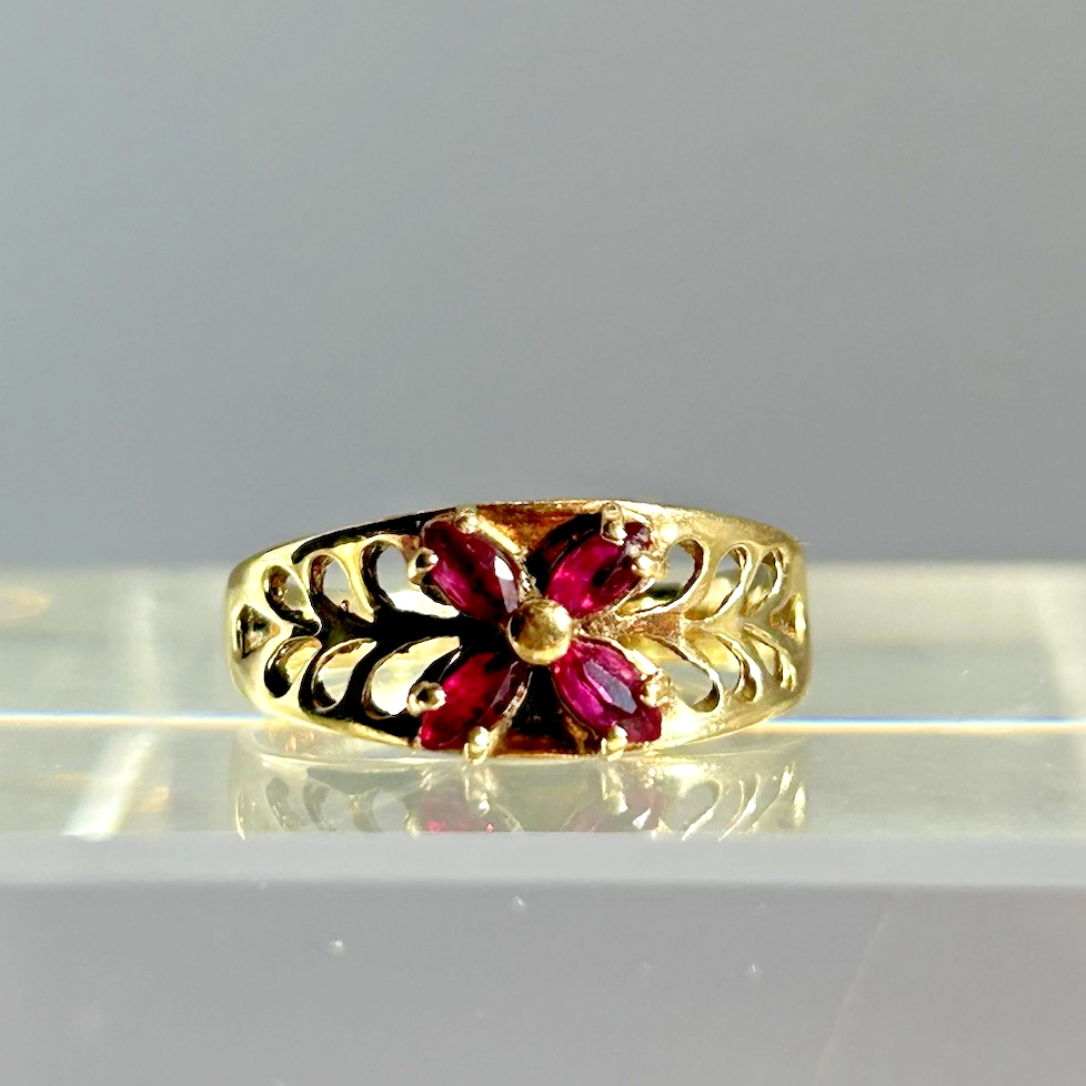 Ruby Ring 9ct Gold Floral Cluster Cut Out Band in Yellow Gold - Size I
