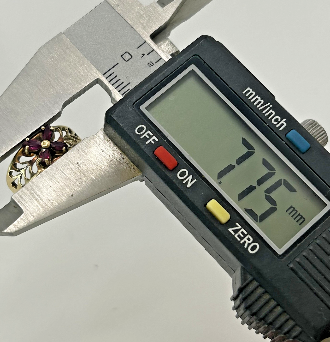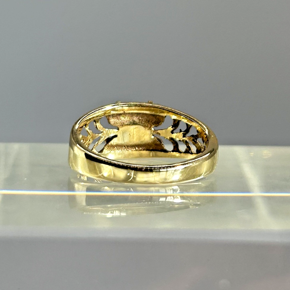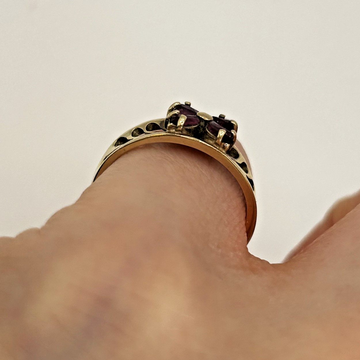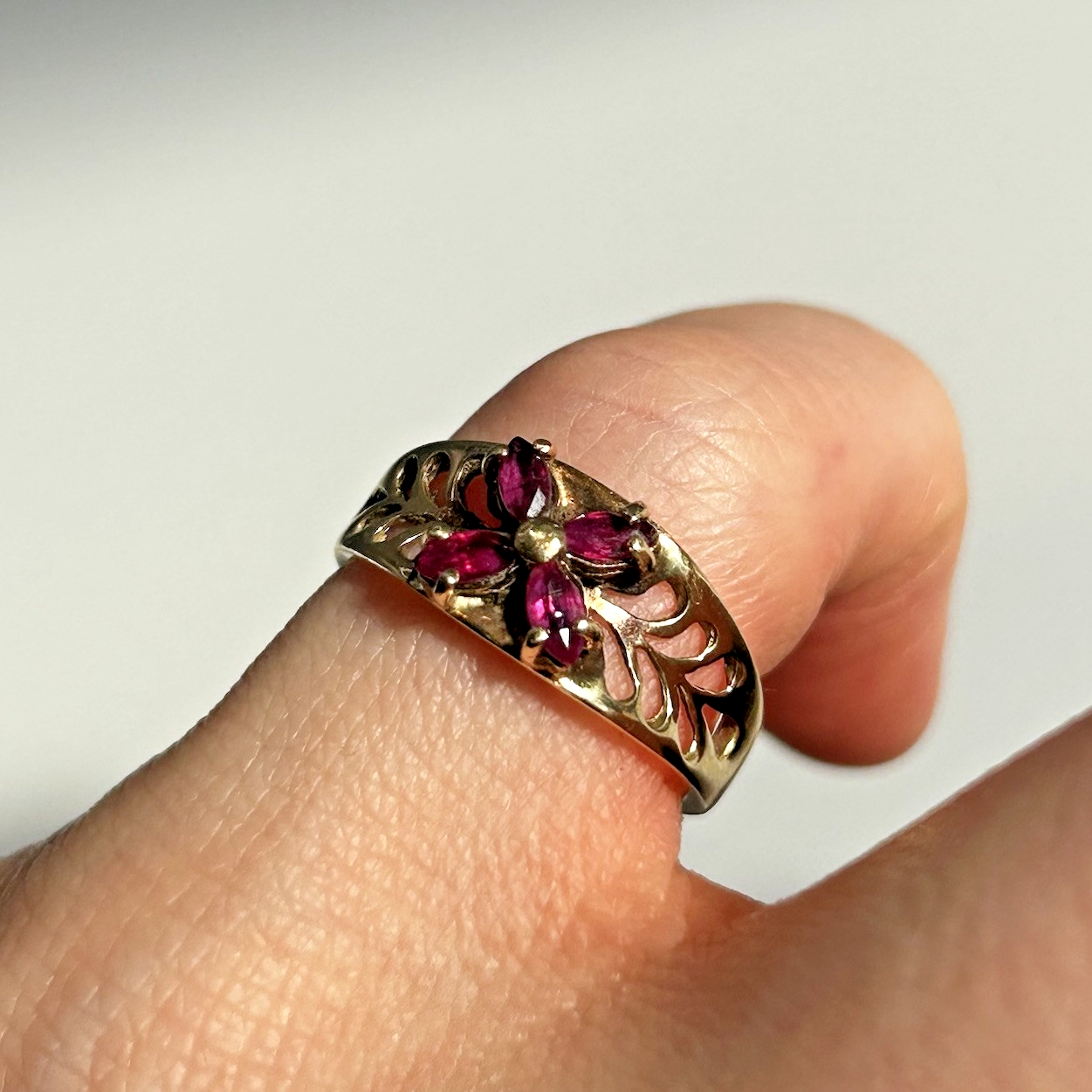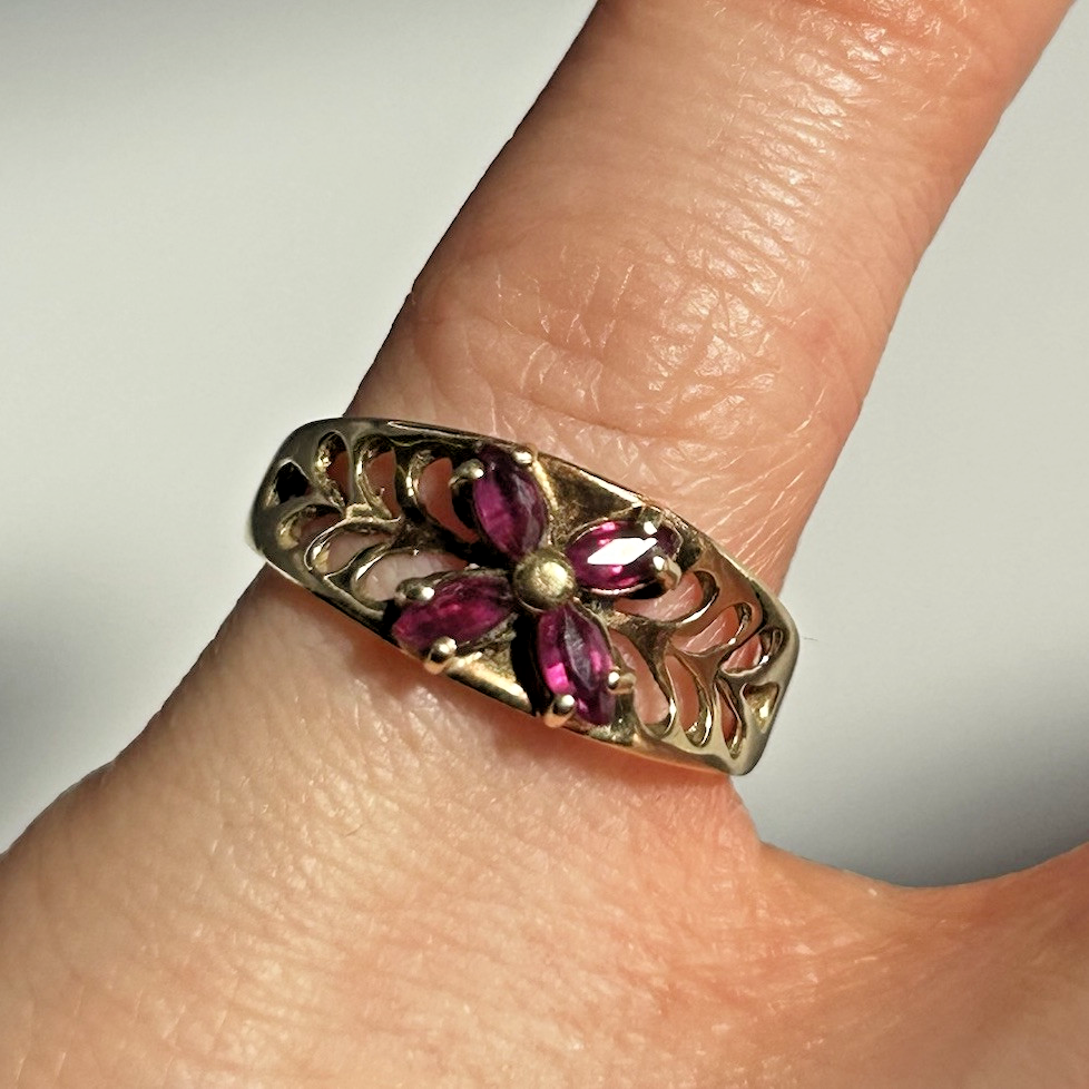 Ruby Ring 9ct Gold Floral Cluster Cut Out Band in Yellow Gold - Size I