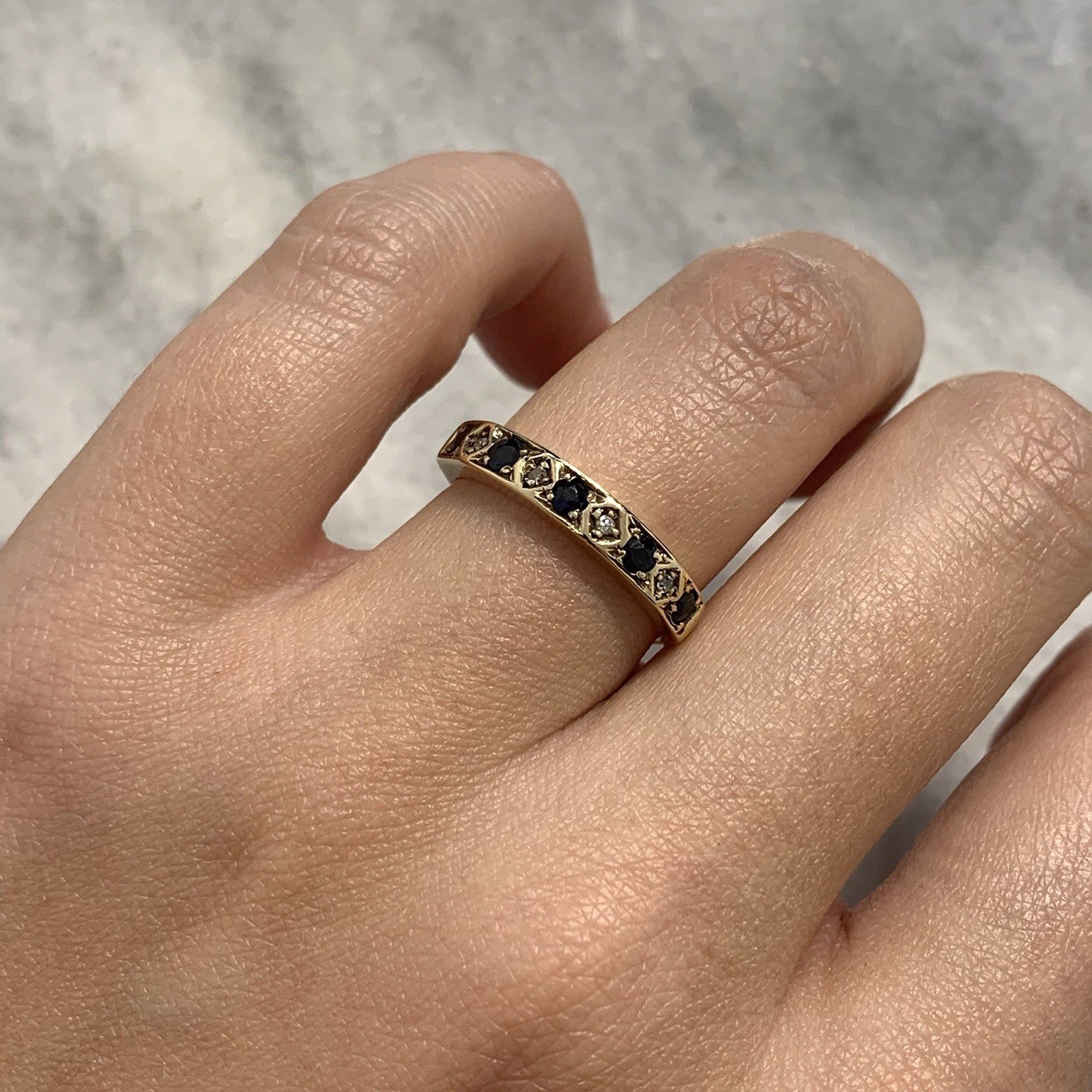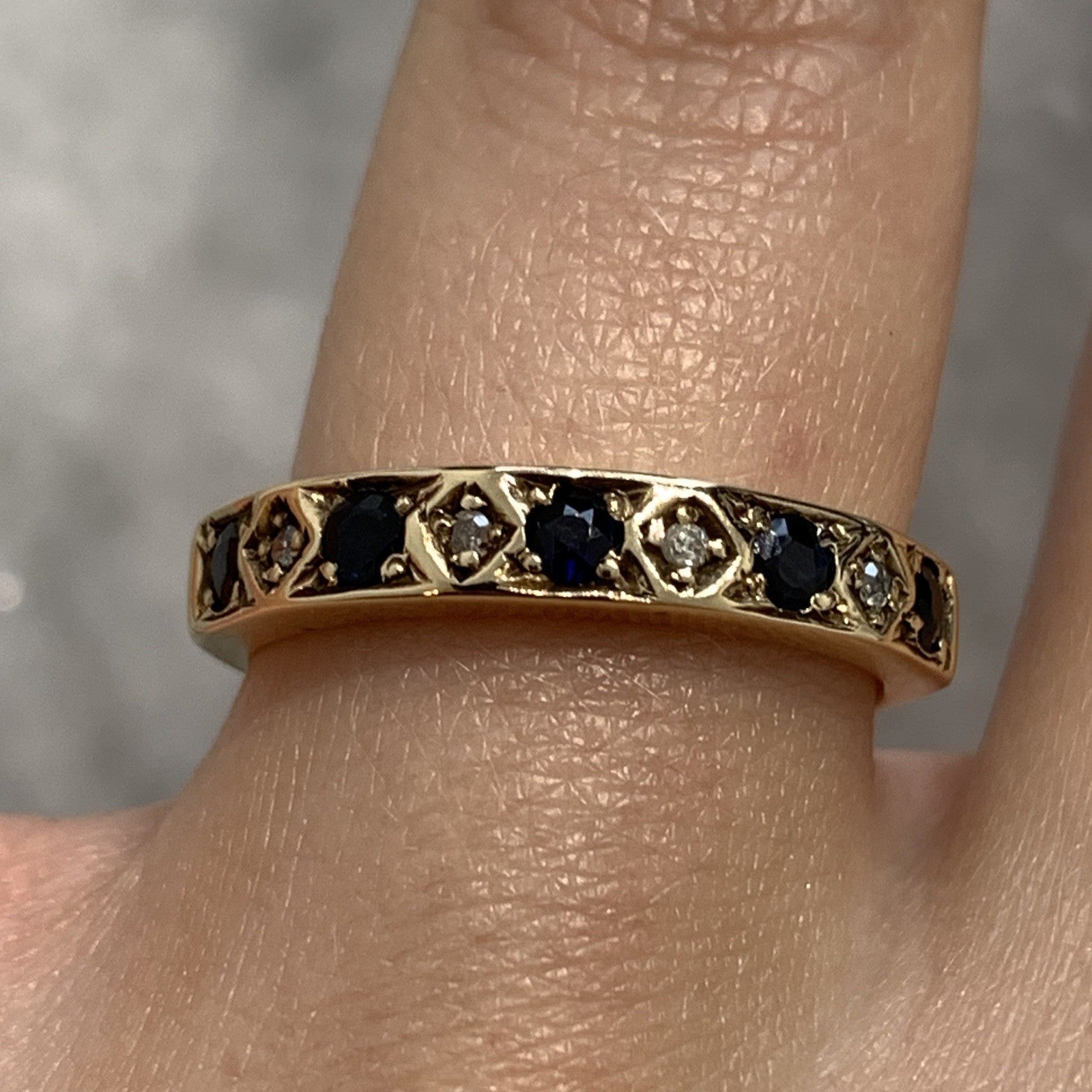 A timeless sapphire and diamond eternity ring in yellow gold.