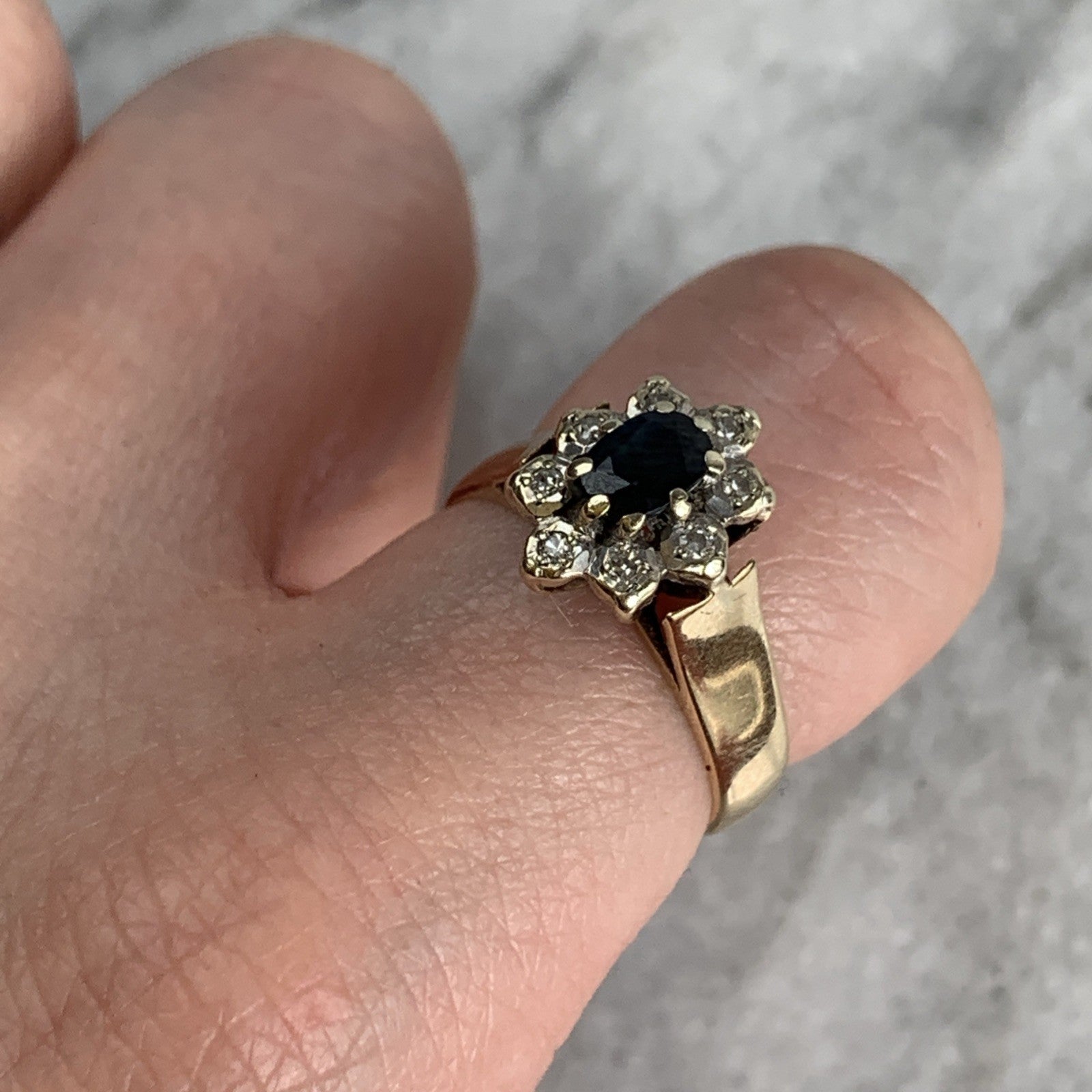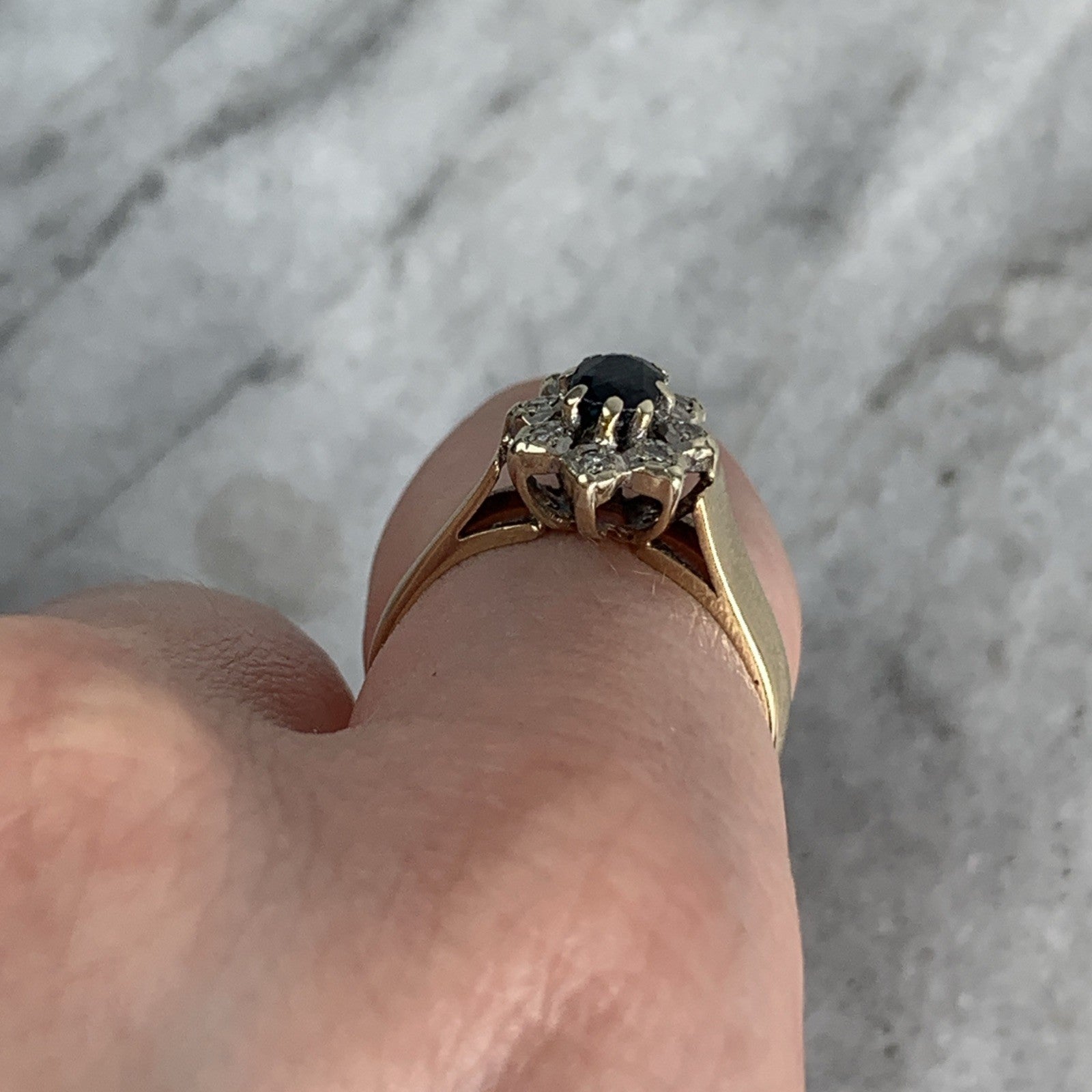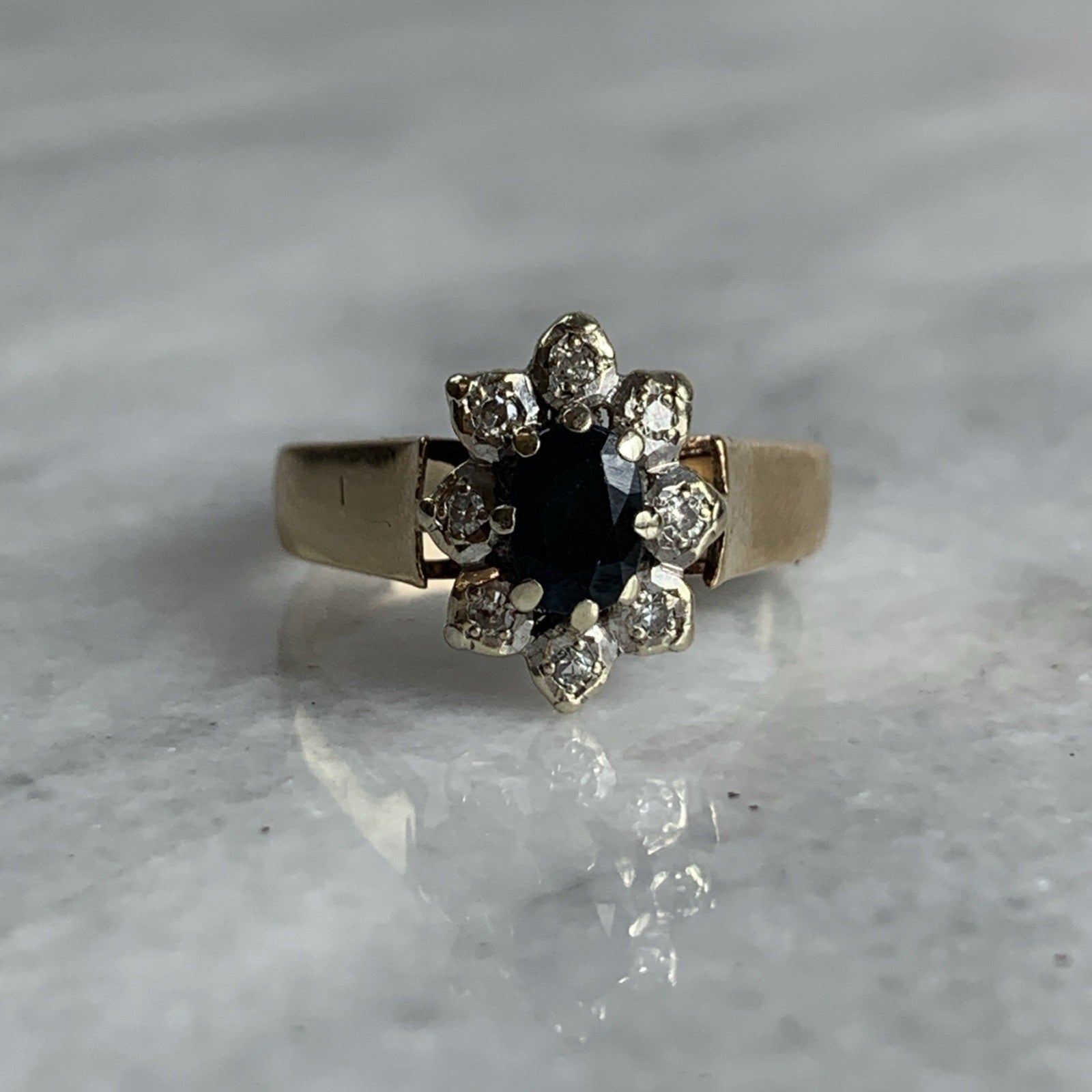 A beautiful gold ring featuring an oval cut sapphire, accented by a halo of diamonds to create a floral style cluster.