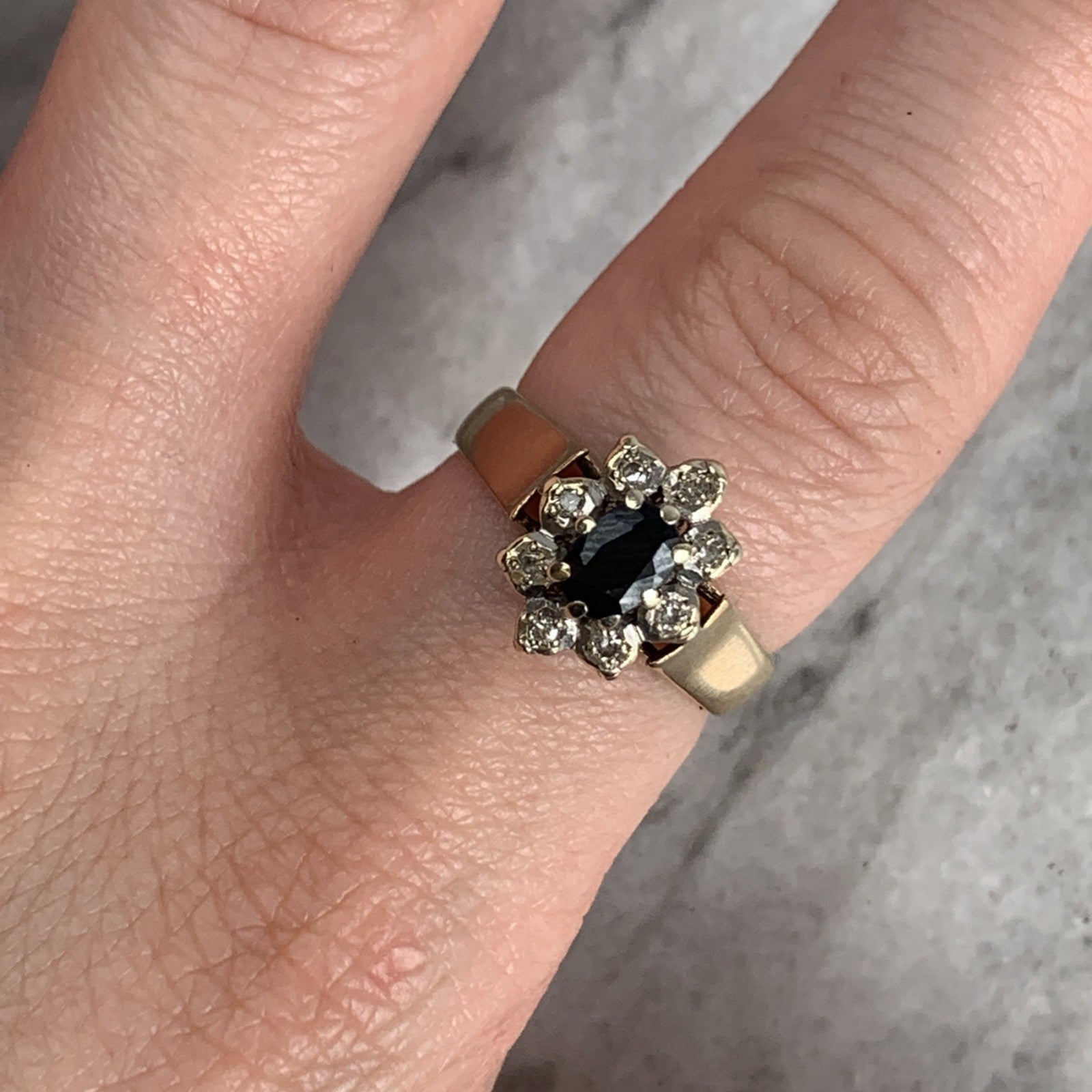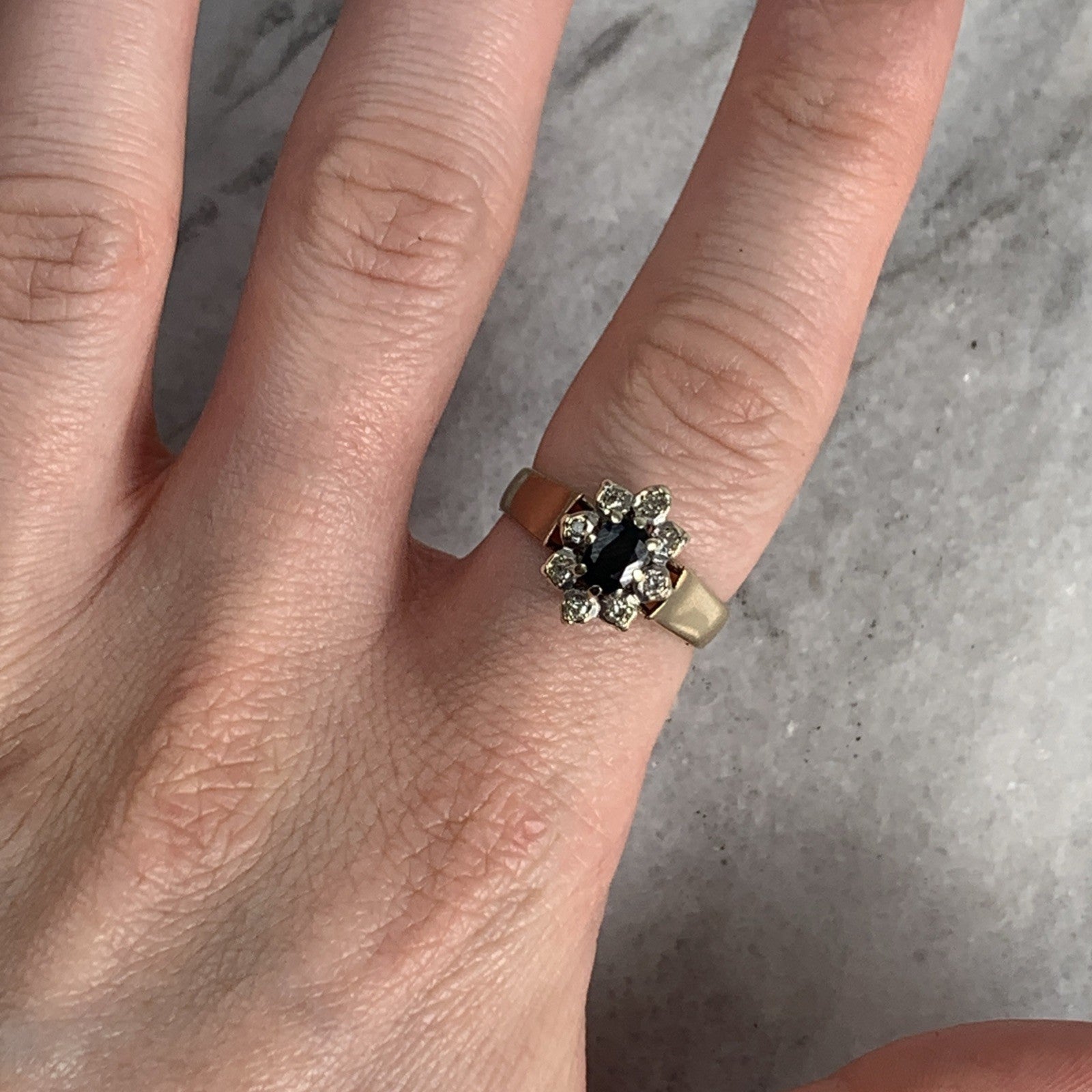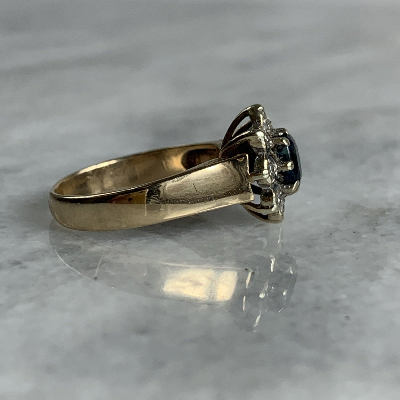 A beautiful gold ring featuring an oval cut sapphire, accented by a halo of diamonds to create a floral style cluster.