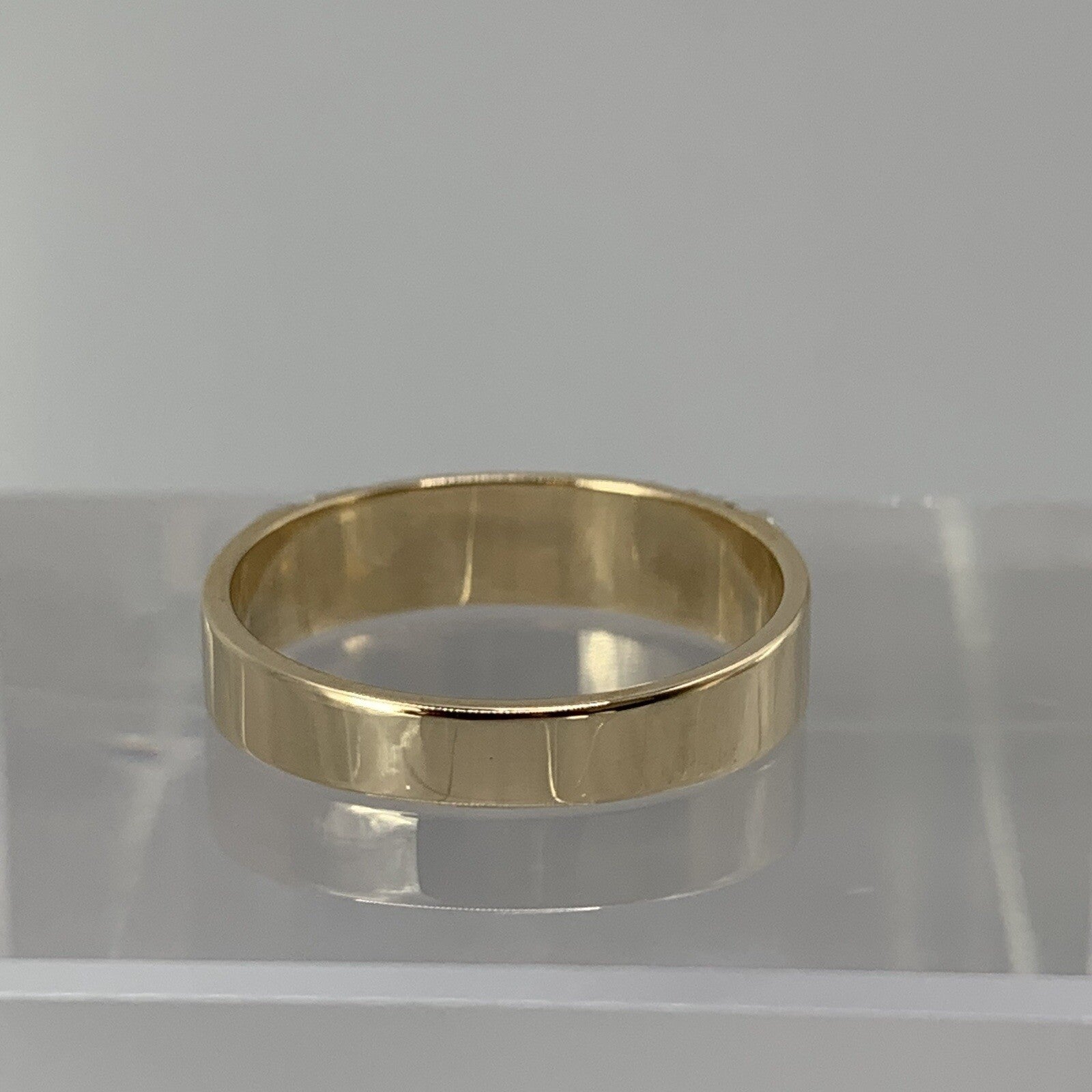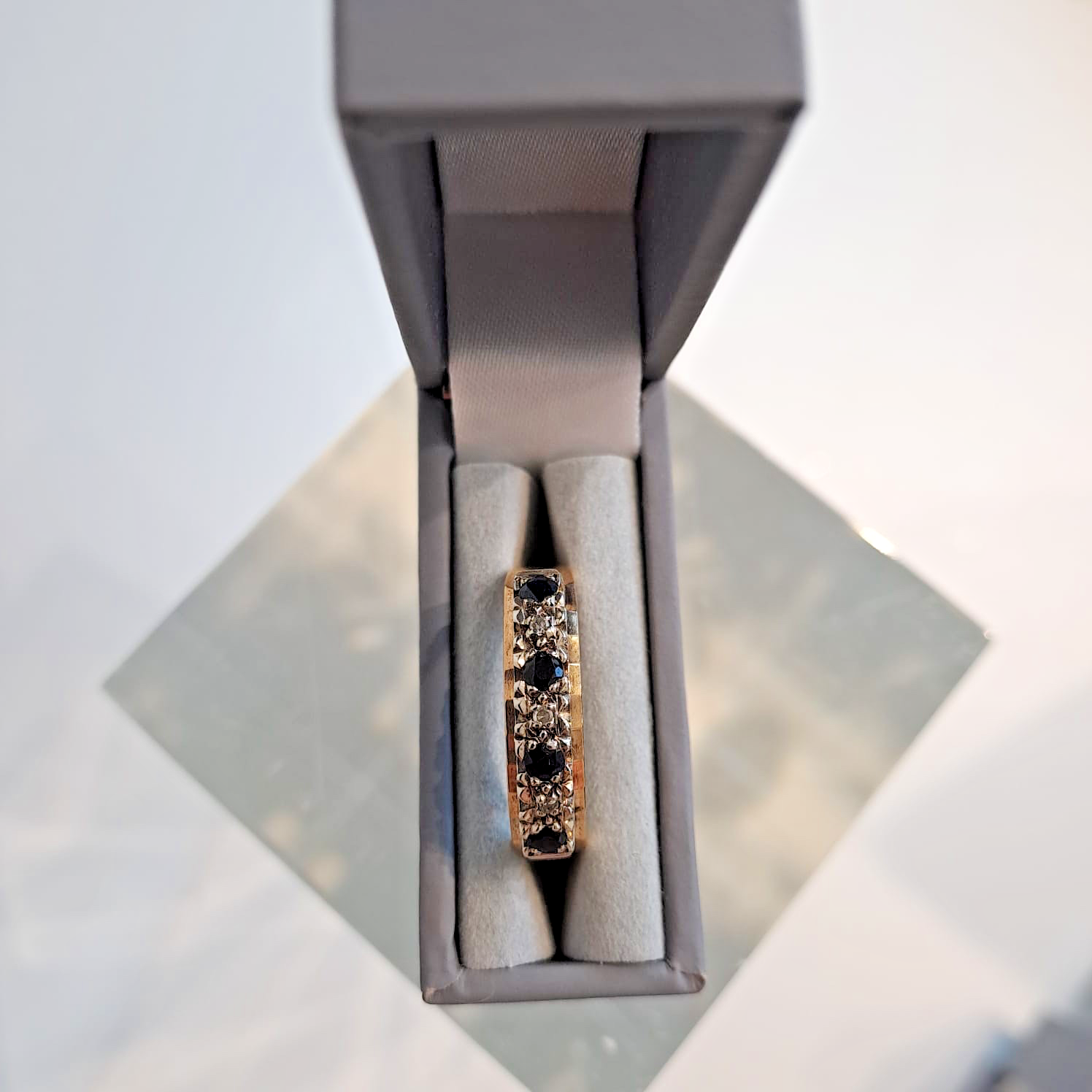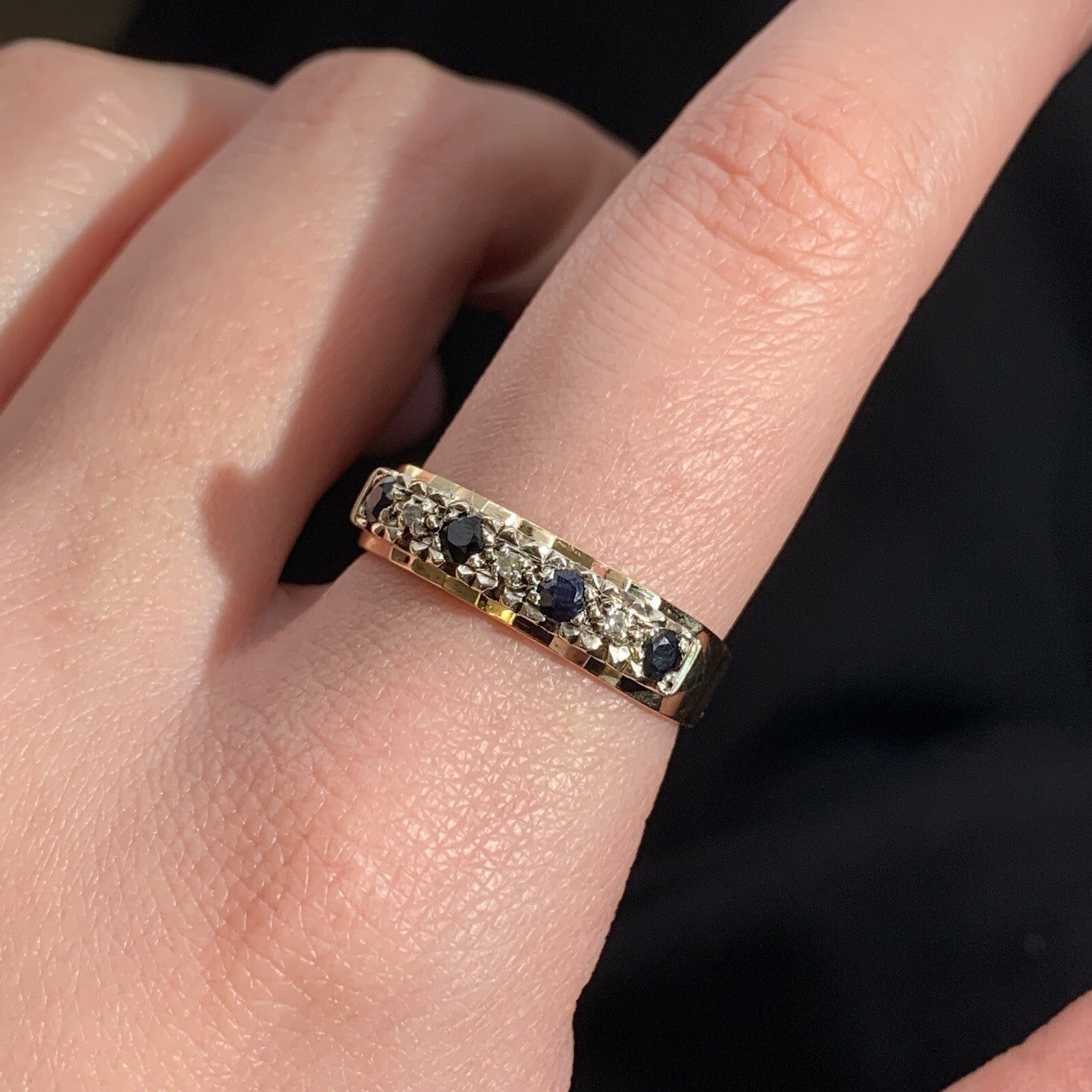 A gorgeous yellow gold ring with a half eternity of alternating sapphires and diamonds upon a wedding style band.