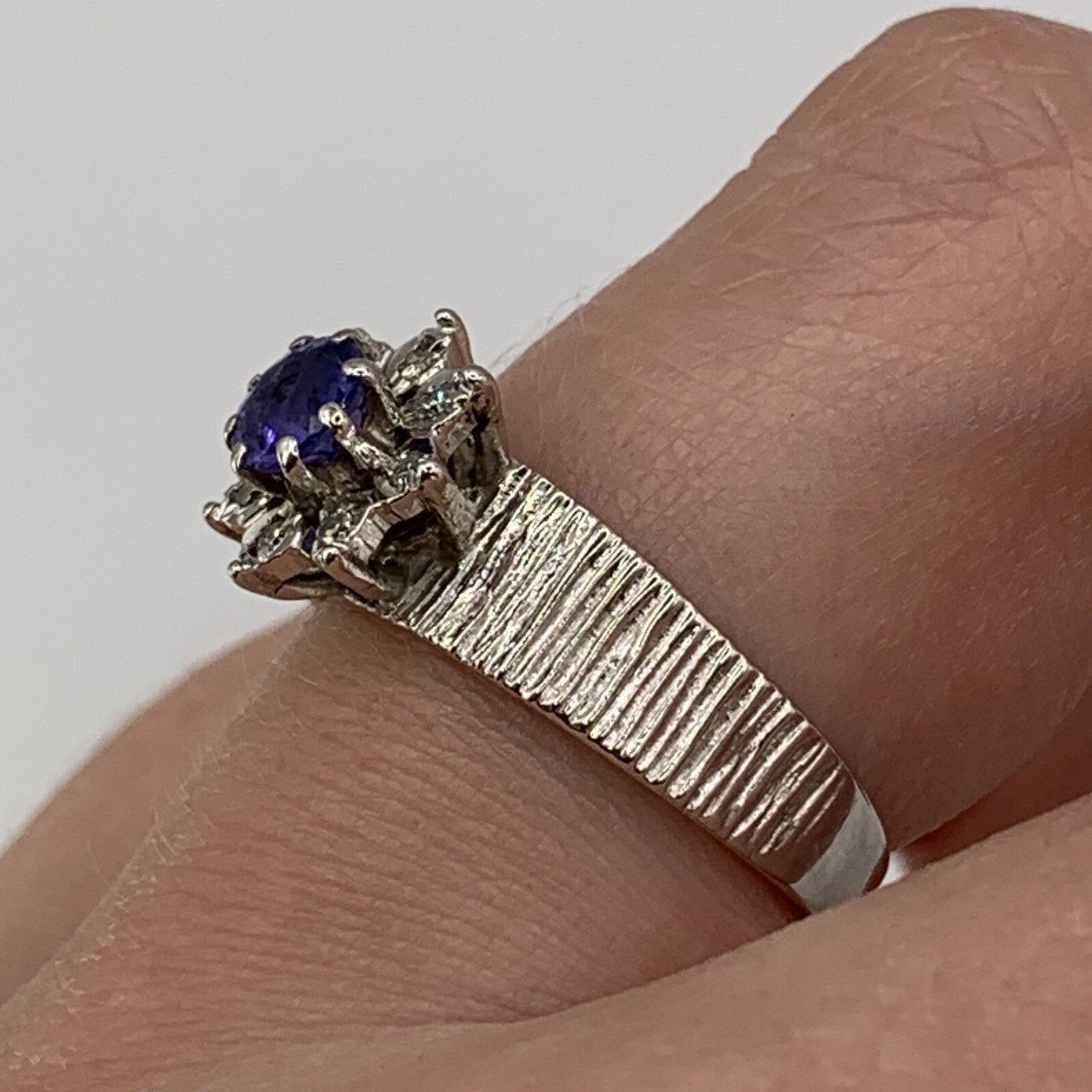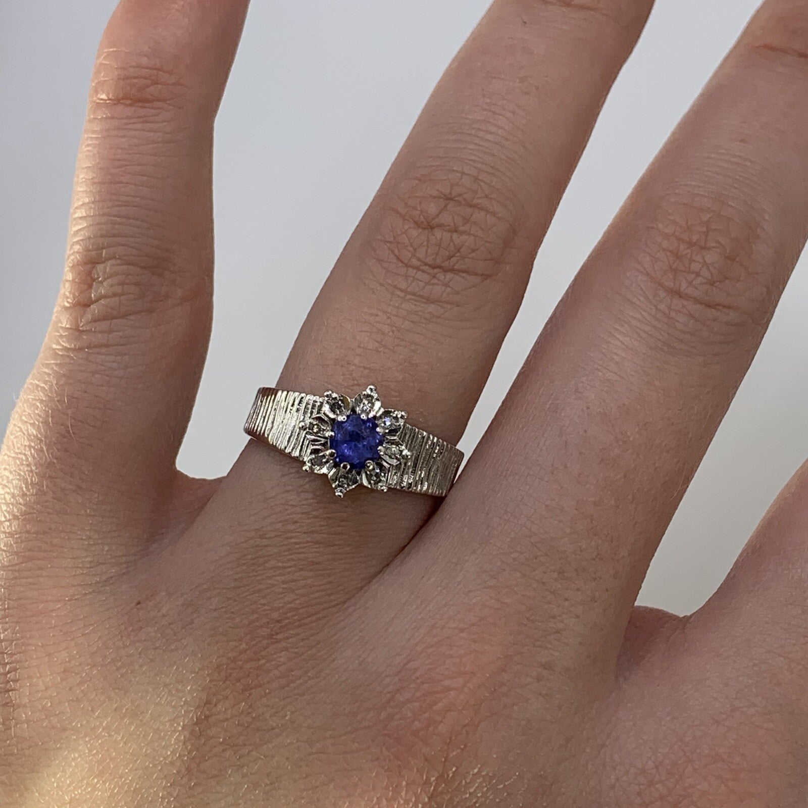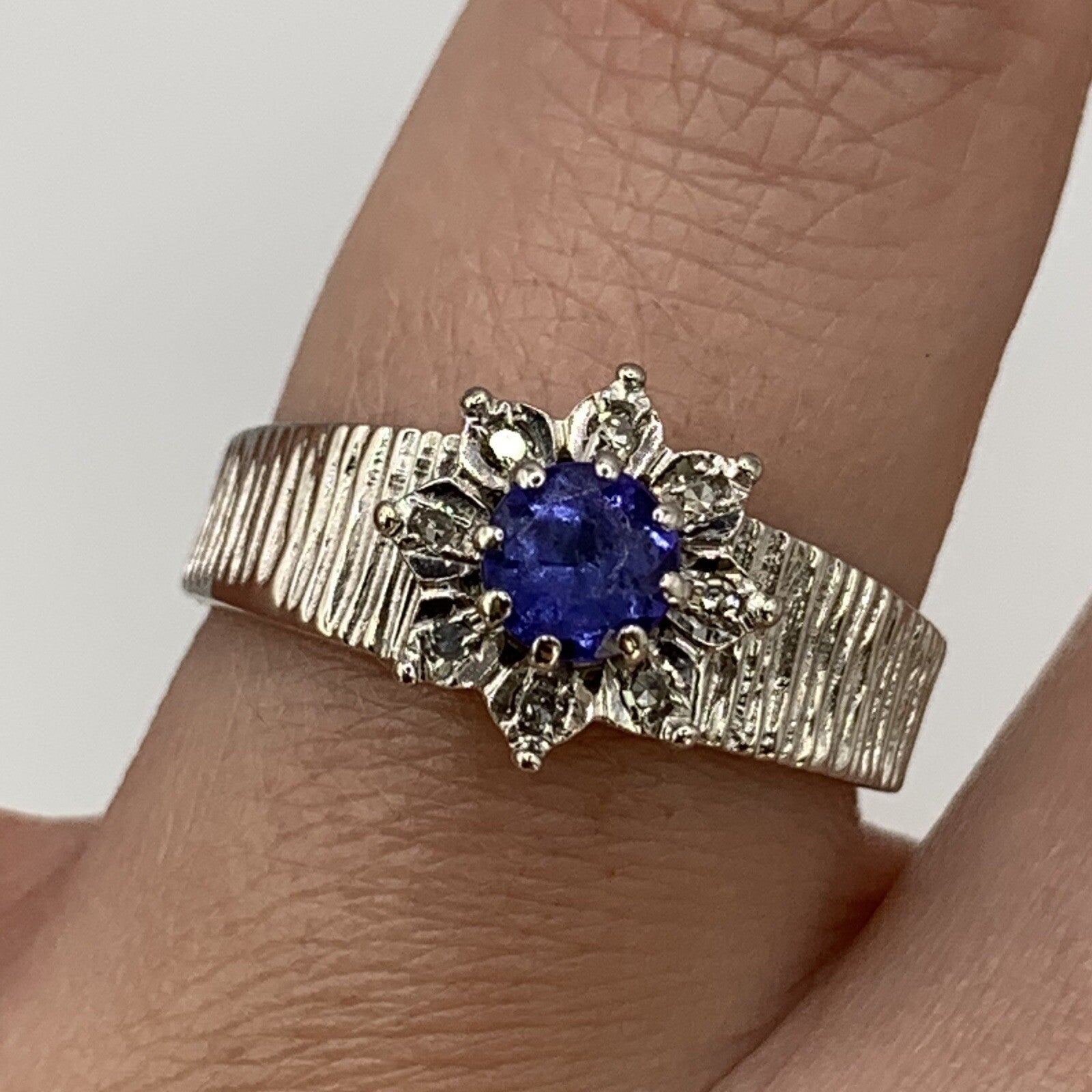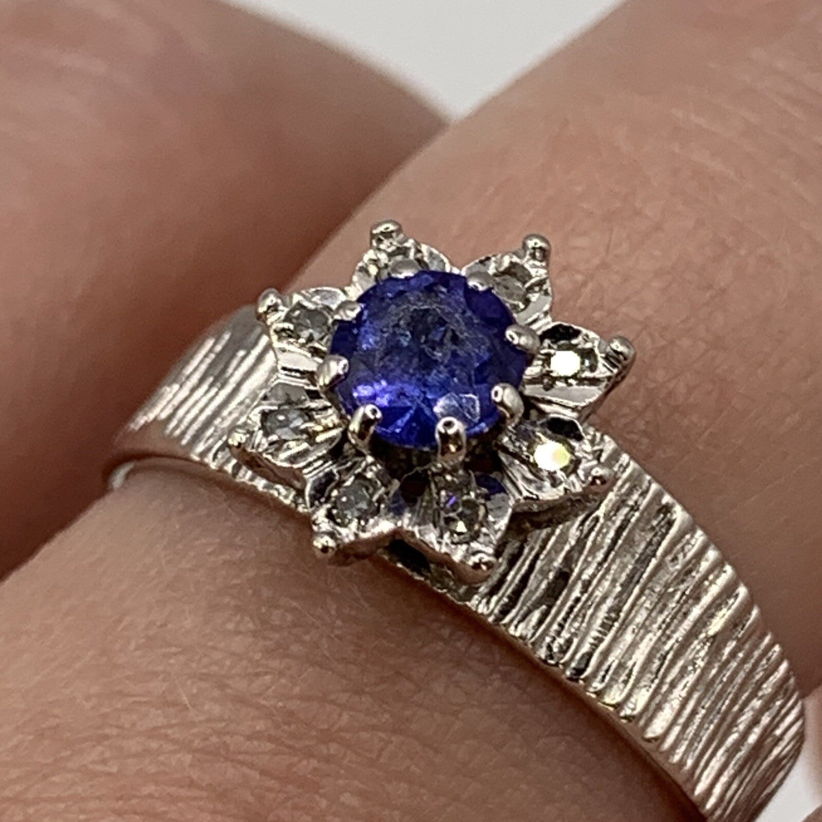 A beautiful white gold ring with a diasy shaped main setting that has a central tanzanite gemstone, surrounded by petite diamonds. The shoulders have an eye-catching textured finish. The tanzanite has some signs of wear to the surface. This is reflected in the price.