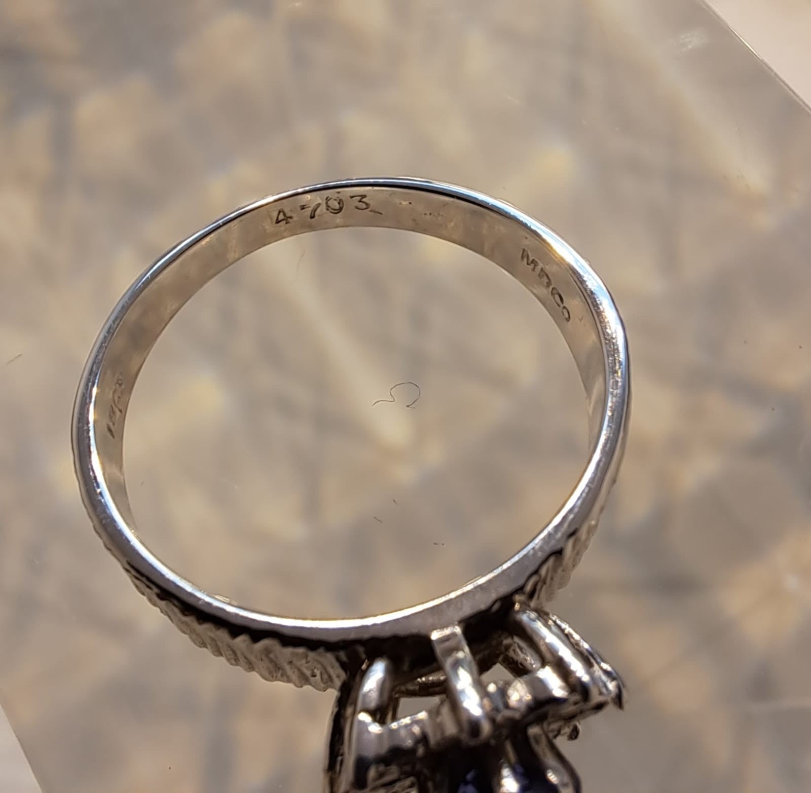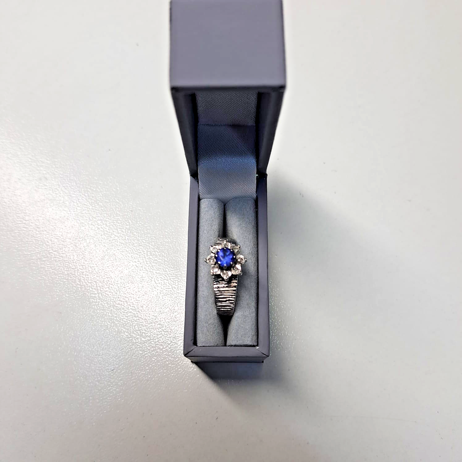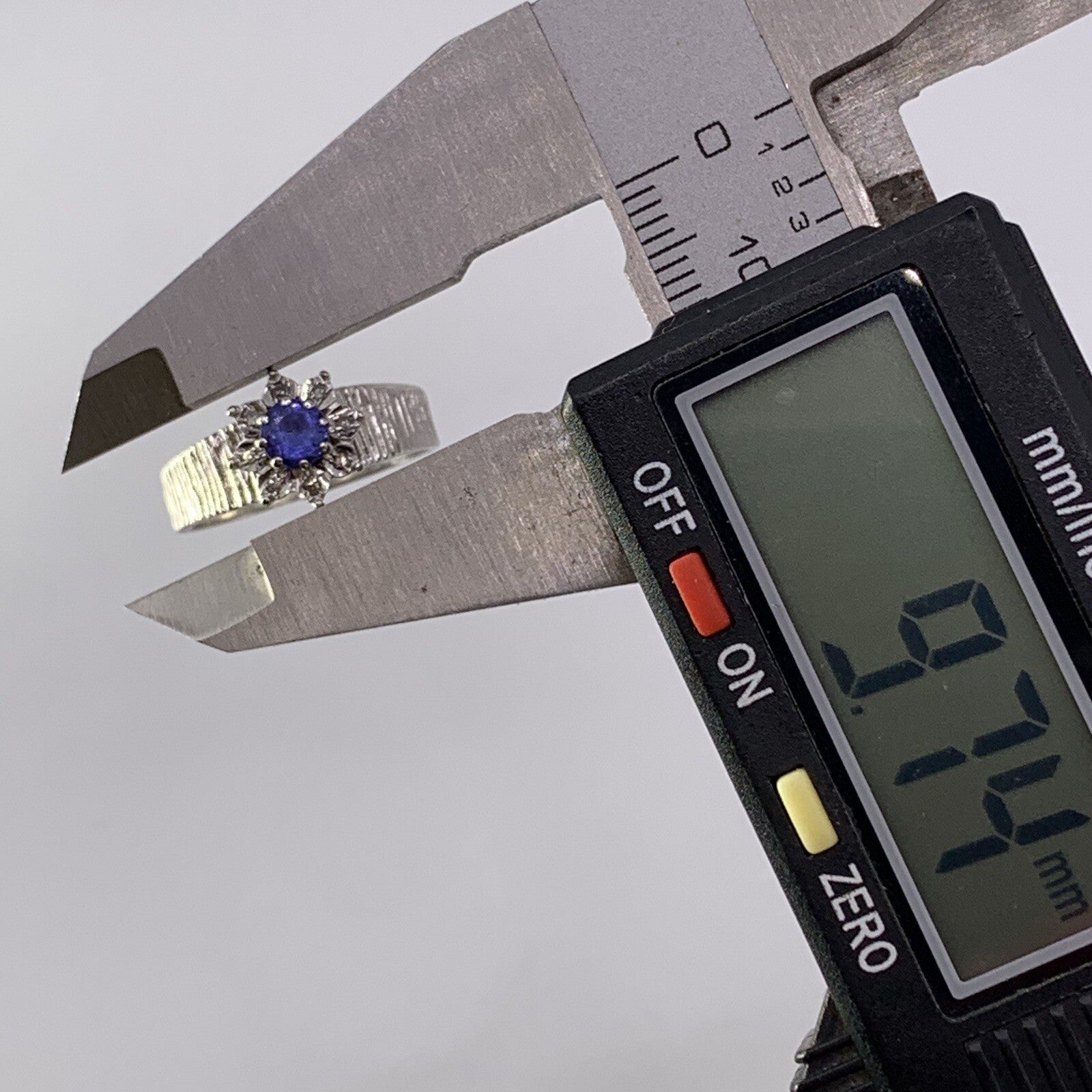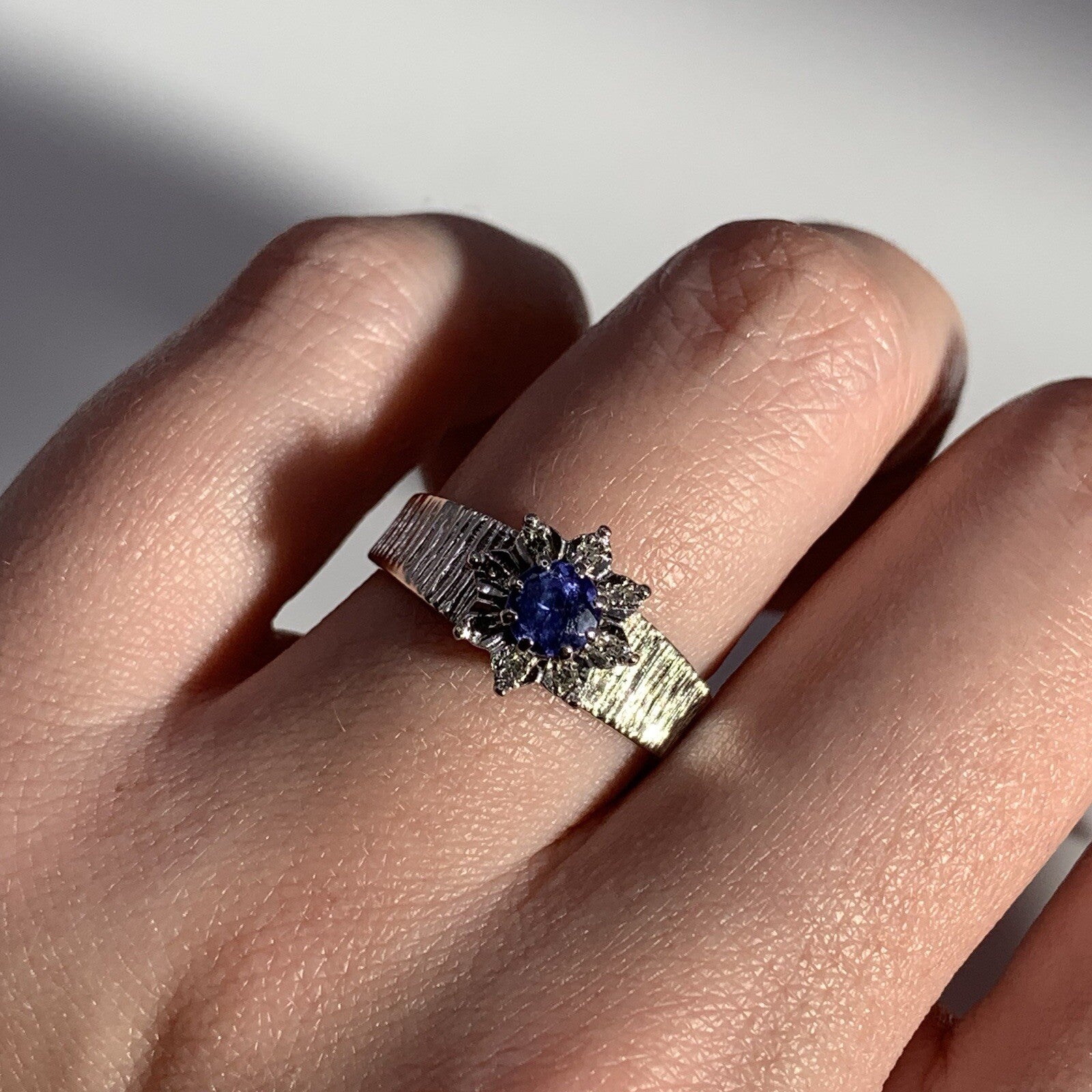 A beautiful white gold ring with a diasy shaped main setting that has a central tanzanite gemstone, surrounded by petite diamonds. The shoulders have an eye-catching textured finish. The tanzanite has some signs of wear to the surface. This is reflected in the price.