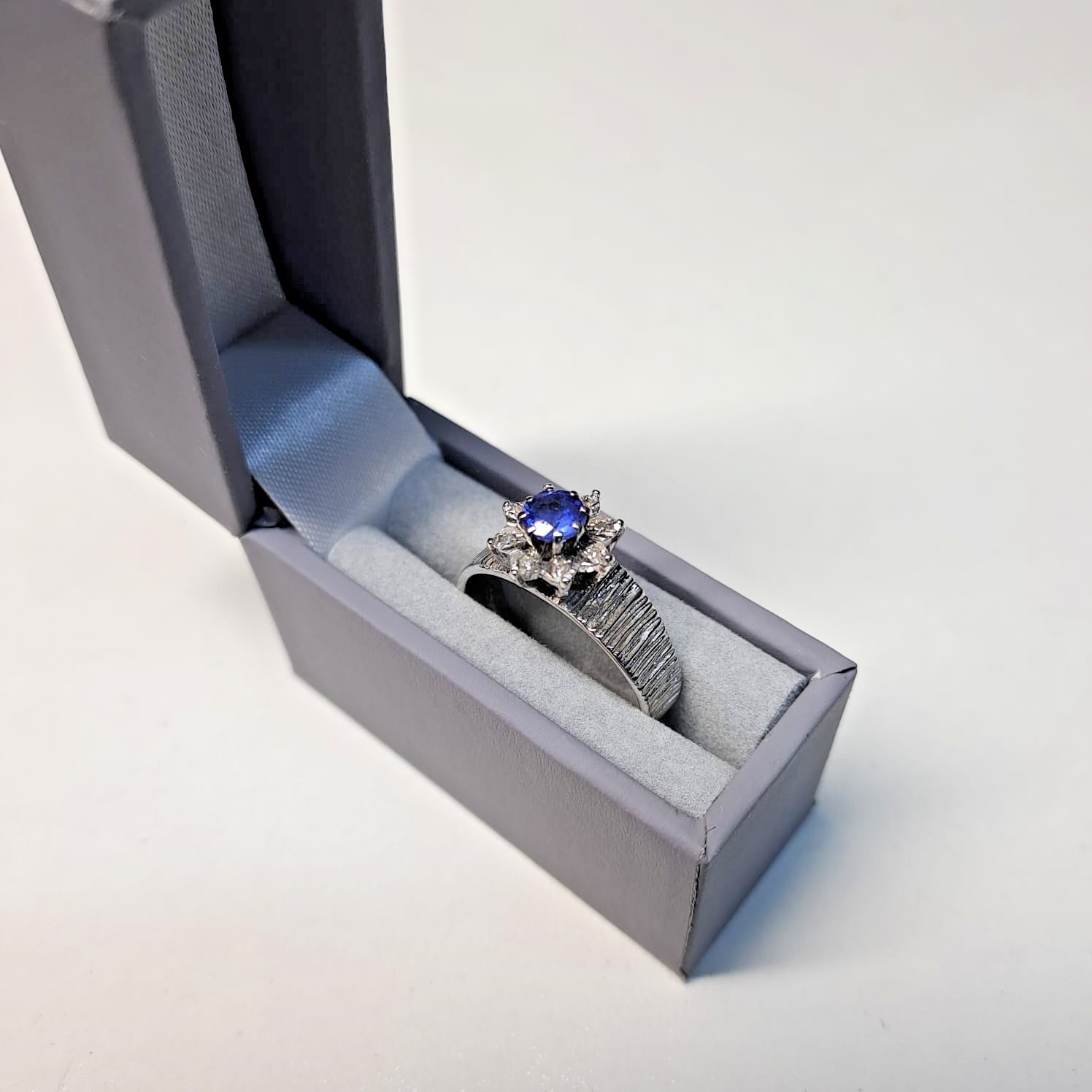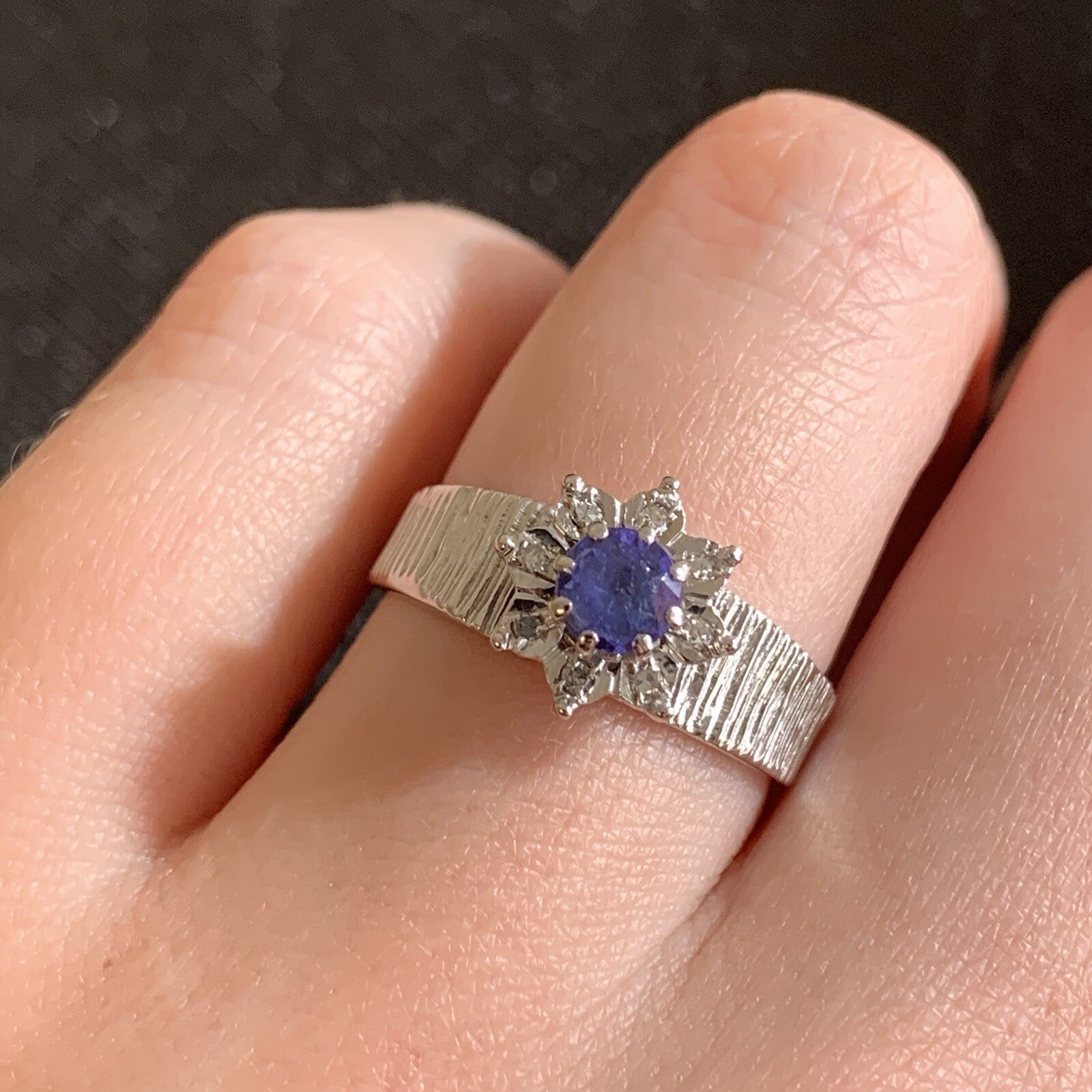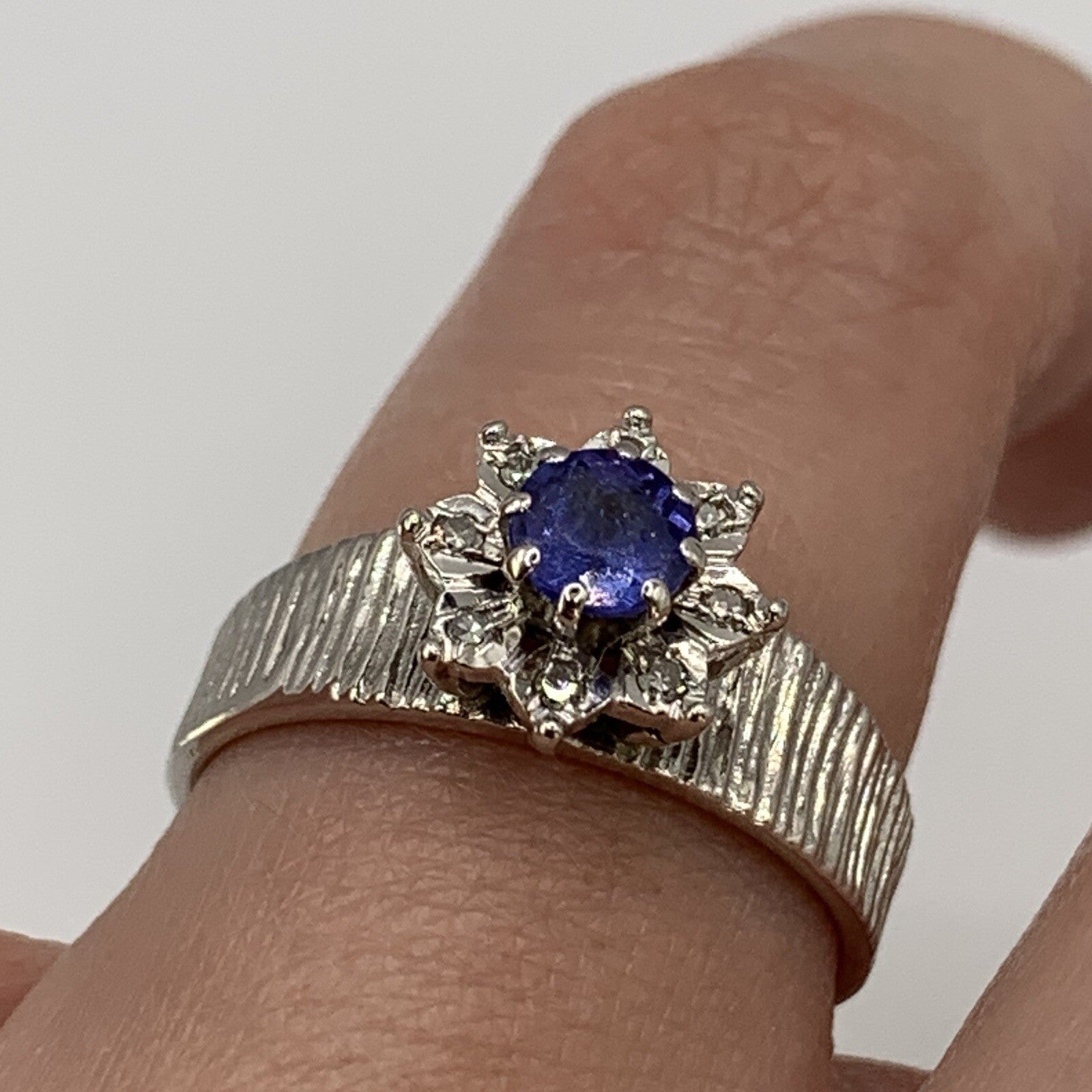 Tanzanite & Diamond Ring 18 ct White Gold Daisy Textured Shoulder- Size M