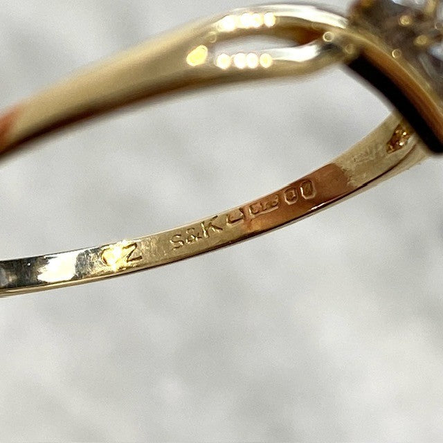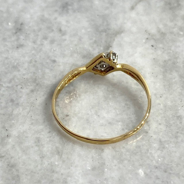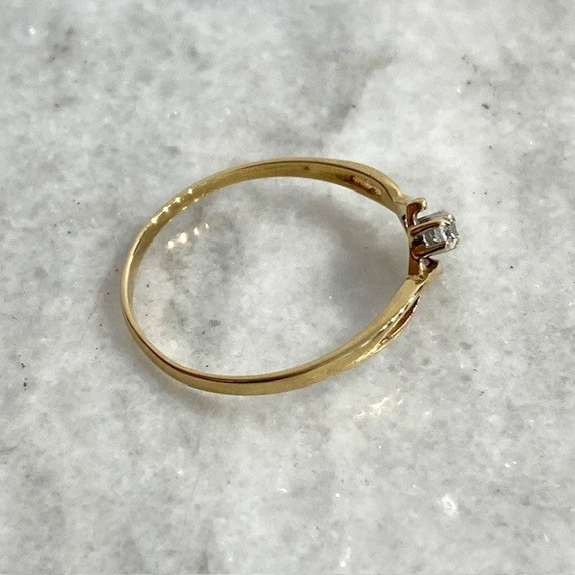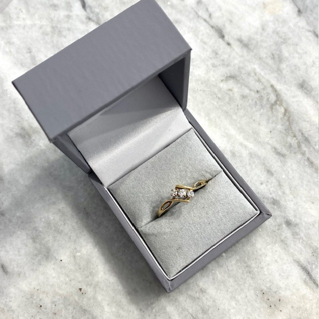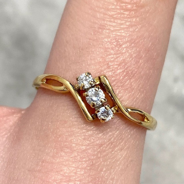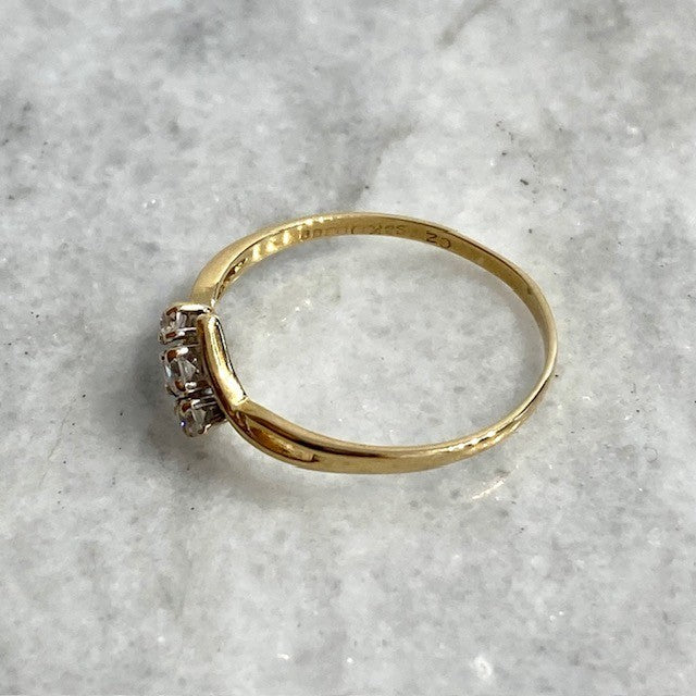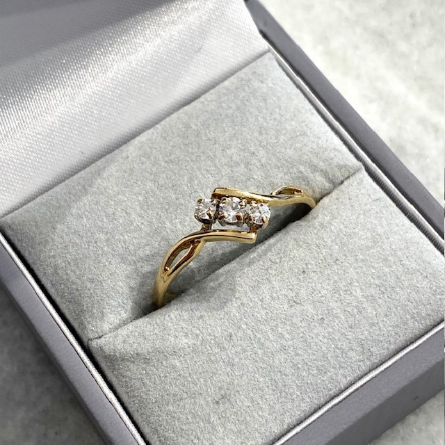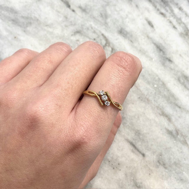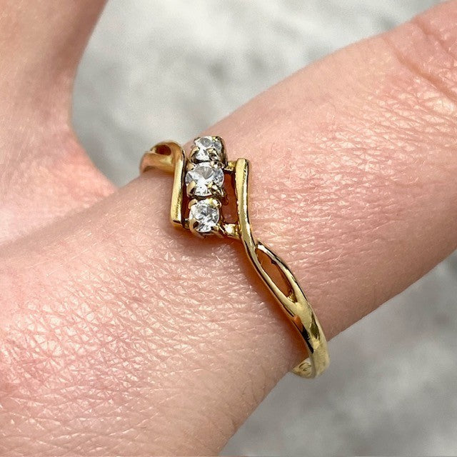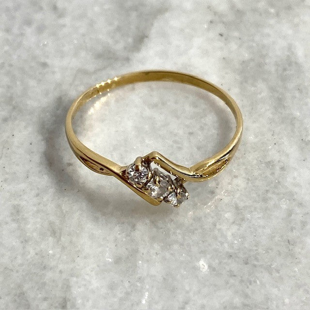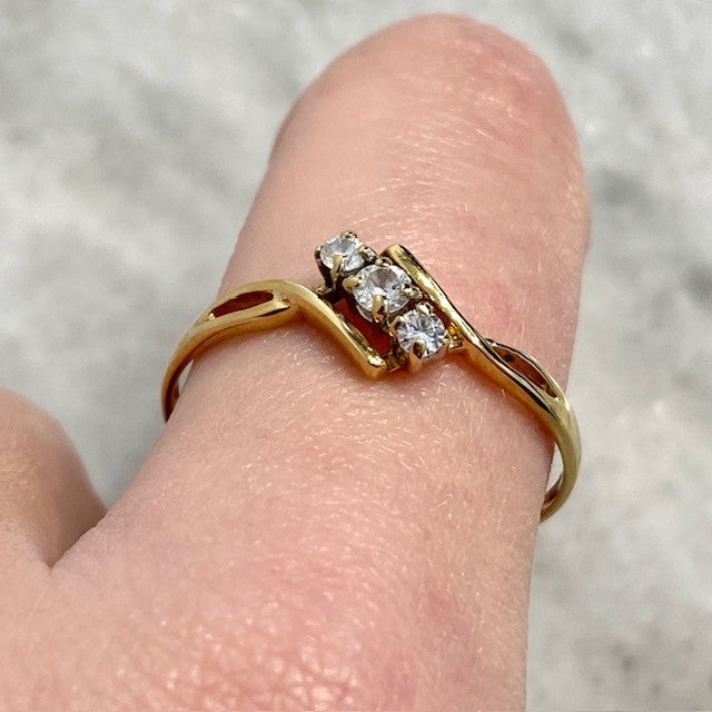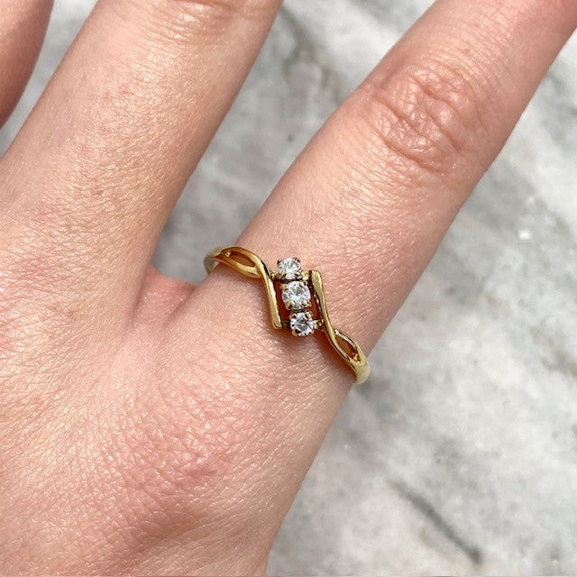 - A gorgeous gold ring with a trilogy of Cubic Zirconia stones, set with twisted bypass style shoulders.