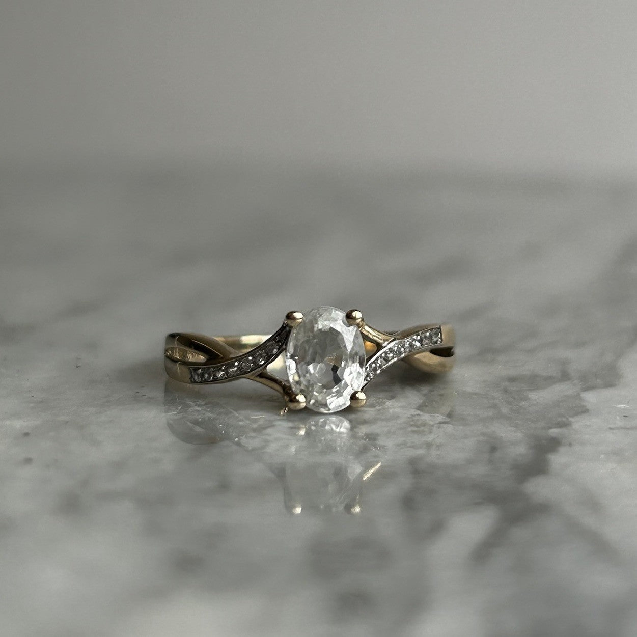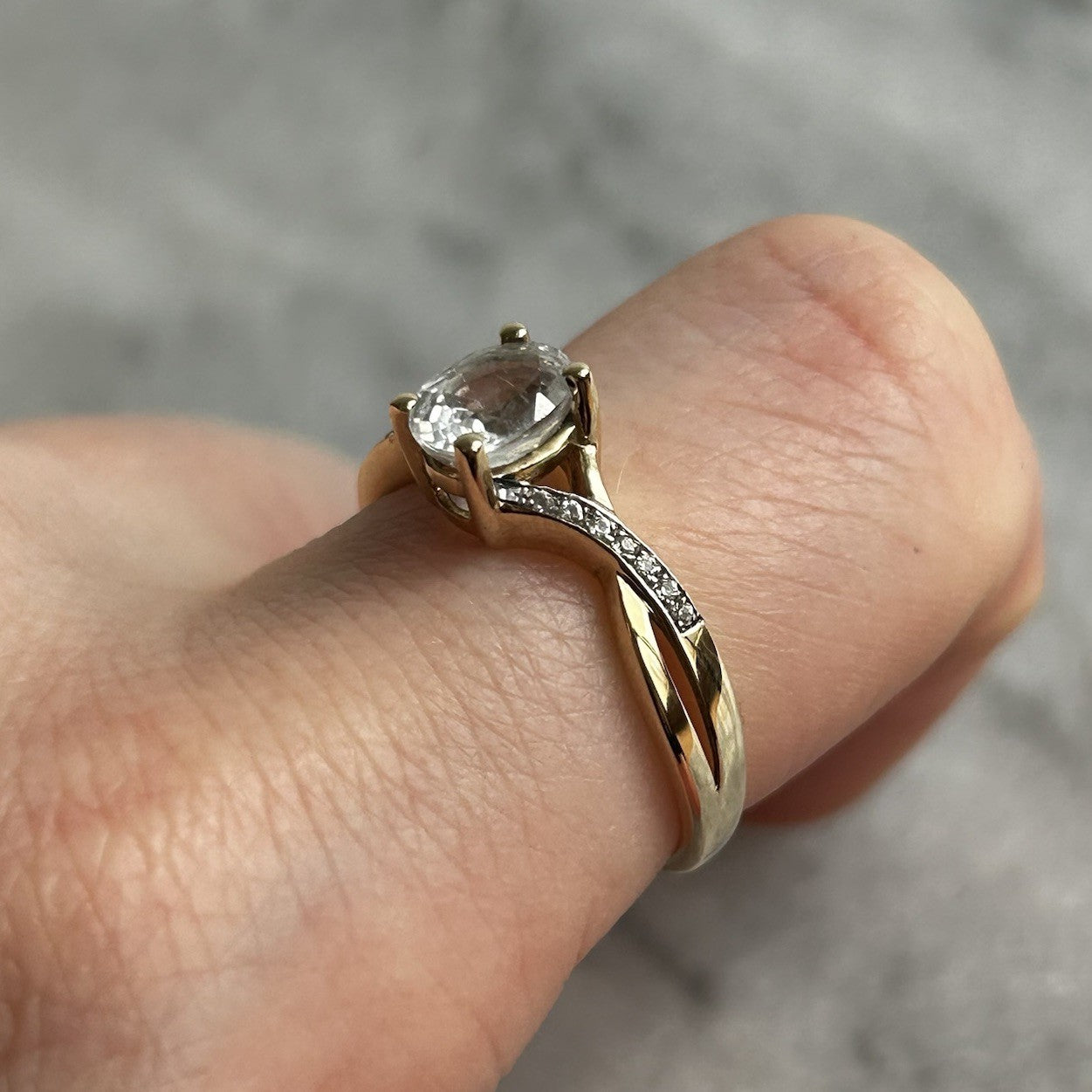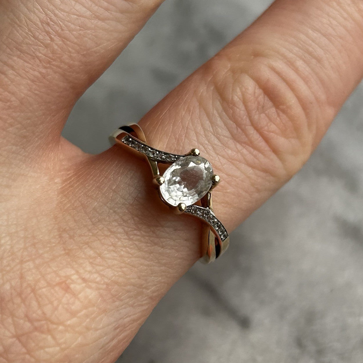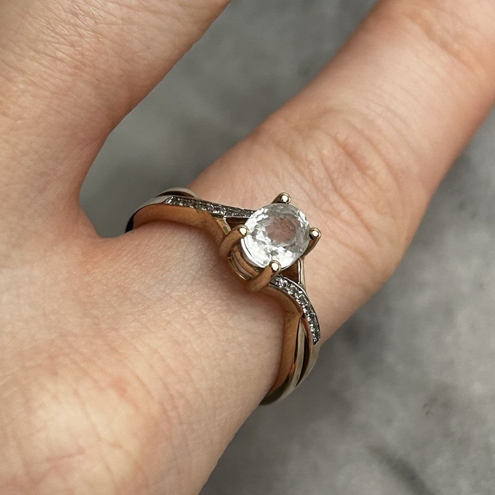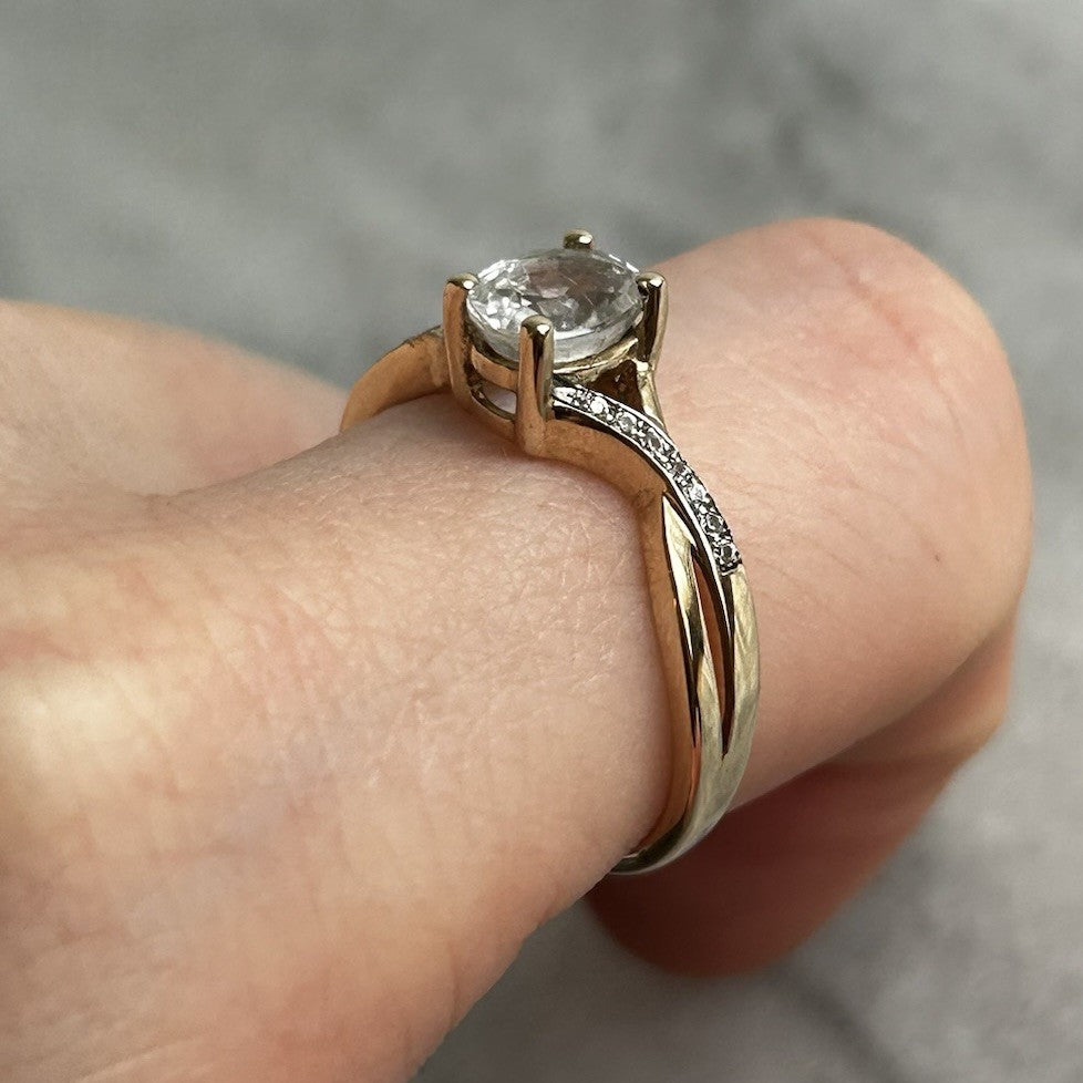 A beautiful gold twisted crossover style ring showcasing an oval cut white topaz, accented by petite cubic zirconia gemstones on the shoulders.