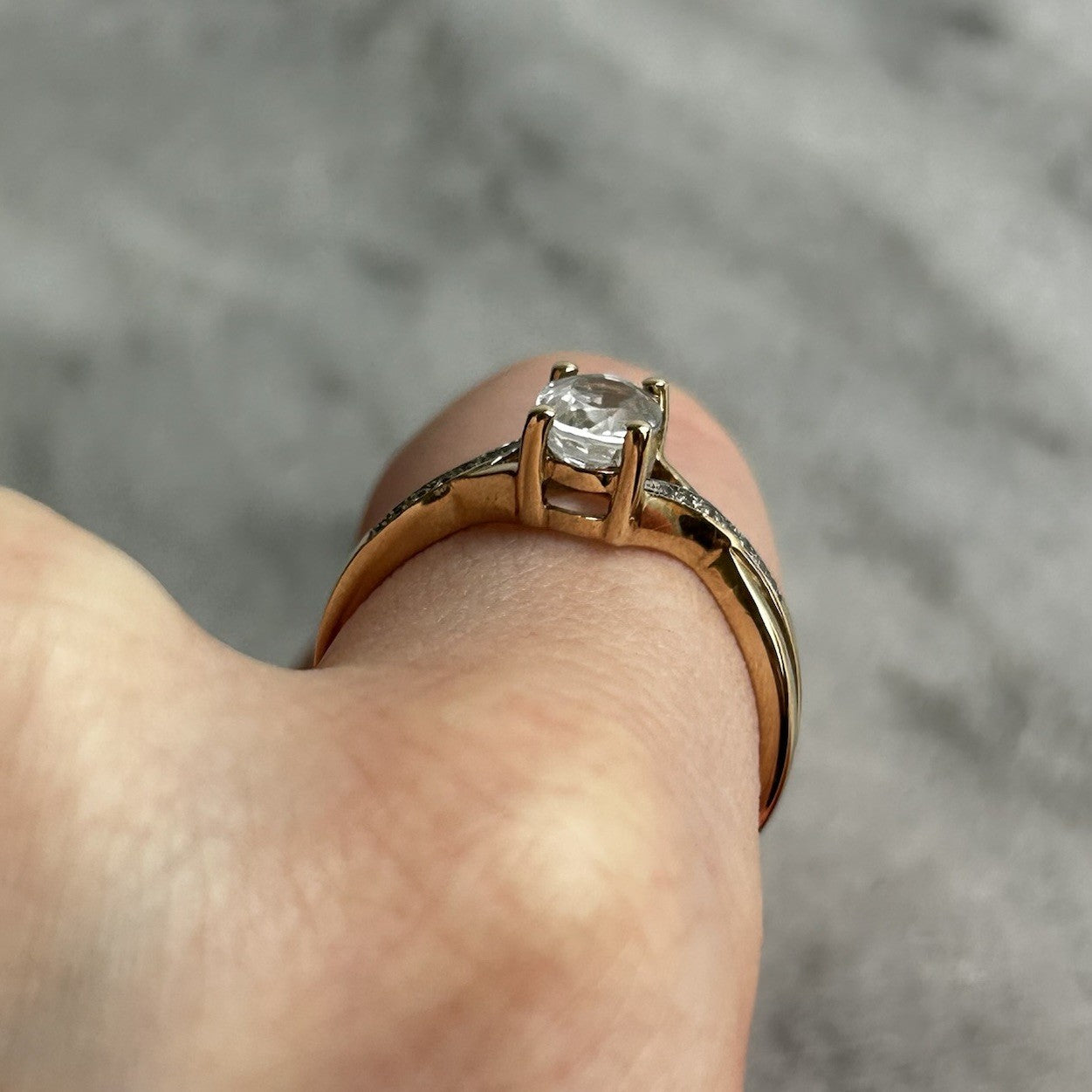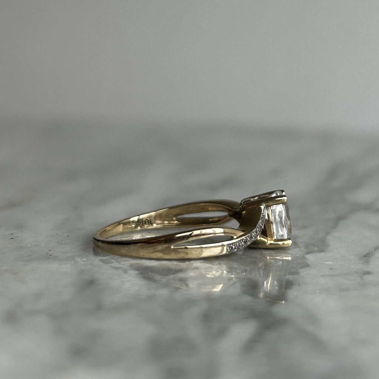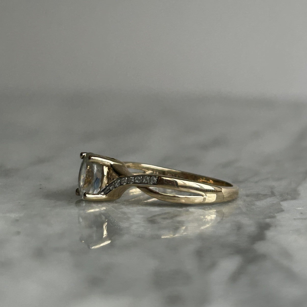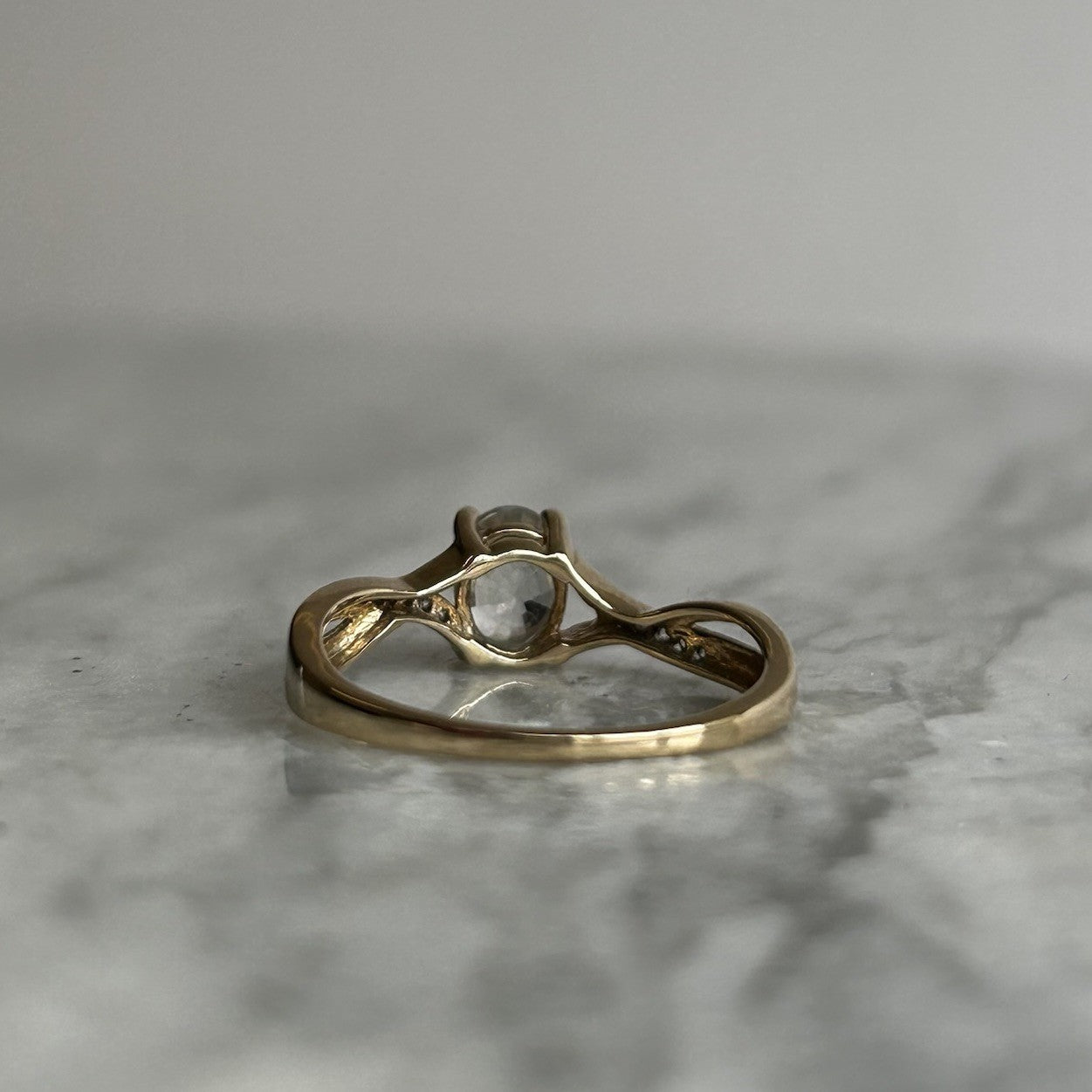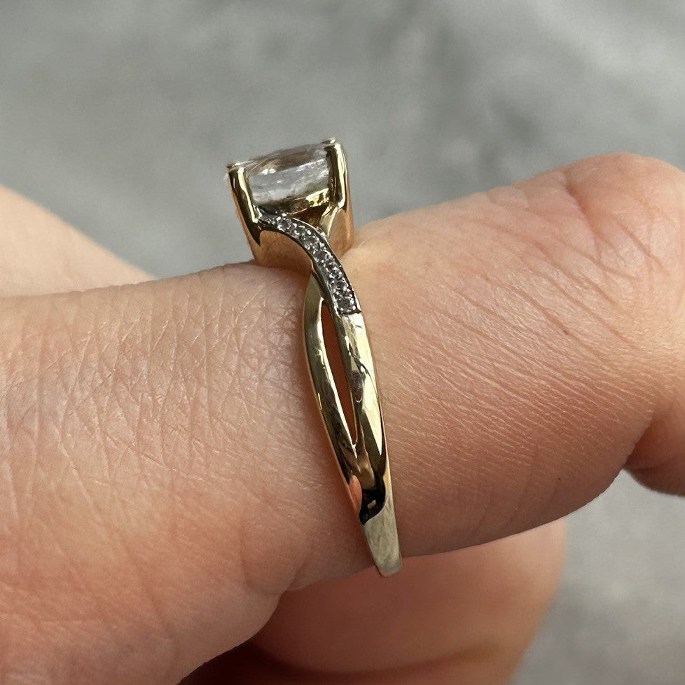 A beautiful gold twisted crossover style ring showcasing an oval cut white topaz, accented by petite cubic zirconia gemstones on the shoulders.