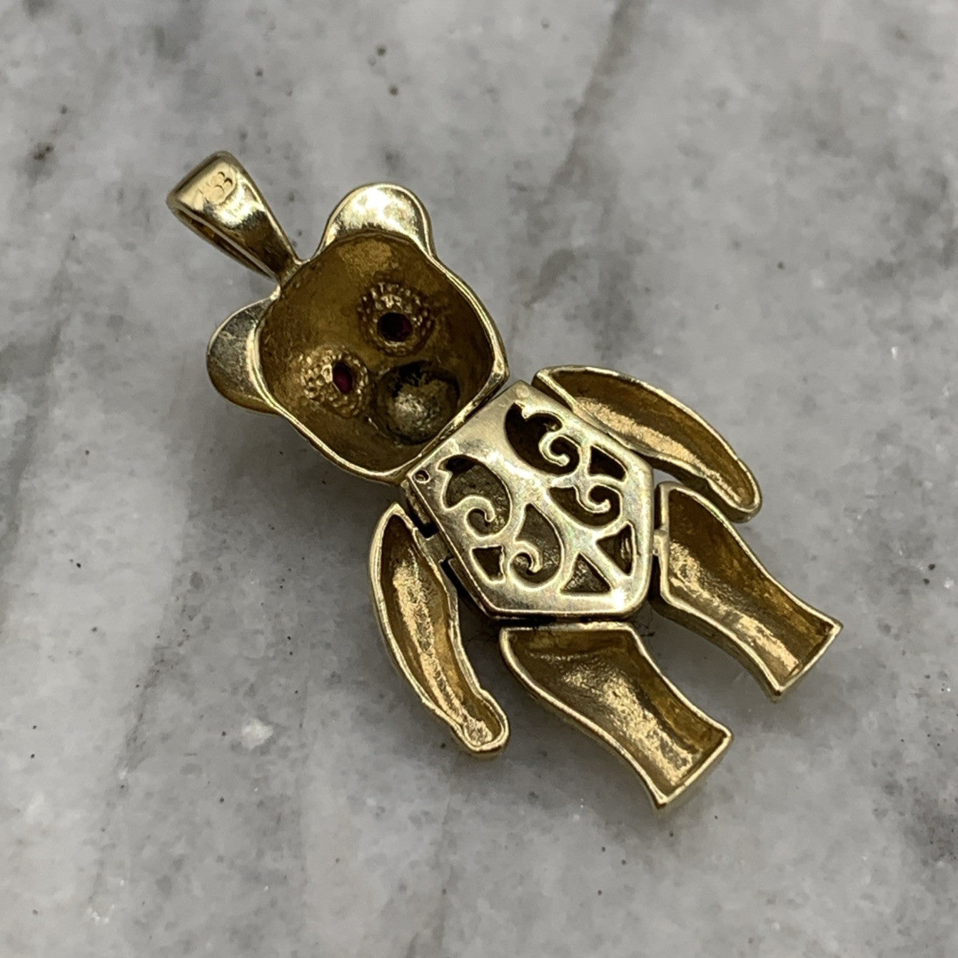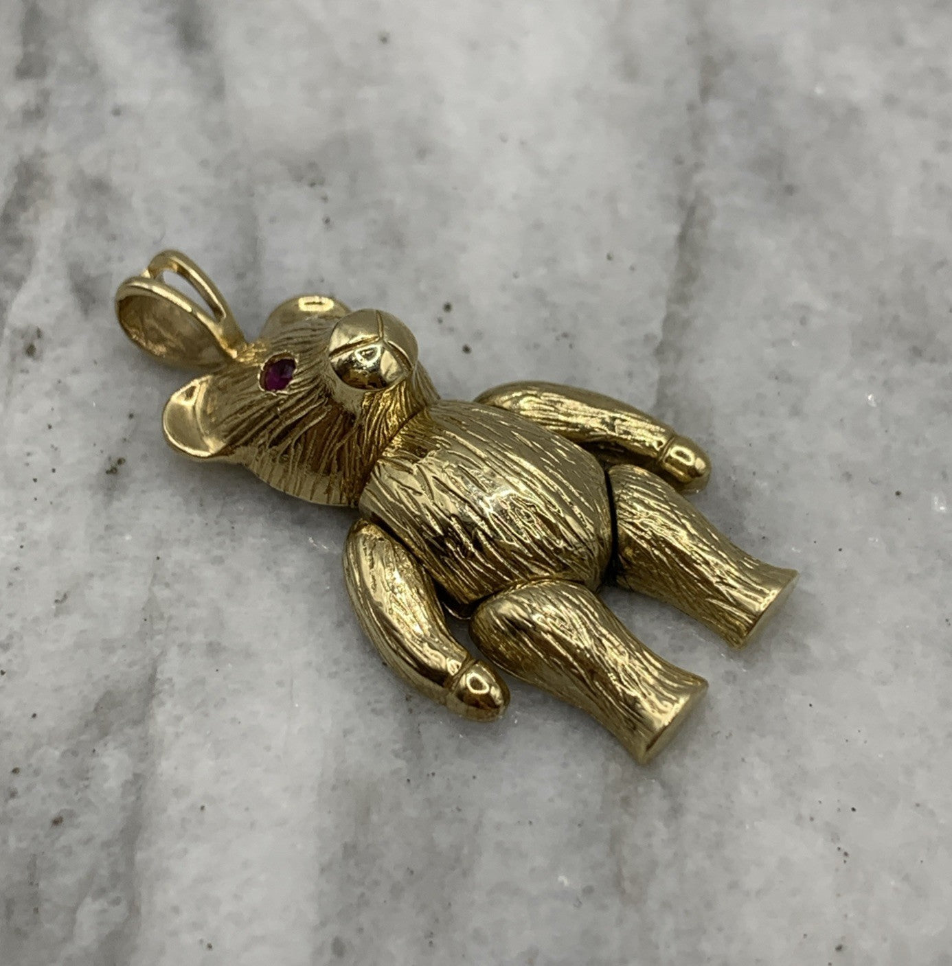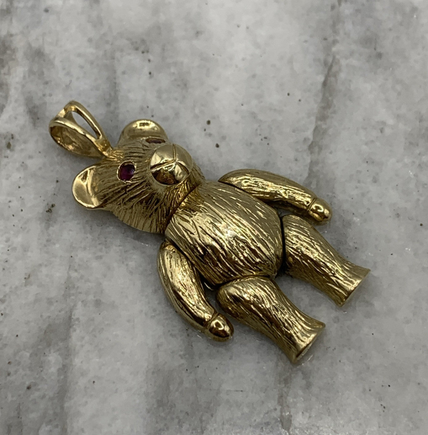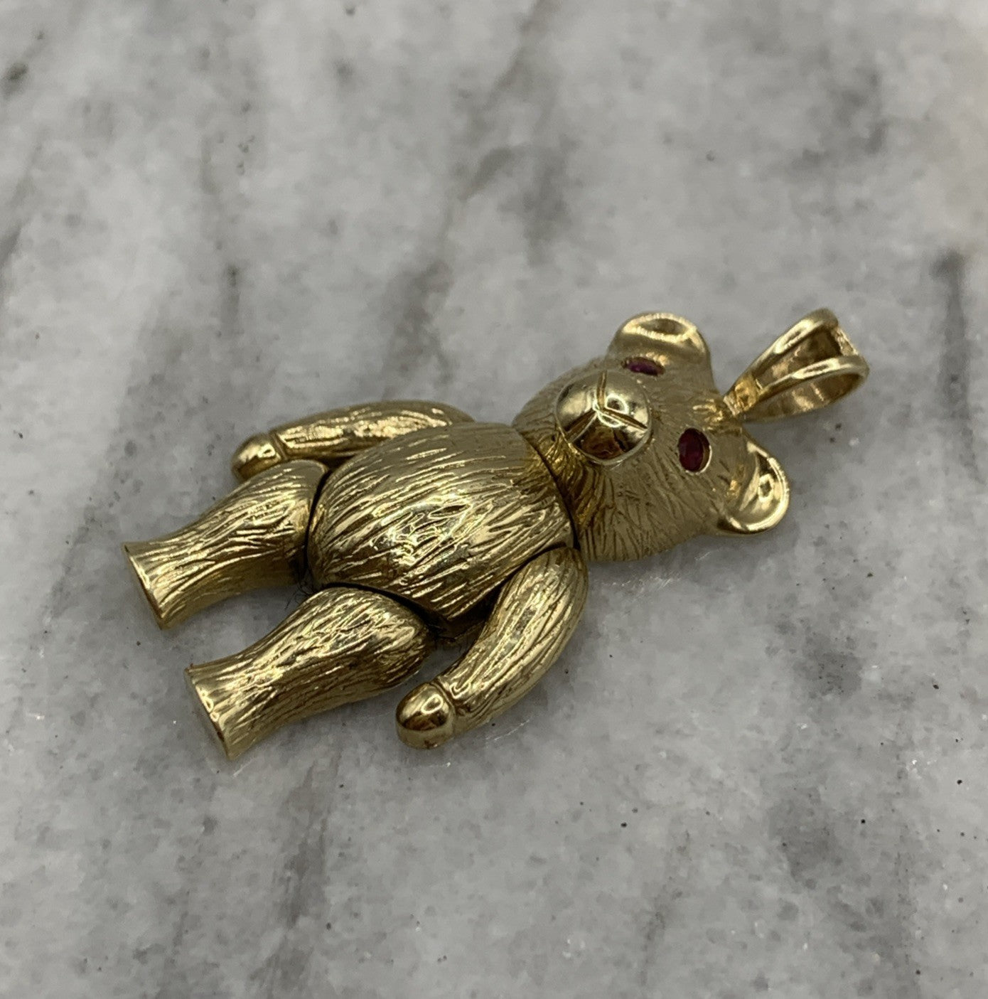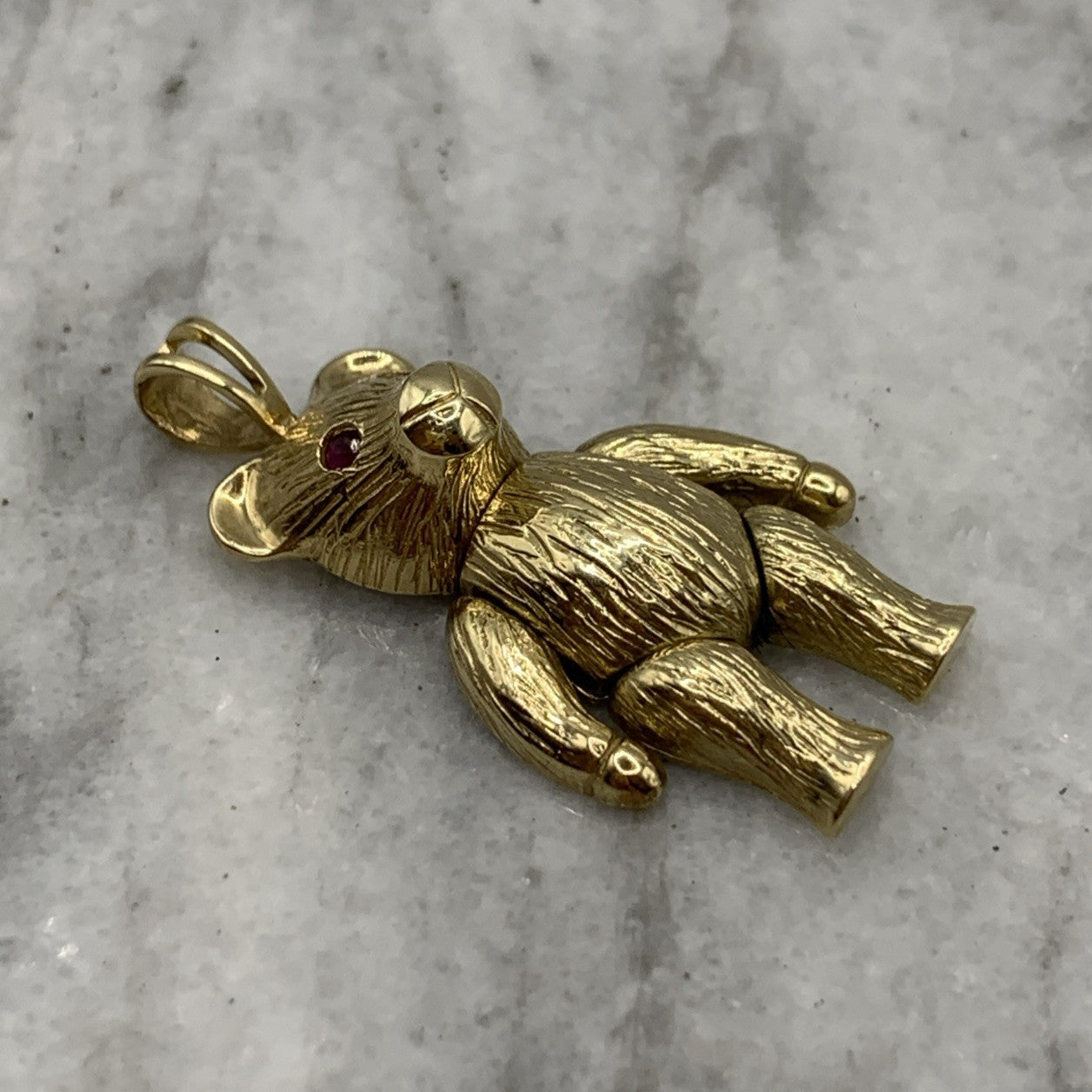A charming gold teddy bear shaped pendant with rubies for eyes.