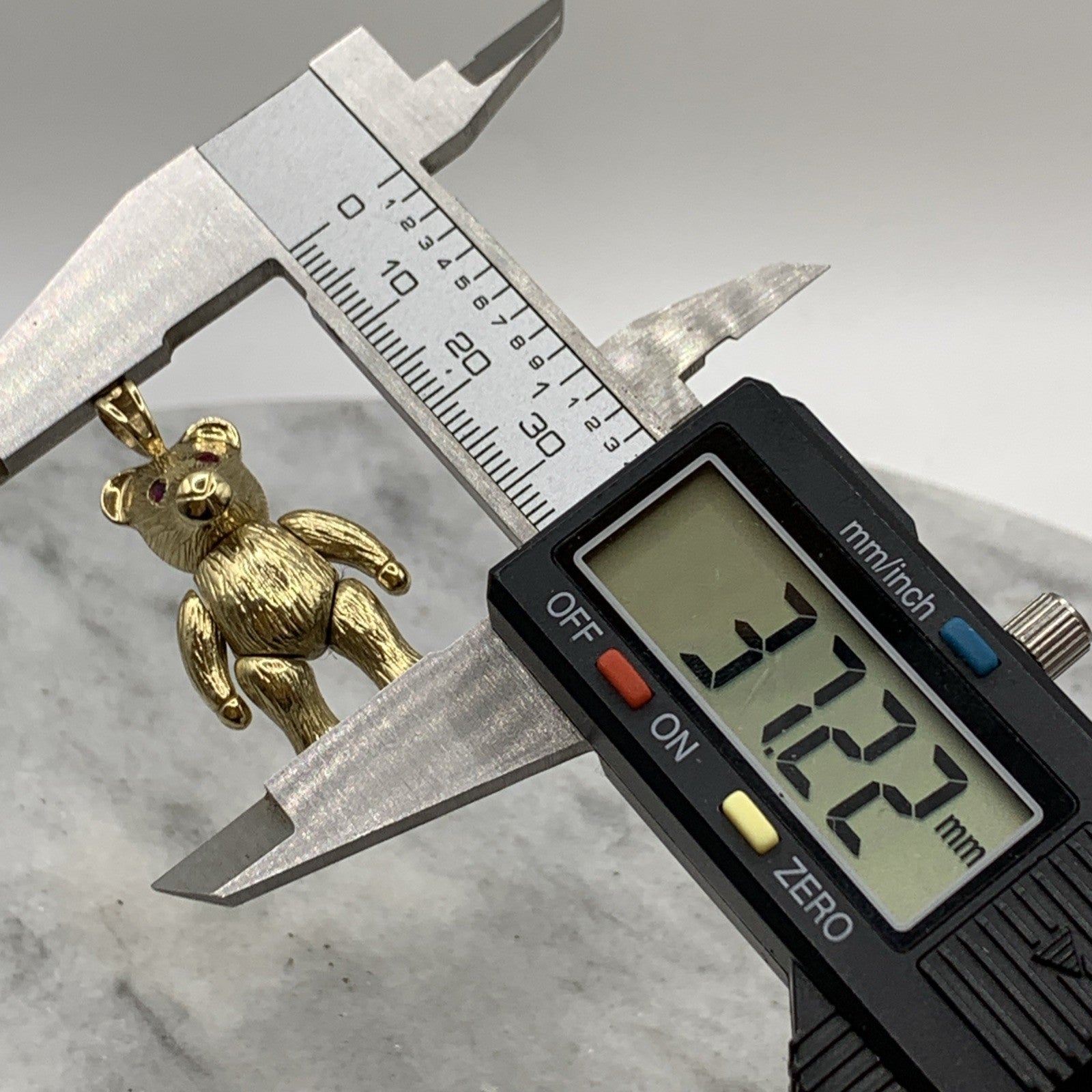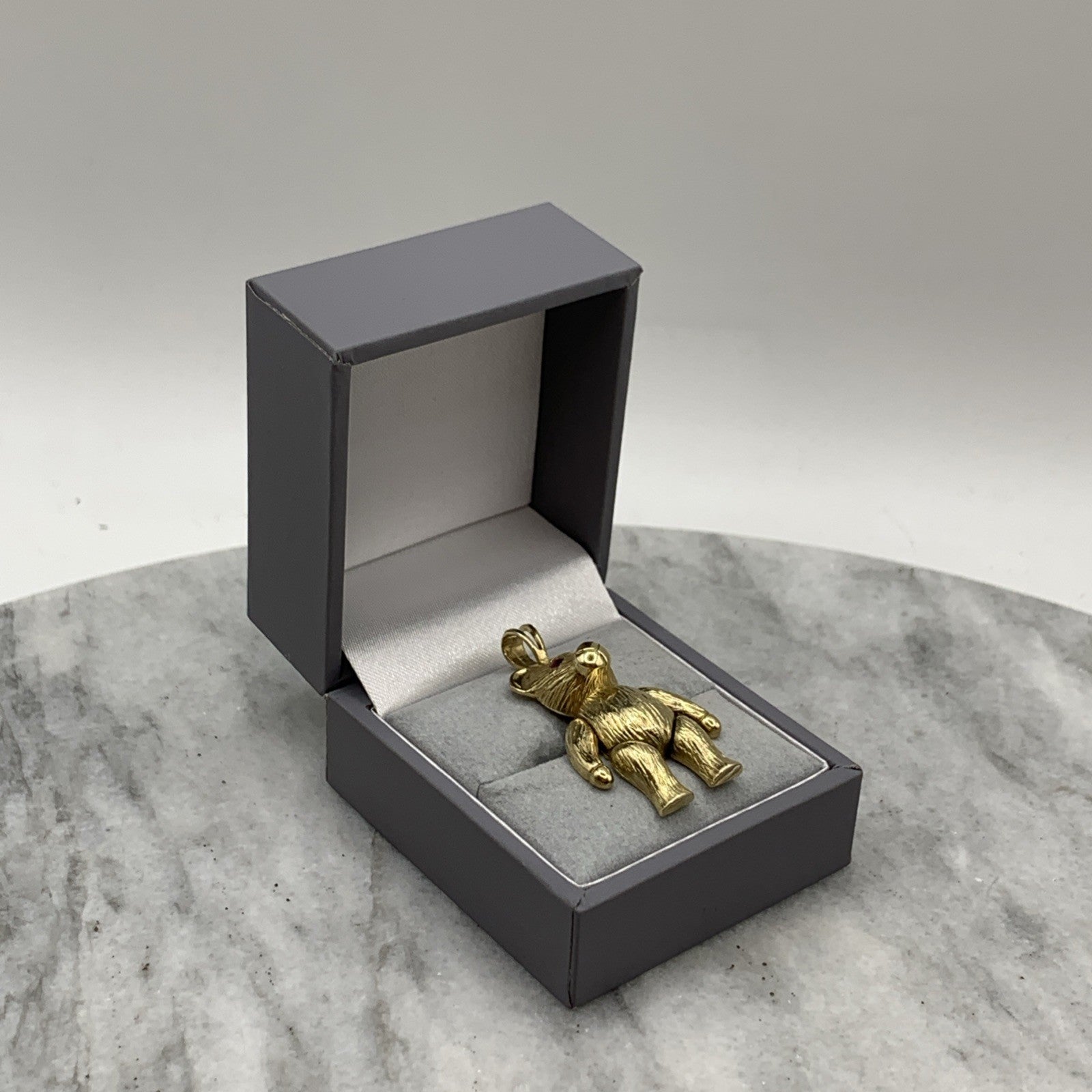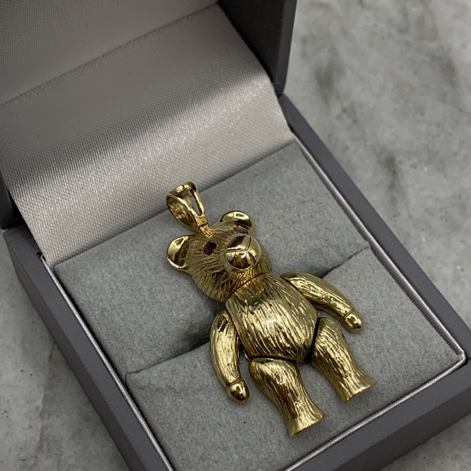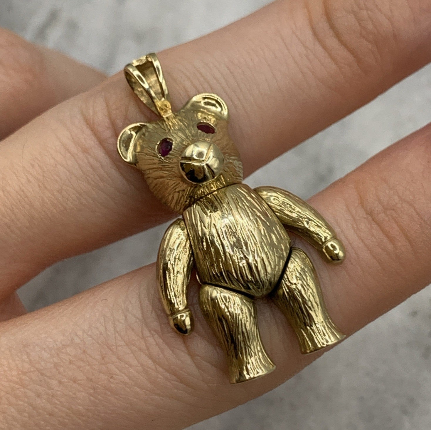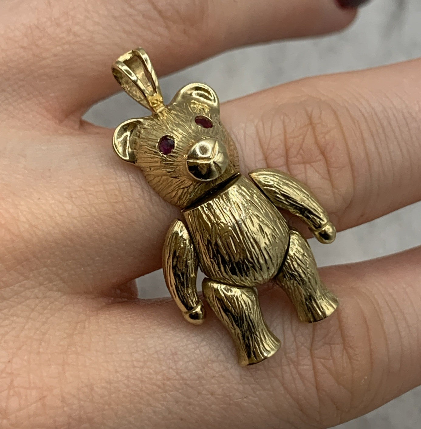 A charming gold teddy bear shaped pendant with rubies for eyes.