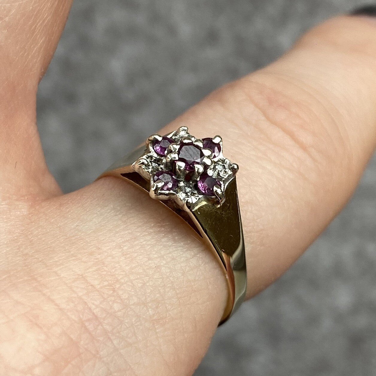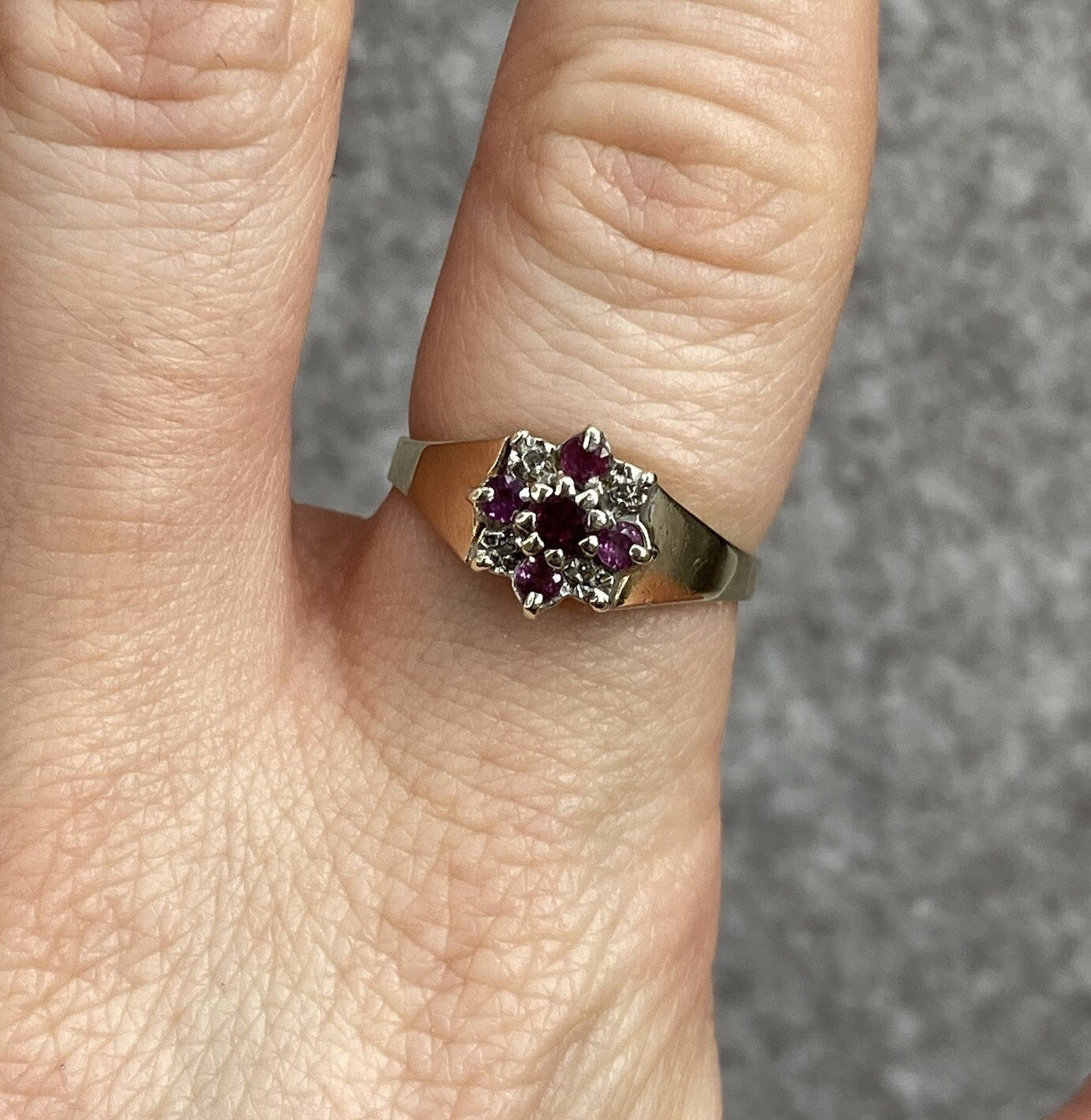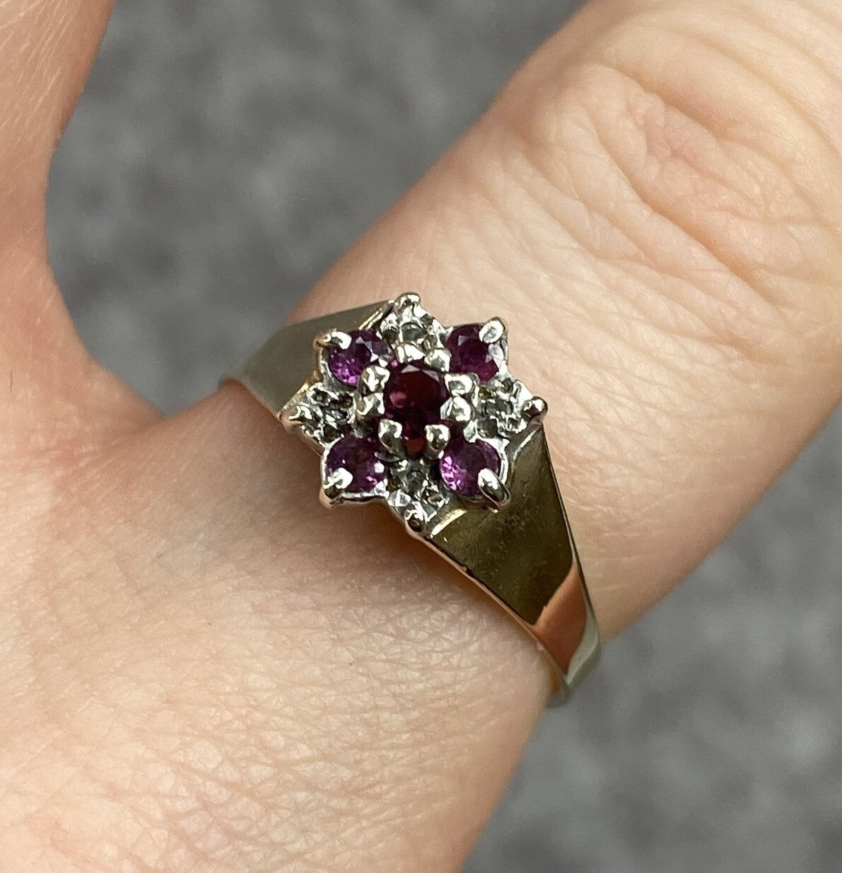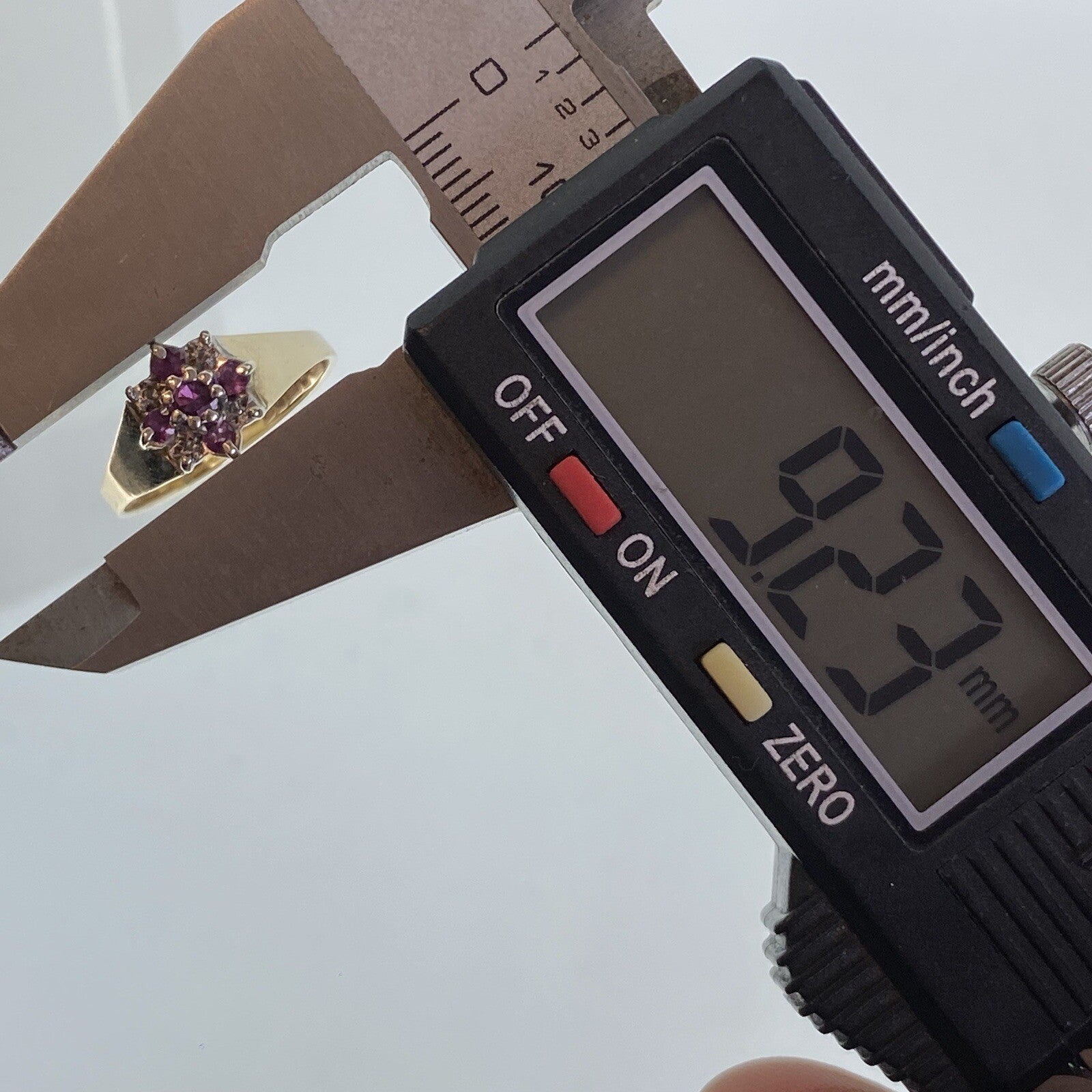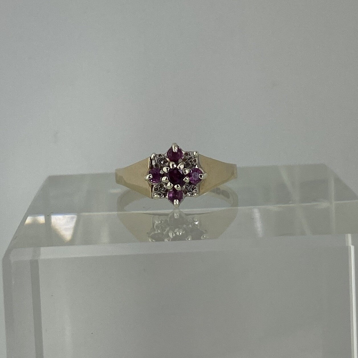 Ruby & Diamond Daisy Flower Cluster Ring 9ct 375 Yellow Gold - Size N