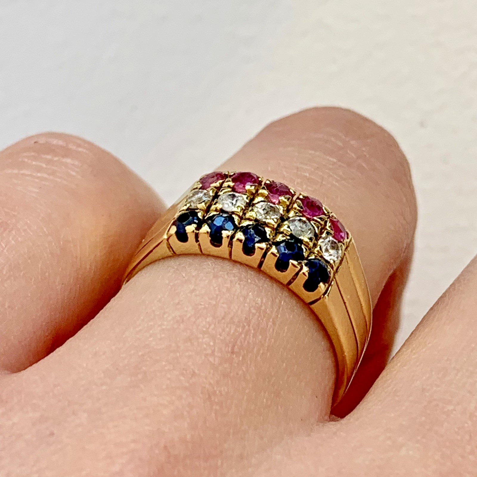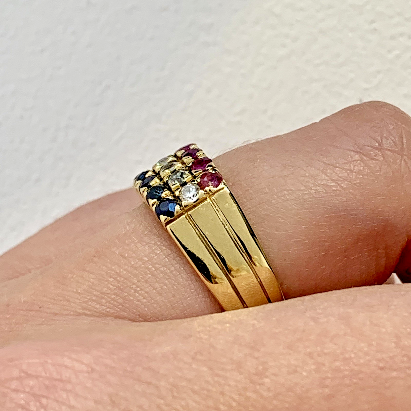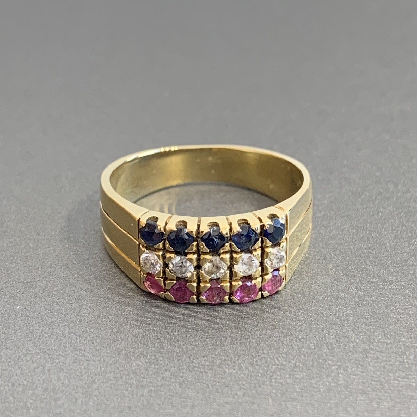 An eye catching three row ring featuring sapphire, ruby and cubic zirconia gemstones.