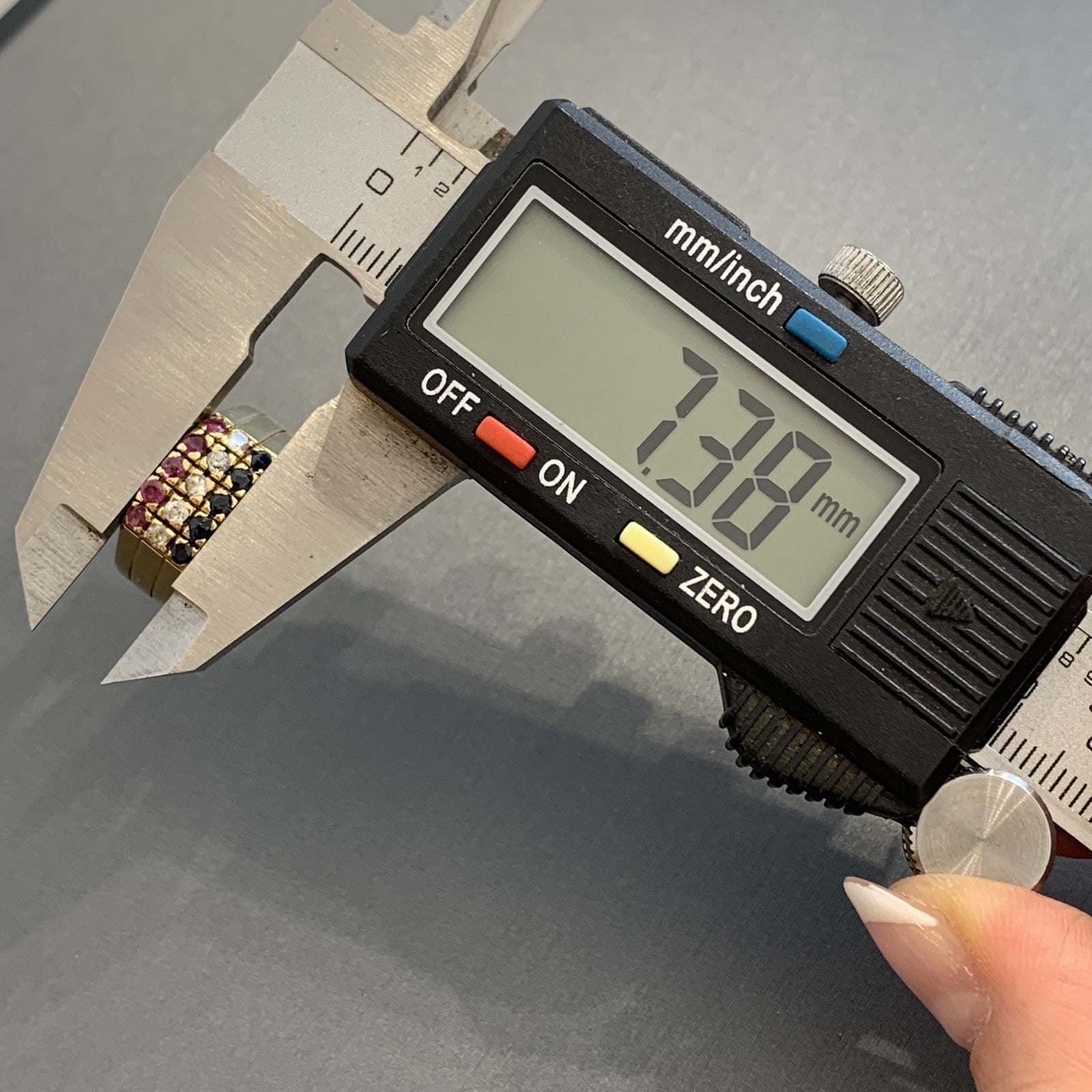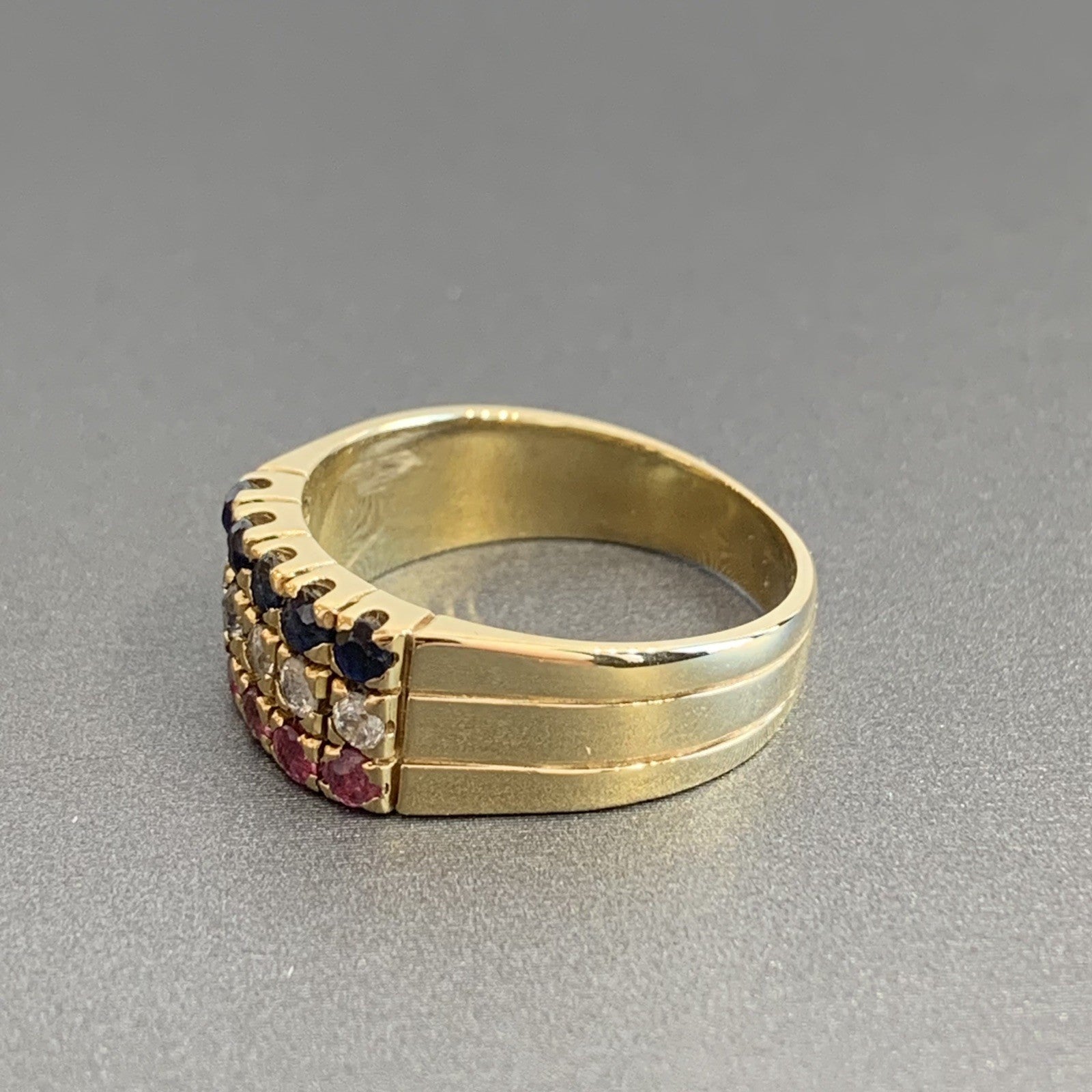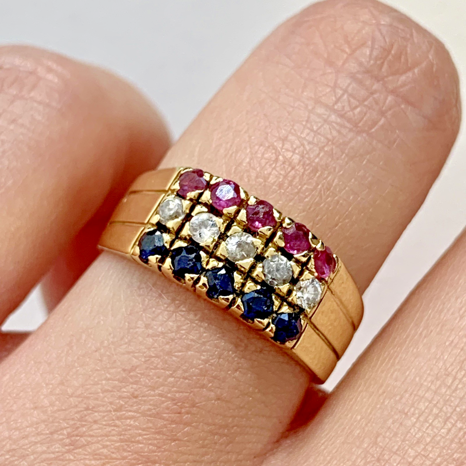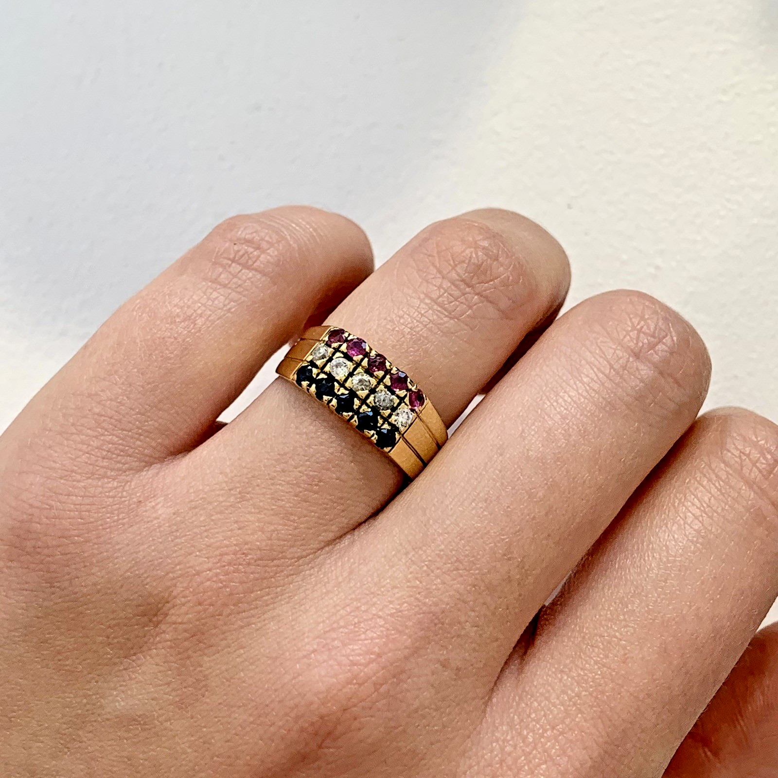 An eye catching three row ring featuring sapphire, ruby and cubic zirconia gemstones.