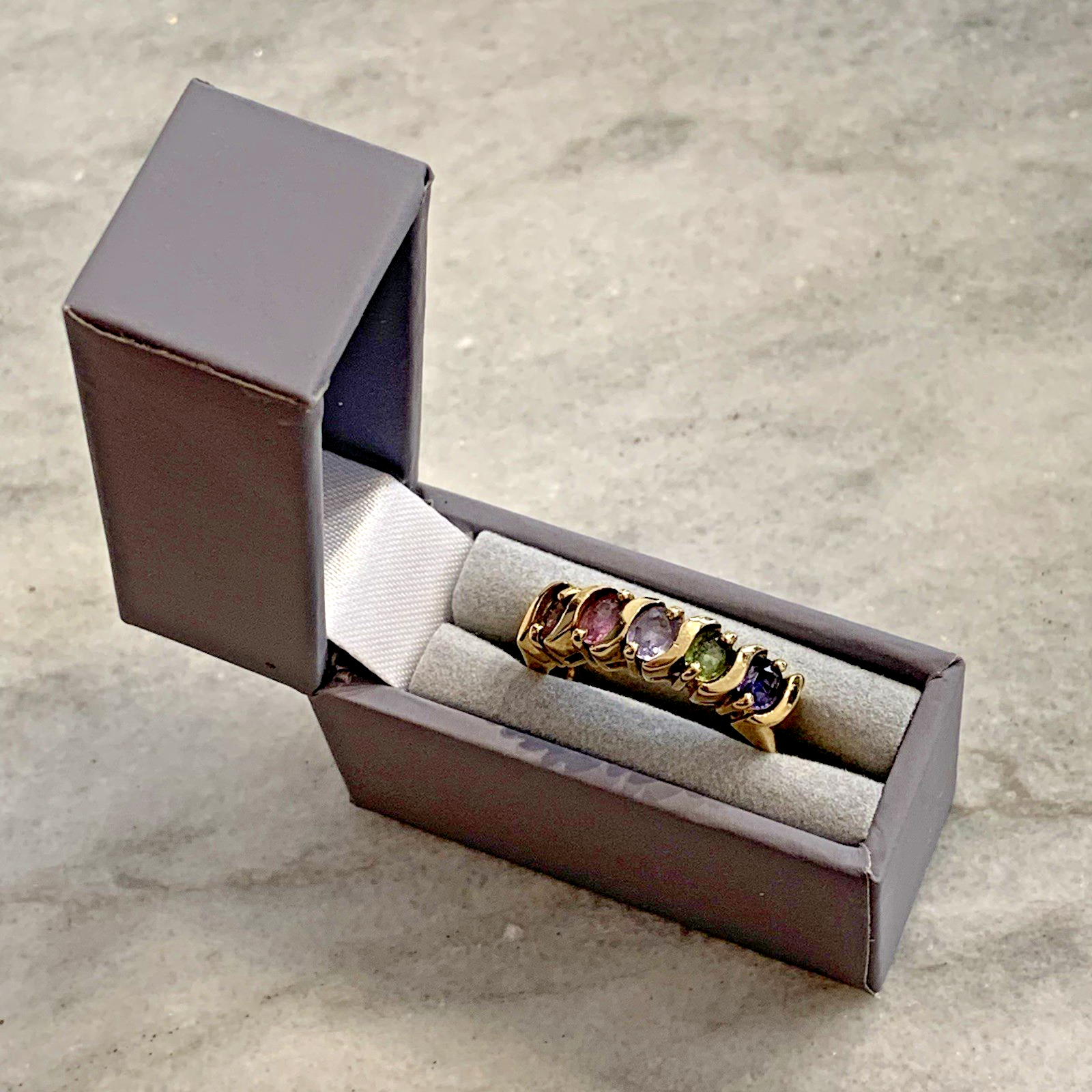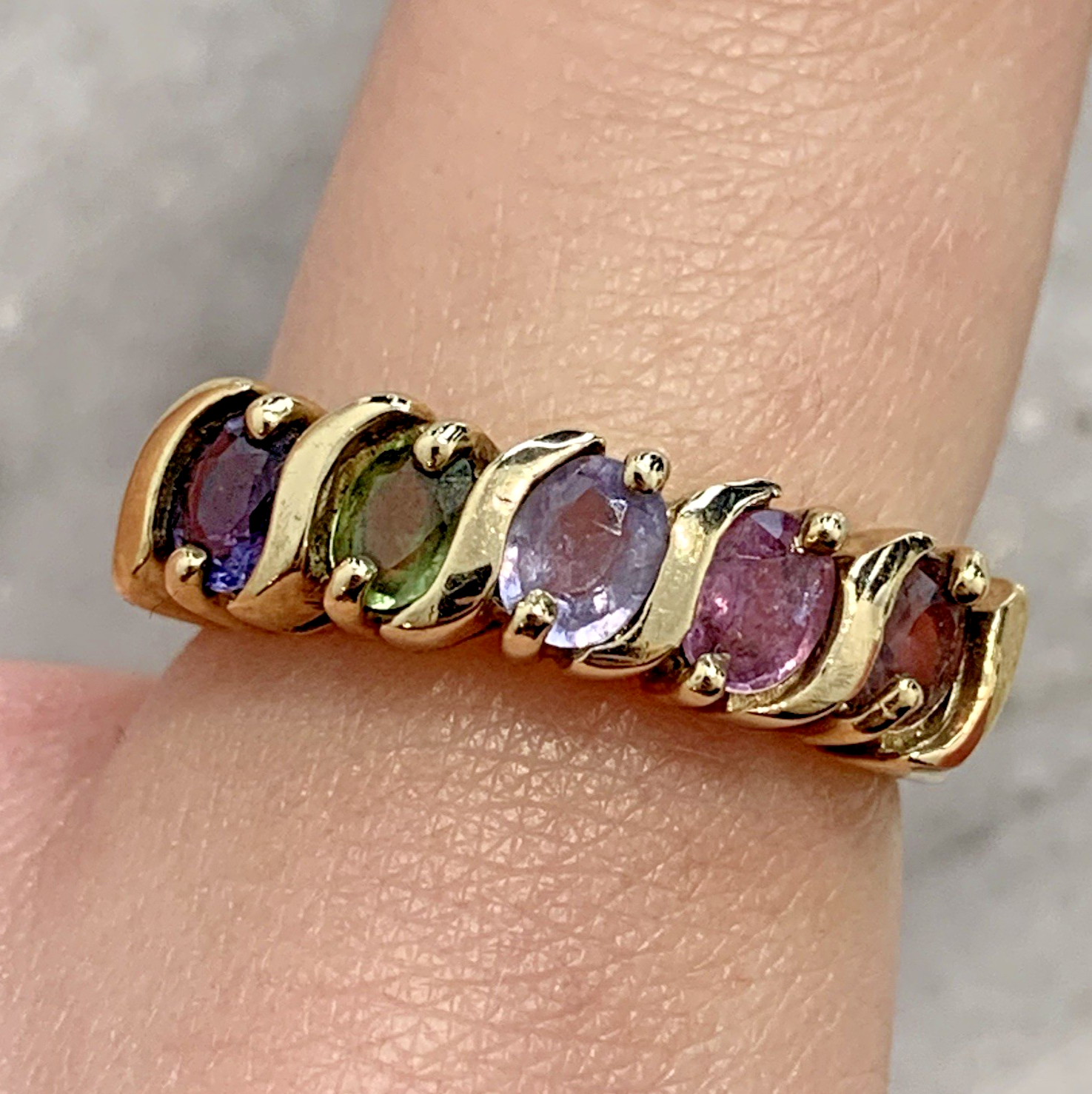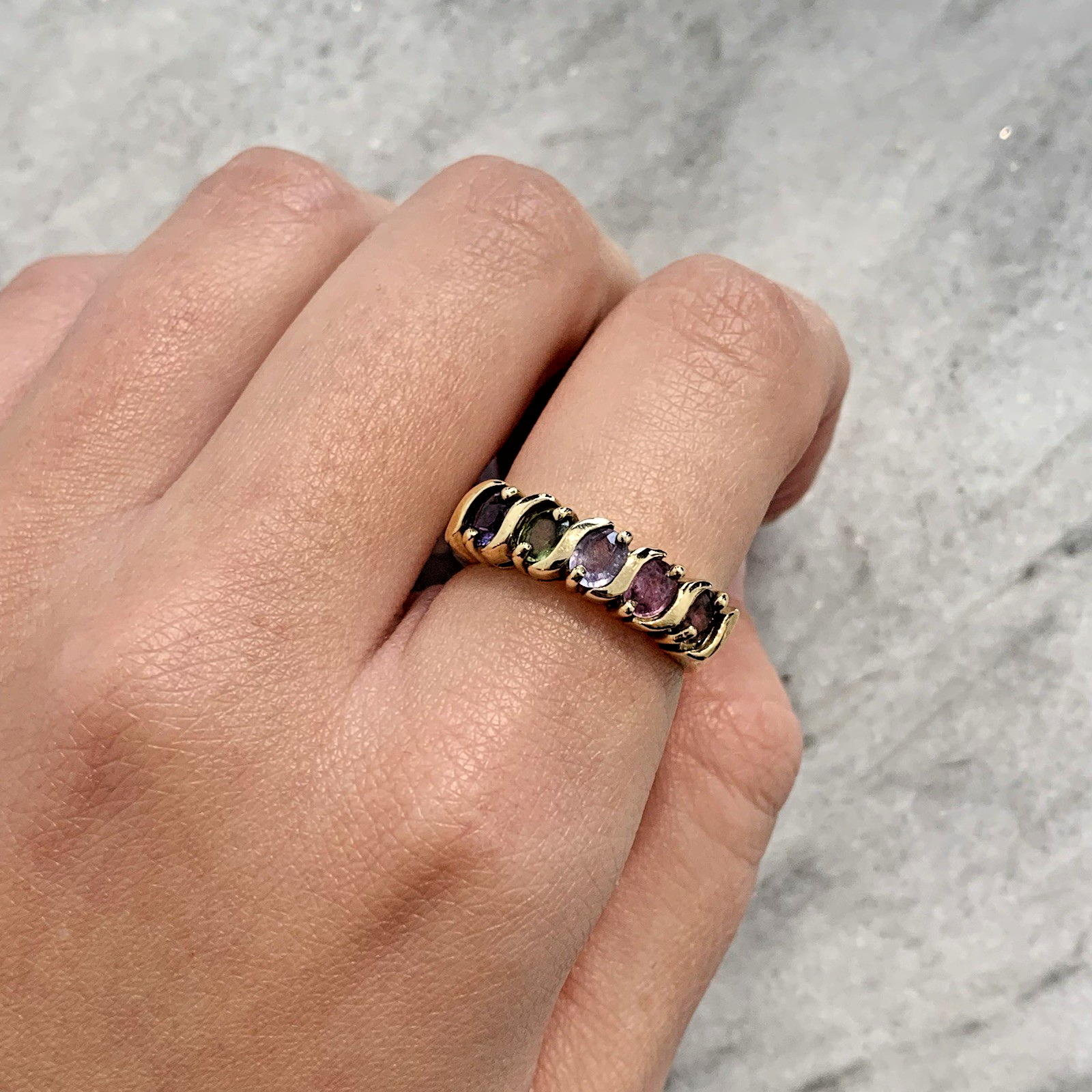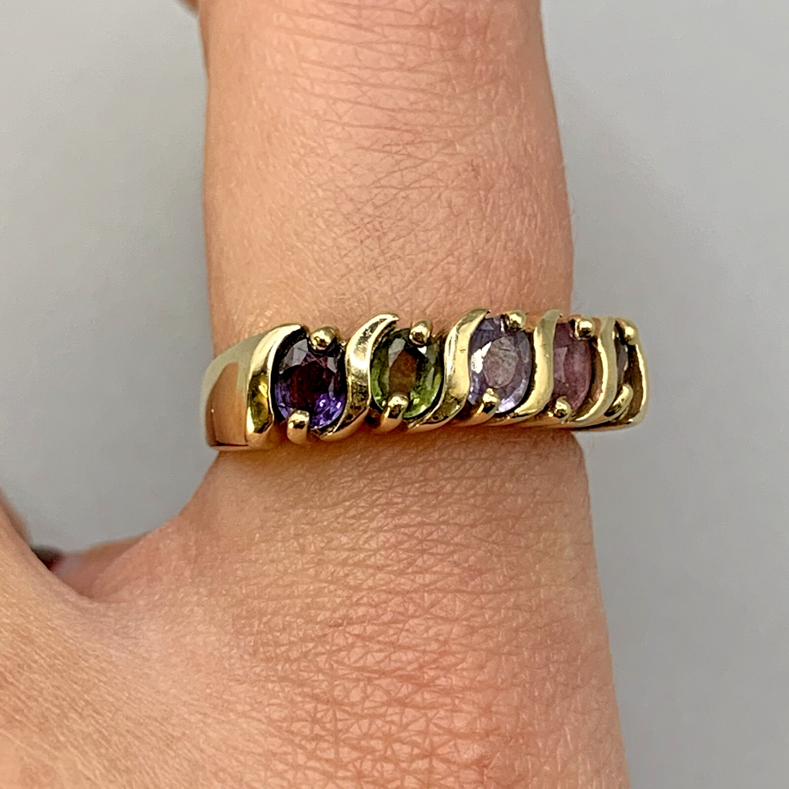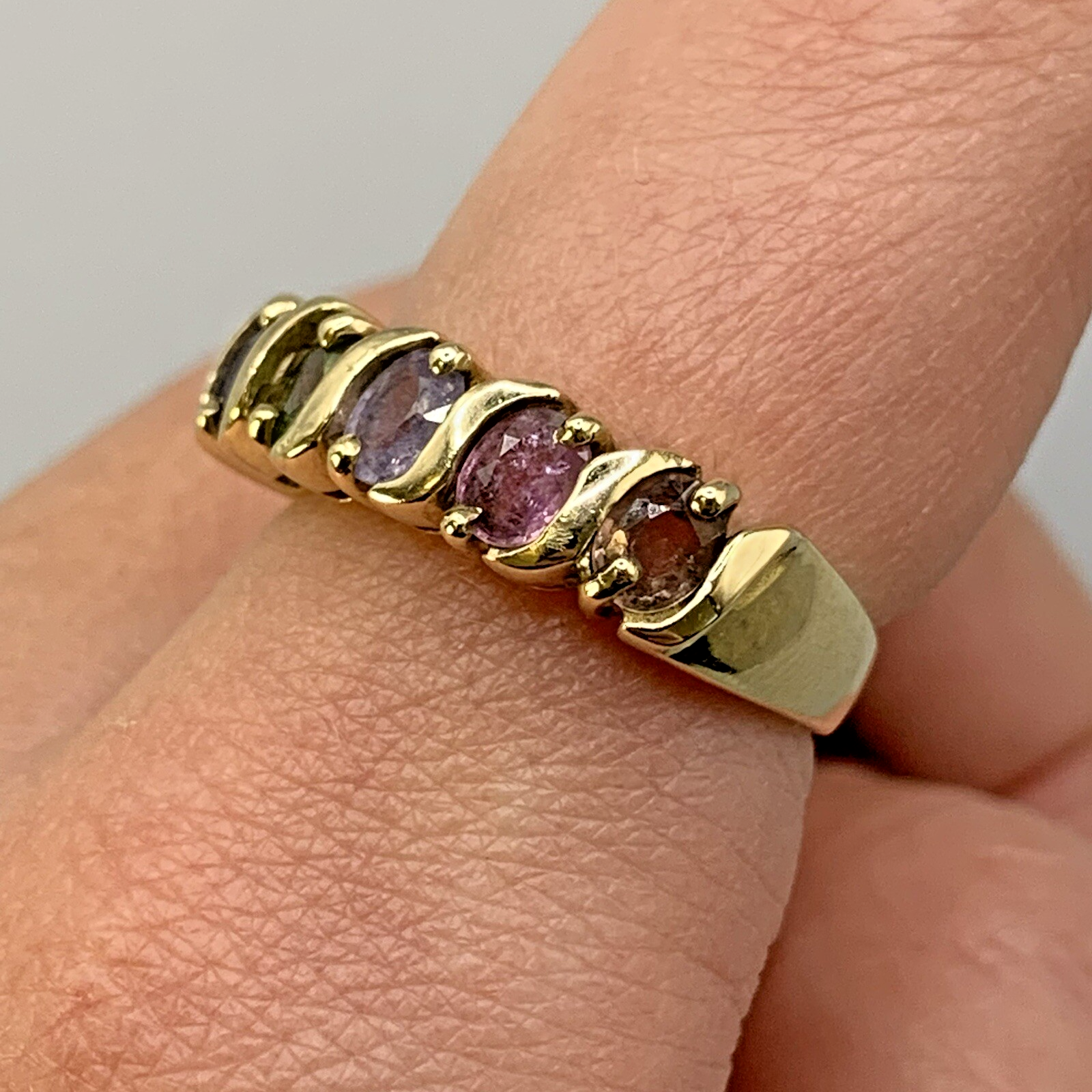 A stunning ring with five oval-cut sapphires in a rainbow of colours, starting with blue, then green, light cornflower blue, pastel pink and pastel golden peach, set is a solid yellow gold band.