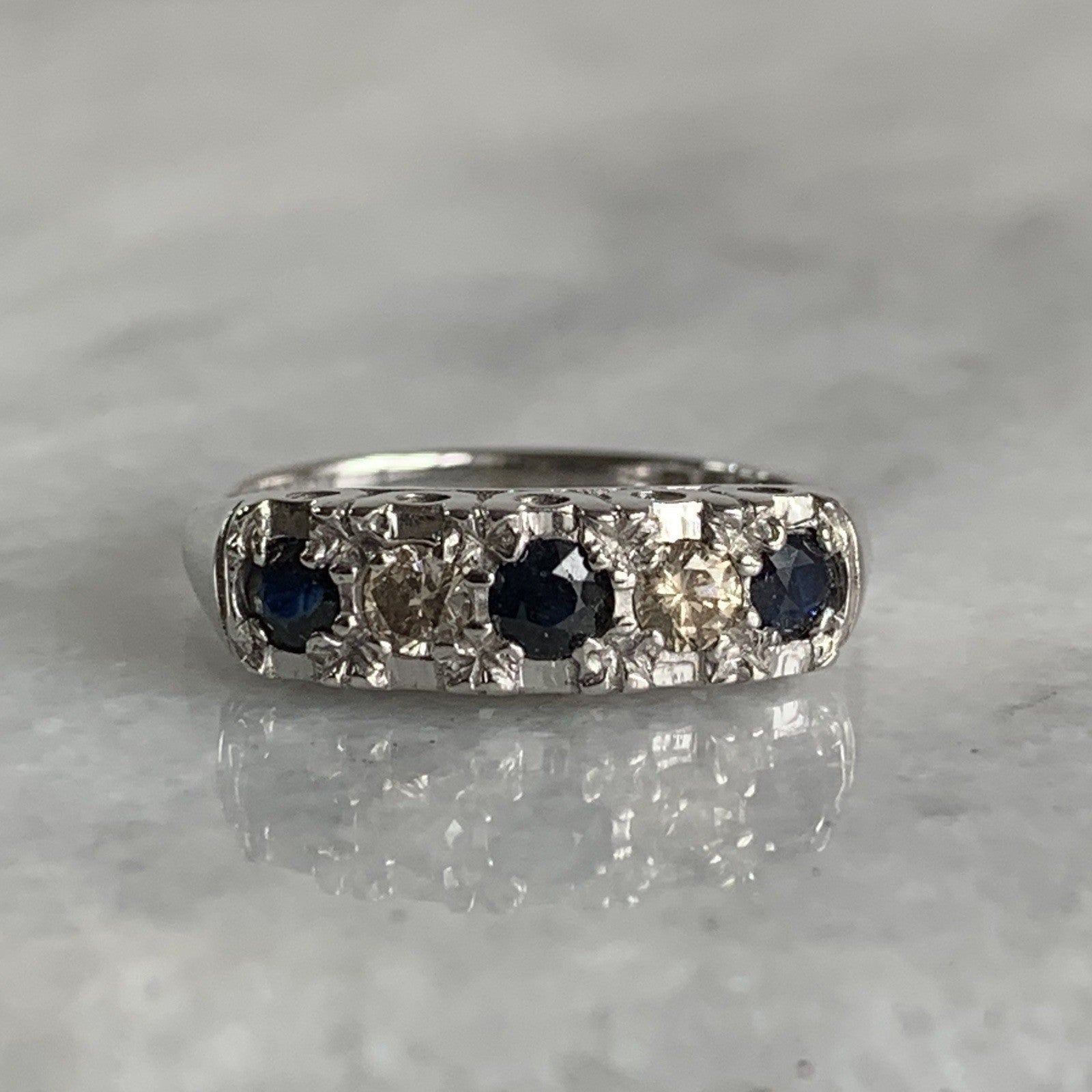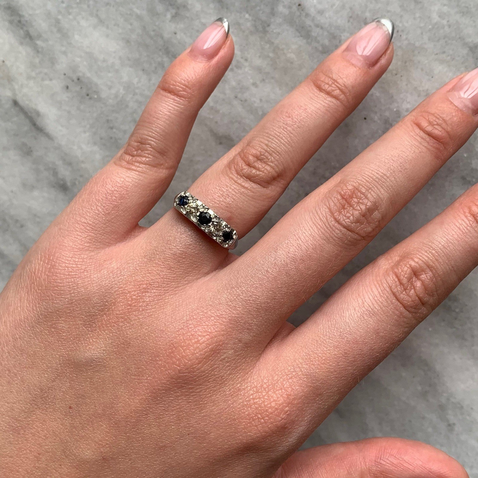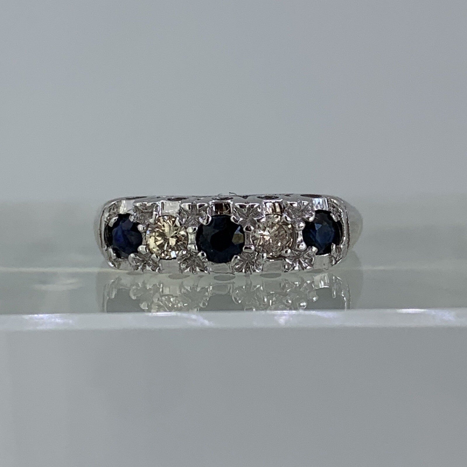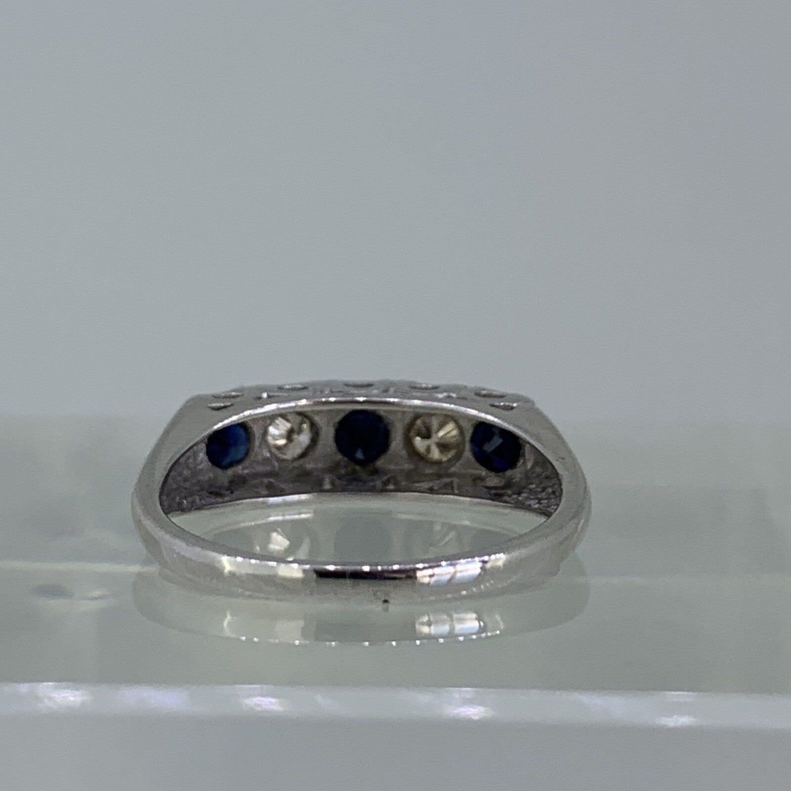 A beautiful five stone ring featuring a trilogy of sapphire gemstones and two natural diamonds amounting to .20ct total.