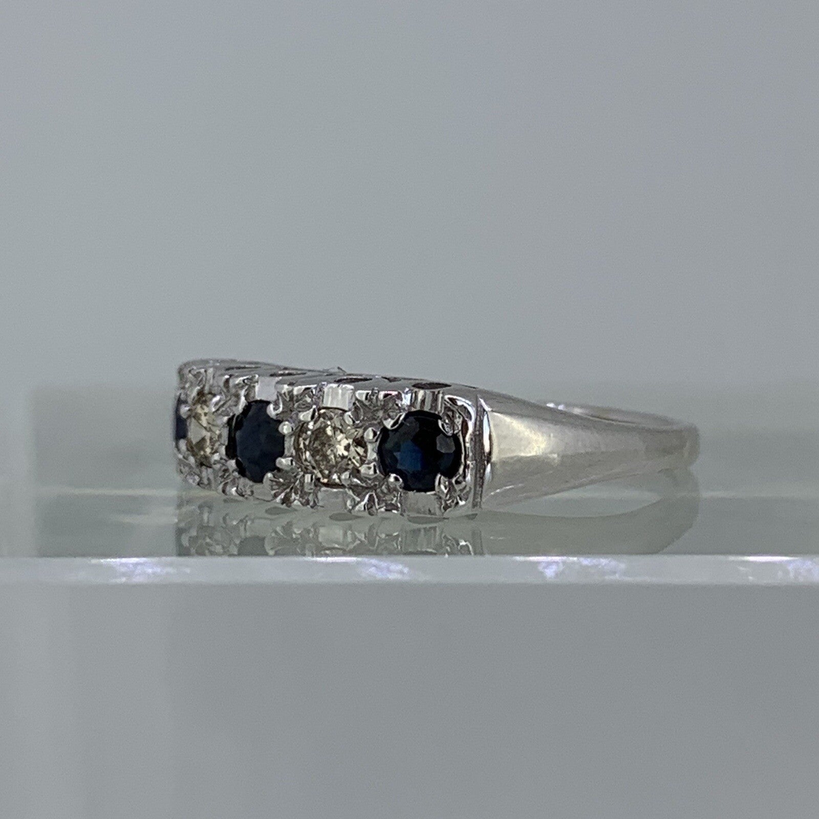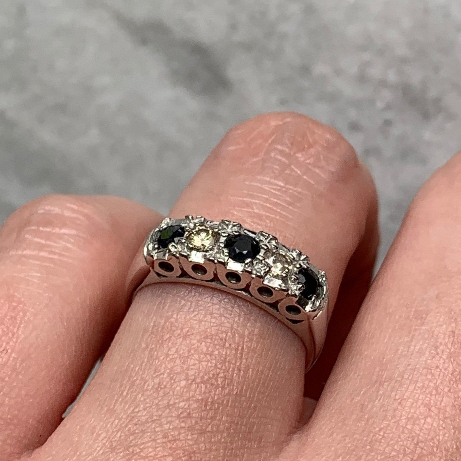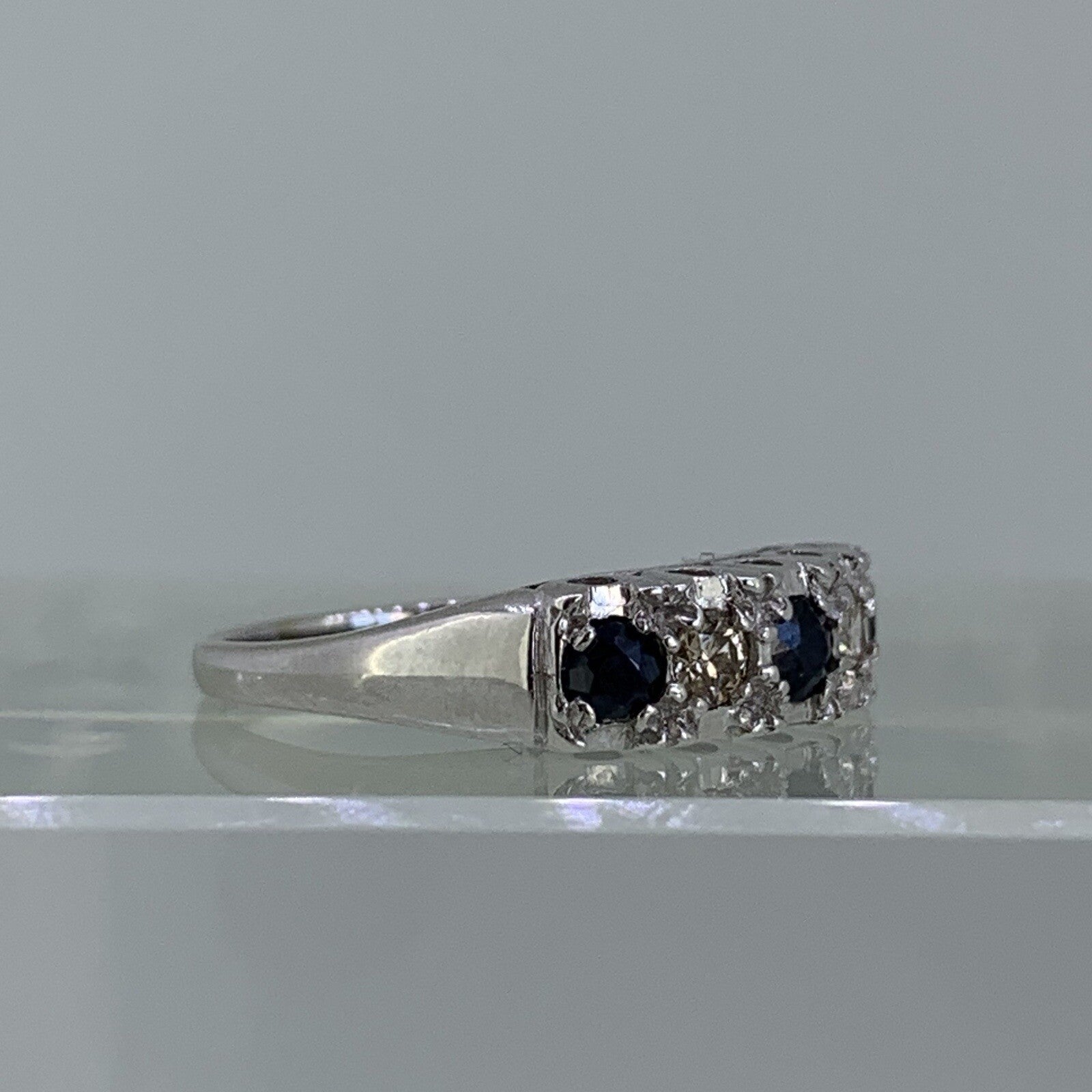A beautiful five stone ring featuring a trilogy of sapphire gemstones and two natural diamonds amounting to .20ct total.