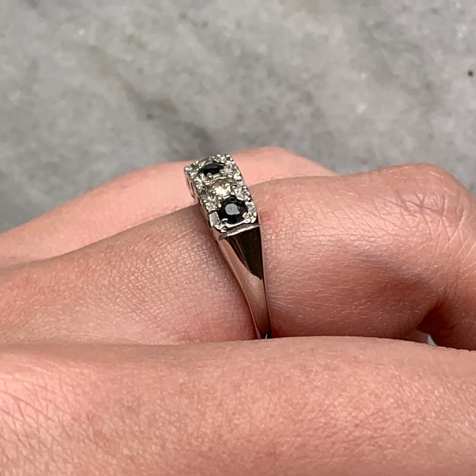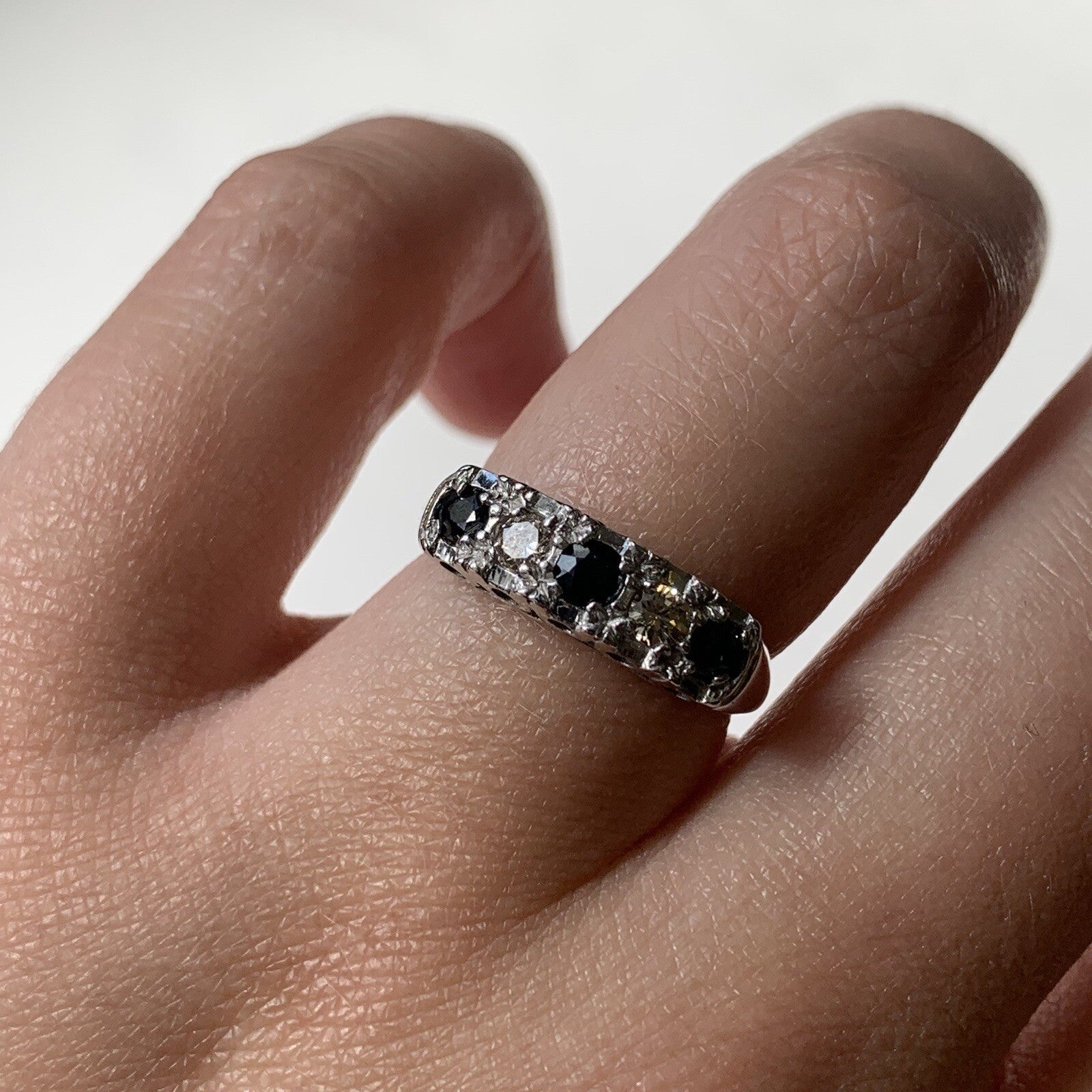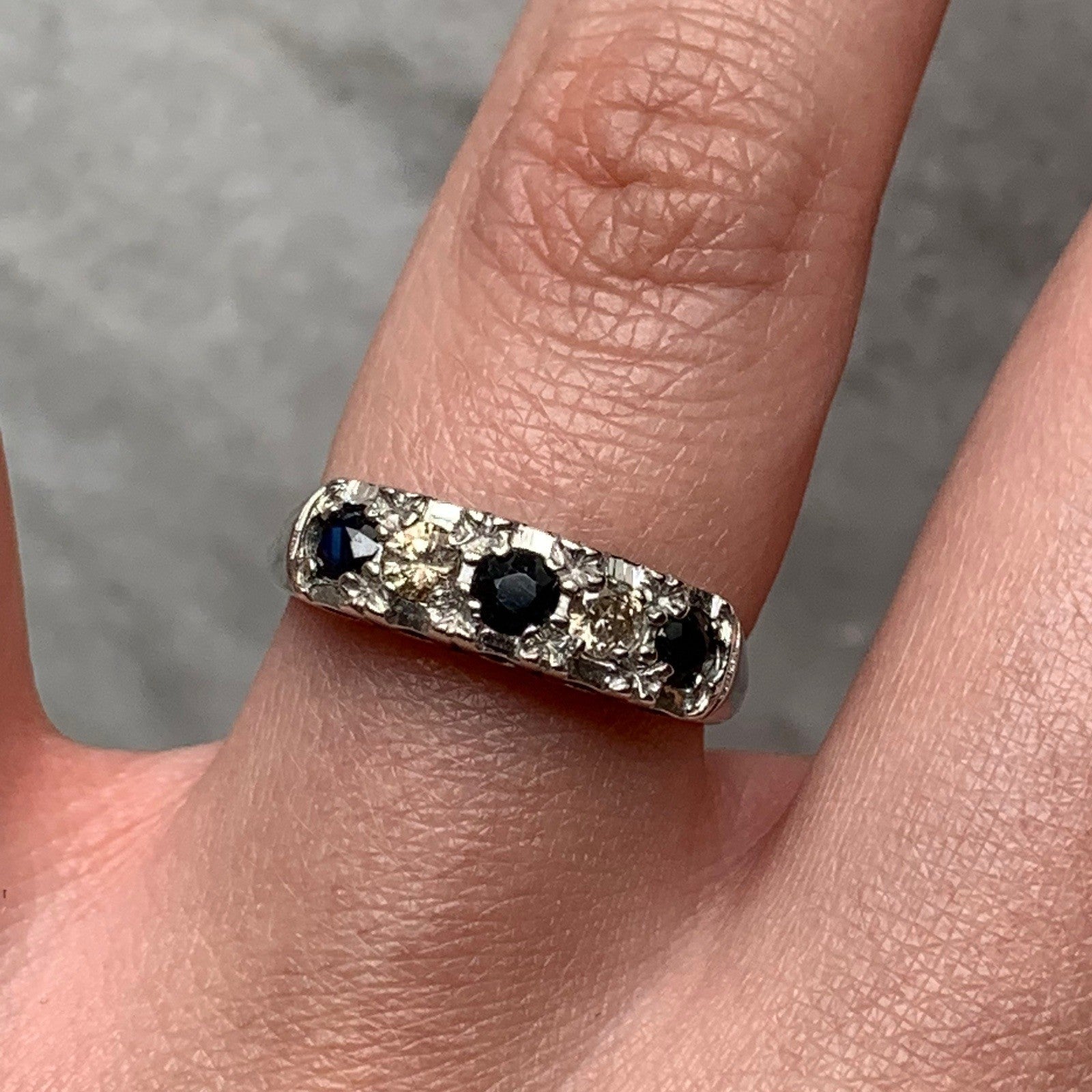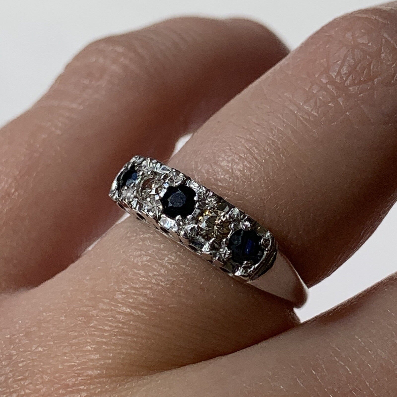 A beautiful five stone ring featuring a trilogy of sapphire gemstones and two natural diamonds amounting to .20ct total.