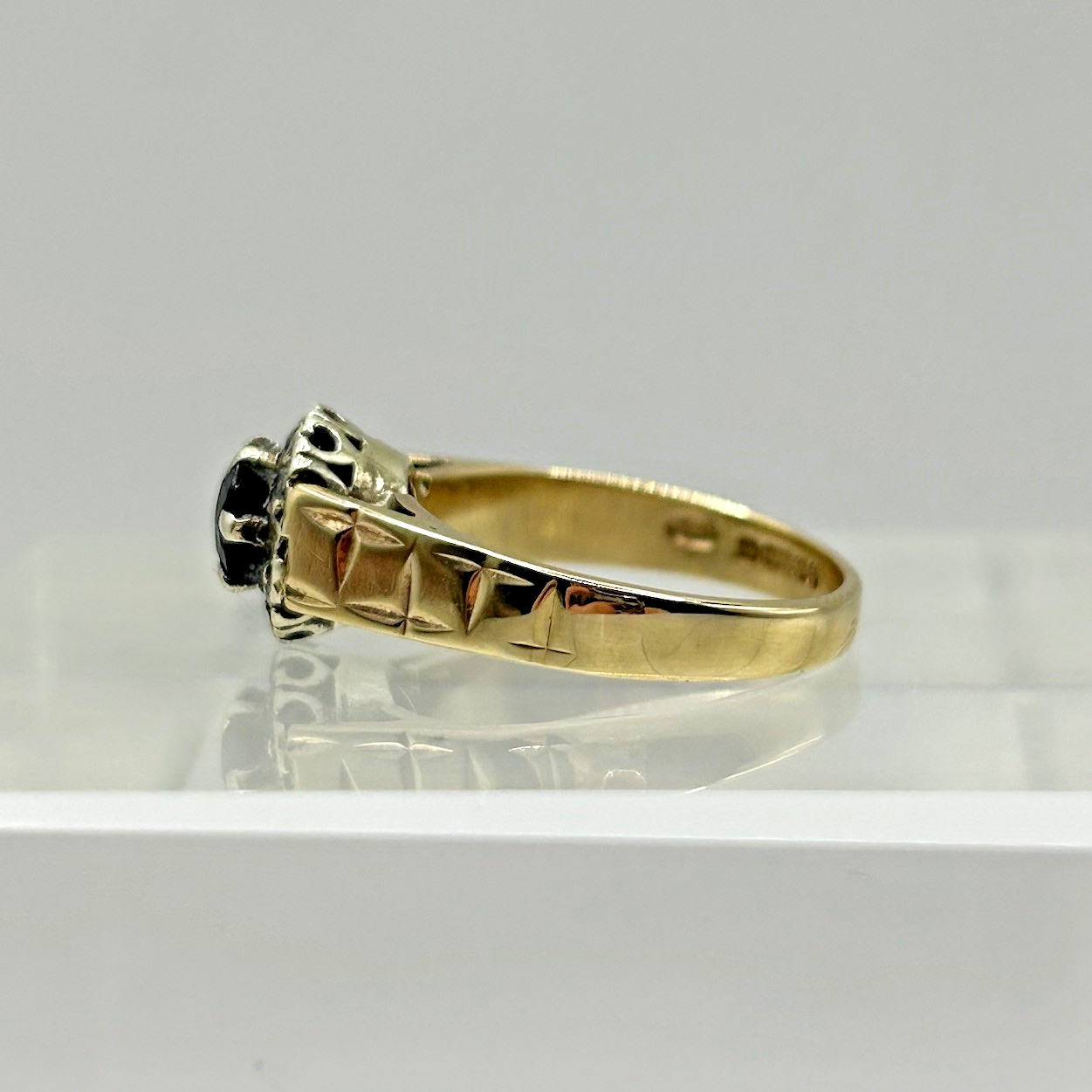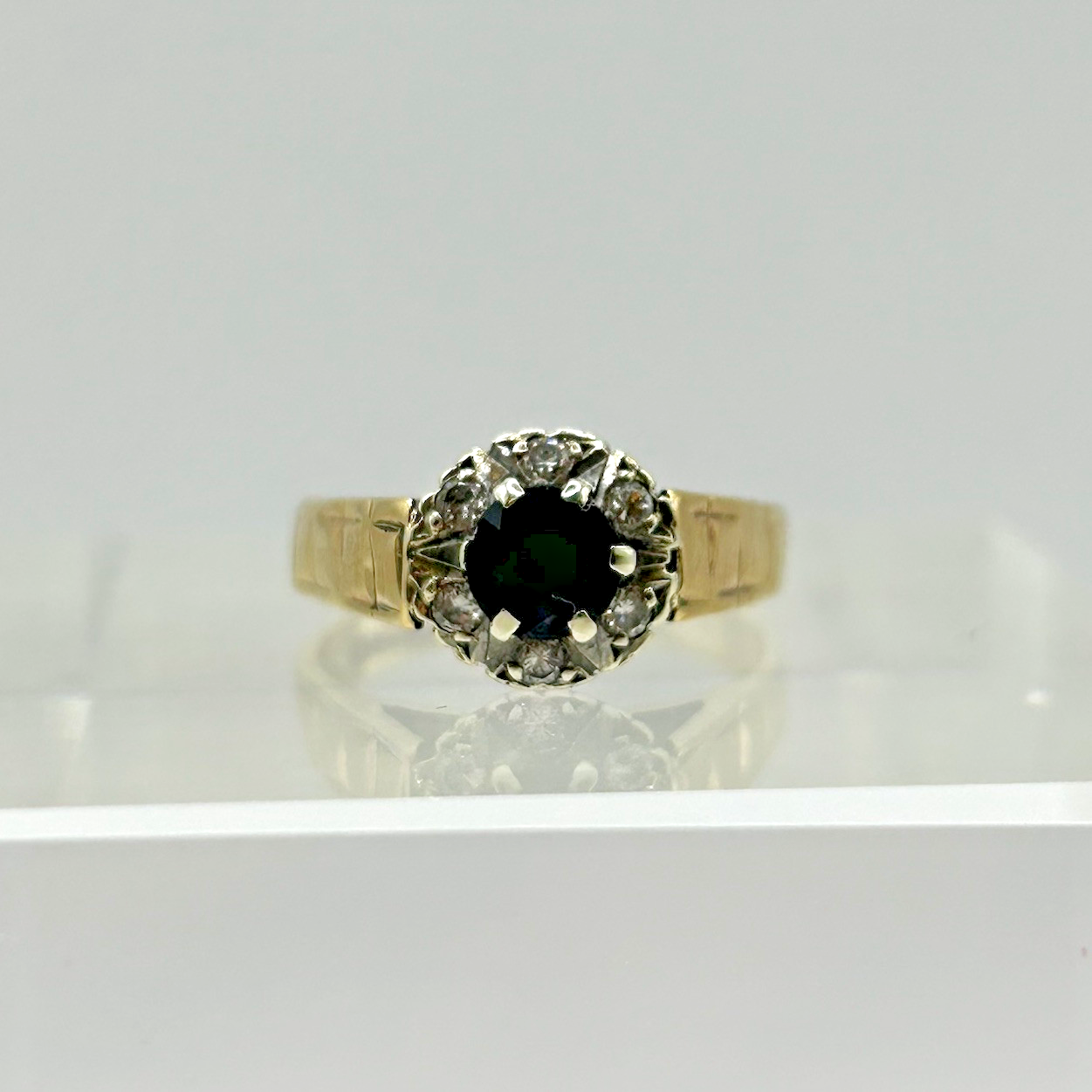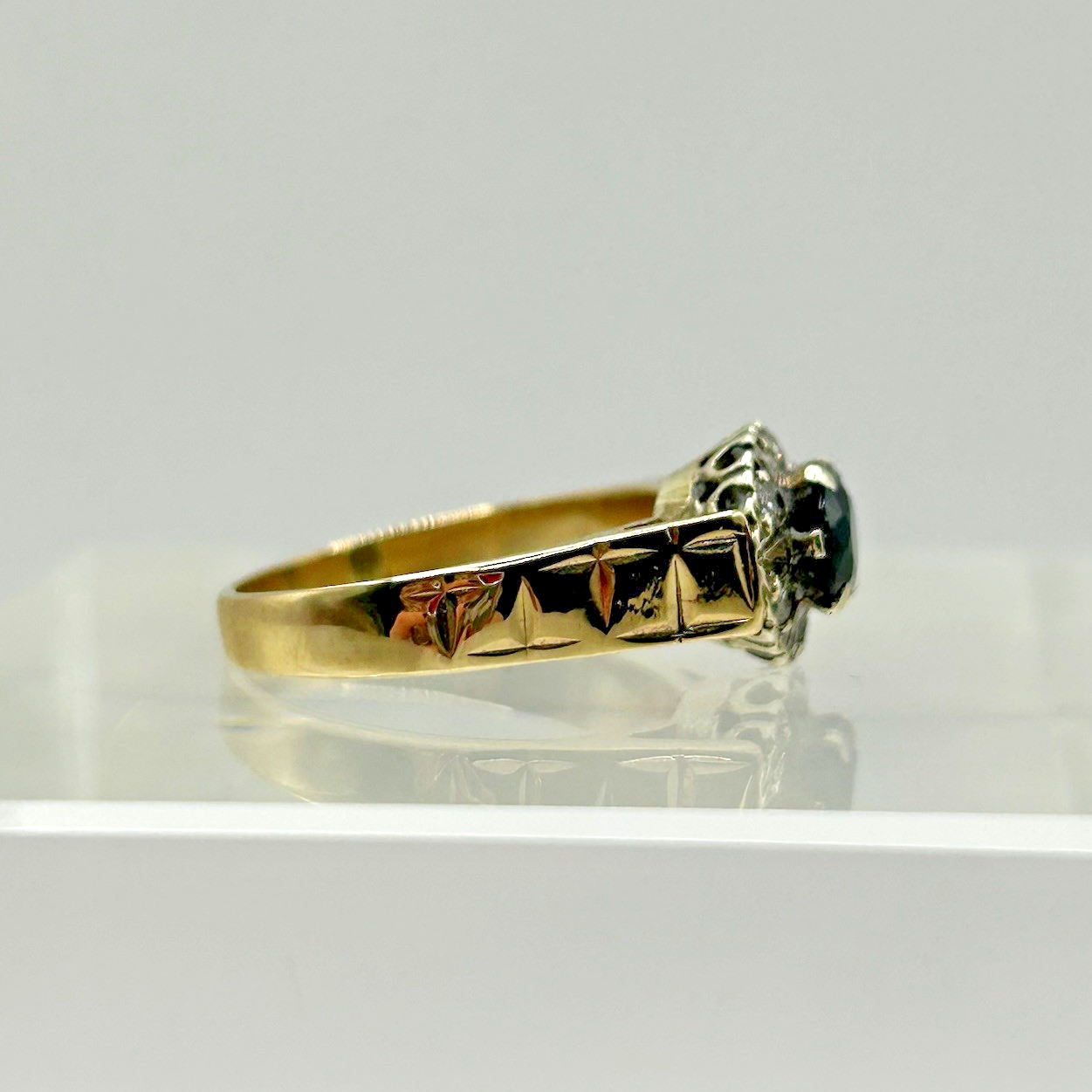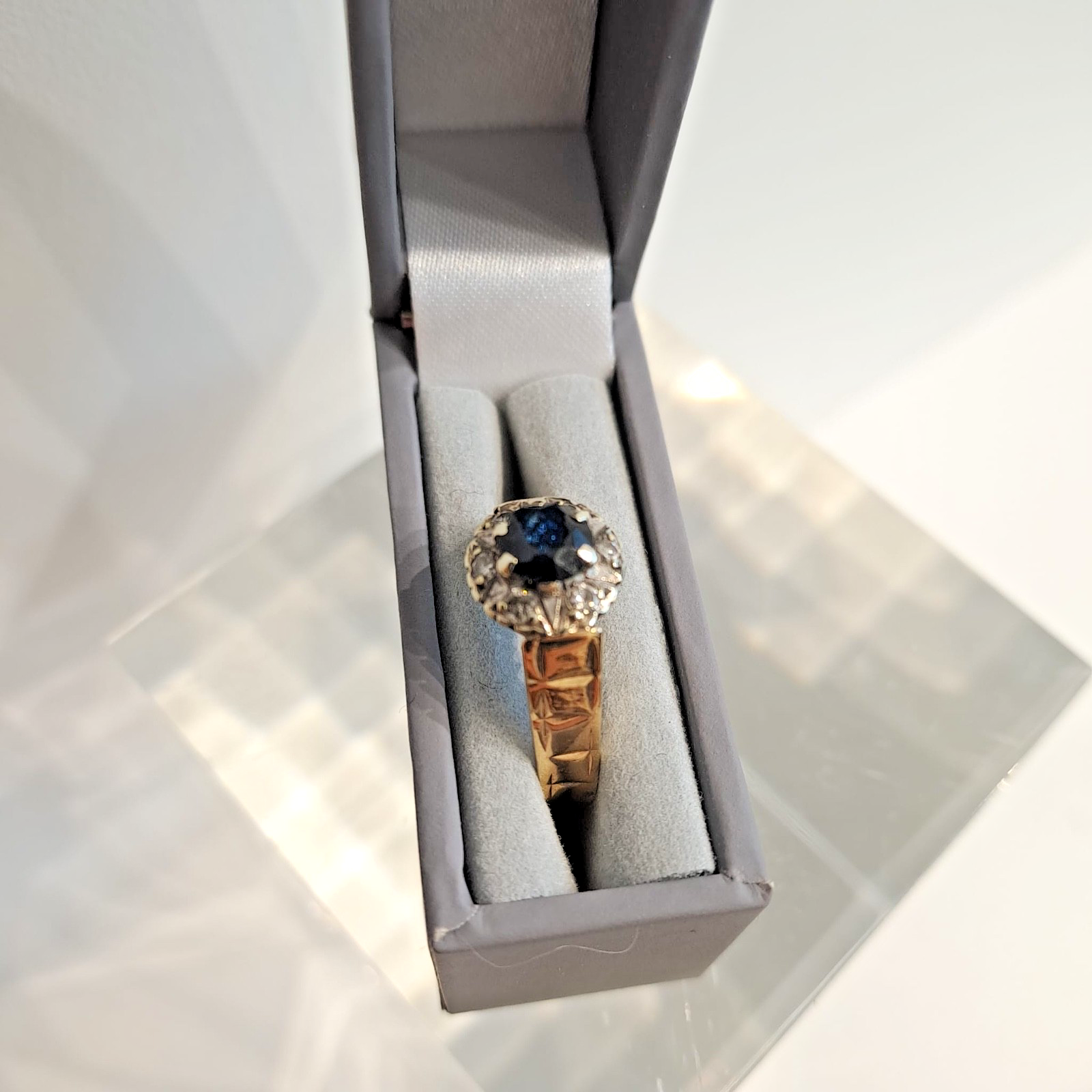 Sapphire & Diamond Ring 9ct Gold Cluster Textured Shoulders Yellow Gold - Size N