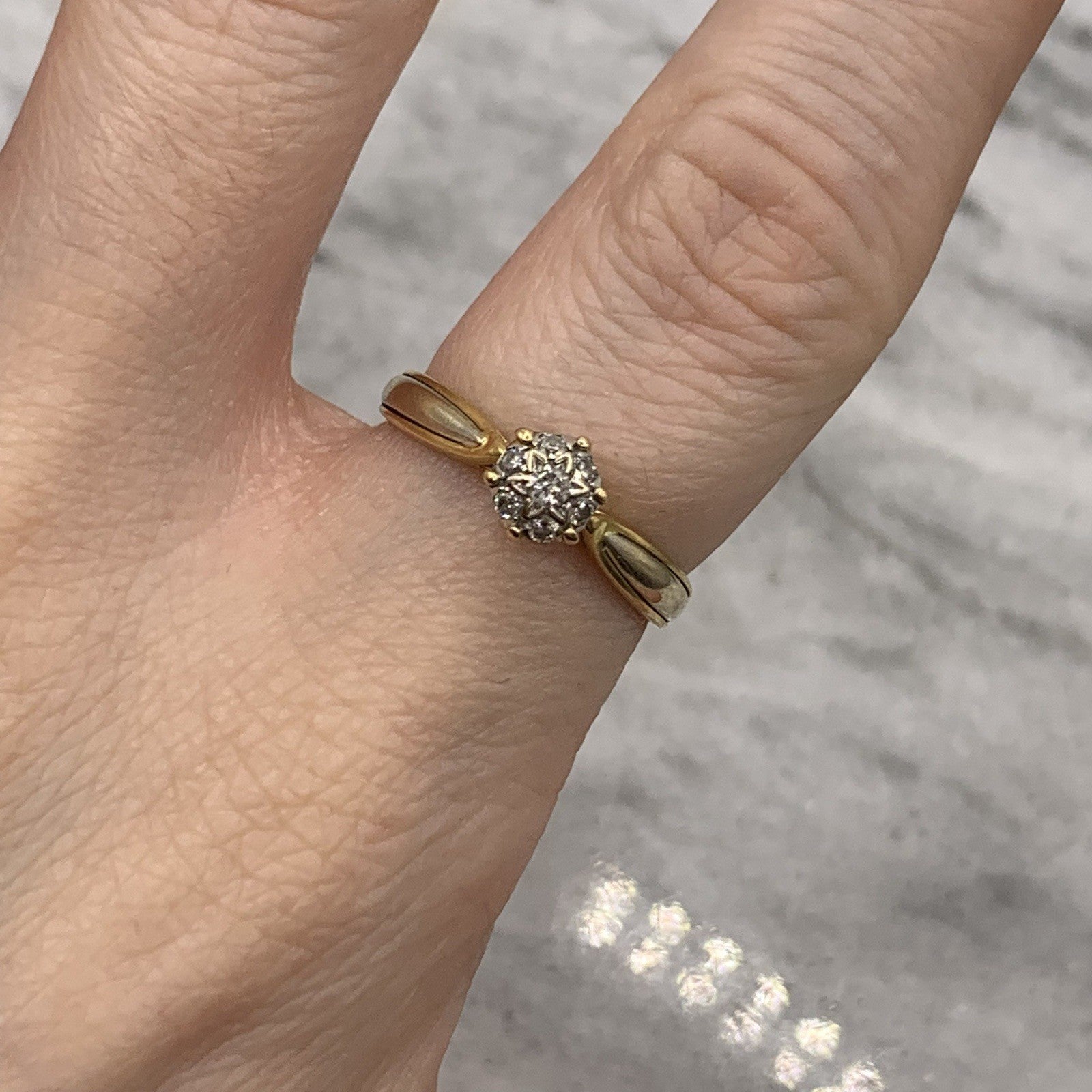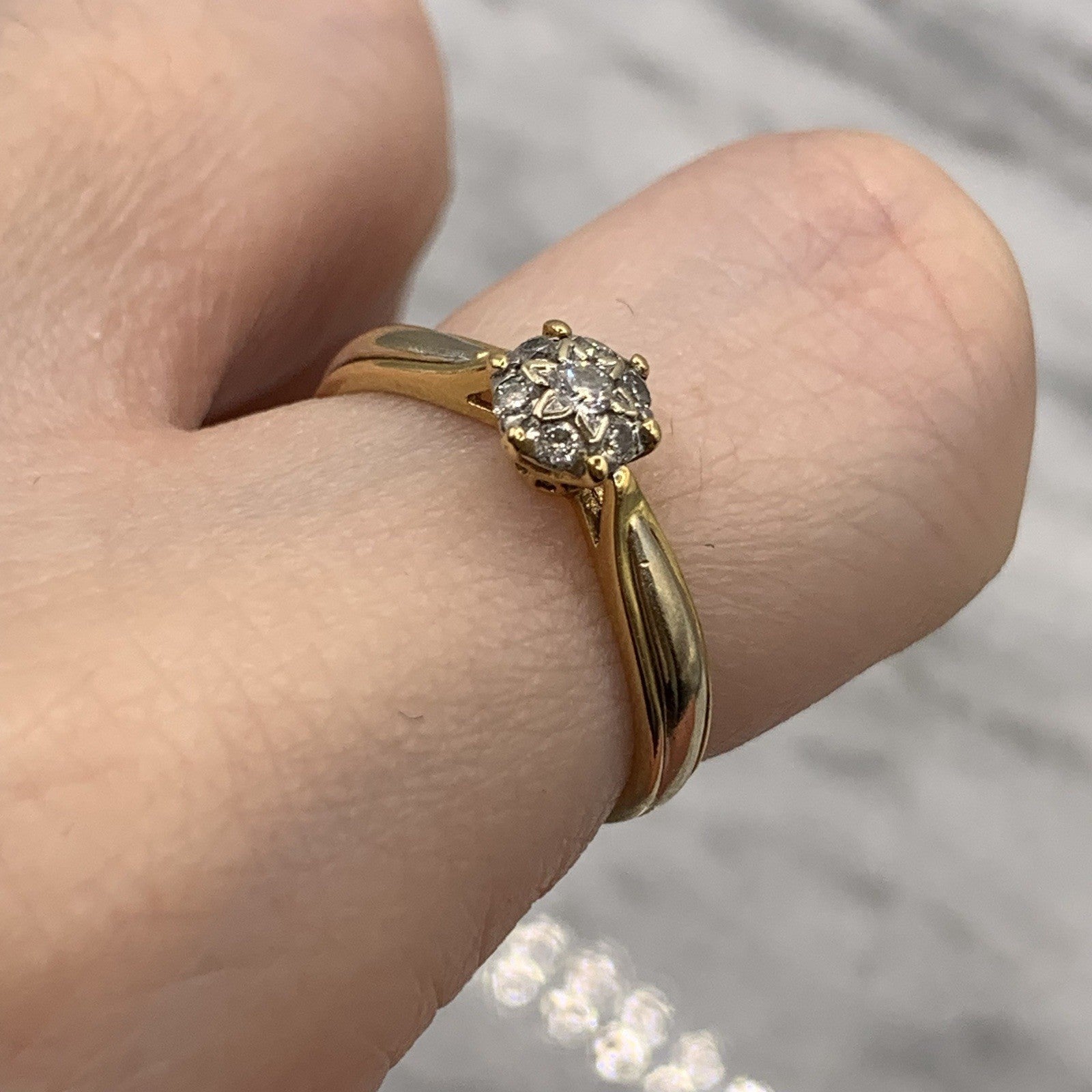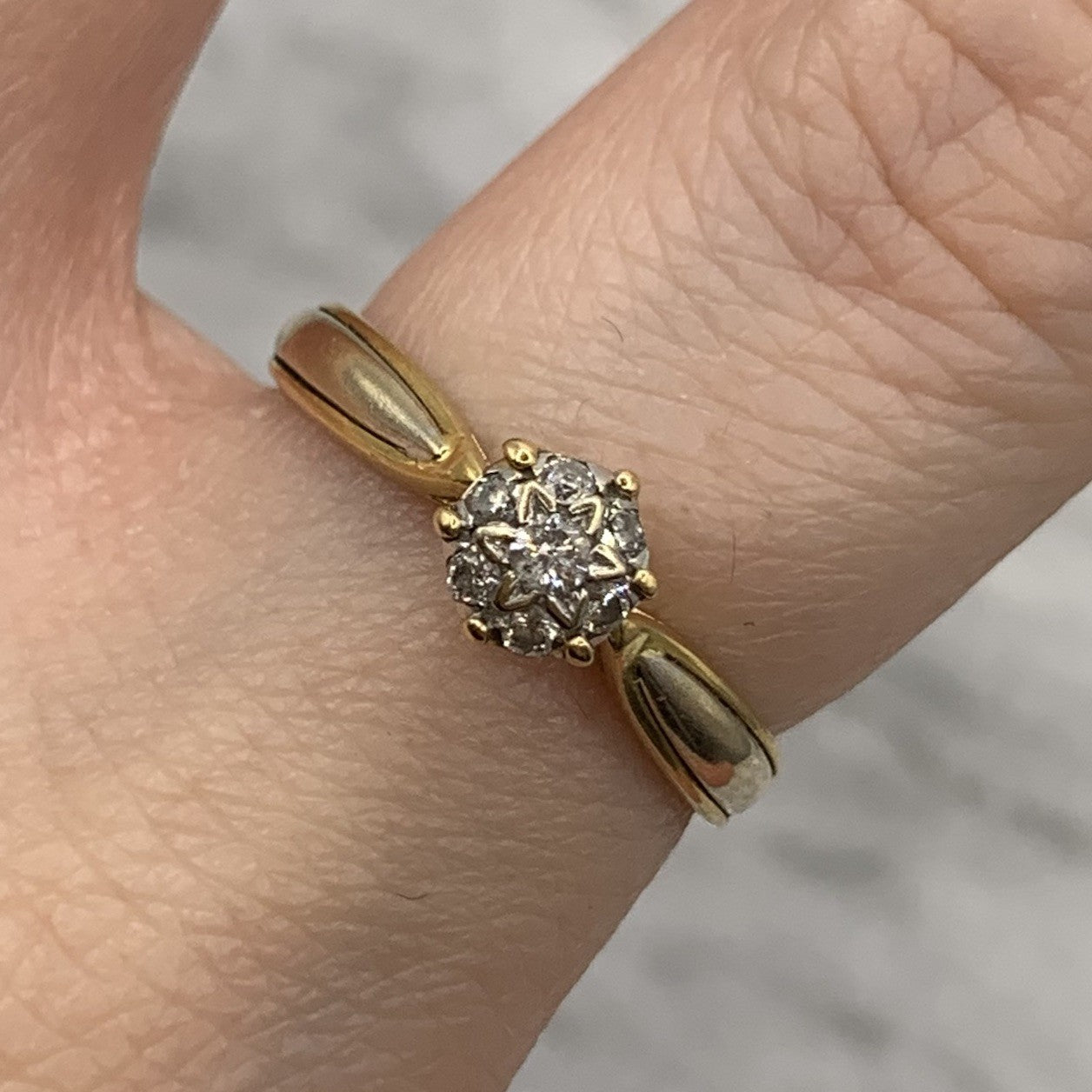A beautiful gold ring featuring a cluster of diamonds at 0.15ct. All stones natural.