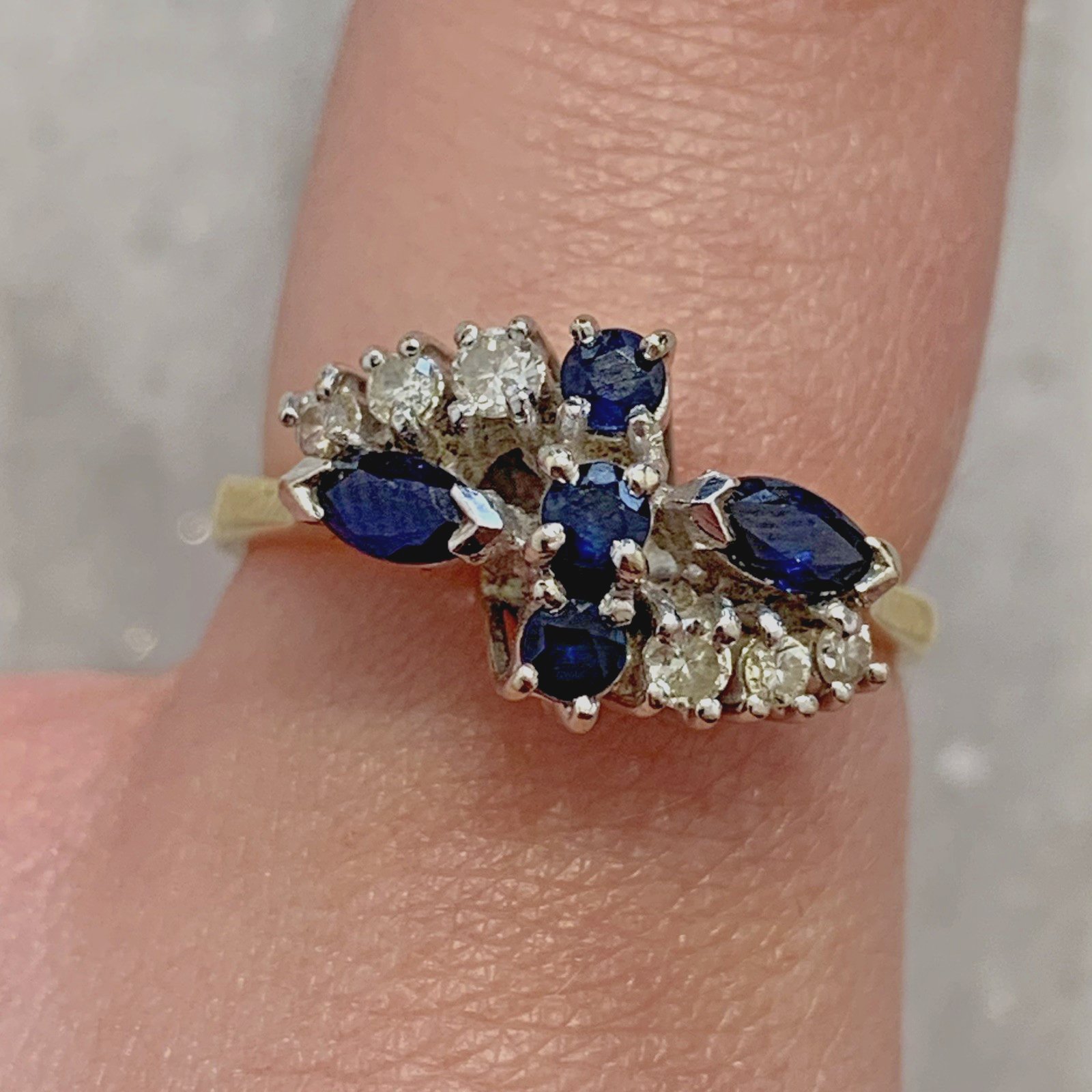 A beautifully crafted gold dress ring showcasing a cluster of both round and marquise cut sapphires, accented by round cut diamonds either side. All stones natural.