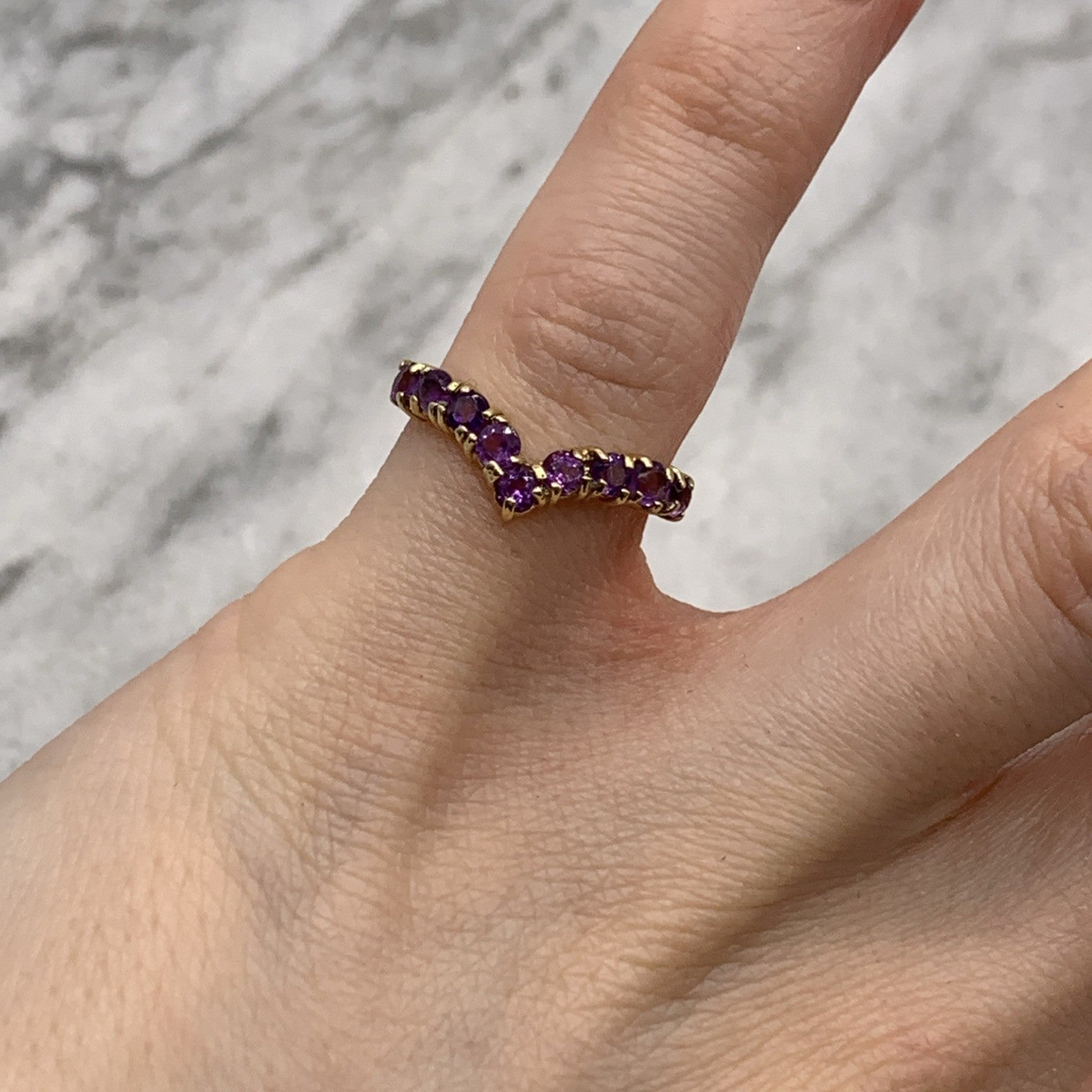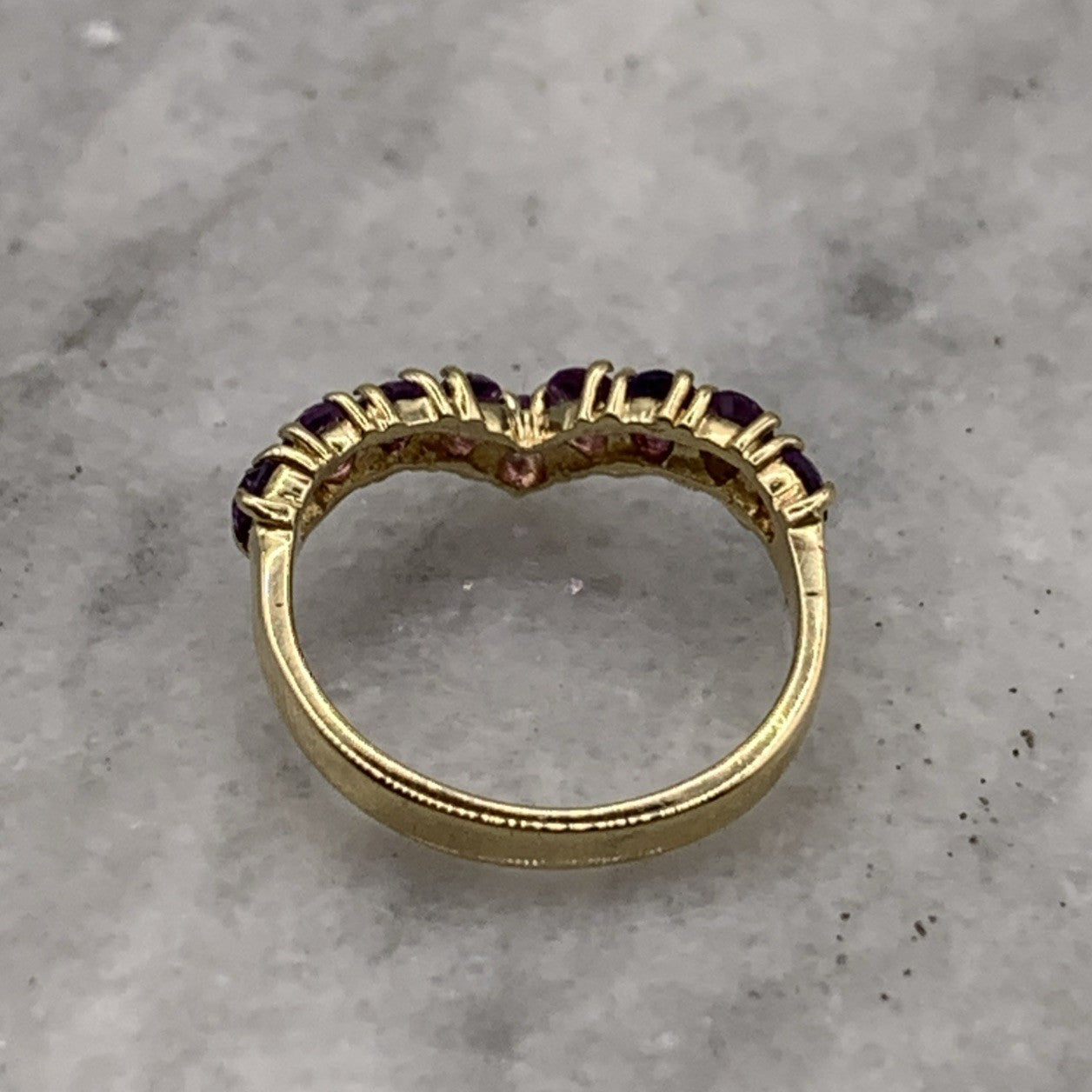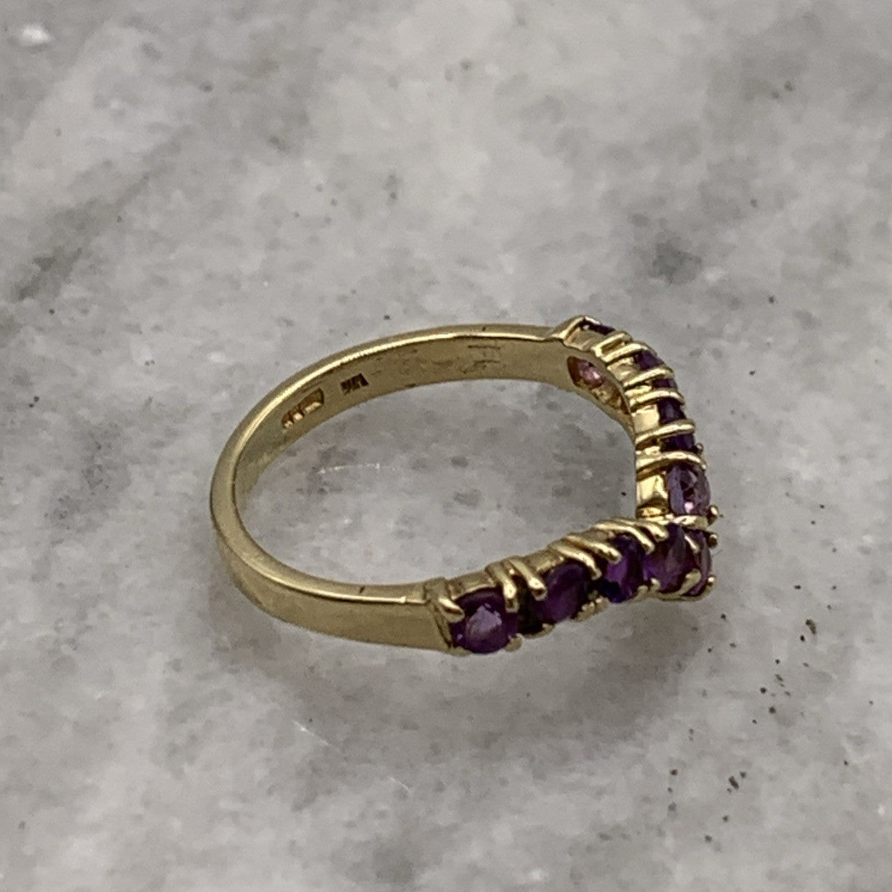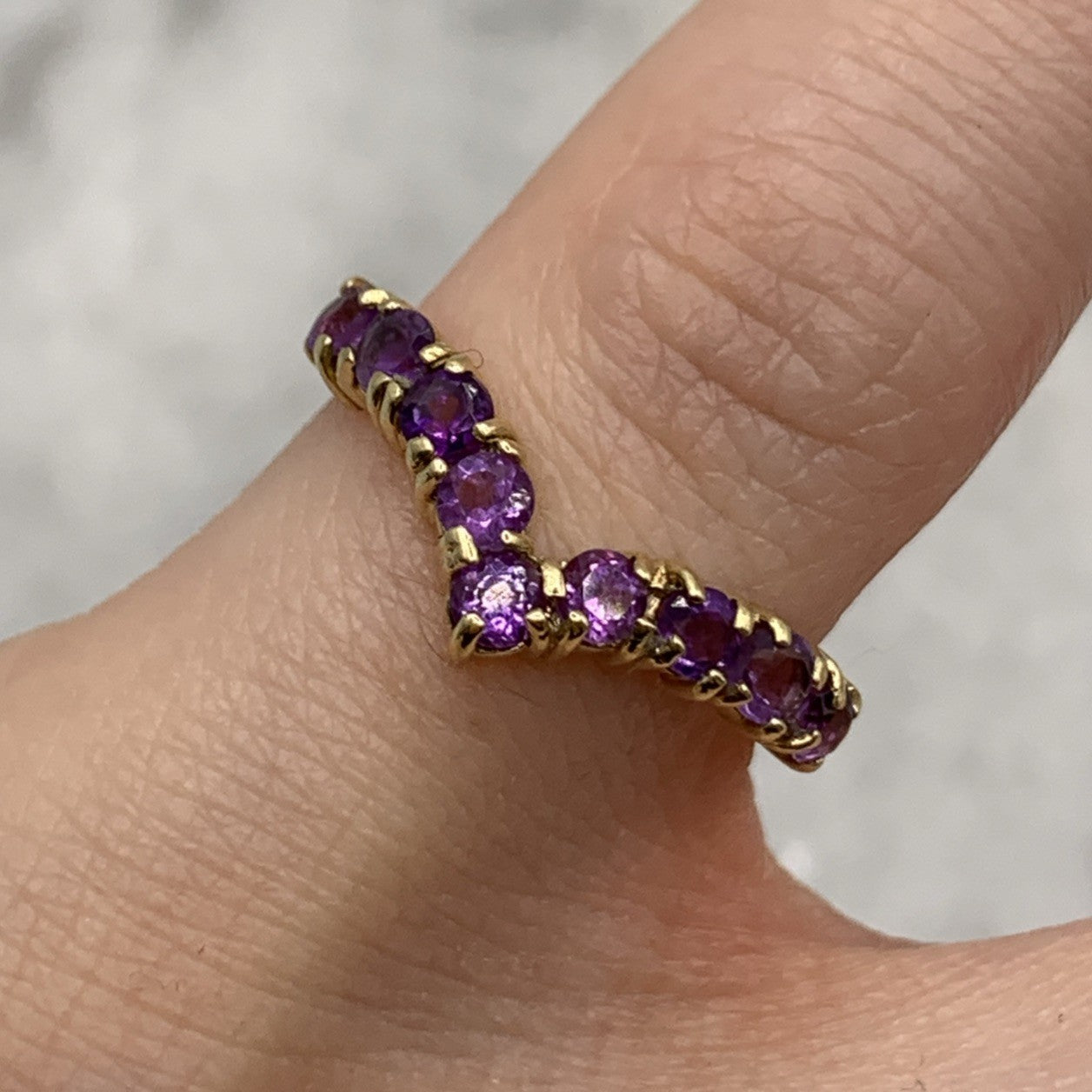 A stunning gold wishbone style ring featuring a collection of round cut amethysts.