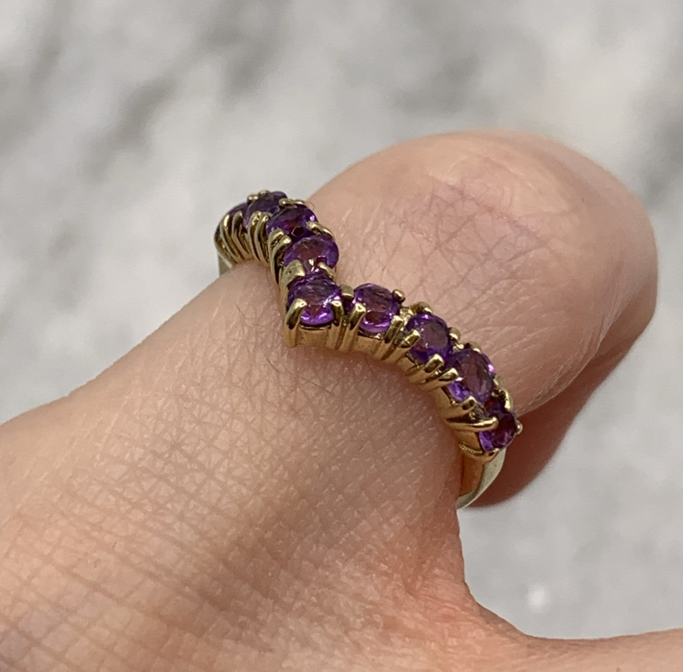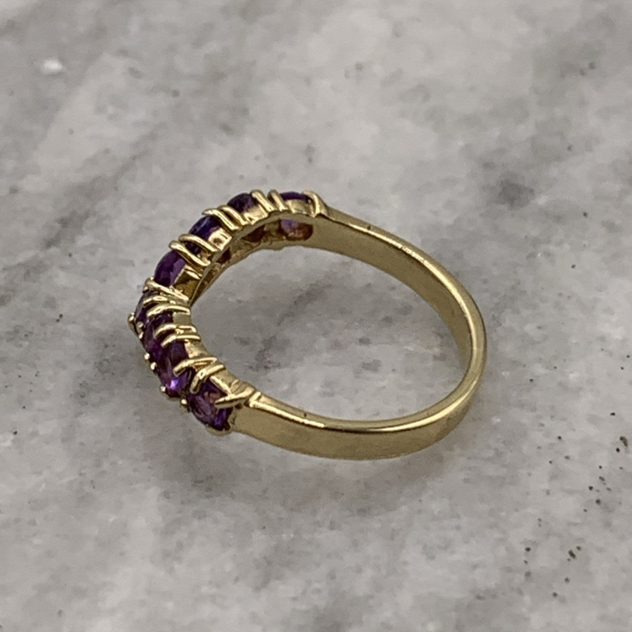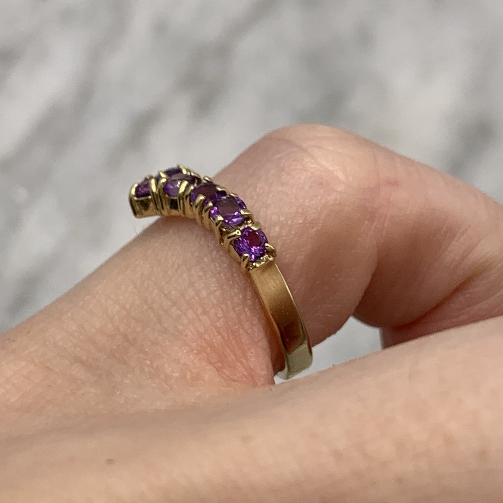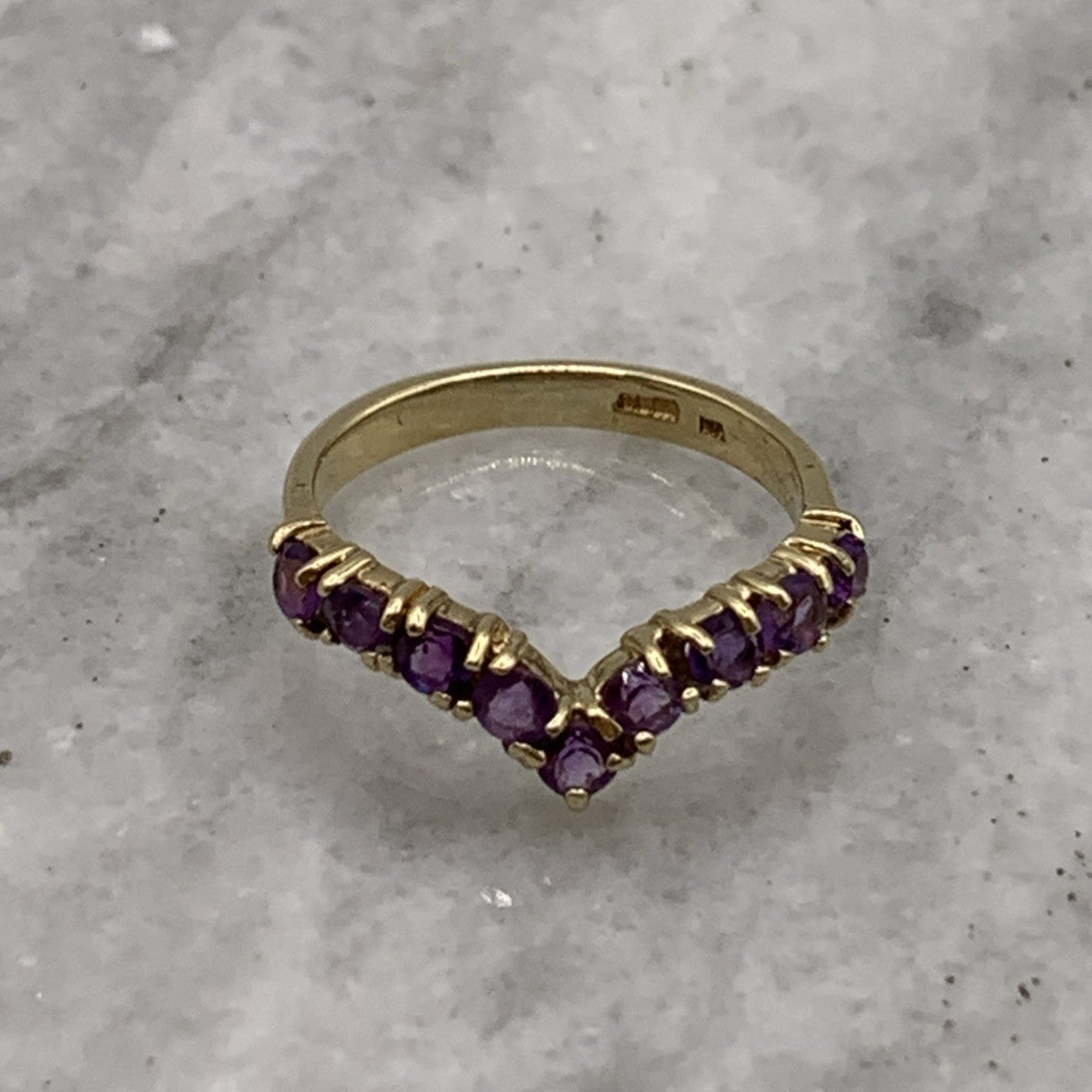 A stunning gold wishbone style ring featuring a collection of round cut amethysts.