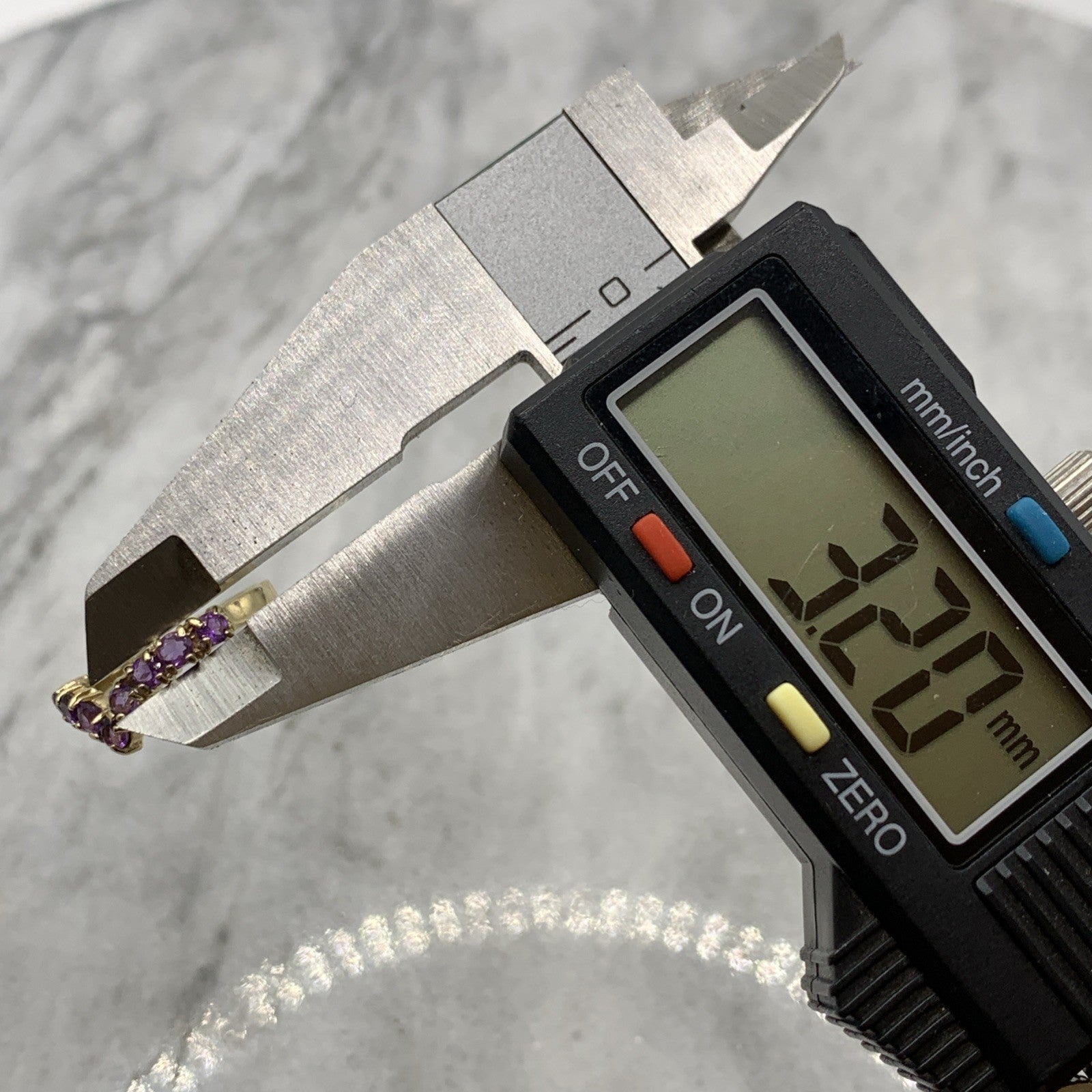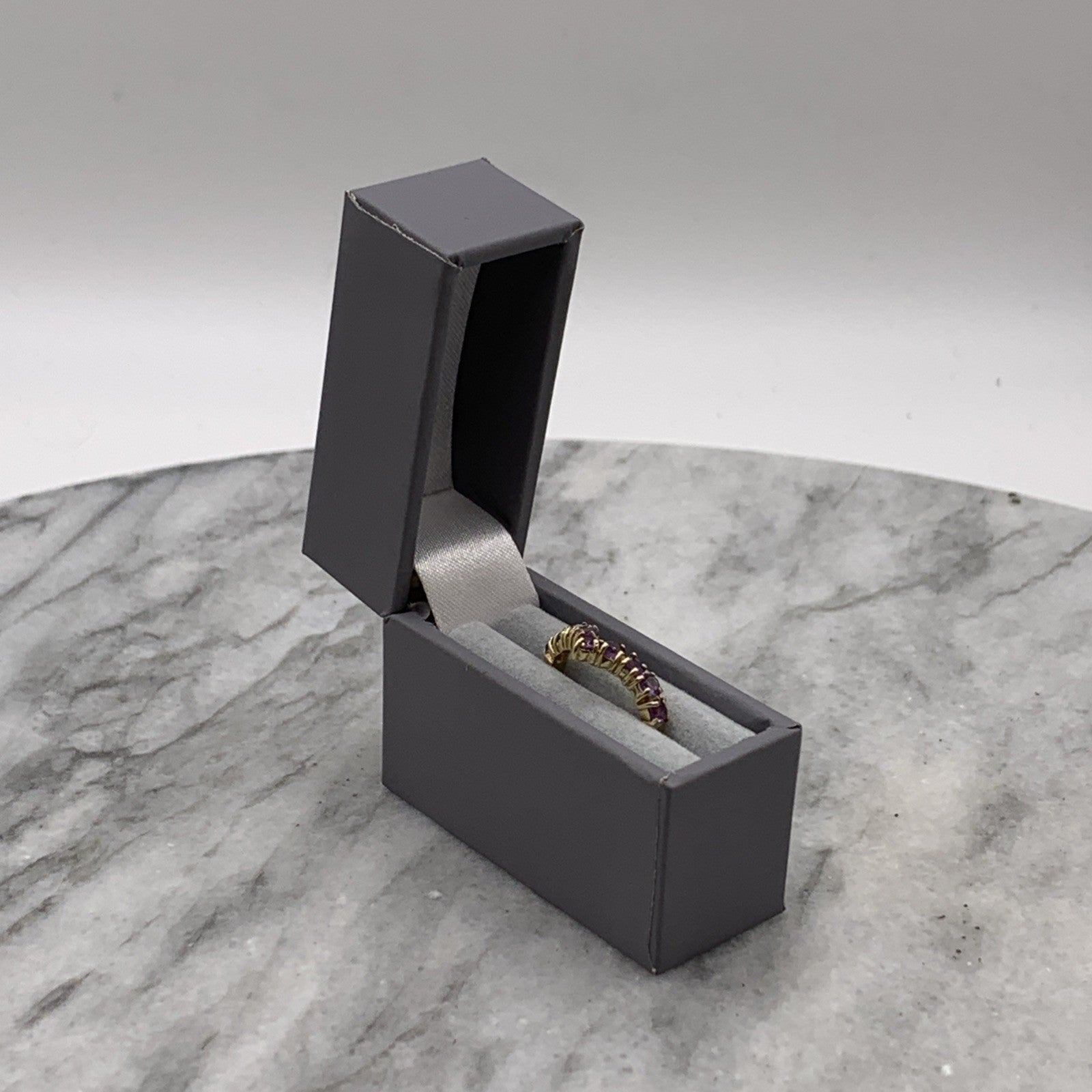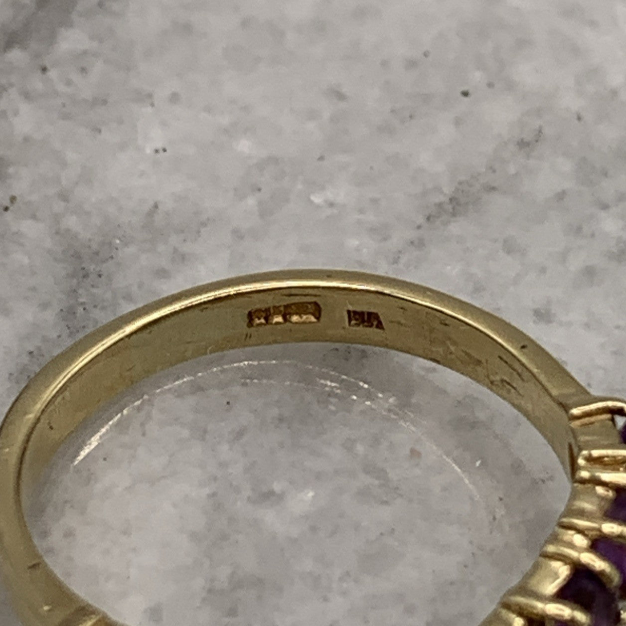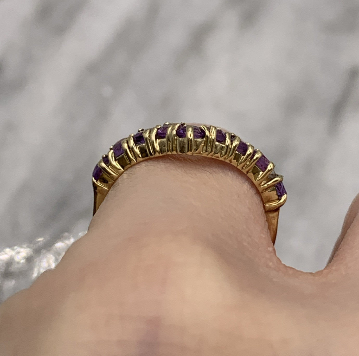A stunning gold wishbone style ring featuring a collection of round cut amethysts.