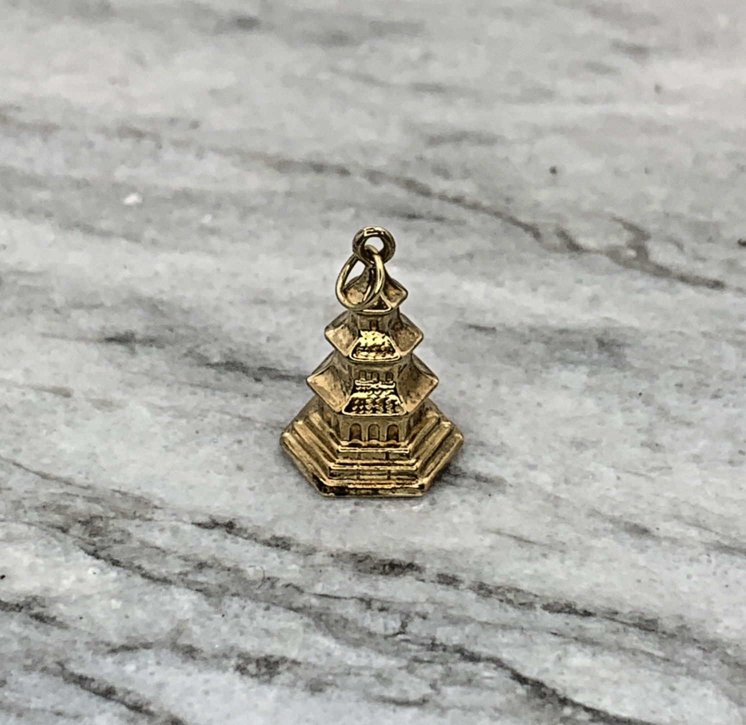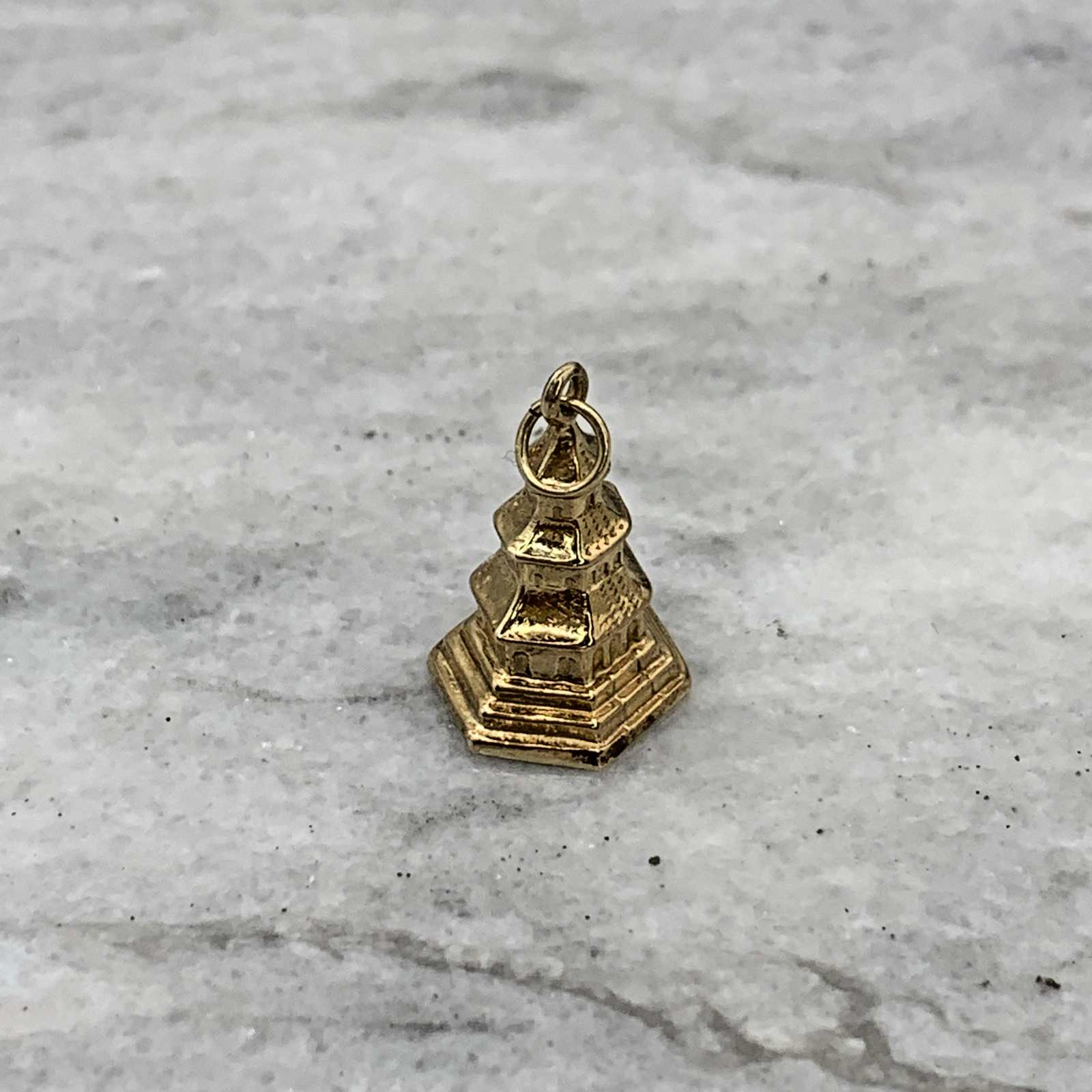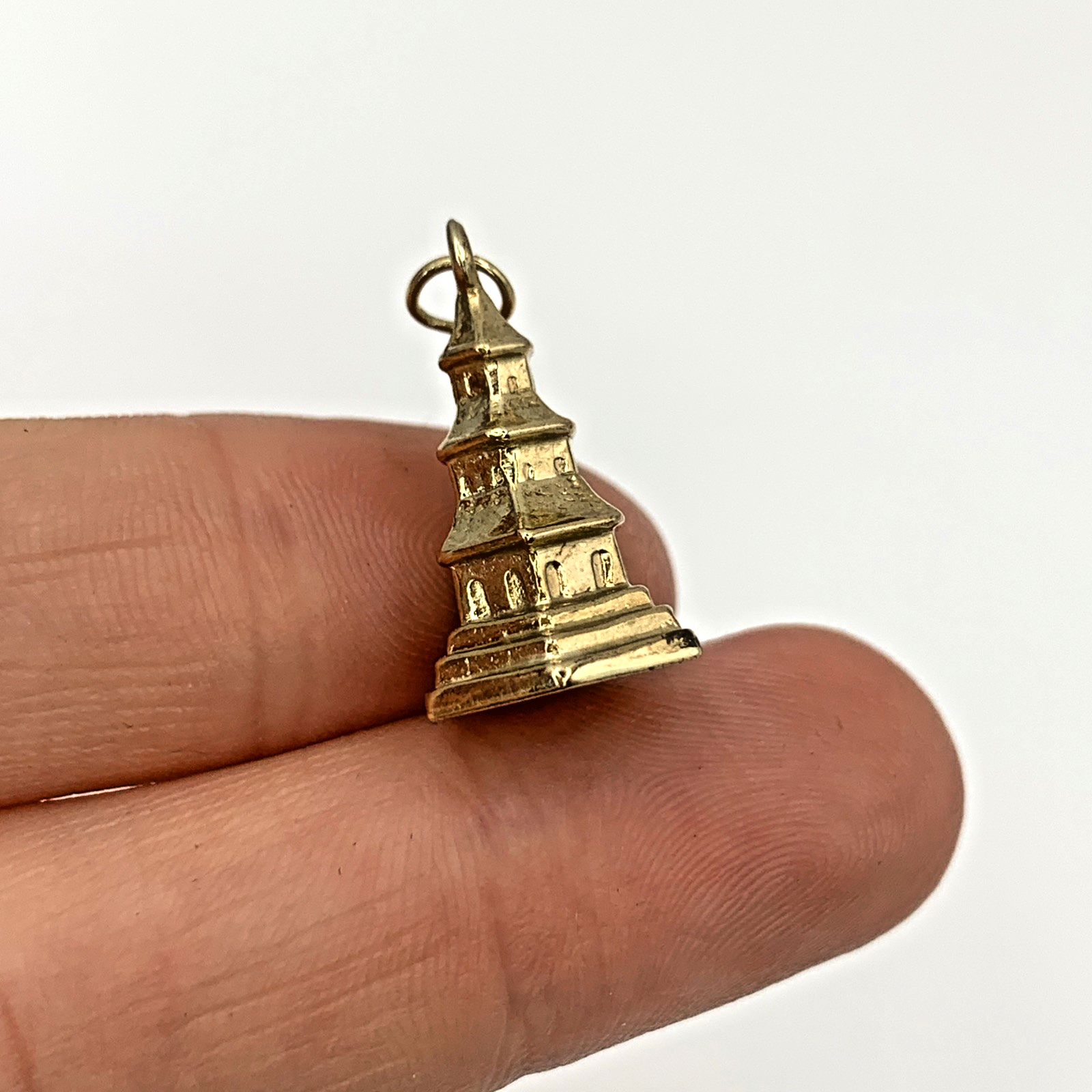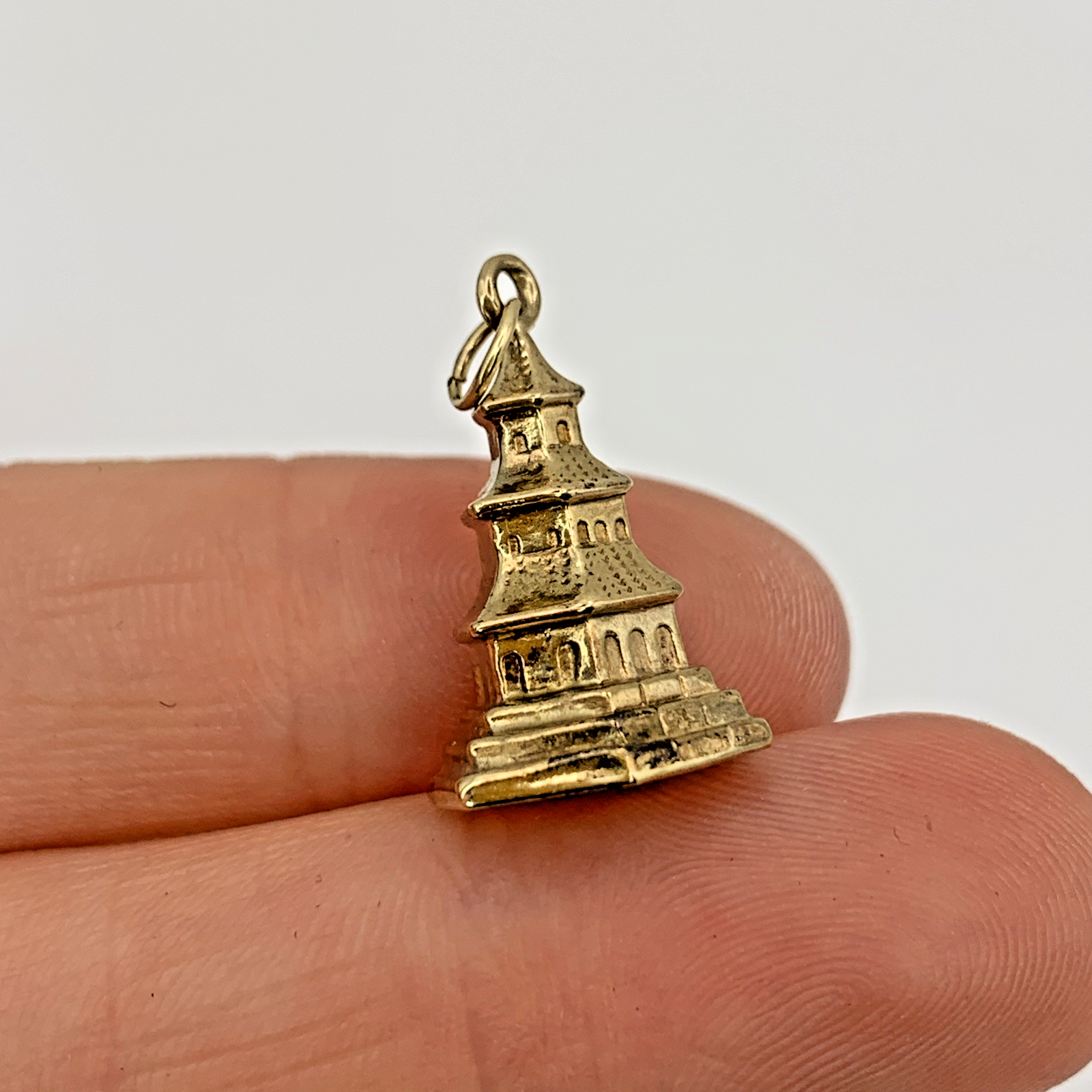 A lovely gold pendant crafted in the shape of a Chinese pagoda tower building. Perfect for charm bracelets.